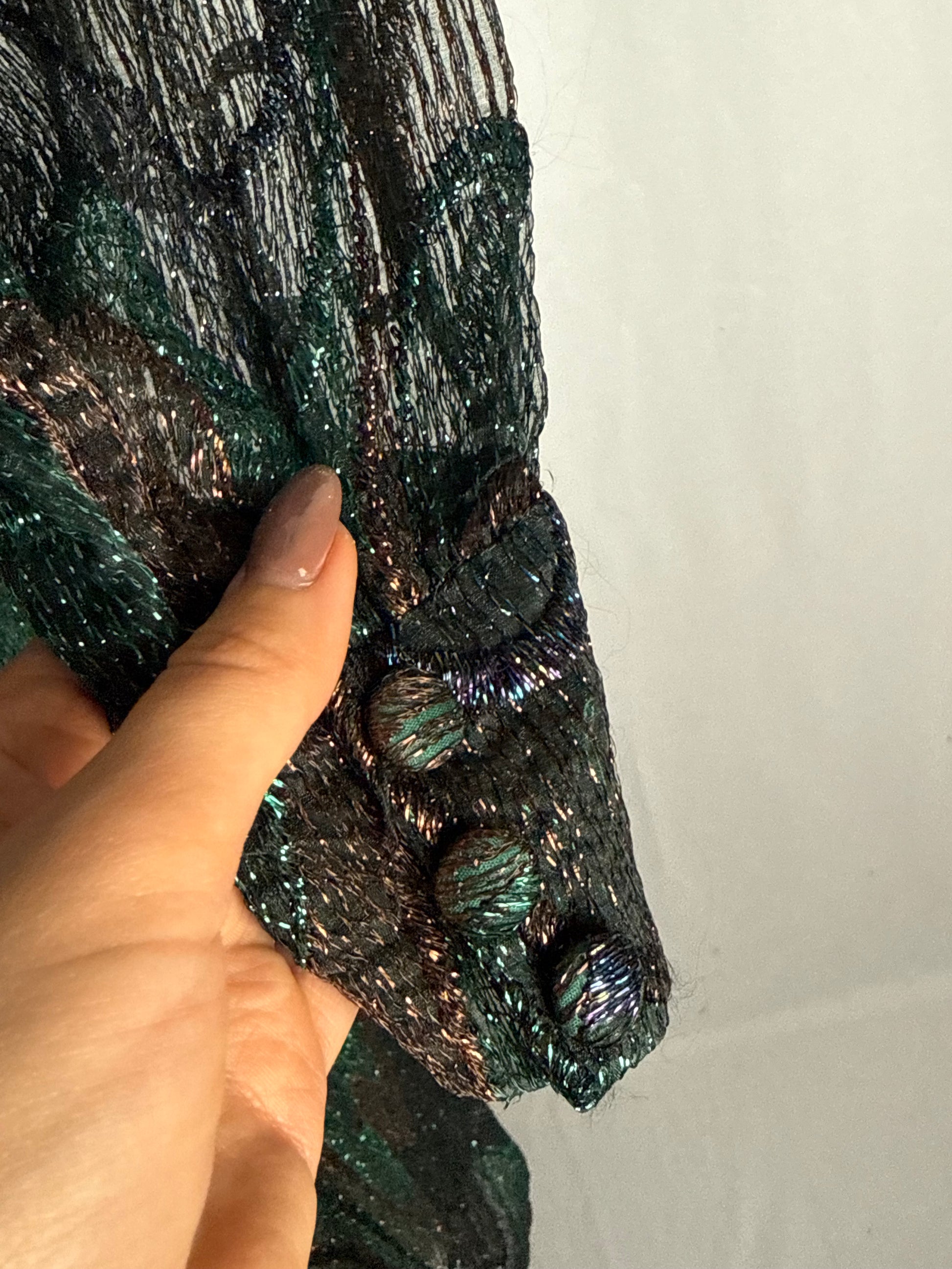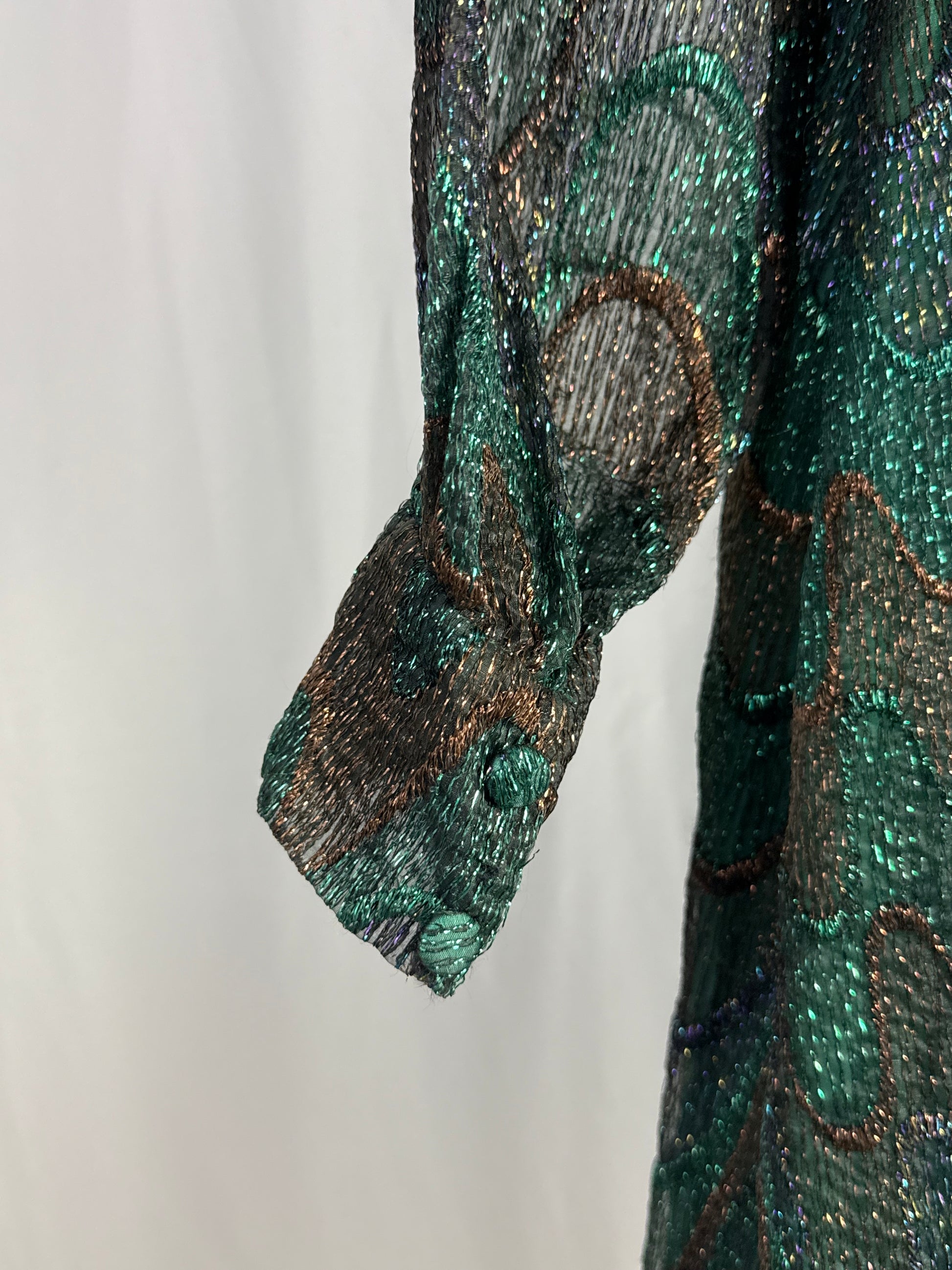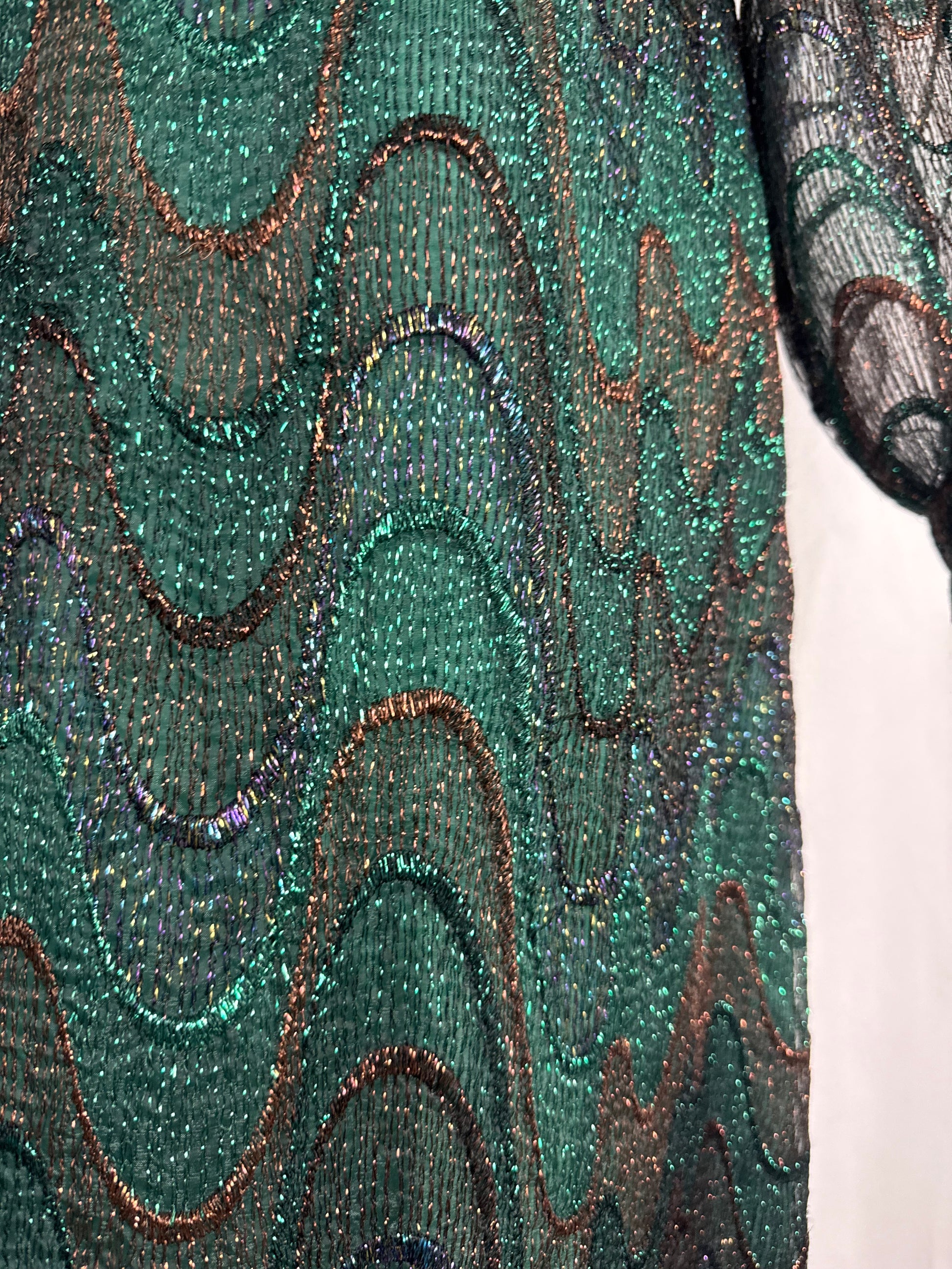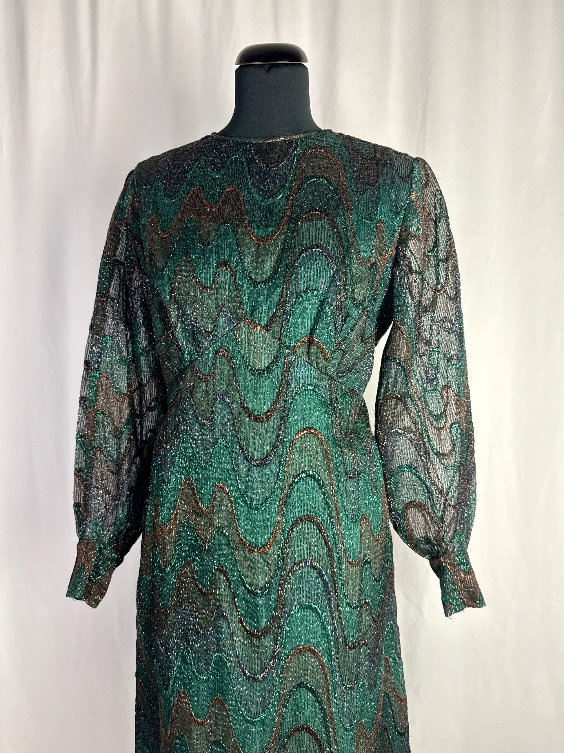 Abito anni ‘60 sartoriale in lurex verde con ricamo a motivo ondulato multitonale, texture brillante e trasparenze leggere. Corpino sagomato con pince, maniche lunghe morbide con polsino stretto e gonna svasata. Tessuto leggero e luminoso, foderato internamente per il massimo comfort.