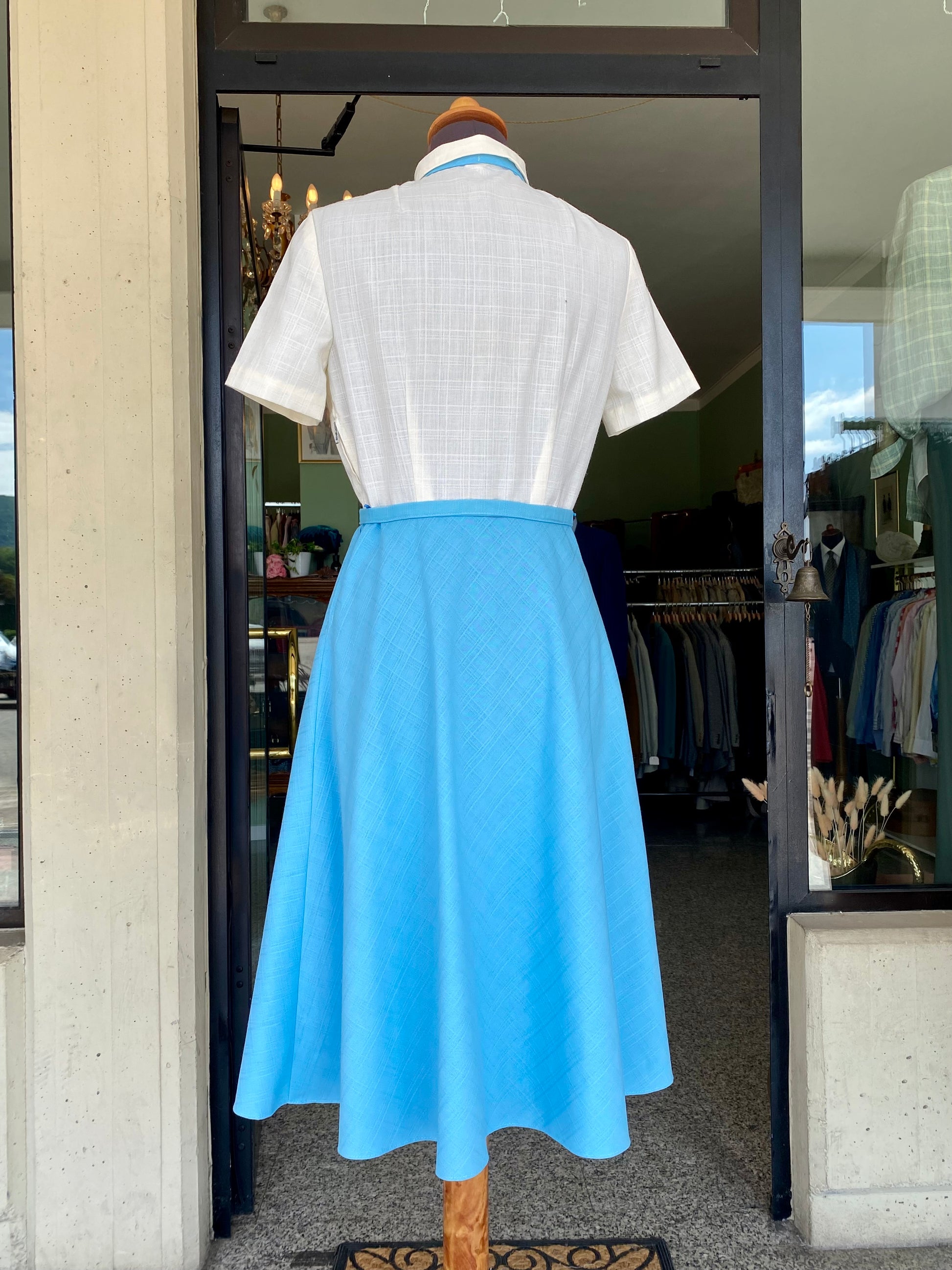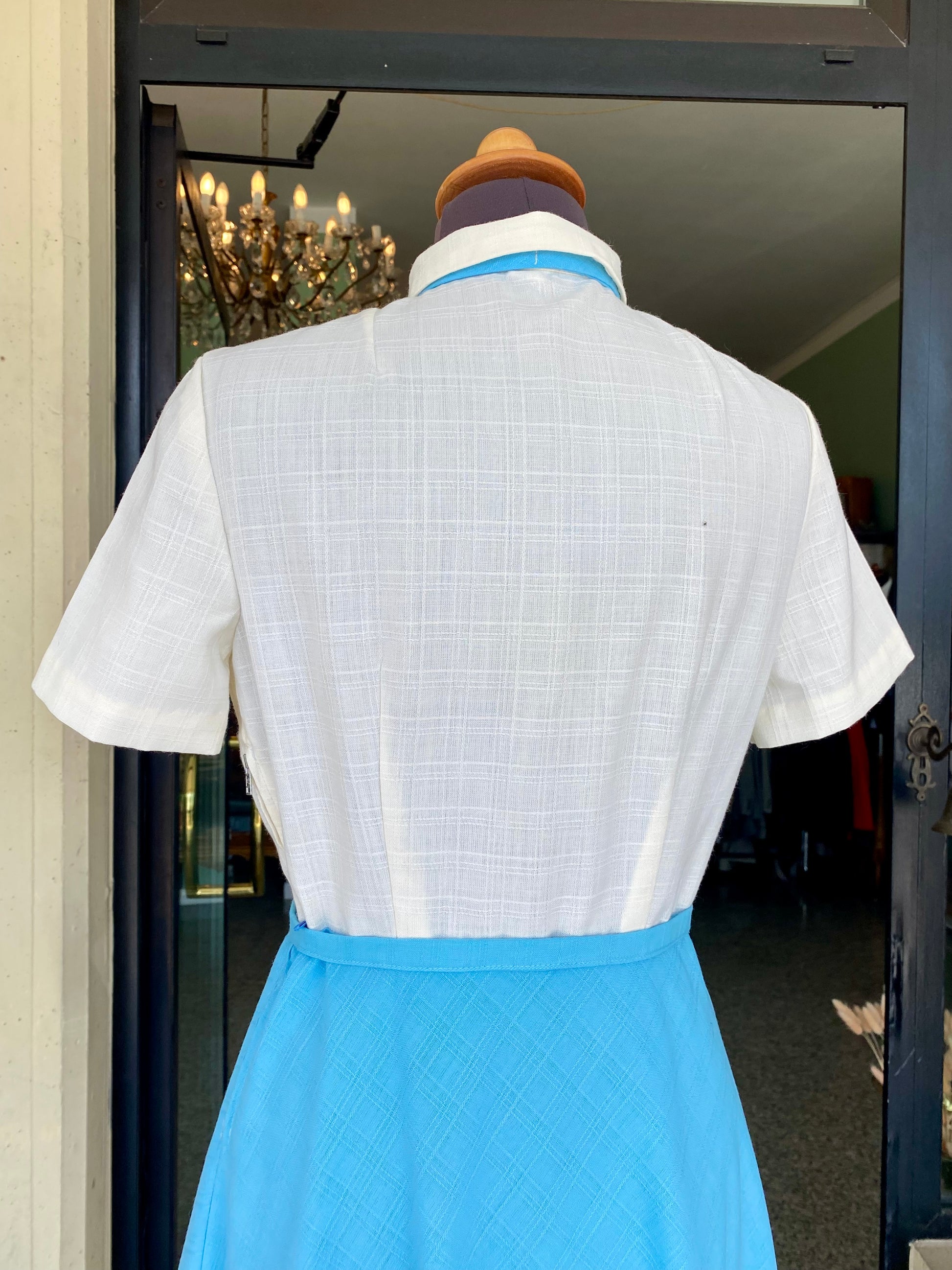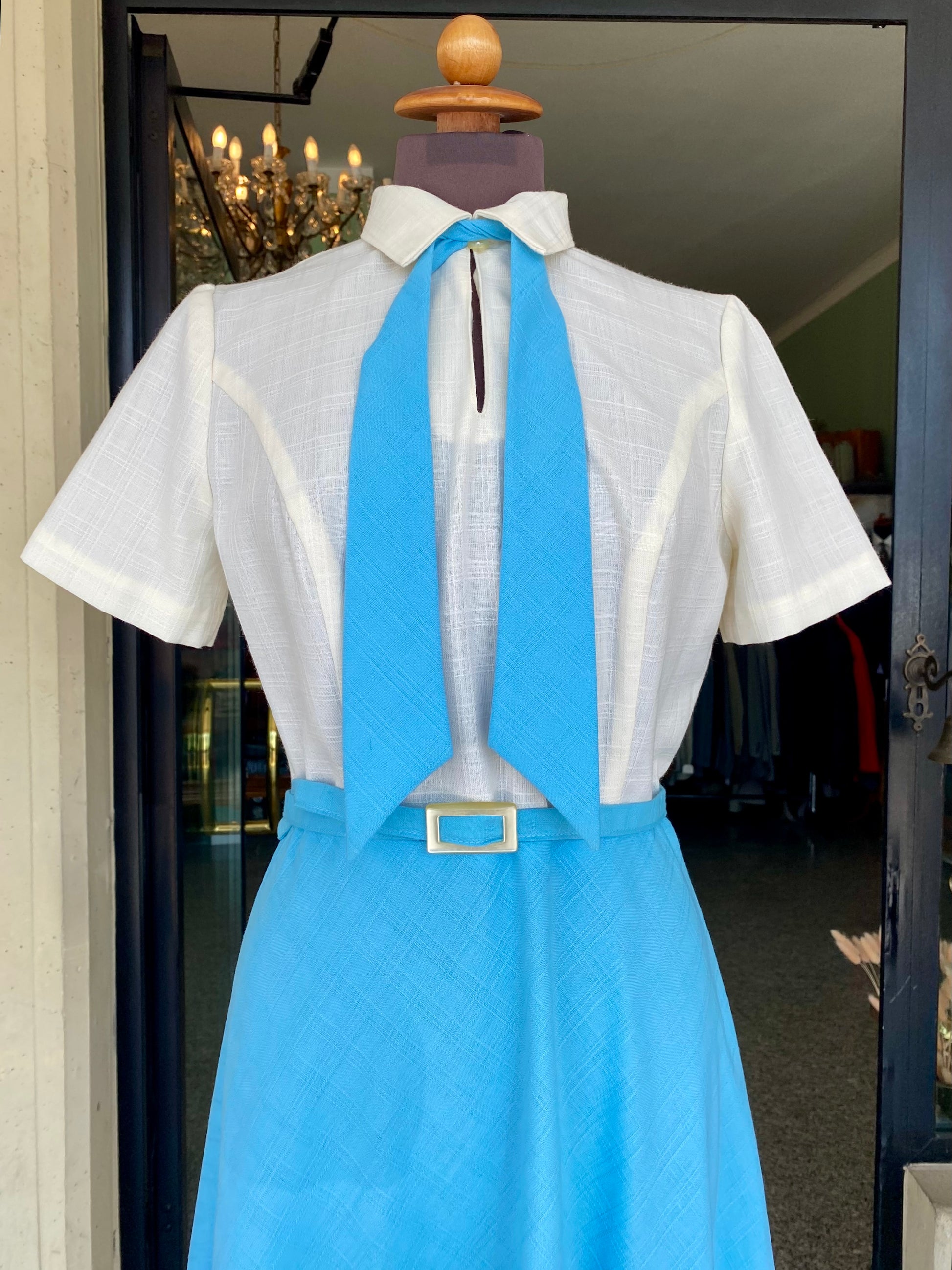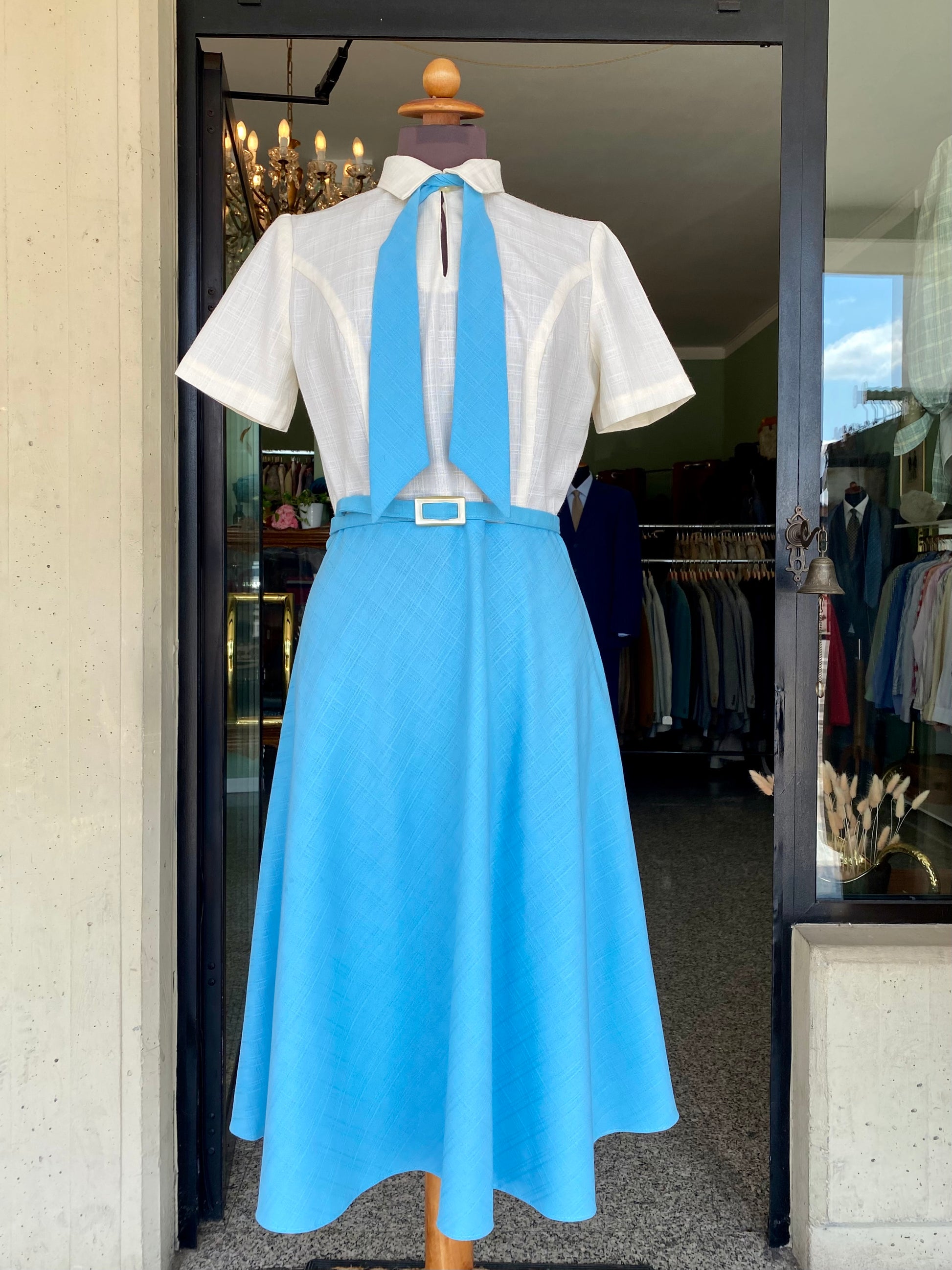 Questo elegante abito della fine degli anni ’60 è un perfetto esempio della sintesi tra formalità e freschezza tipica della moda del periodo. La struttura è netta ma leggera, lo stile sobrio ma di grande effetto visivo: il modello è composto da corpino bianco a maniche corte con colletto e foulard annodato integrato in tinta azzurro cielo, e da gonna svasata ampia in coordinato cromatico, con cinturina in tessuto e fibbia rettangolare.