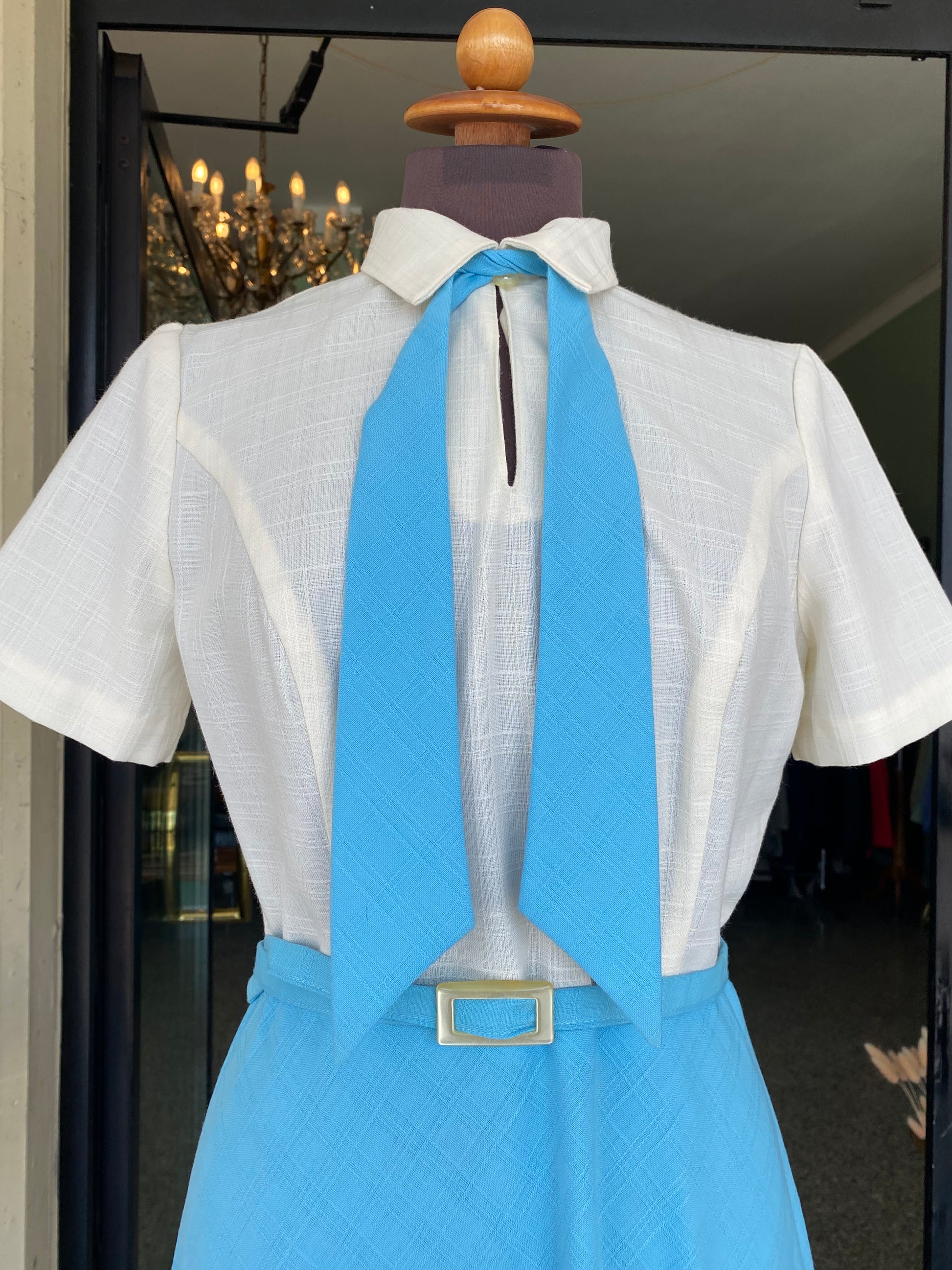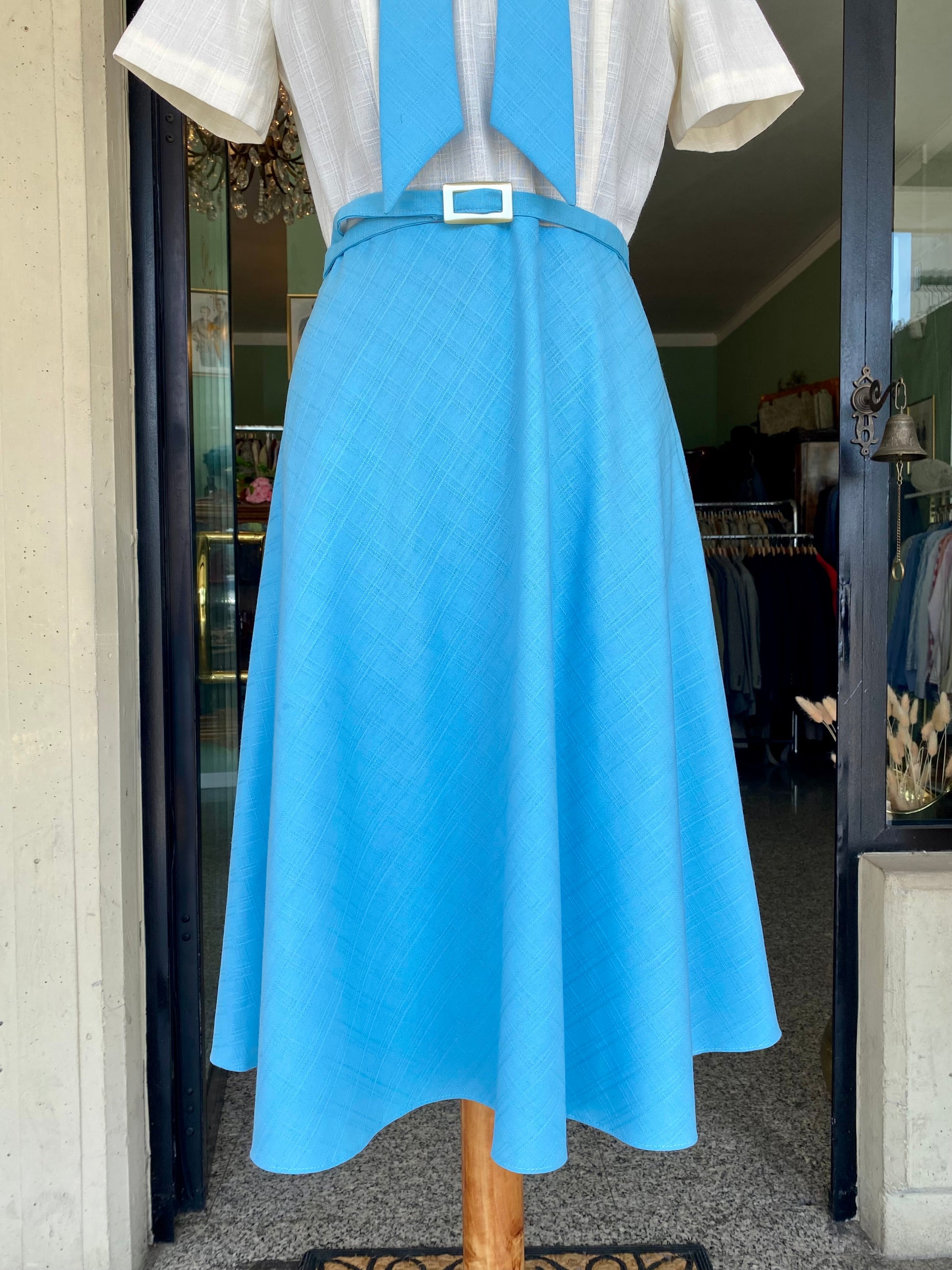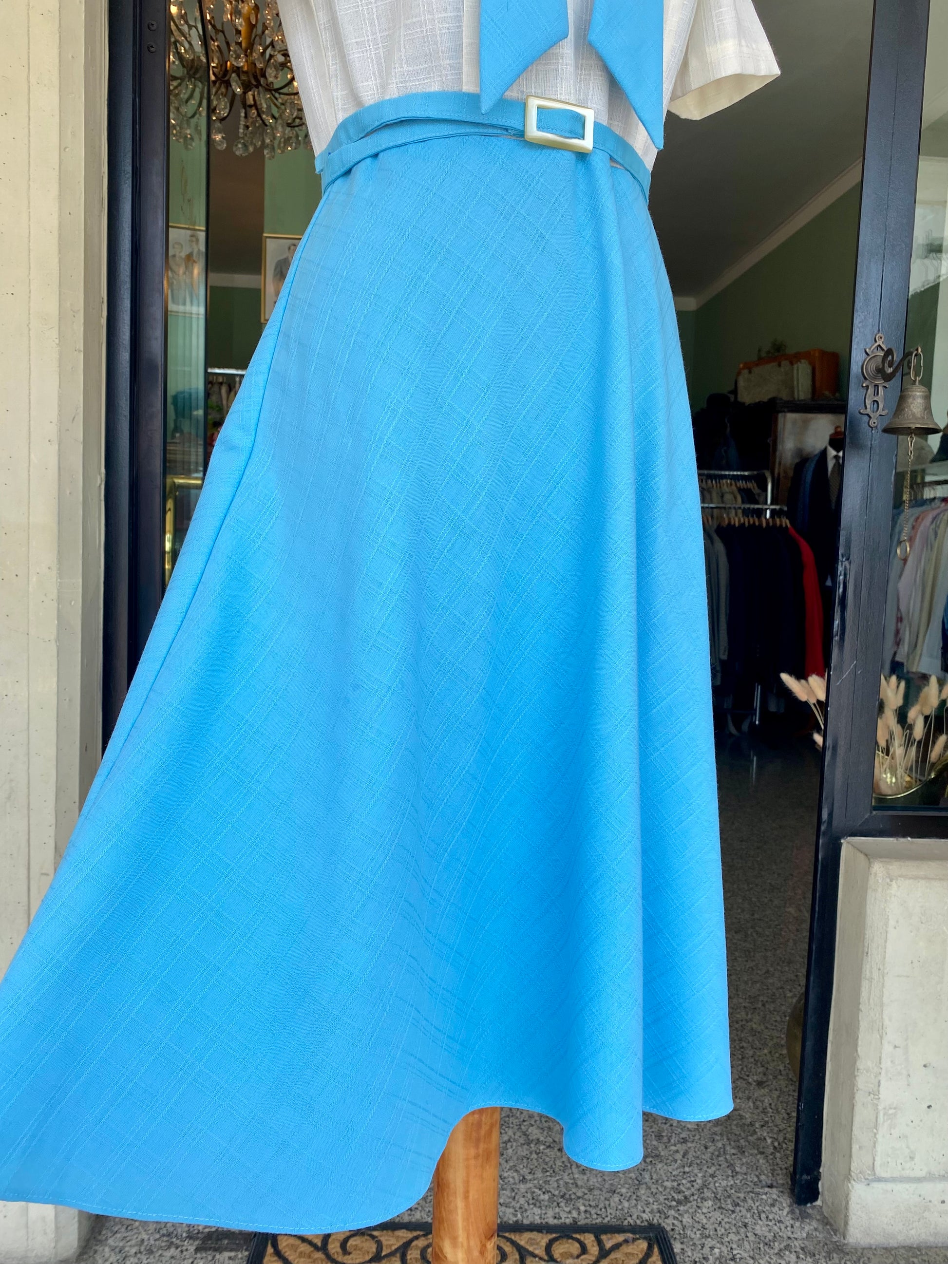 Questo elegante abito della fine degli anni ’60 è un perfetto esempio della sintesi tra formalità e freschezza tipica della moda del periodo. La struttura è netta ma leggera, lo stile sobrio ma di grande effetto visivo: il modello è composto da corpino bianco a maniche corte con colletto e foulard annodato integrato in tinta azzurro cielo, e da gonna svasata ampia in coordinato cromatico, con cinturina in tessuto e fibbia rettangolare.