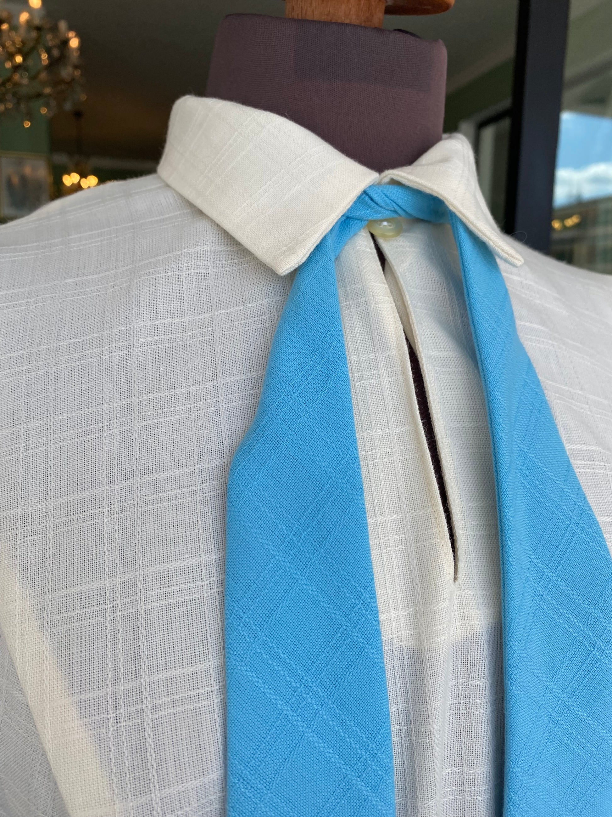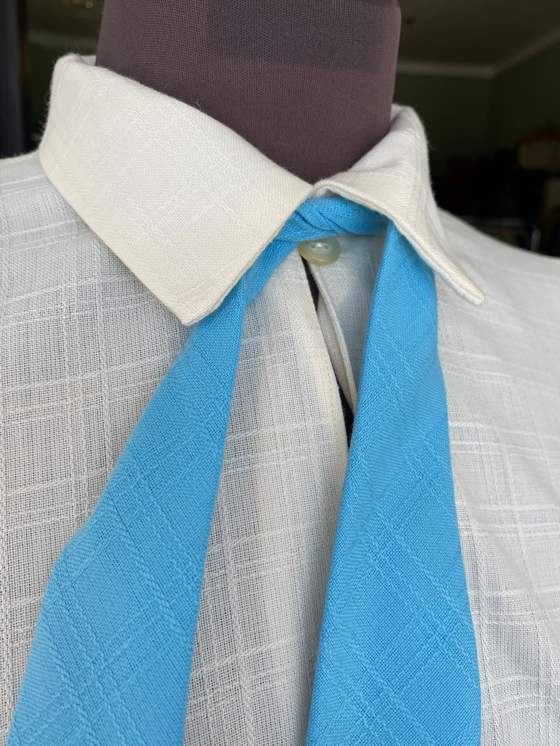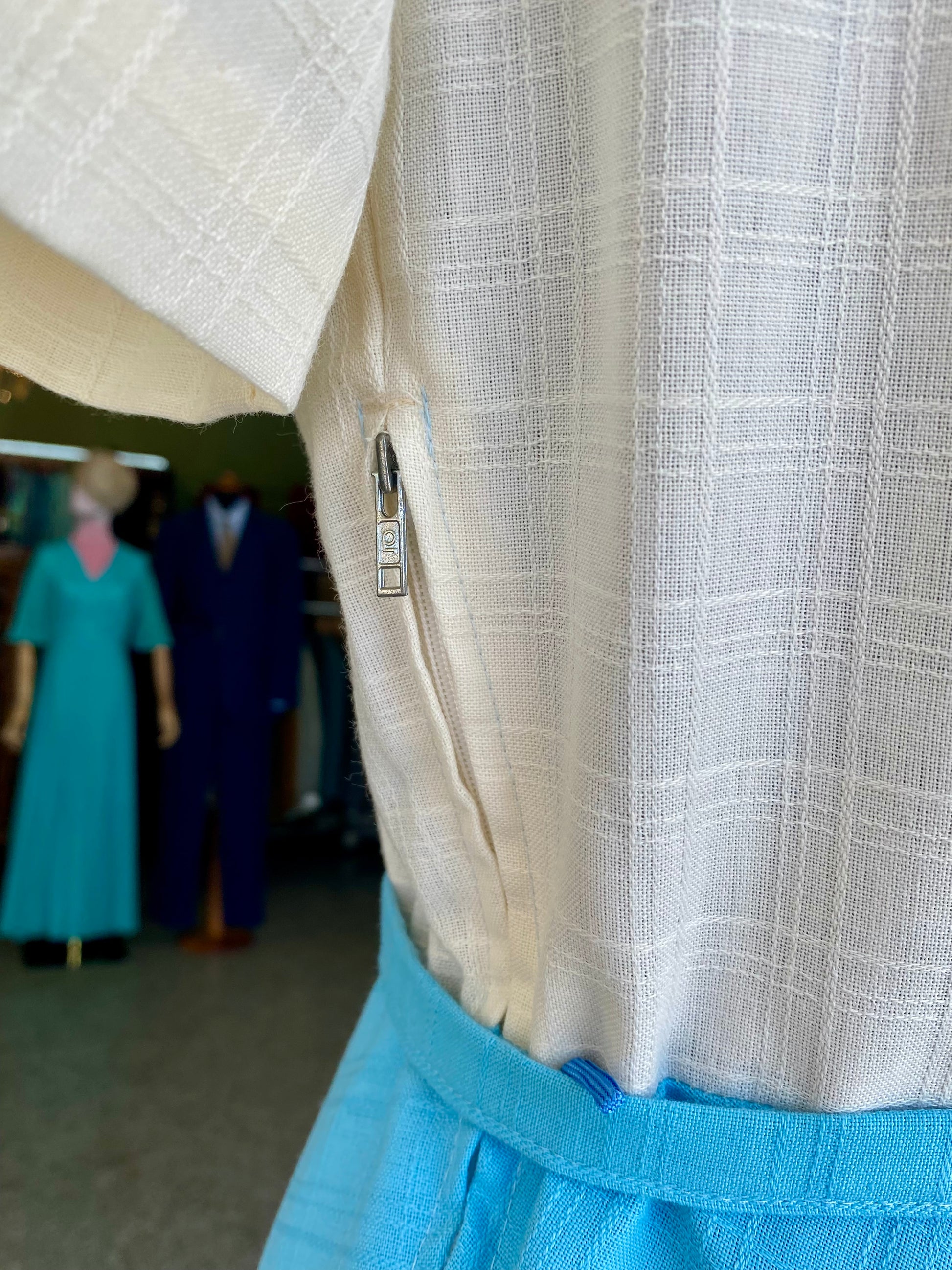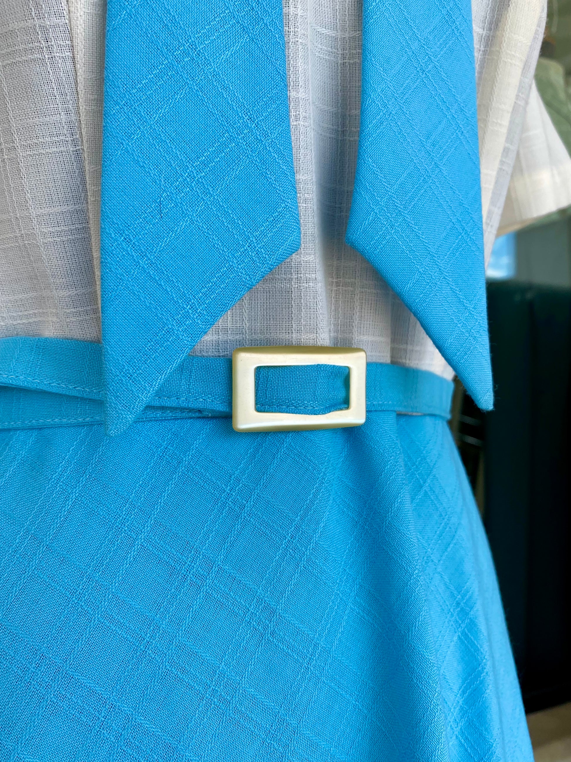 Questo elegante abito della fine degli anni ’60 è un perfetto esempio della sintesi tra formalità e freschezza tipica della moda del periodo. La struttura è netta ma leggera, lo stile sobrio ma di grande effetto visivo: il modello è composto da corpino bianco a maniche corte con colletto e foulard annodato integrato in tinta azzurro cielo, e da gonna svasata ampia in coordinato cromatico, con cinturina in tessuto e fibbia rettangolare.