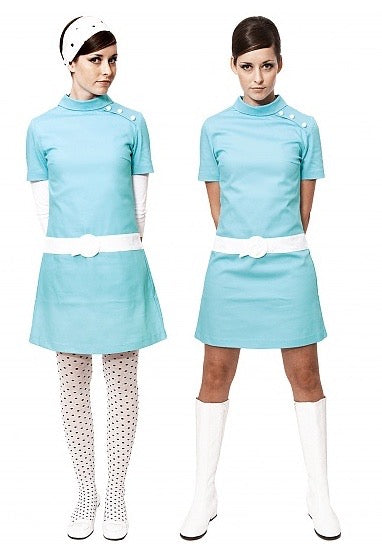 Il bicolore netto, in particolare l’abbinamento del bianco ottico con l’azzurro brillante, è fortemente rappresentativo della fine degli anni ’60, quando la moda si ispirava sempre più al design grafico, all’arte astratta e alle influenze optical. Stilisti come Pierre Cardin, André Courrèges e Paco Rabanne avevano già introdotto un linguaggio visivo basato su blocchi cromatici, tagli netti e strutture pulite, e questa estetica veniva ripresa anche nel prêt-à-porter per un pubblico femminile più vasto.
