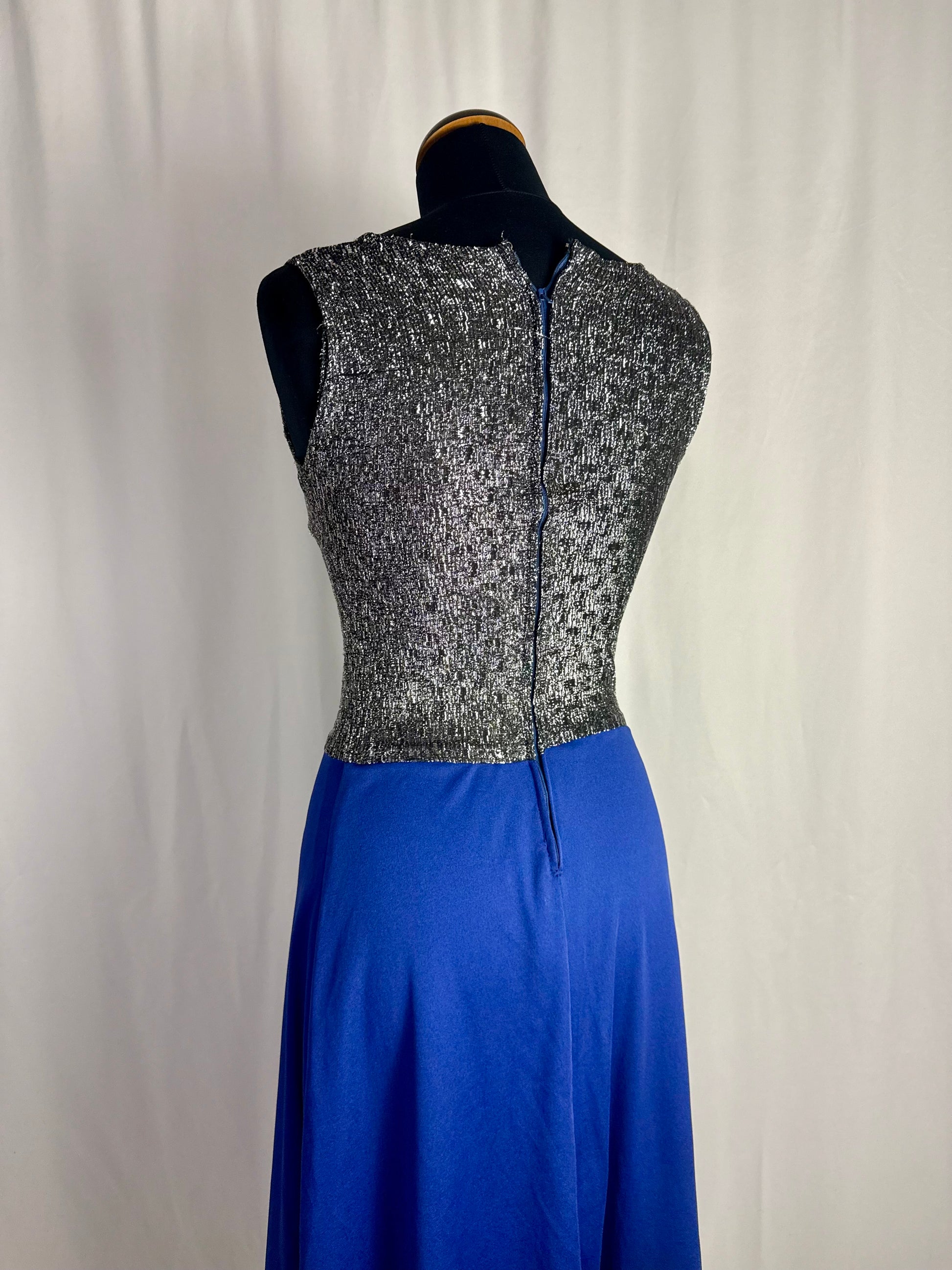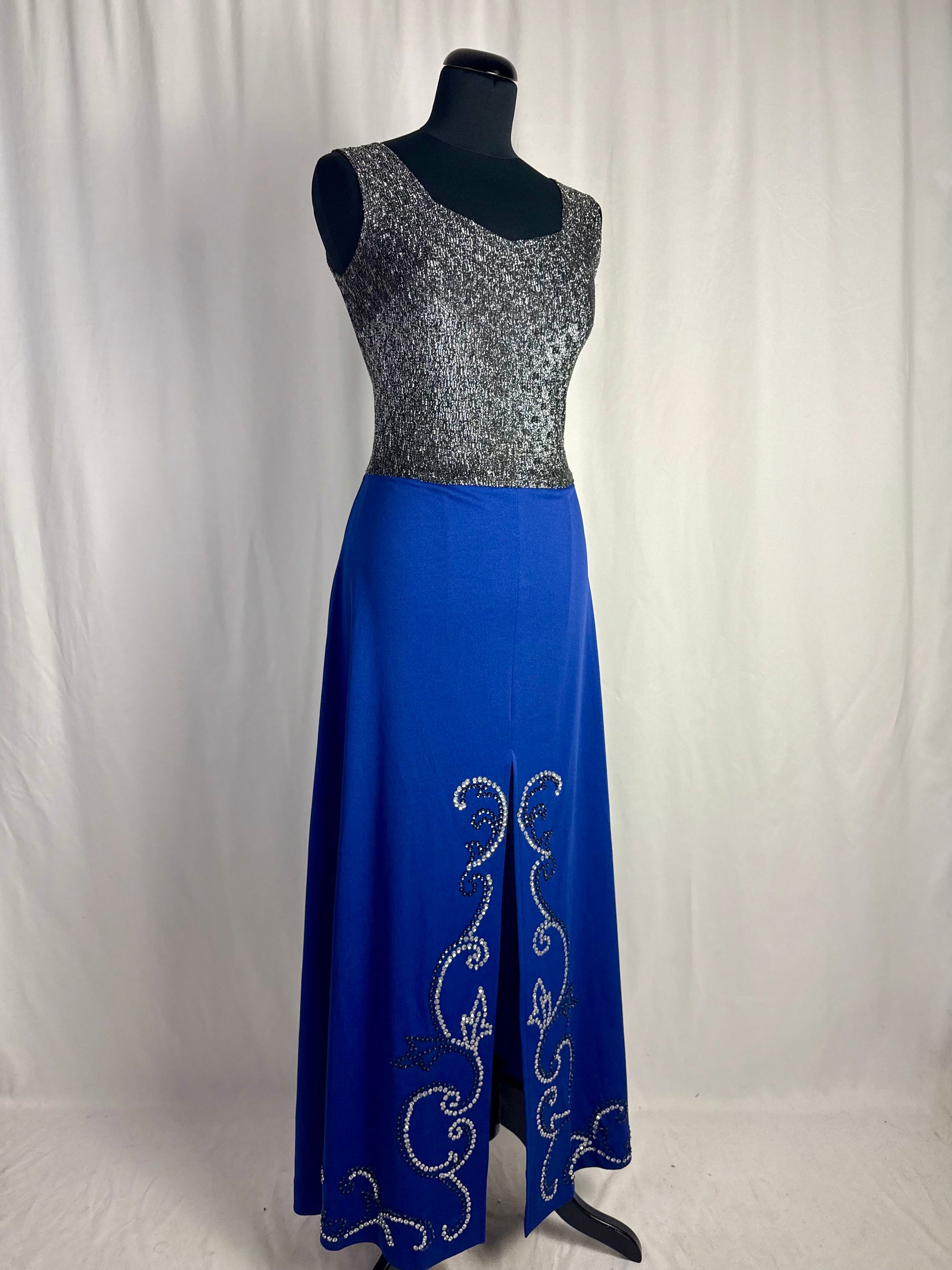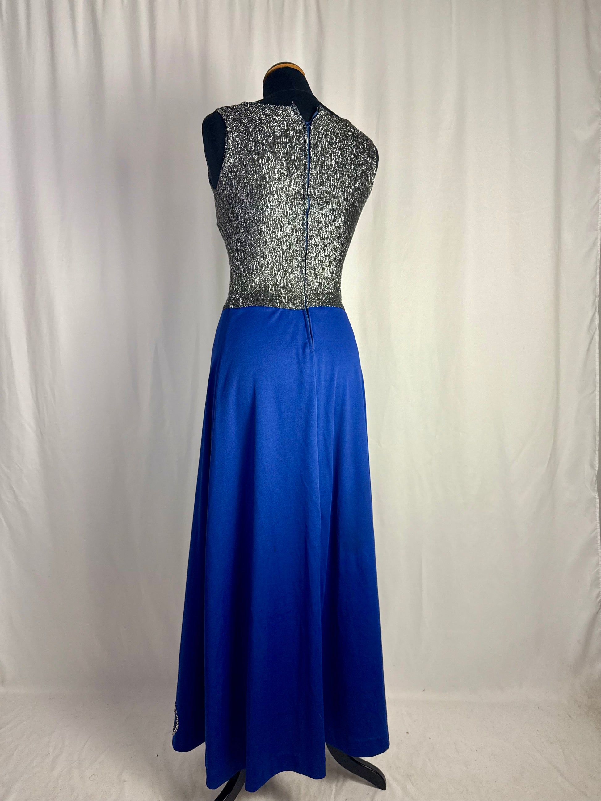 Abito anni ‘70 composto da corpino aderente in tessuto lamé argento effetto metallizzato, caratterizzato da scollatura ampia arrotondata e superficie a micro-lurex che crea una trama irregolare brillante, unito a una gonna lunga in jersey blu elettrico a taglio svasato con spacco frontale centrale. Il fondo della gonna è decorato da elaborati ricami a motivo arabesco realizzati con strass applicati in due tonalità (trasparente e blu scuro).