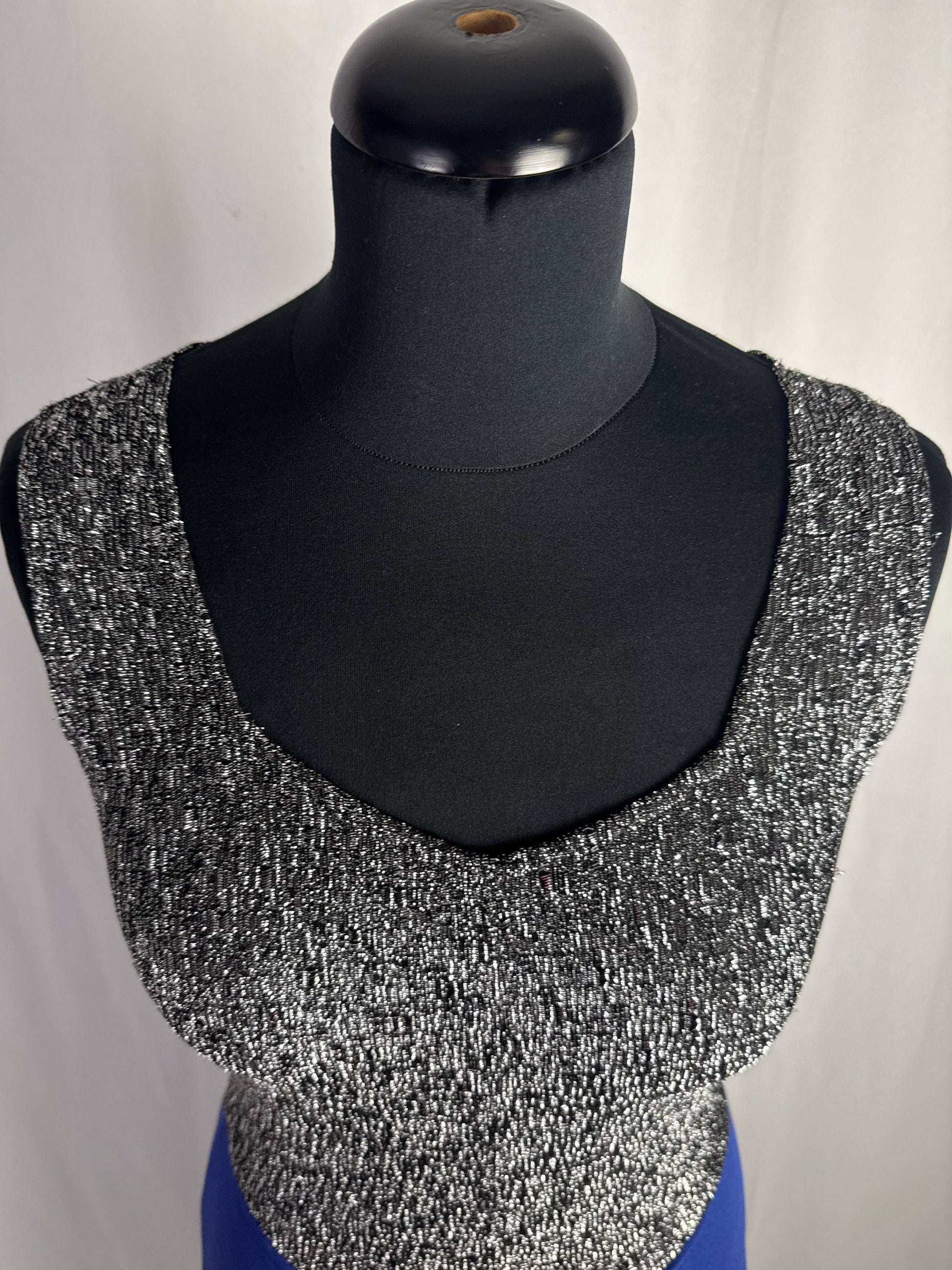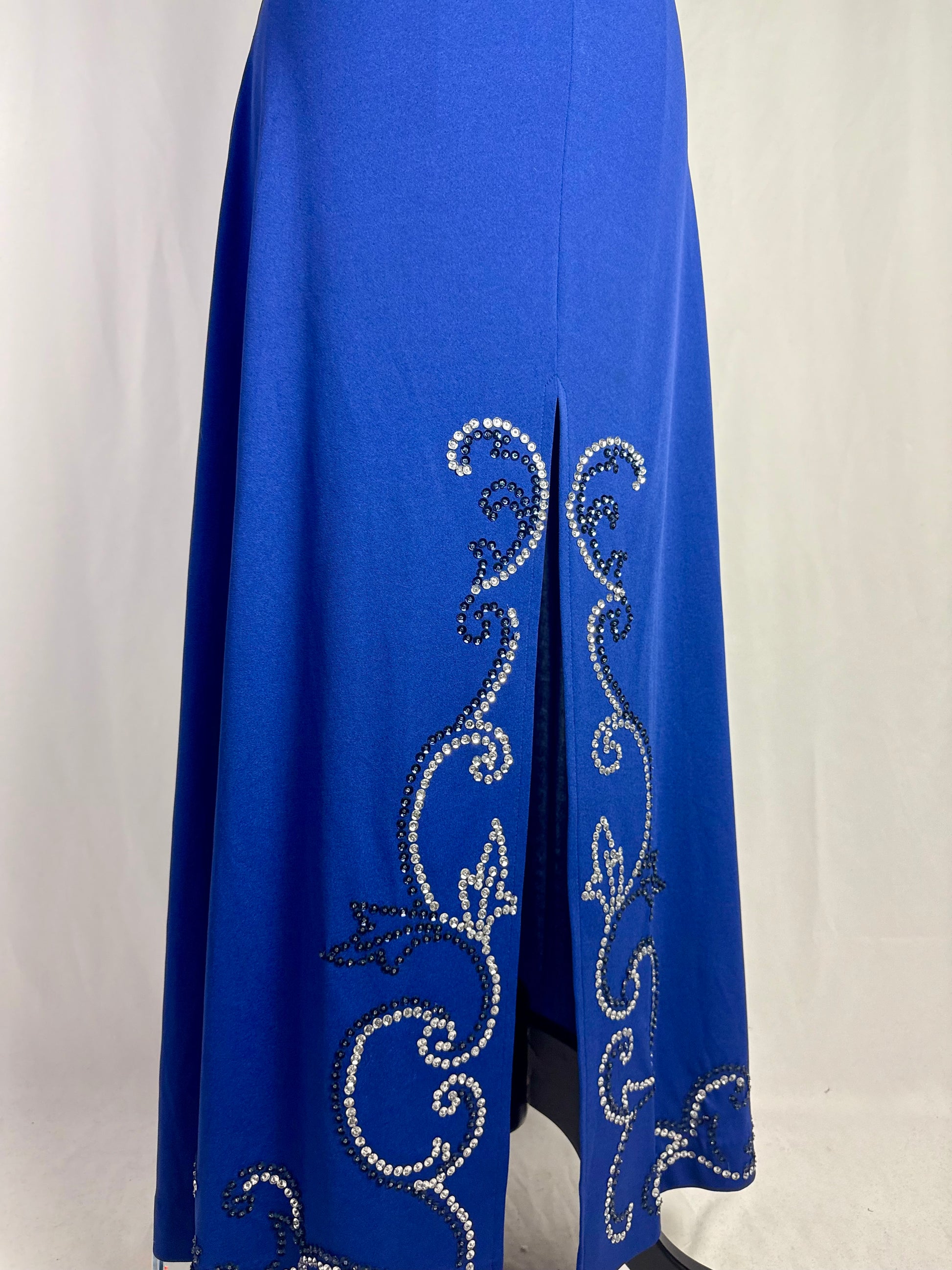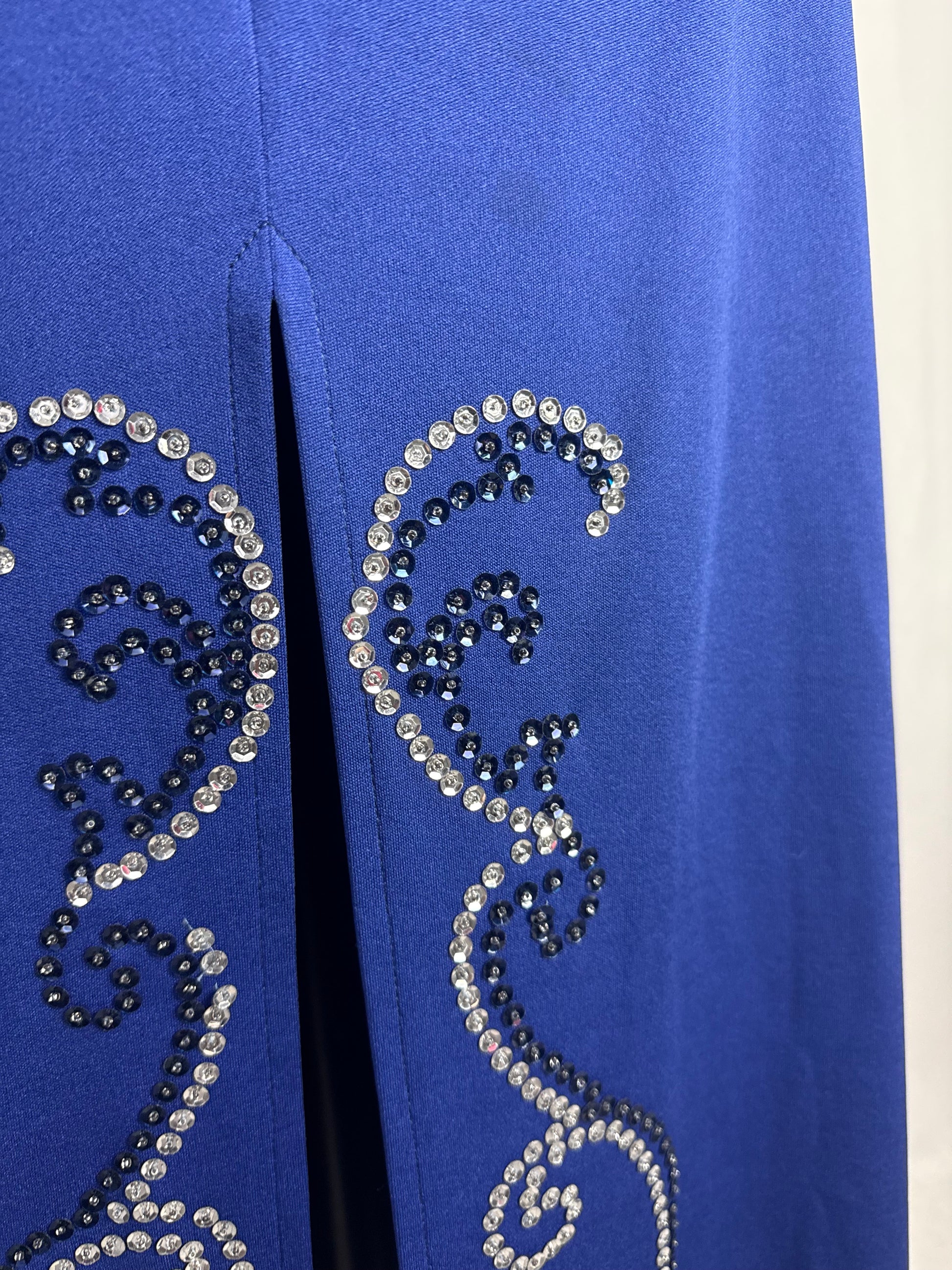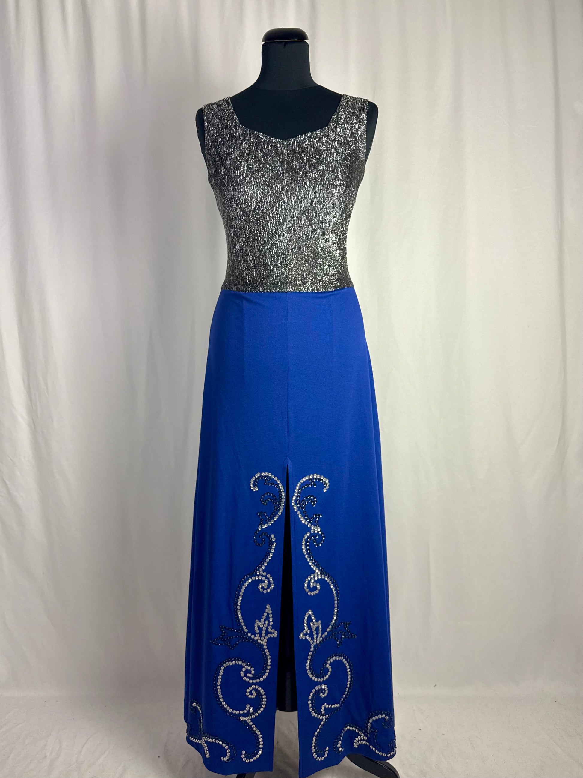 Abito anni ‘70 composto da corpino aderente in tessuto lamé argento effetto metallizzato, caratterizzato da scollatura ampia arrotondata e superficie a micro-lurex che crea una trama irregolare brillante, unito a una gonna lunga in jersey blu elettrico a taglio svasato con spacco frontale centrale. Il fondo della gonna è decorato da elaborati ricami a motivo arabesco realizzati con strass applicati in due tonalità (trasparente e blu scuro).