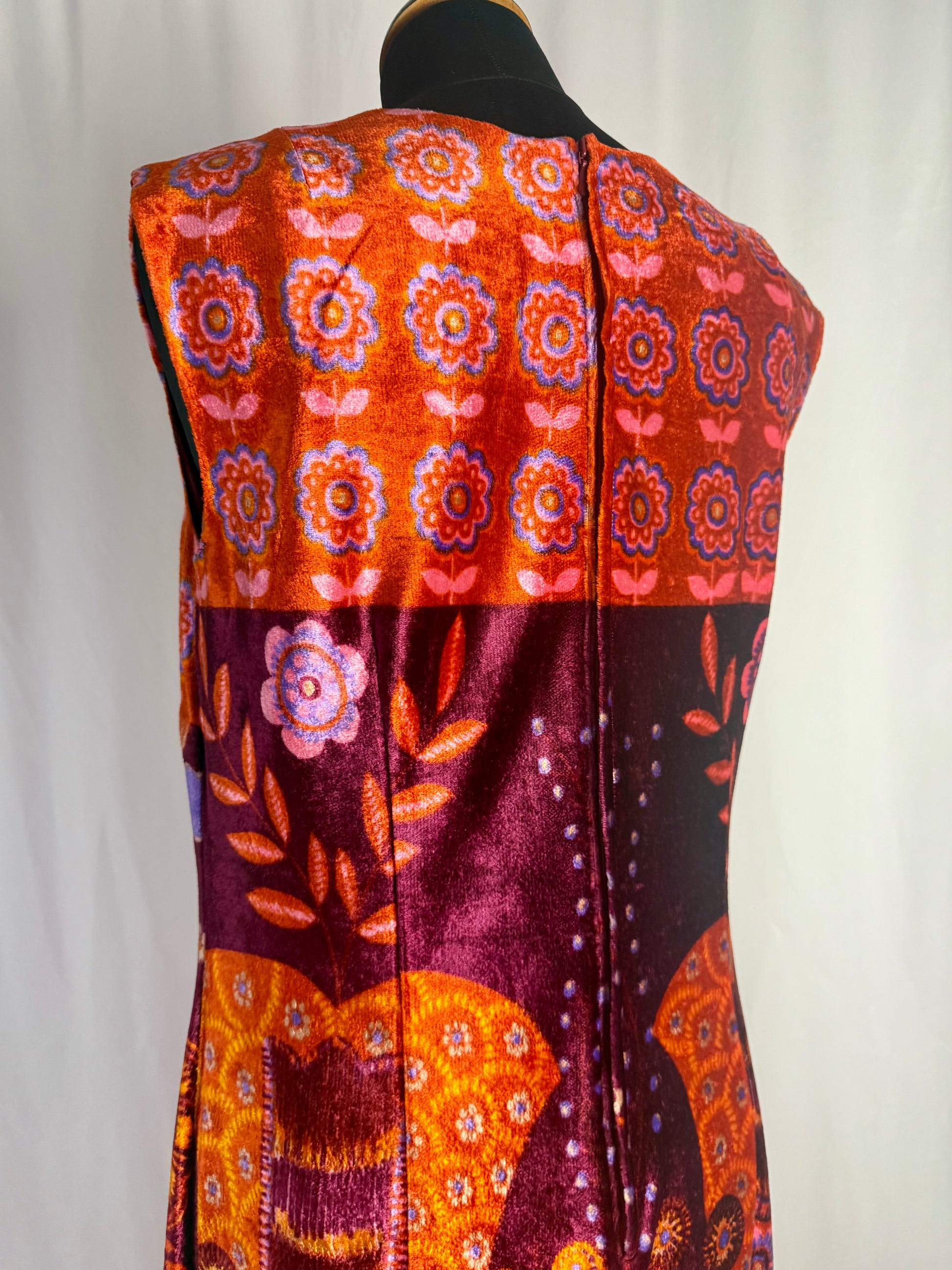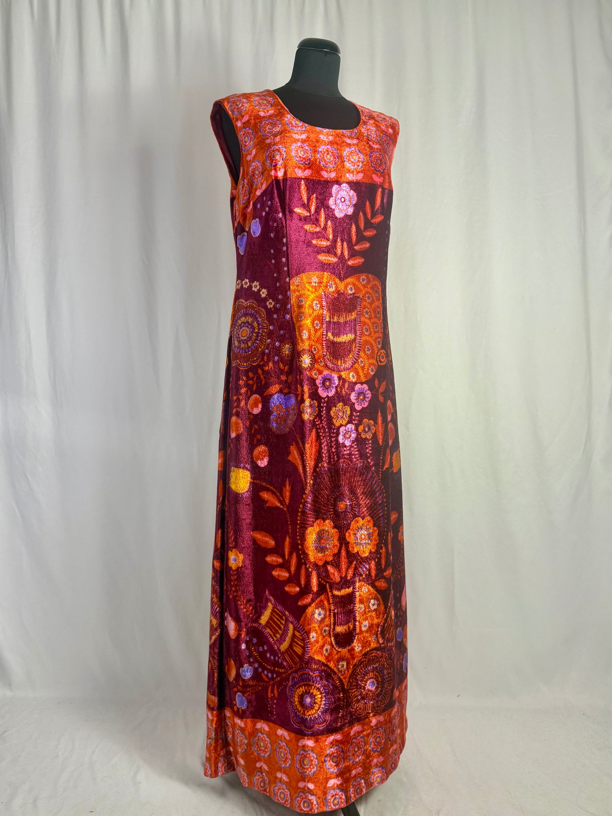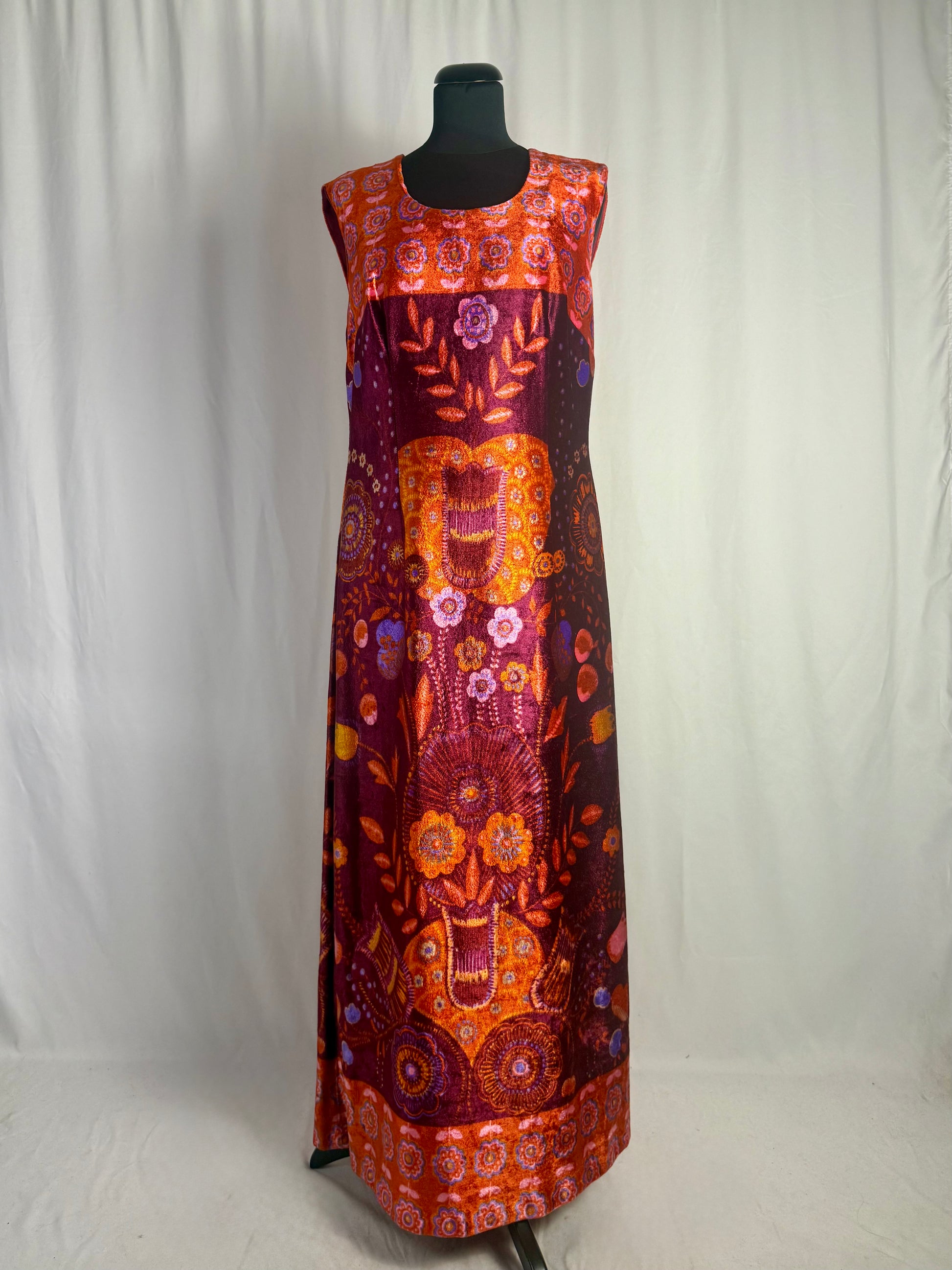 Maxi dress anni ‘70 realizzato in velour stampato, caratterizzato da un motivo decorativo multicolore prevalentemente nei toni del bordeaux, arancio, fucsia e viola, con pattern floreali e geometrici distribuiti su tutta la superficie. Il disegno a pannelli verticali e orizzontali crea zone grafiche differenziate, con dettagli ornamentali stilizzati che includono fiori, foglie e forme decorative, conferendo al capo un effetto visivo ricco e vibrante. L’abito presenta il tipico modello svasato in voga nel decennio.