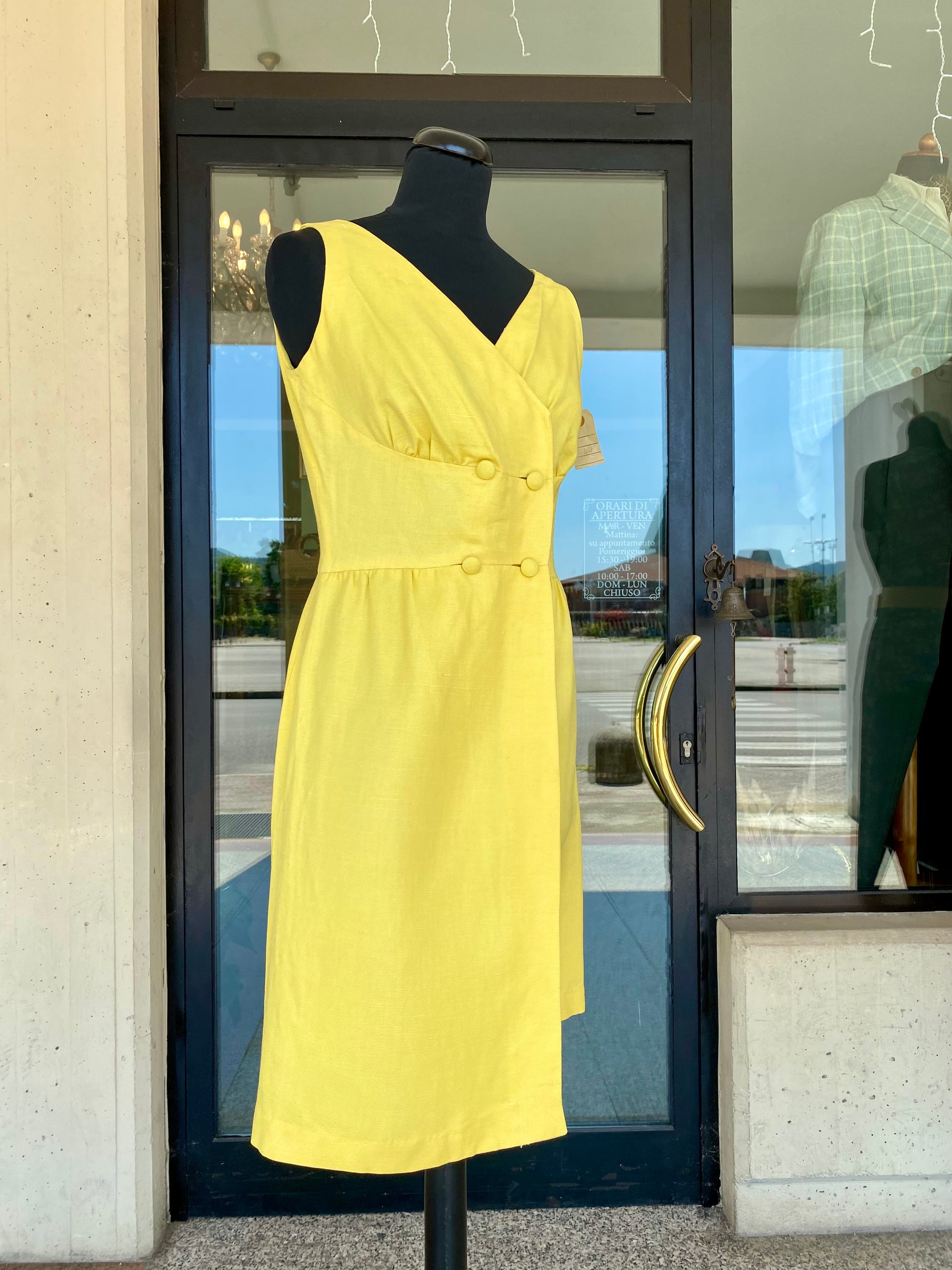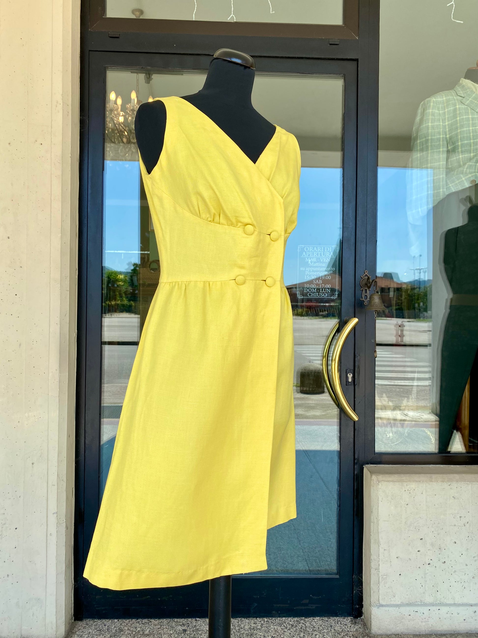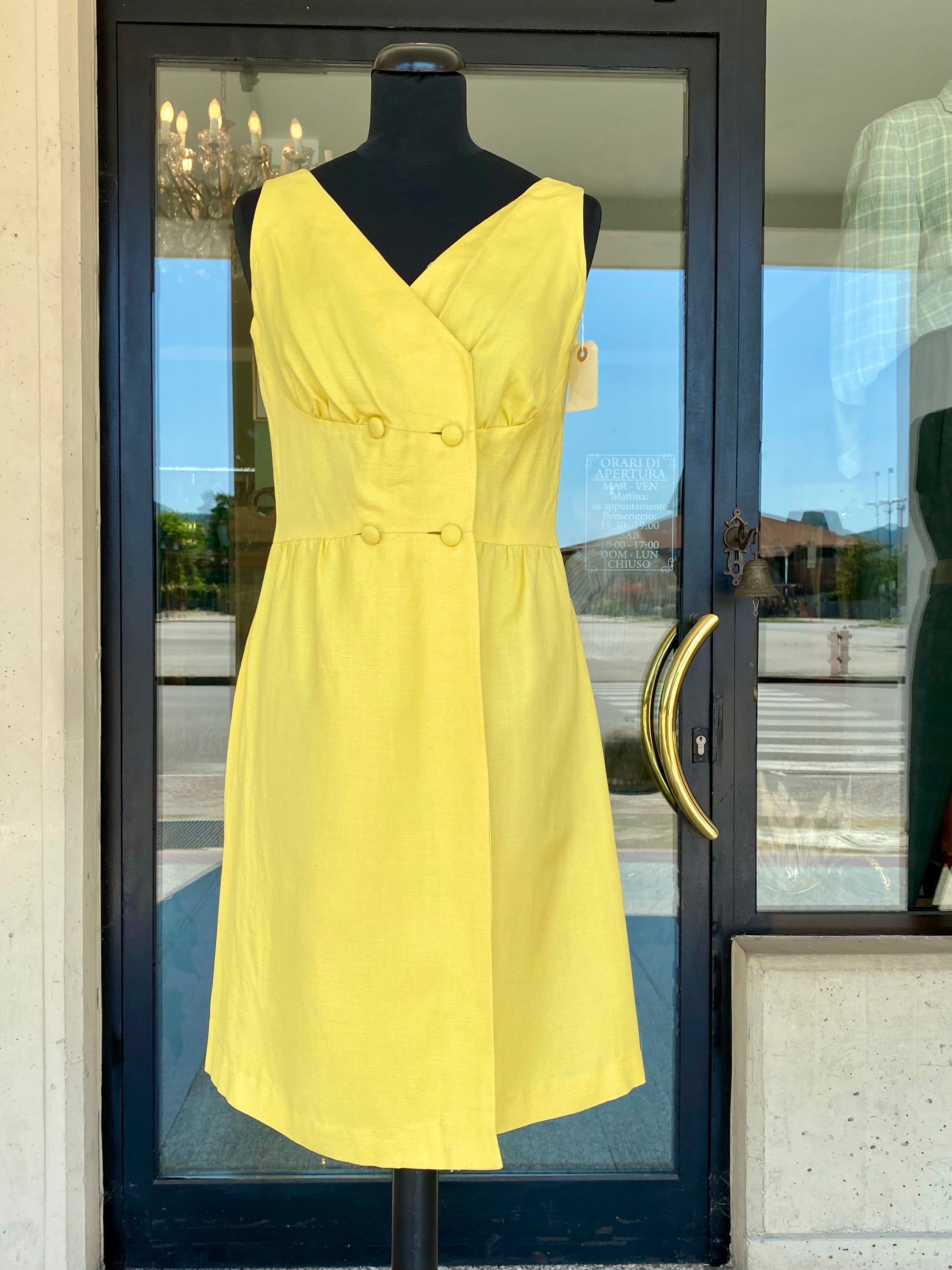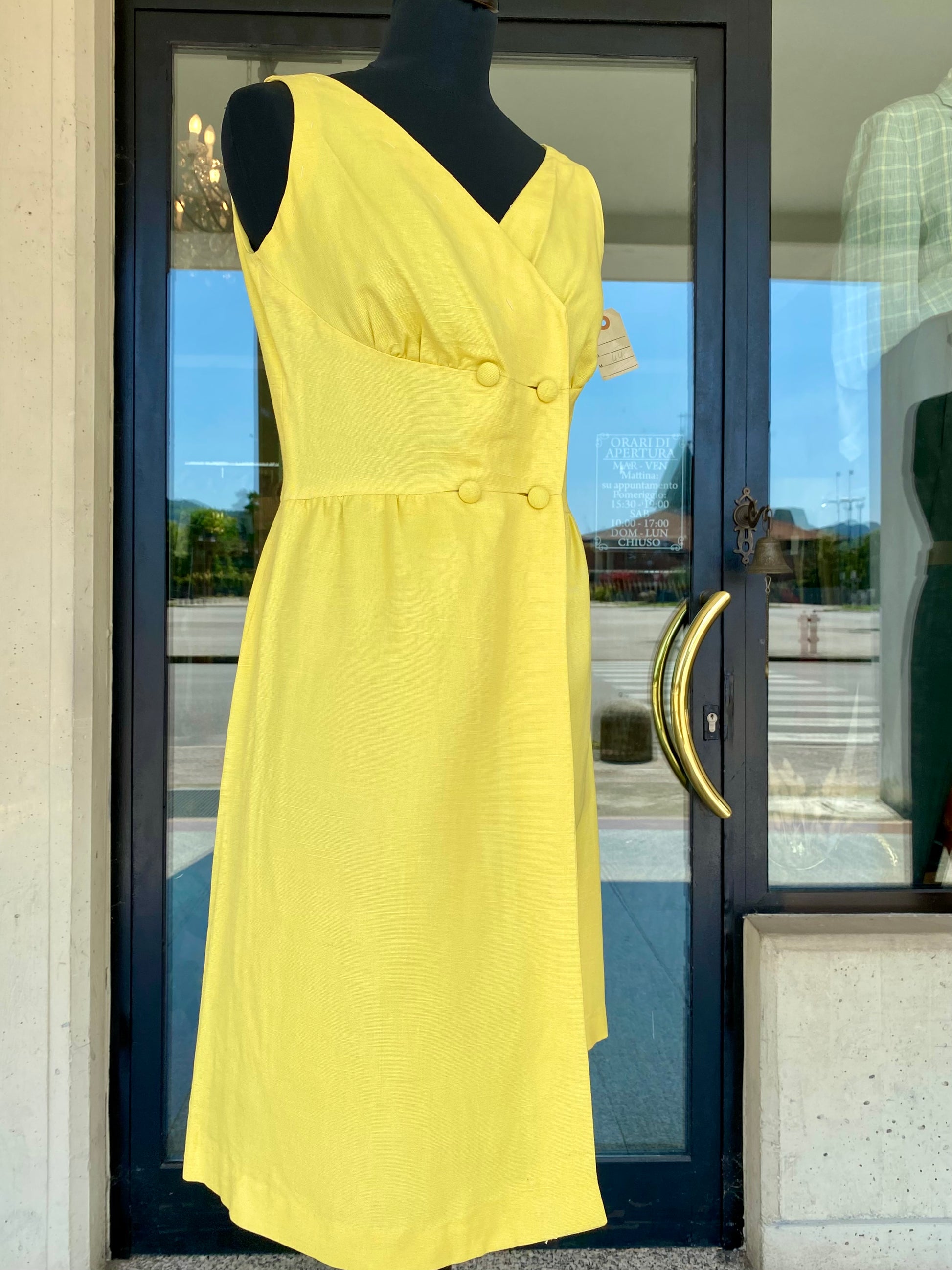 Abito a portafoglio anni ’70 in puro lino color giallo sole, fondo di magazzino mai indossato. Il taglio valorizza la figura, con un corpetto incrociato che mette in risalto il décolleté, una vita ben segnata da due file di bottoni rivestiti e una gonna dalla linea leggermente svasata. Fresco, luminoso, perfetto per l’estate.