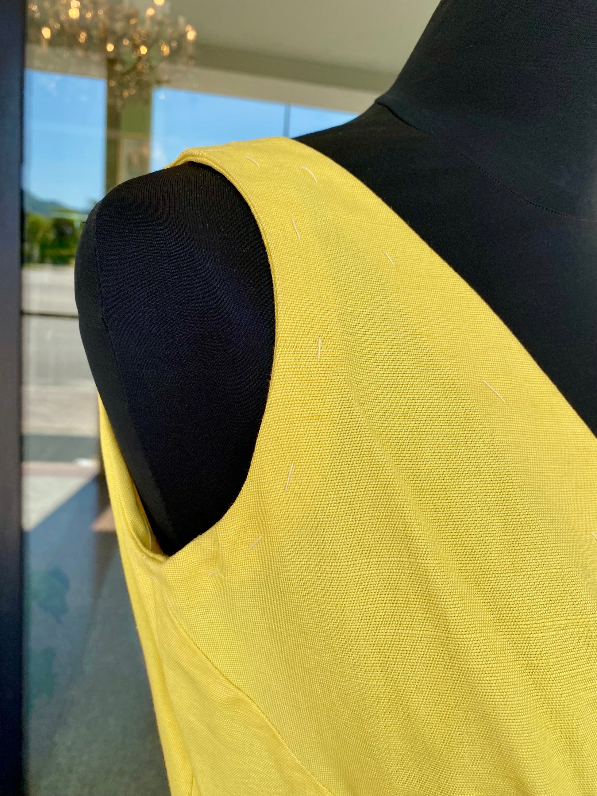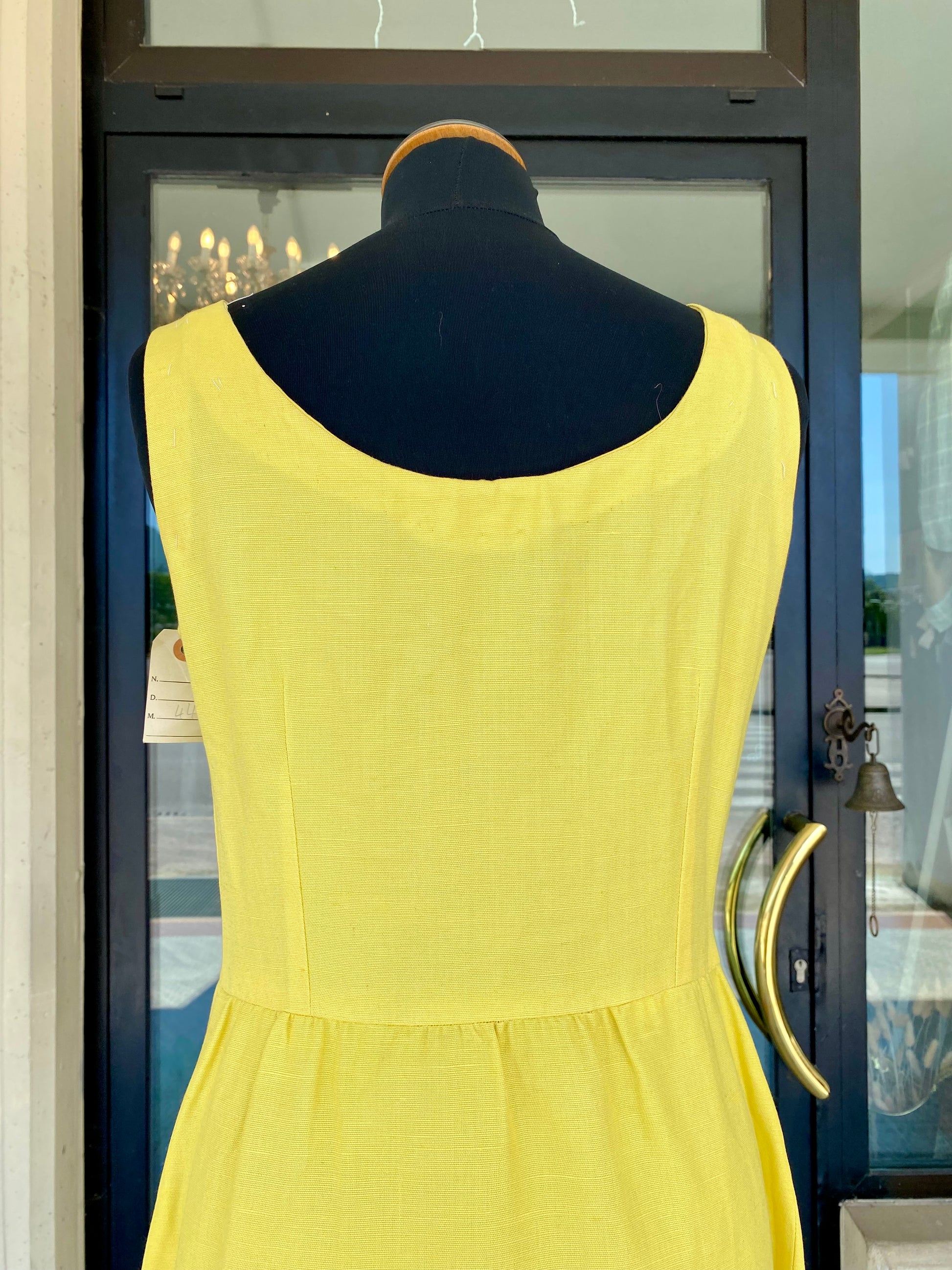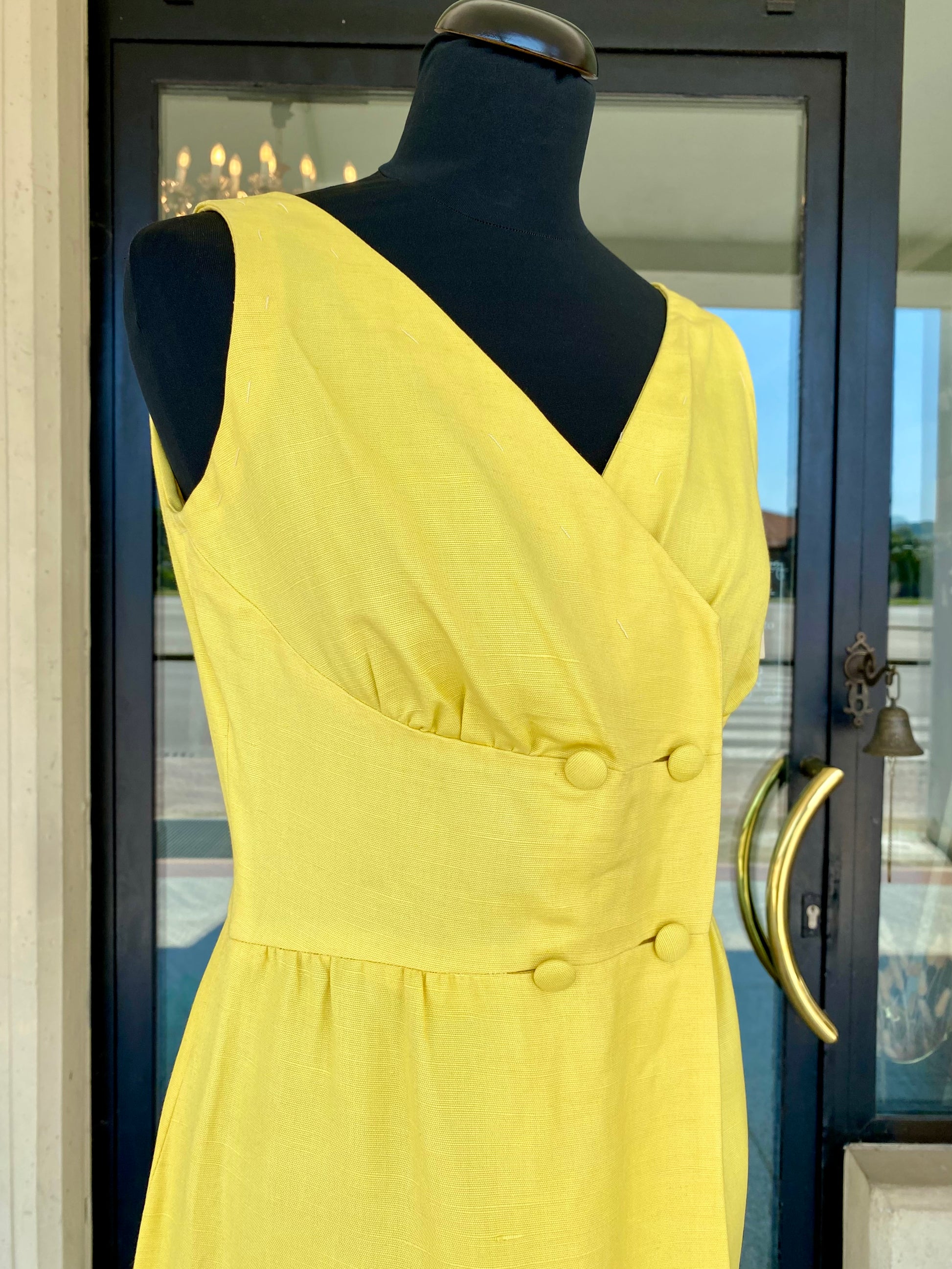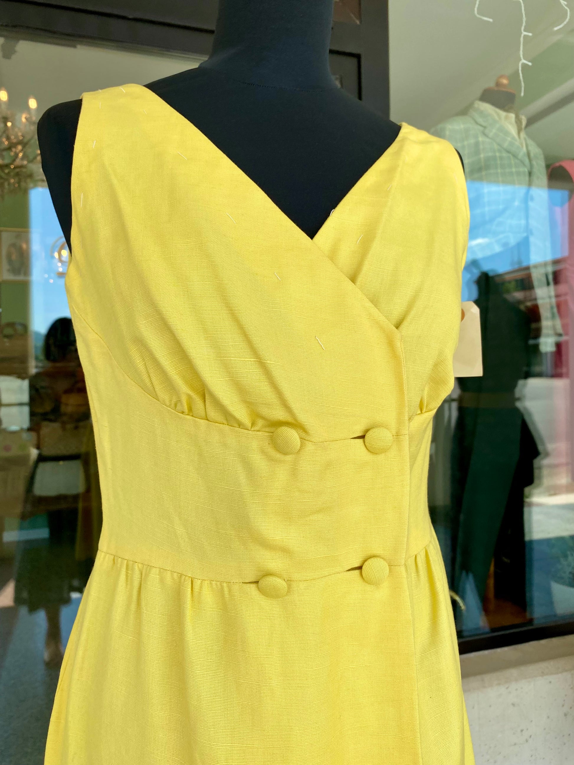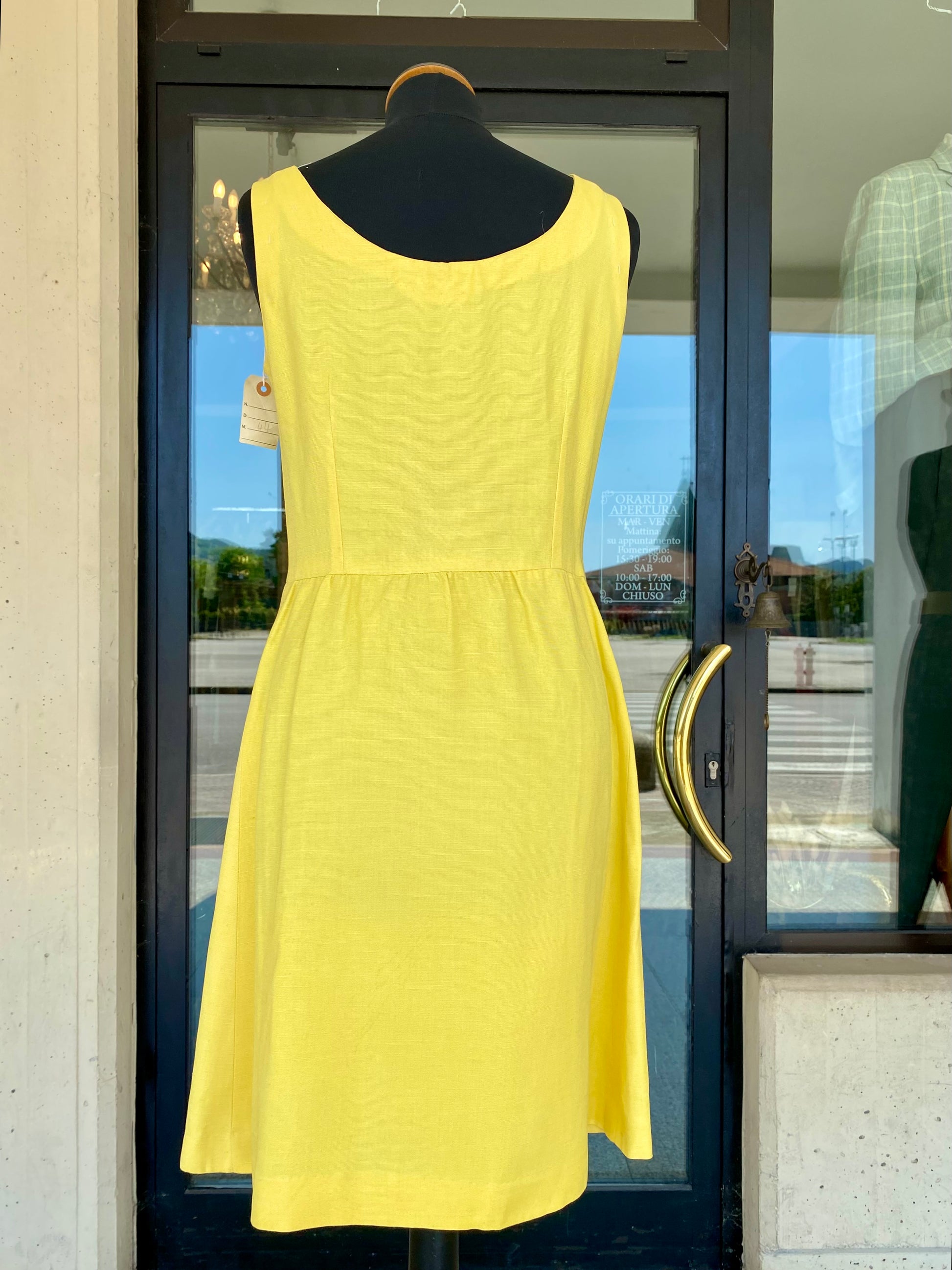 Abito a portafoglio anni ’70 in puro lino color giallo sole, fondo di magazzino mai indossato. Il taglio valorizza la figura, con un corpetto incrociato che mette in risalto il décolleté, una vita ben segnata da due file di bottoni rivestiti e una gonna dalla linea leggermente svasata. Fresco, luminoso, perfetto per l’estate.