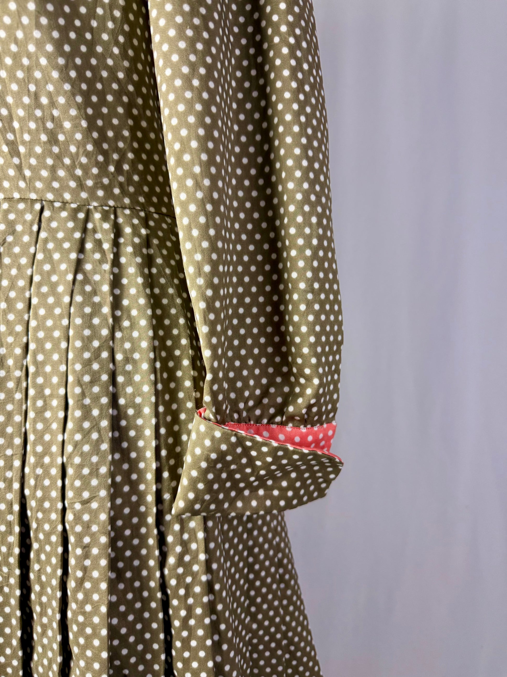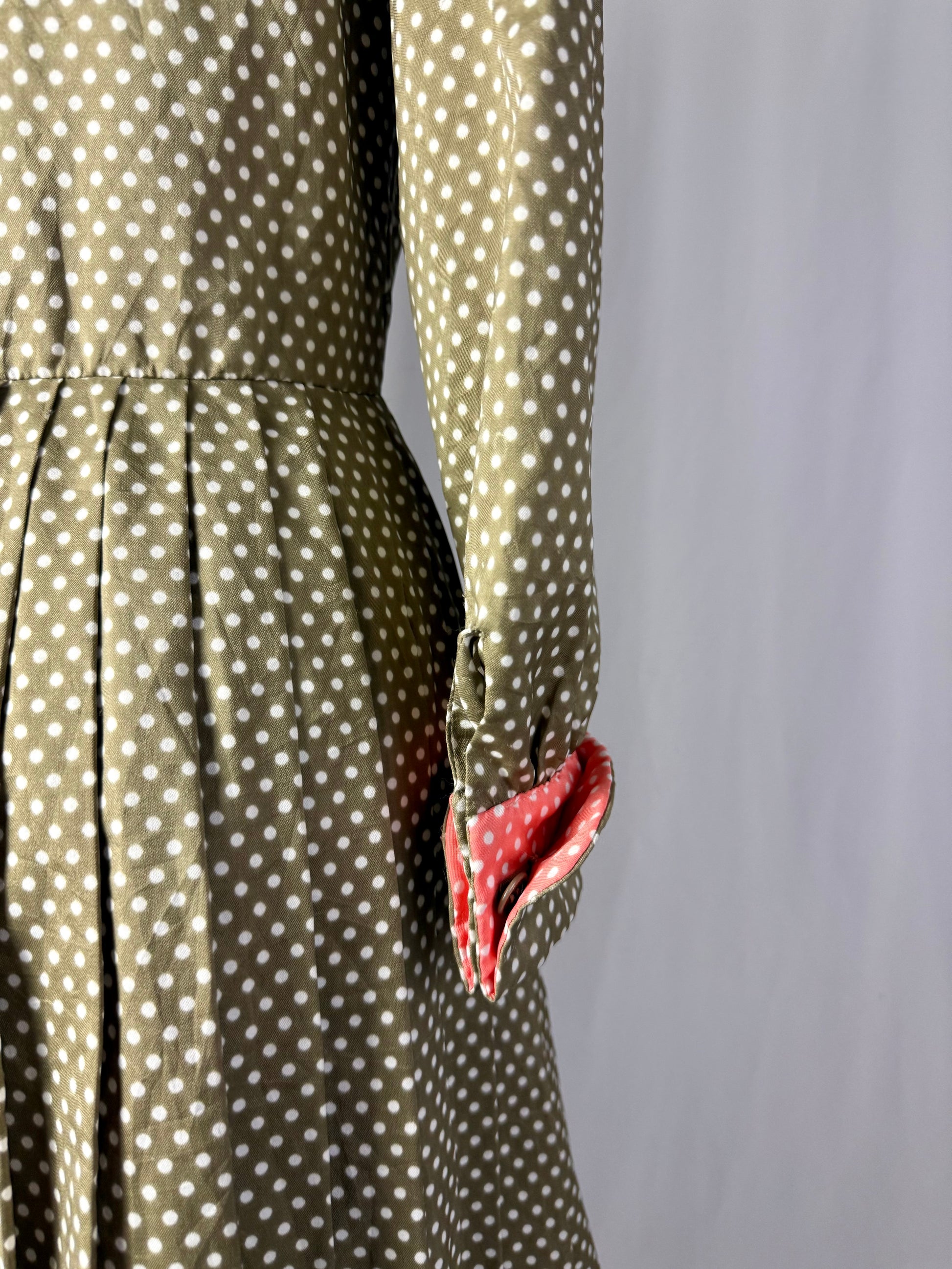 Modello chemisier con corpino strutturato e gonna ampia a pieghe cucite in vita. Color verde salvia a piccoli pois bianchi. Dettaglio distintivo: il contrasto interno in tessuto corallo a pois bianchi, visibile su colletto e polsini, che dona al capo una nota di brio e originalità. Presenta due taschini applicati sul petto, maniche lunghe con polsino abbottonato e chiusura anteriore con bottoni tono su tono. Le cuciture modellanti del corpino e la precisione del taglio evidenziano una confezione artigianale di alta qualità.