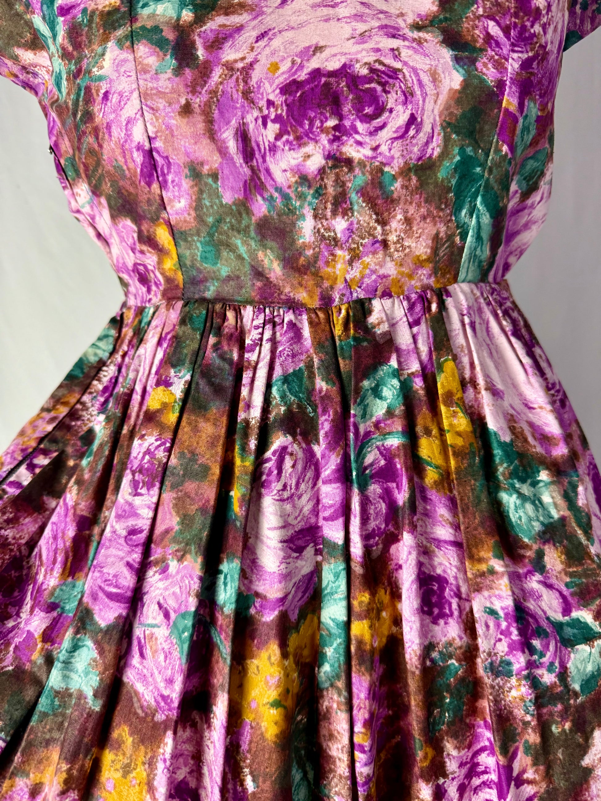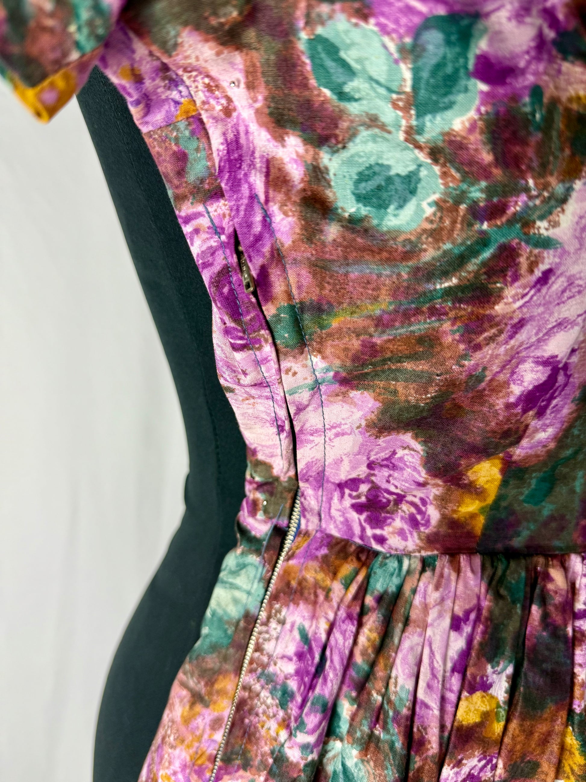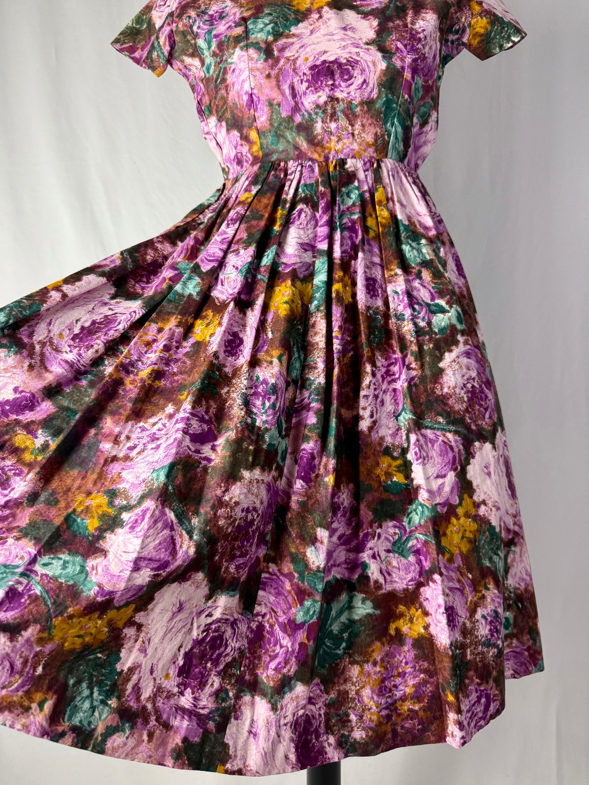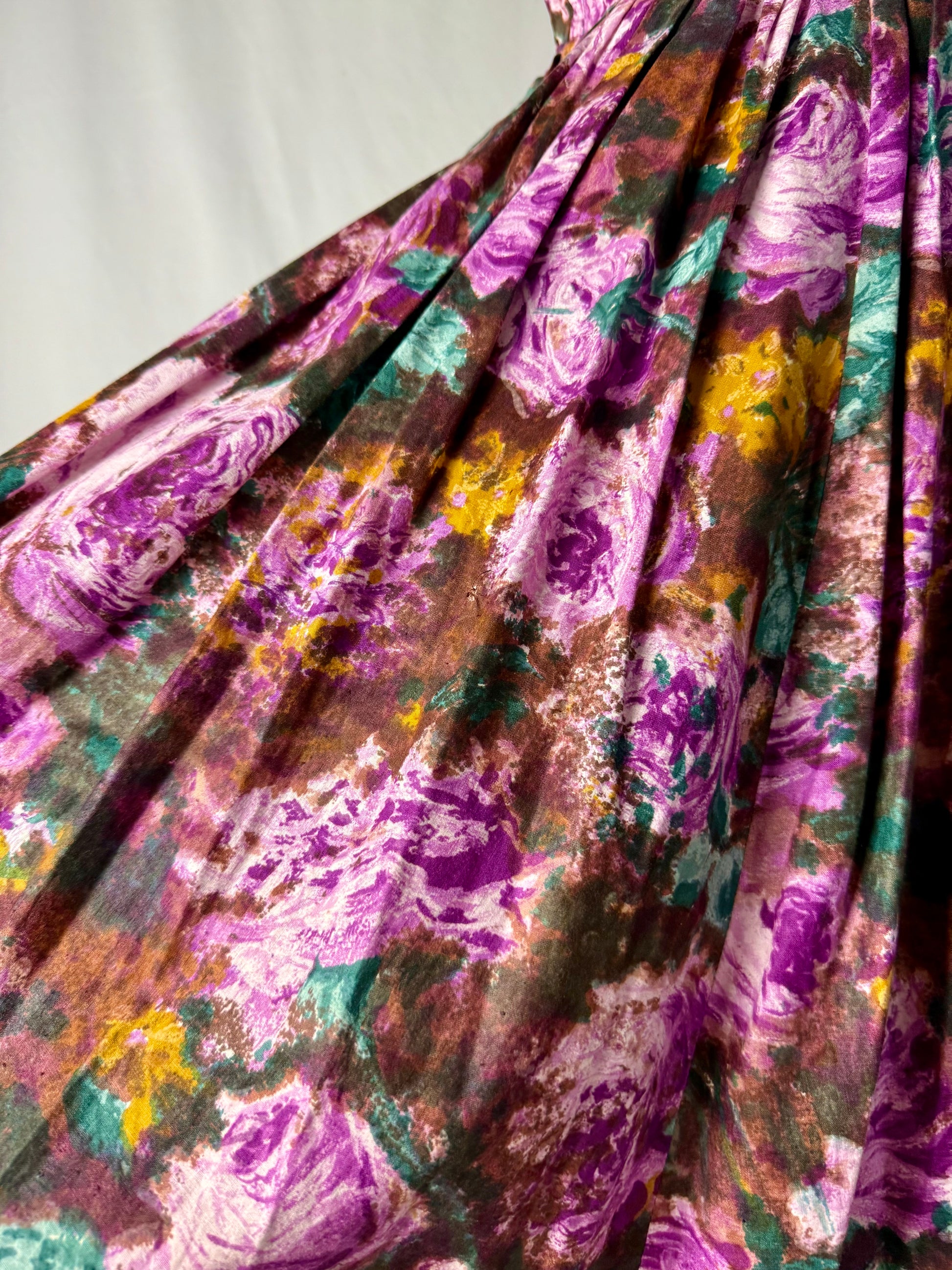 Abito anni ‘50 sartoriale, modello a corolla con corpino aderente e ampia gonna a pieghe profonde, realizzato in cotone sostenuto con stampa floreale effetto pittorico nei toni del viola, verde muschio e ocra. Scollo a barchetta e maniche ad aletta che valorizzano la linea delle spalle. Vita ben segnata con cuciture interne e chiusura posteriore a zip. La gonna è voluminosa perchè al di sotto c’è il sottogonna, tipico dell’eleganza femminile degli anni Cinquanta. Esecuzione sartoriale precisa, con orlo a mano.
