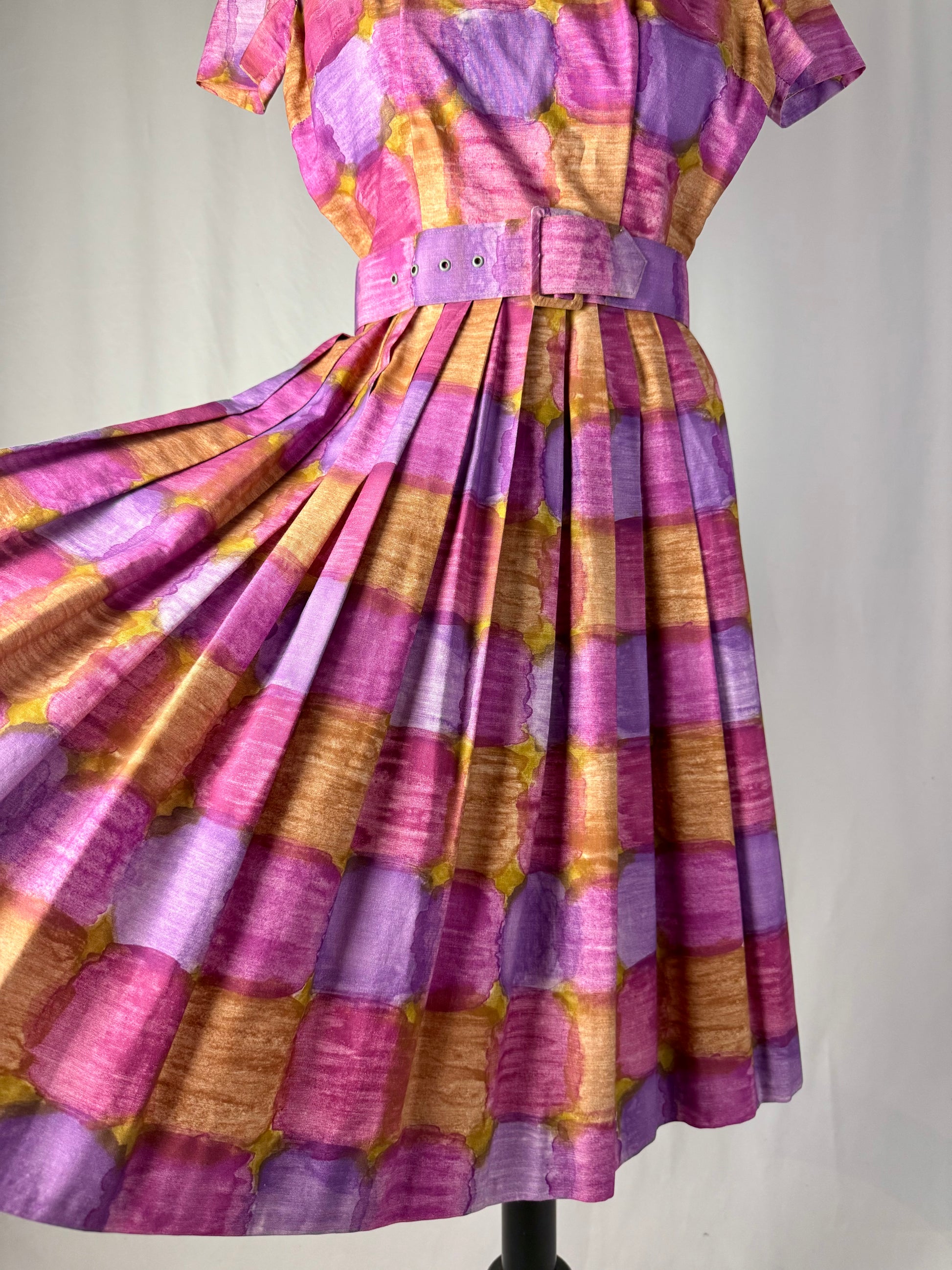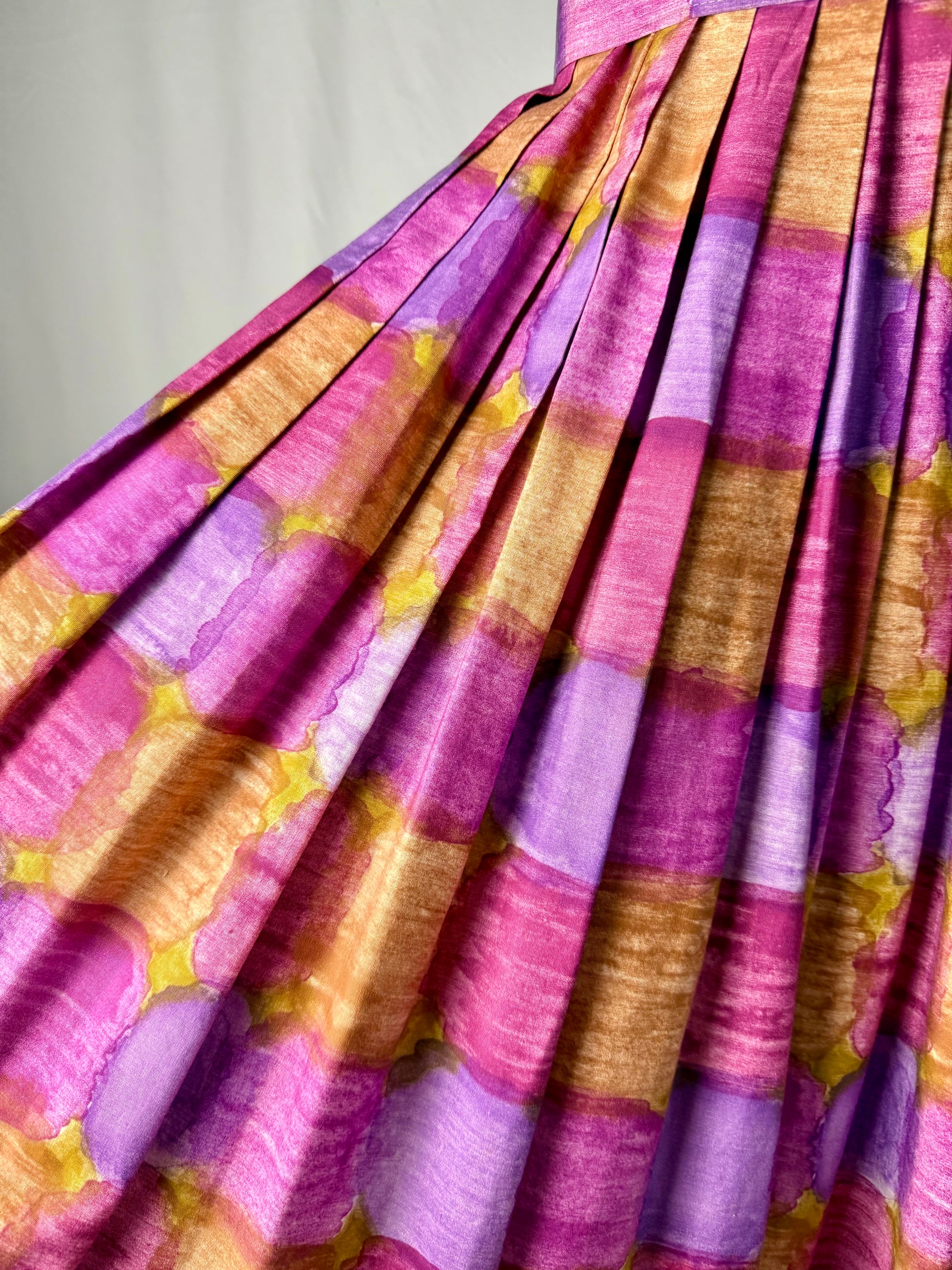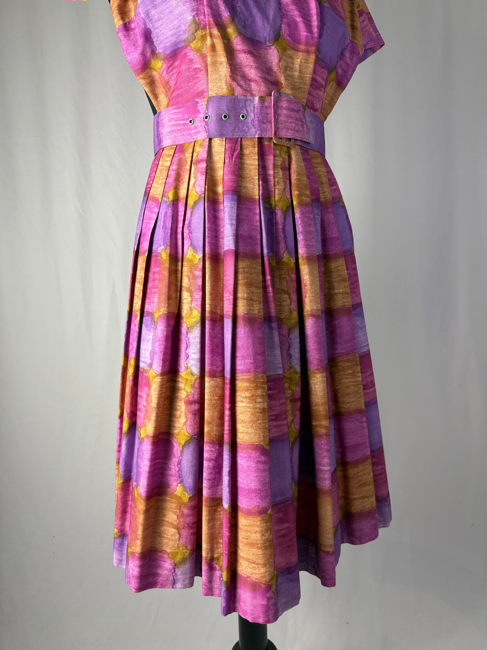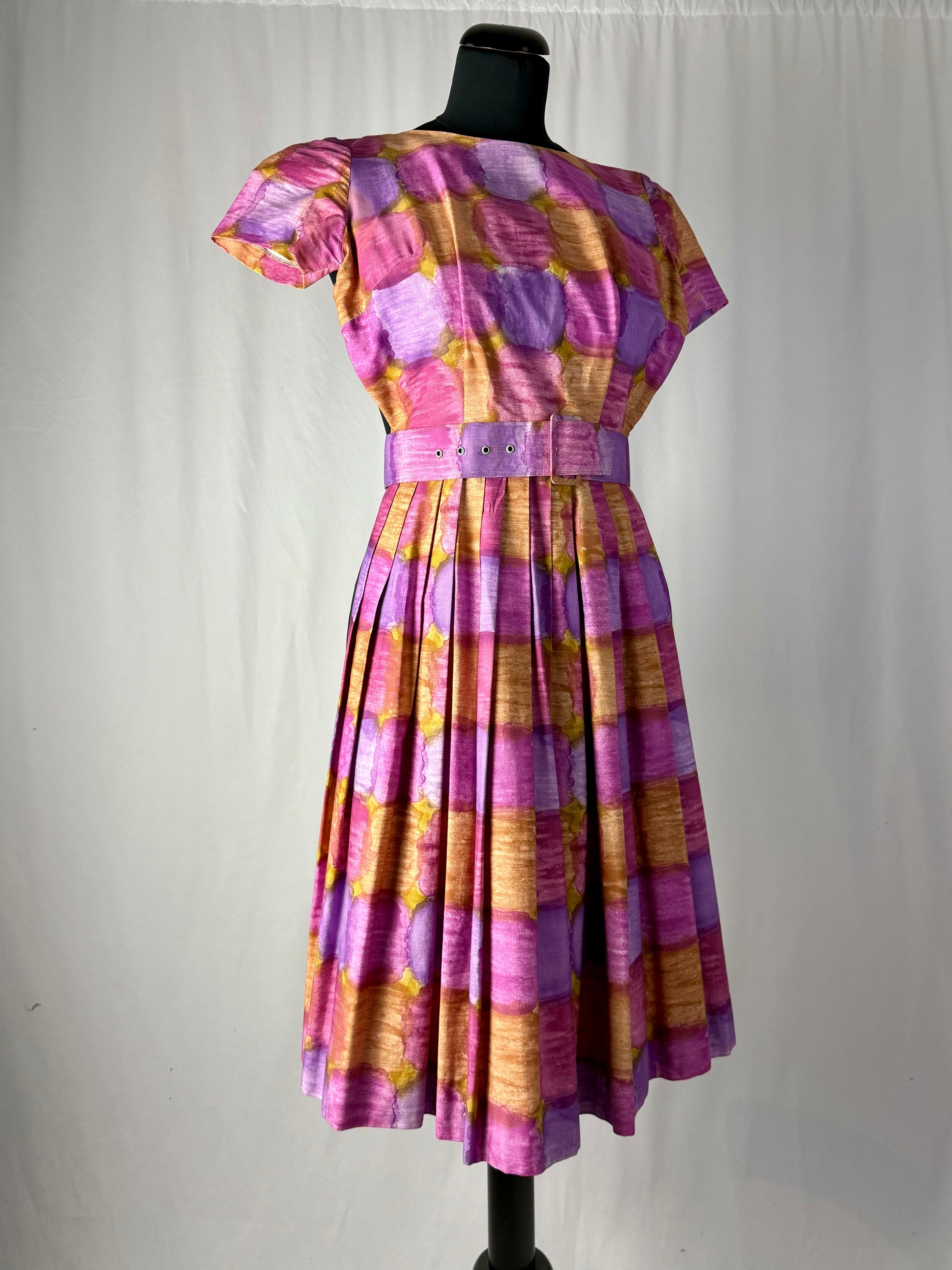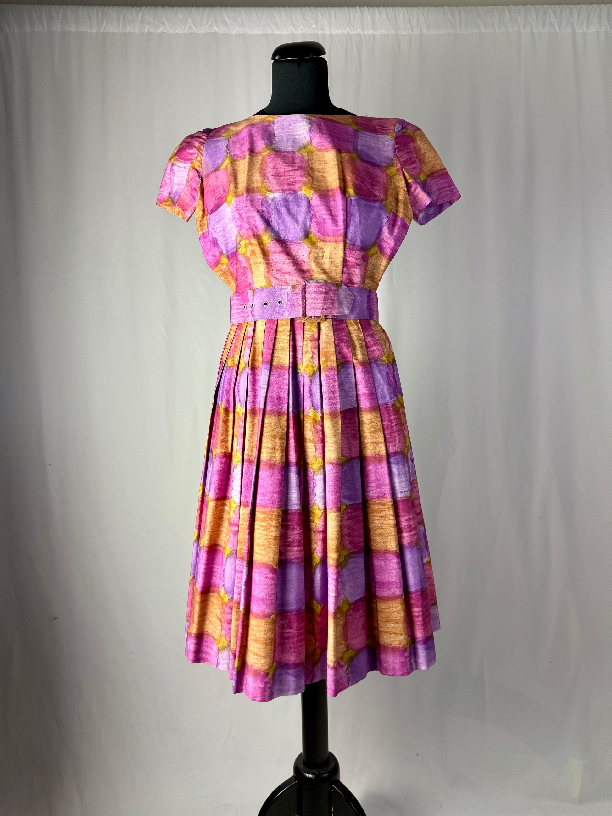 Abito anni ‘50 con corpino aderente, girocollo e maniche corte, confezionato in cotone satinato stampato con motivo a pennellate acquerellate nei toni del lilla, del rosa e dell’ocra. La vita stretta è sottolineata da una cintura coordinata con fibbia rivestita, mentre la gonna a pieghe è costruita in modo regolare e conferisce ampiezza e struttura al capo. La stampa geometrico-pittorica e la silhouette pulita esprimono lo spirito giovanile e spensierato della moda anni ‘50.