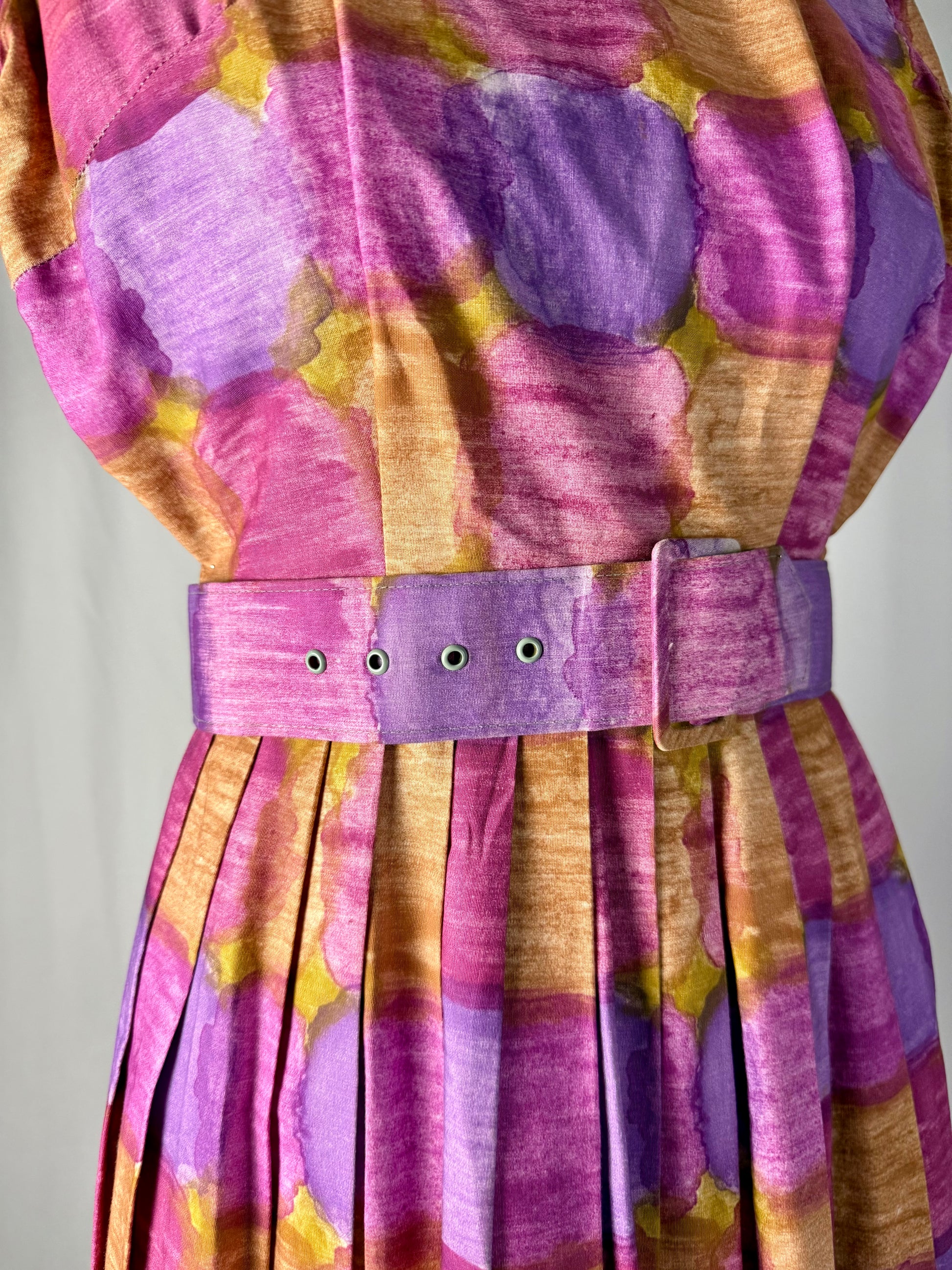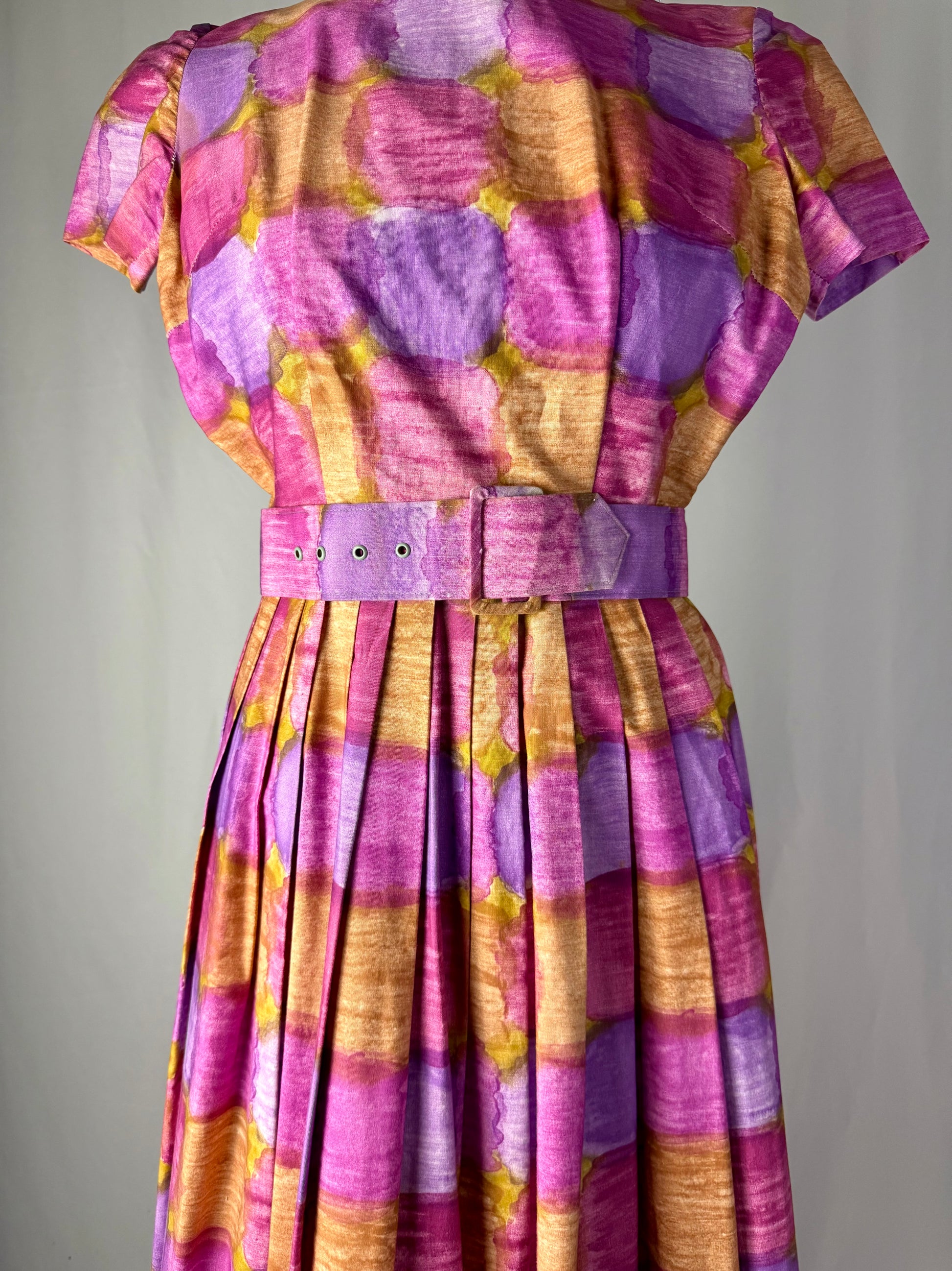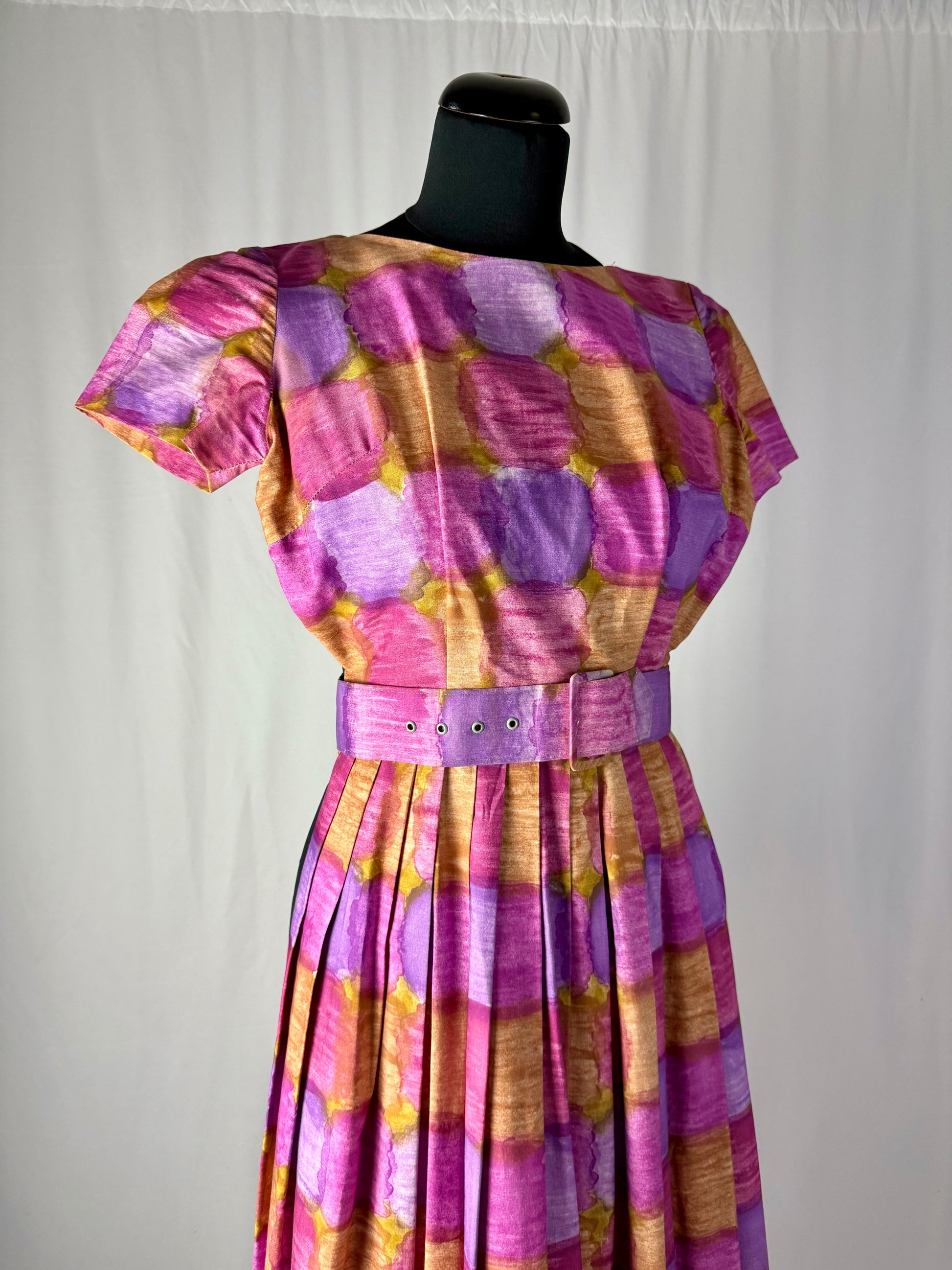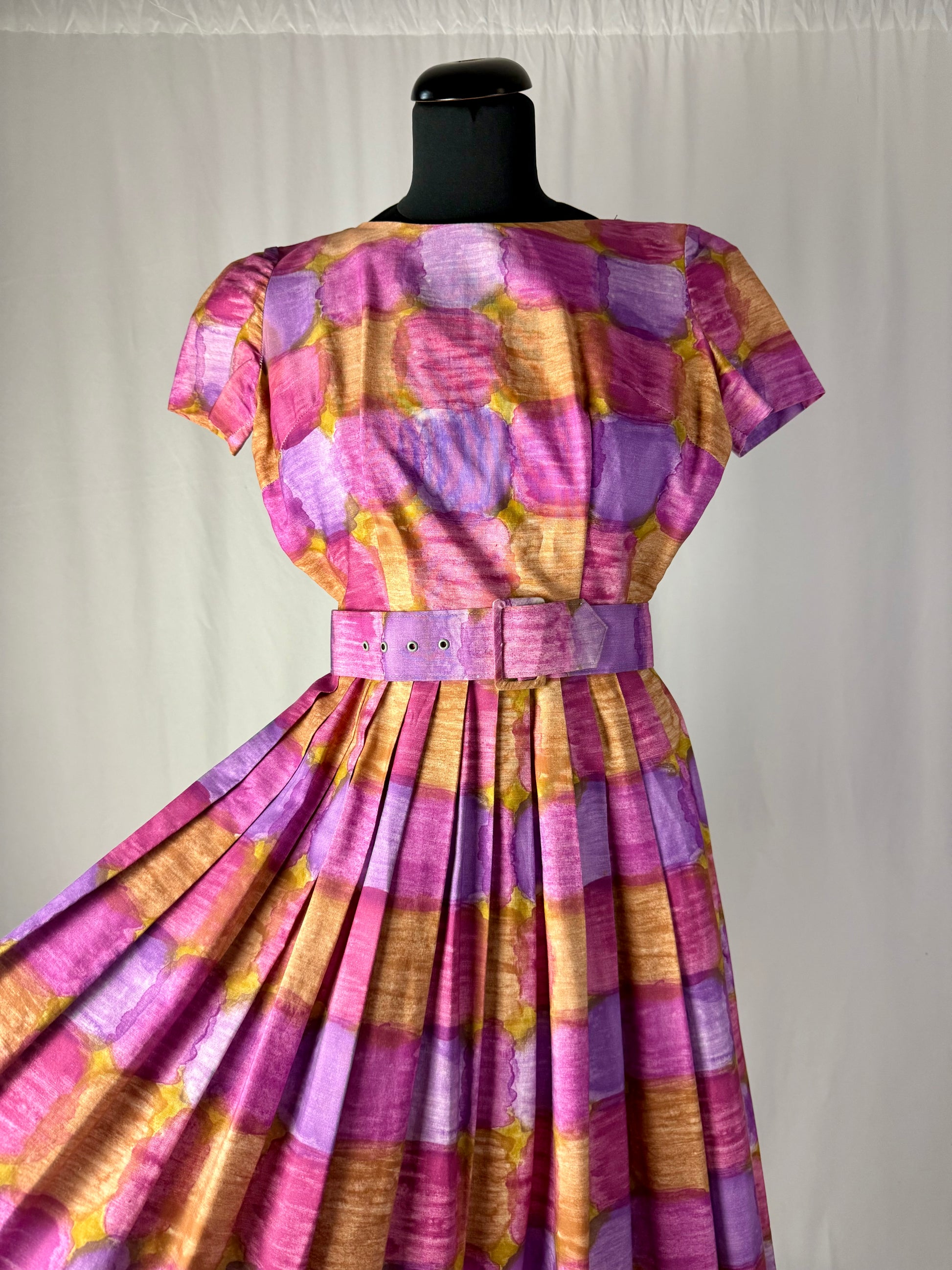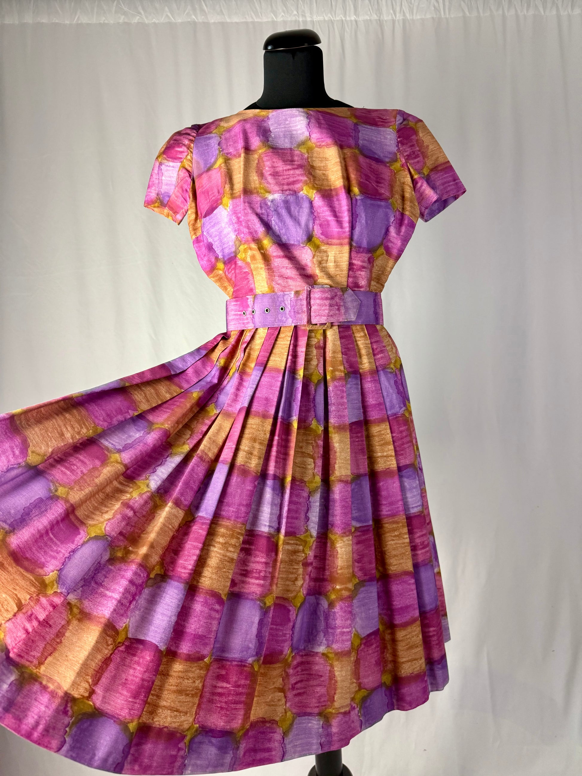 Abito anni ‘50 con corpino aderente, girocollo e maniche corte, confezionato in cotone satinato stampato con motivo a pennellate acquerellate nei toni del lilla, del rosa e dell’ocra. La vita stretta è sottolineata da una cintura coordinata con fibbia rivestita, mentre la gonna a pieghe è costruita in modo regolare e conferisce ampiezza e struttura al capo. La stampa geometrico-pittorica e la silhouette pulita esprimono lo spirito giovanile e spensierato della moda anni ‘50.