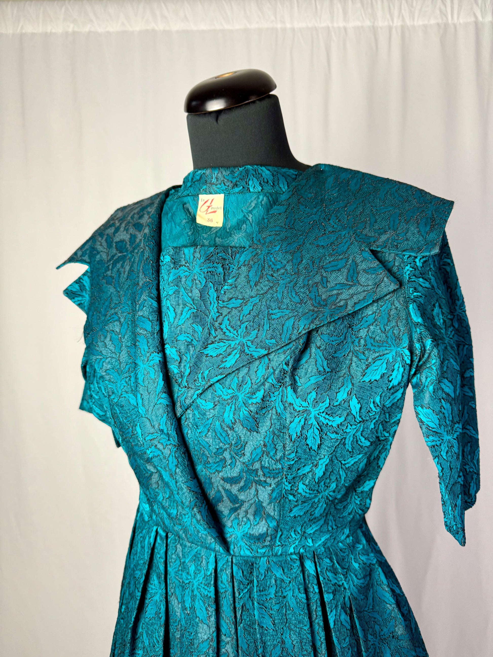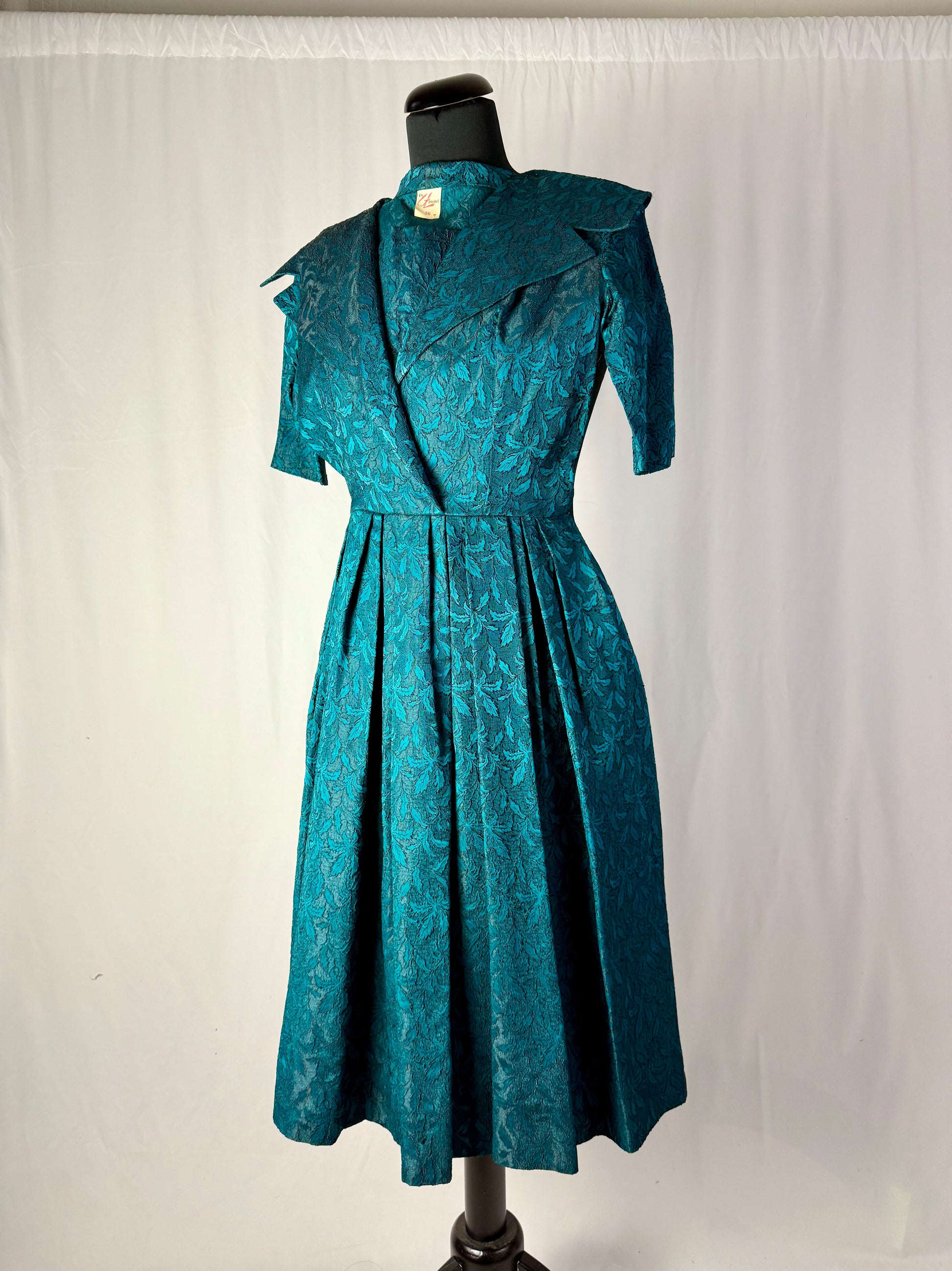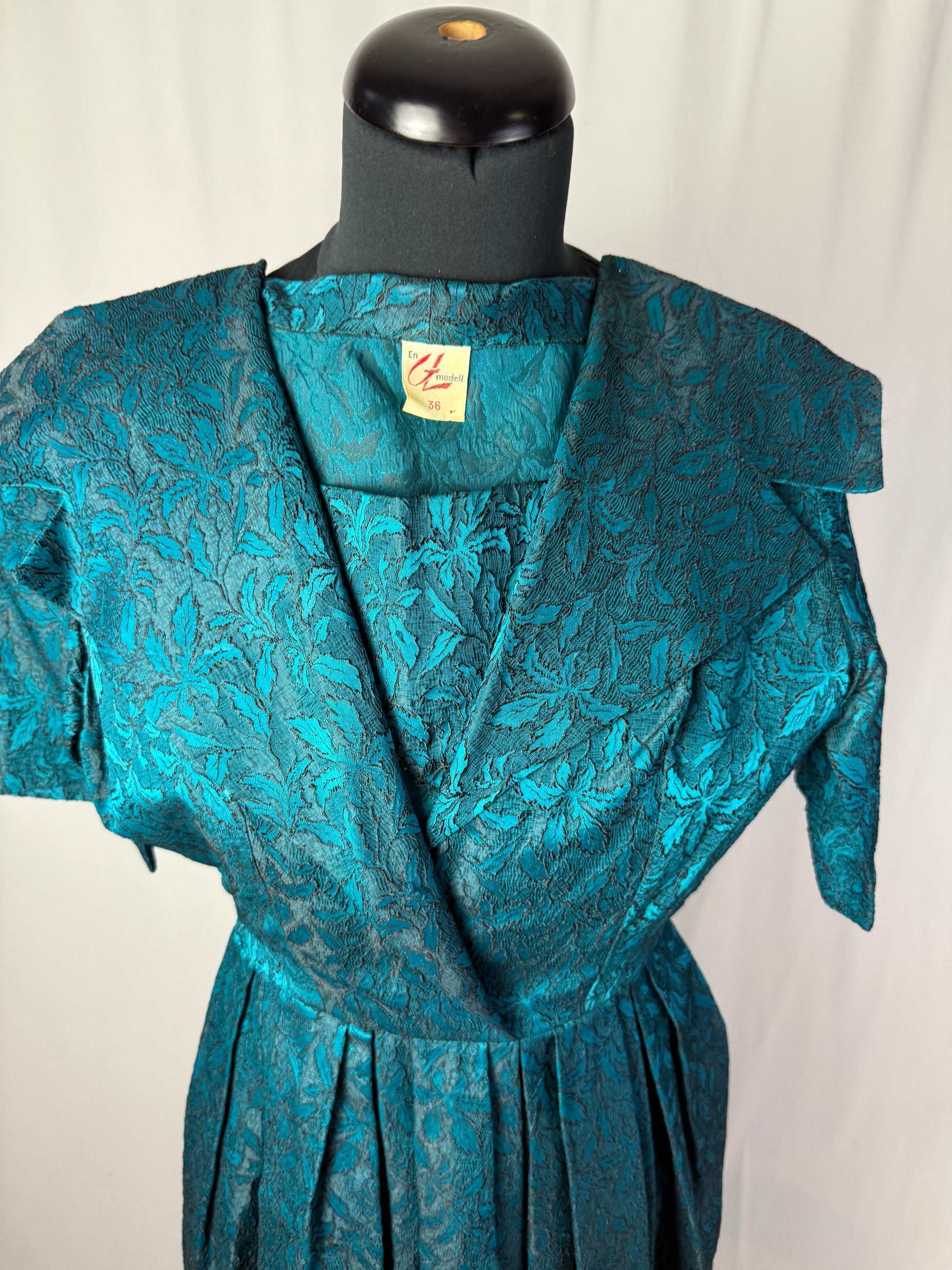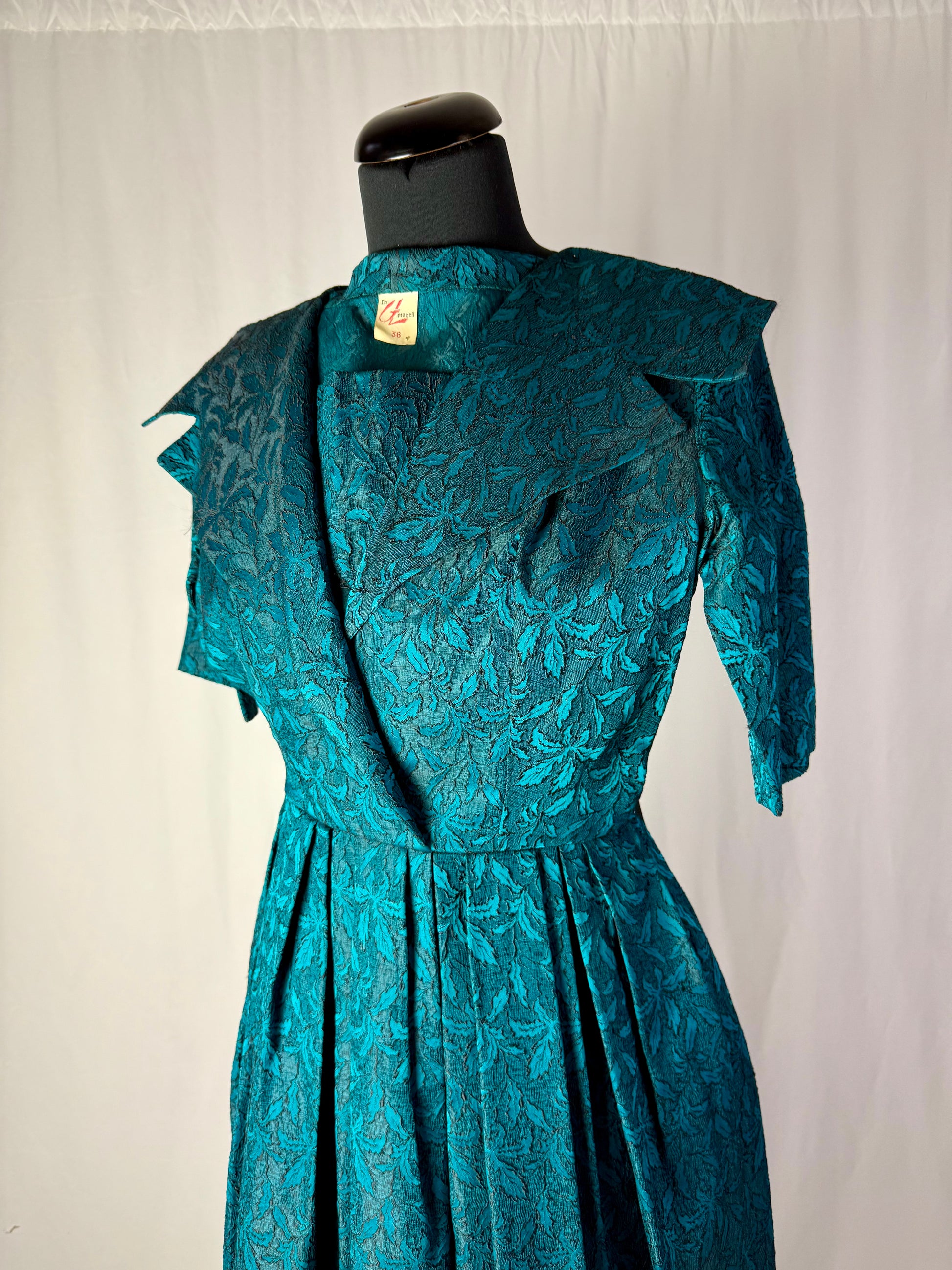 Abito anni ‘50 con corpino incrociato e ampio colletto a punta, confezionato in broccato di seta color verde smeraldo con motivo jacquard a foglie stilizzate tono su tono. Le maniche corte e la vita ben segnata valorizzano la figura, mentre la gonna ampia a pieghe profonde dona movimento e volume. L’interno presenta cuciture rifinite a mano e chiusura laterale con zip. L’uso del tessuto operato e la struttura del colletto evidenziano una manifattura sartoriale di alta qualità, tipica degli anni Cinquanta.