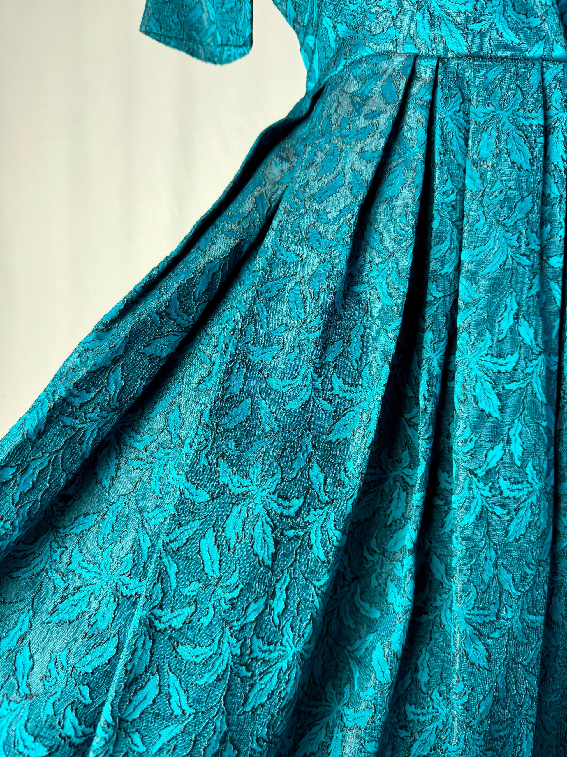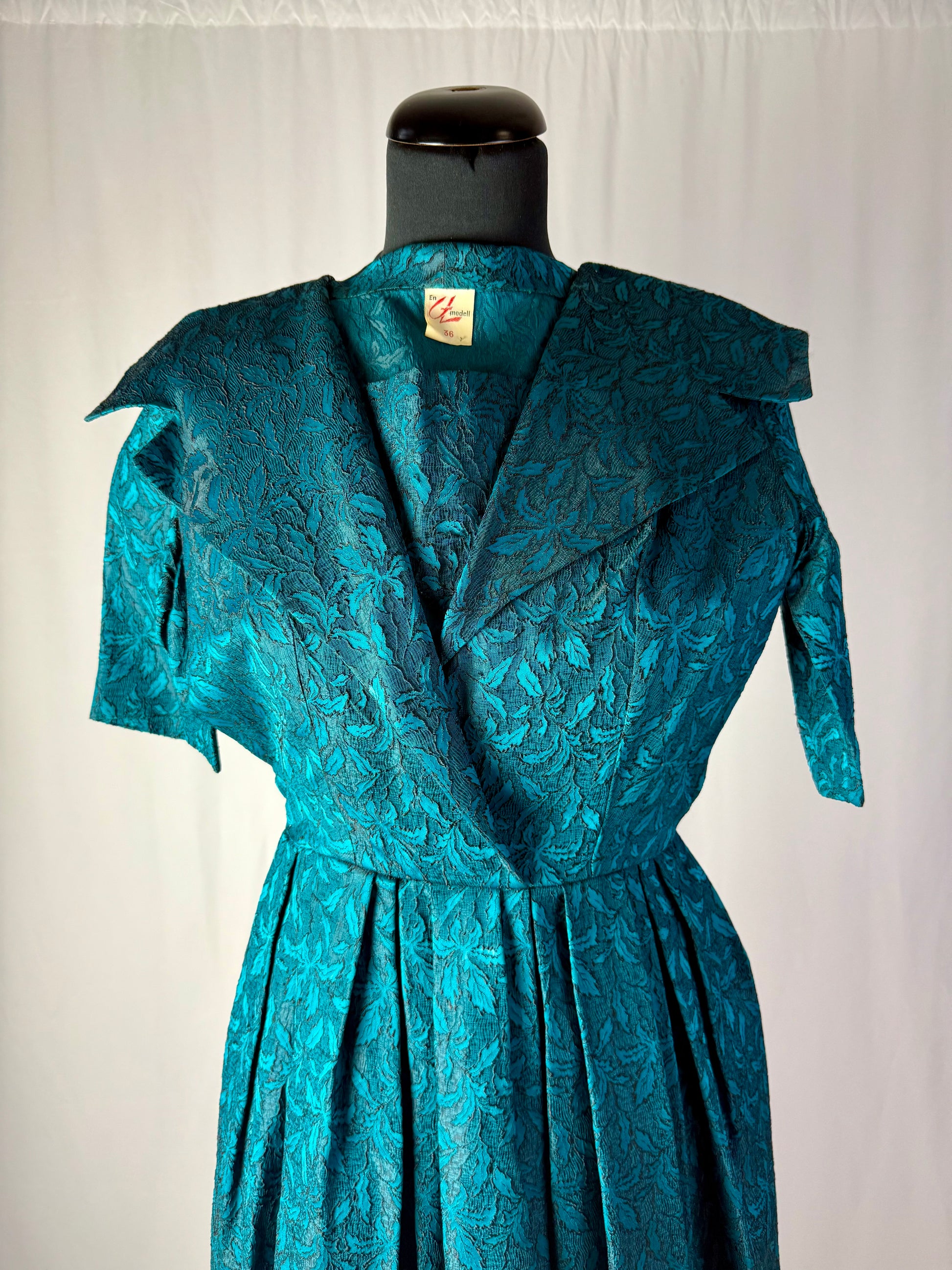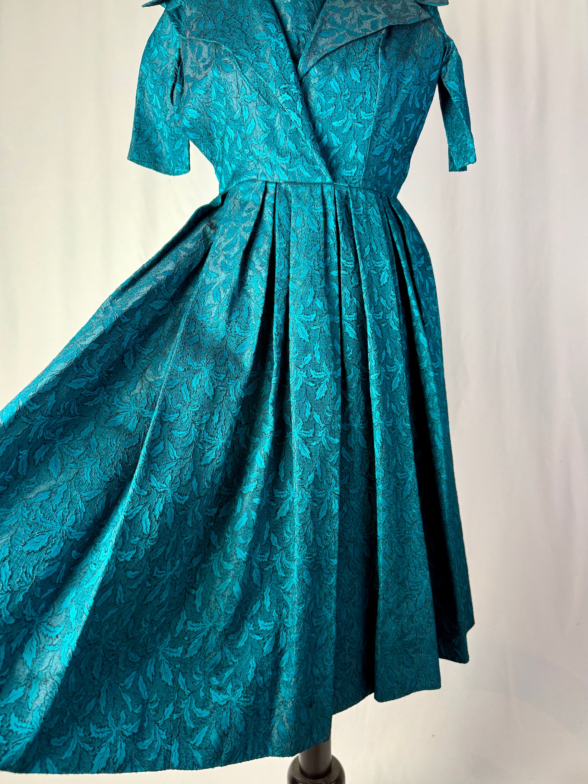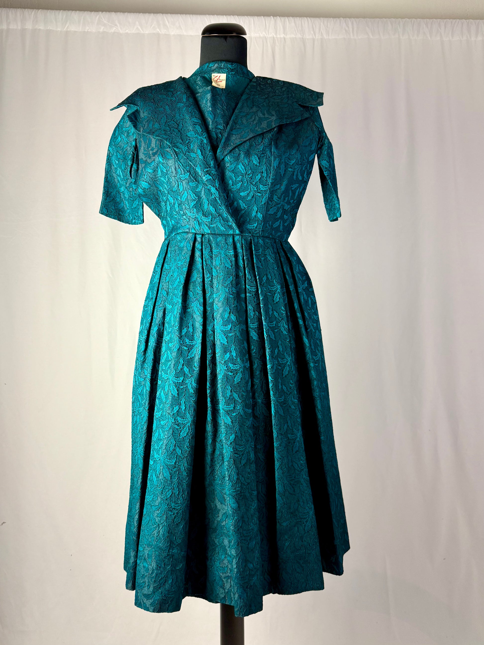 Abito anni ‘50 con corpino incrociato e ampio colletto a punta, confezionato in broccato di seta color verde smeraldo con motivo jacquard a foglie stilizzate tono su tono. Le maniche corte e la vita ben segnata valorizzano la figura, mentre la gonna ampia a pieghe profonde dona movimento e volume. L’interno presenta cuciture rifinite a mano e chiusura laterale con zip. L’uso del tessuto operato e la struttura del colletto evidenziano una manifattura sartoriale di alta qualità, tipica degli anni Cinquanta.