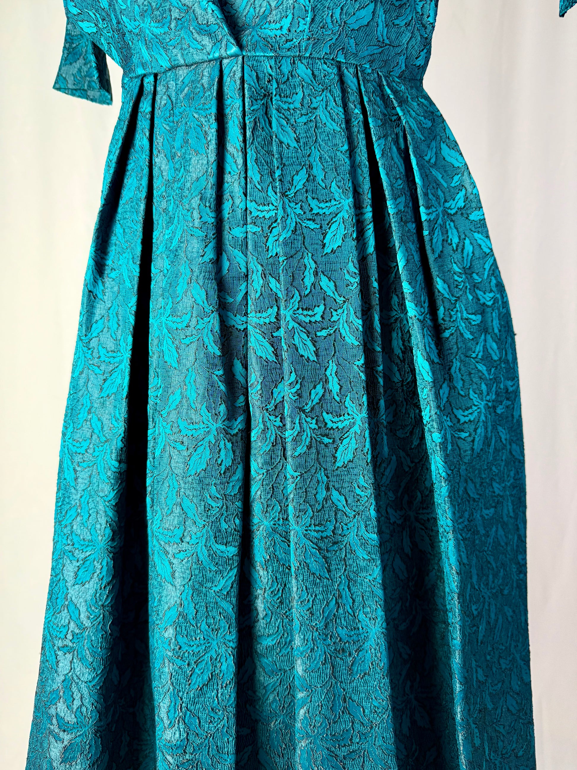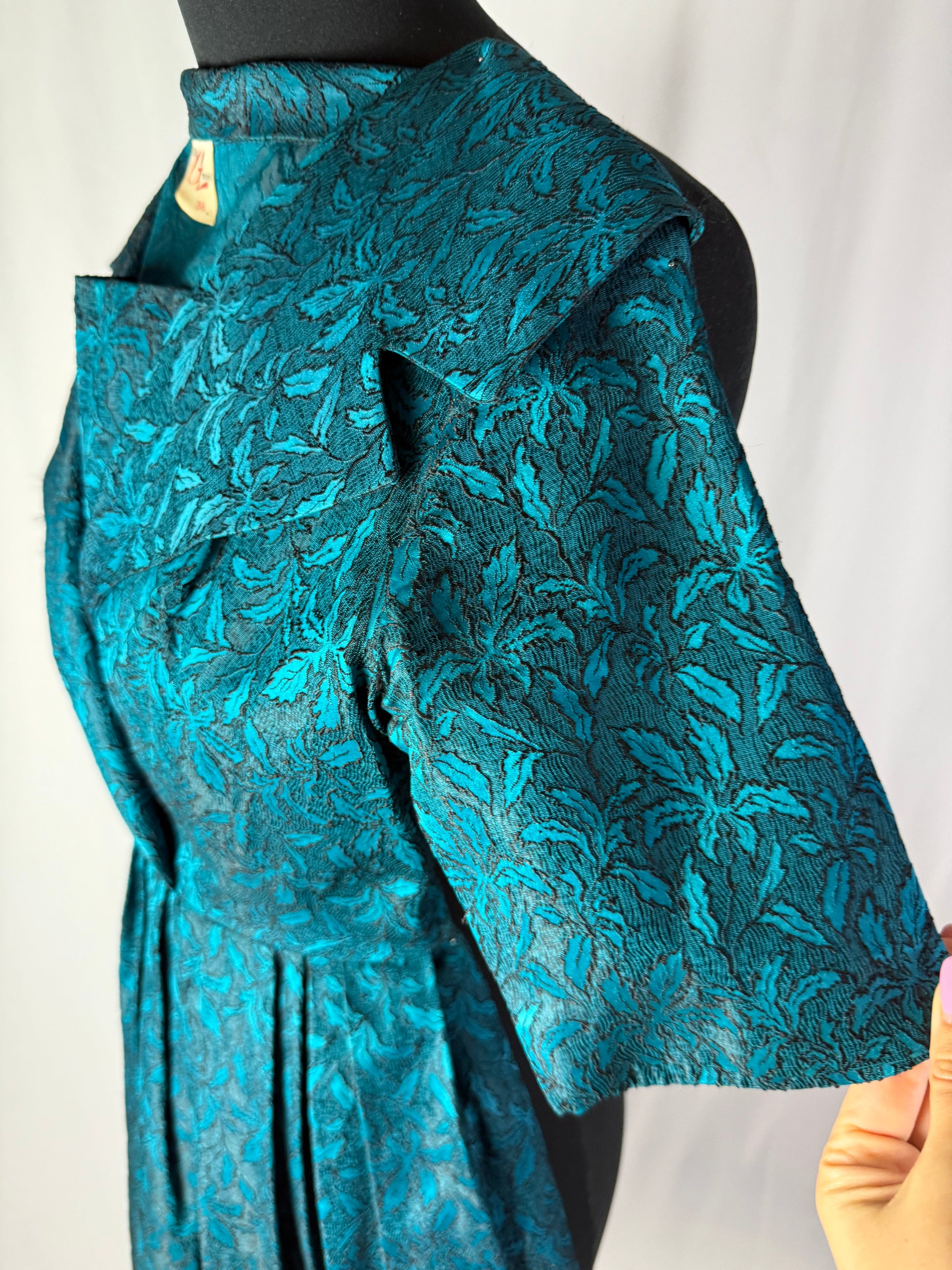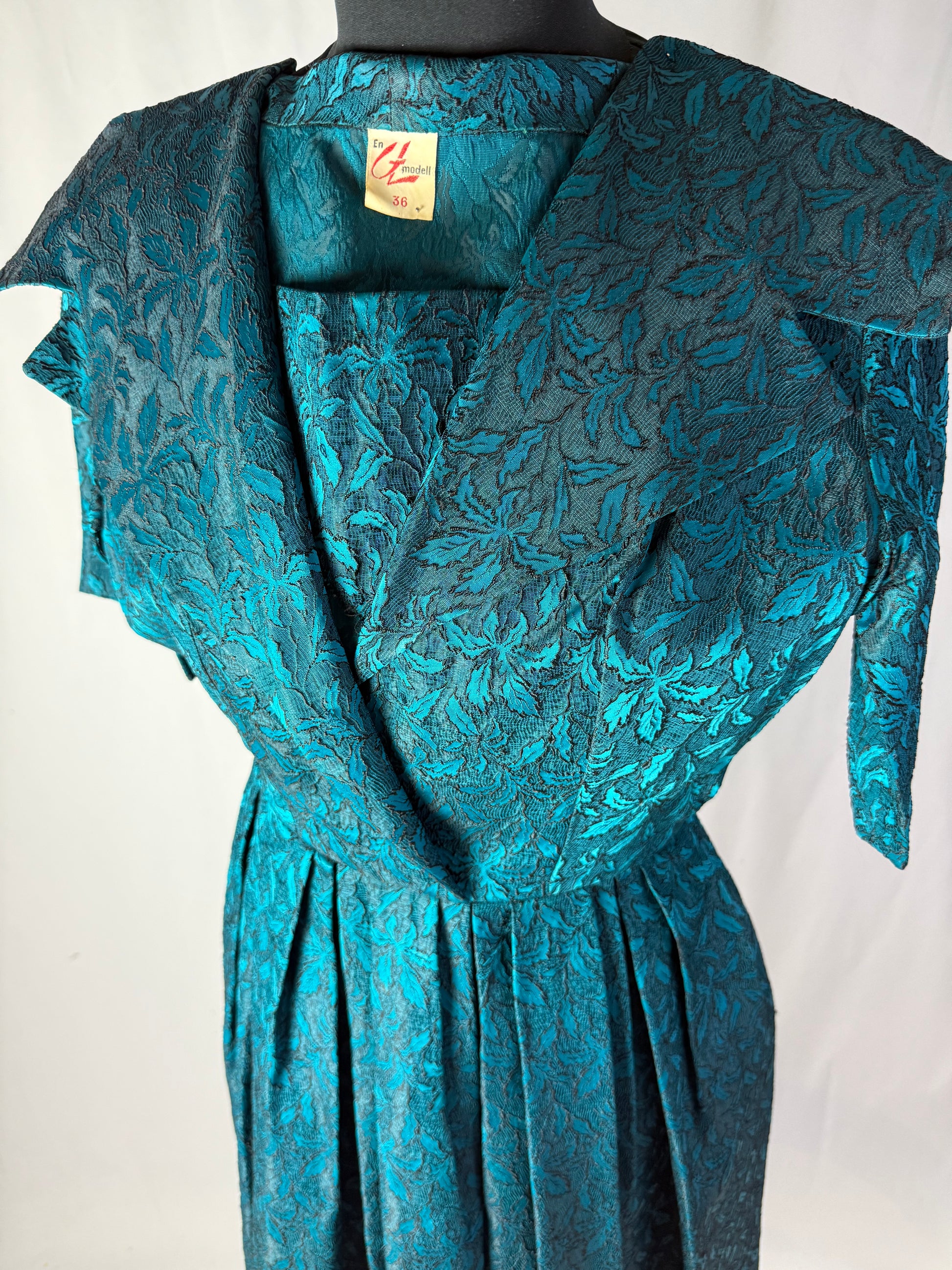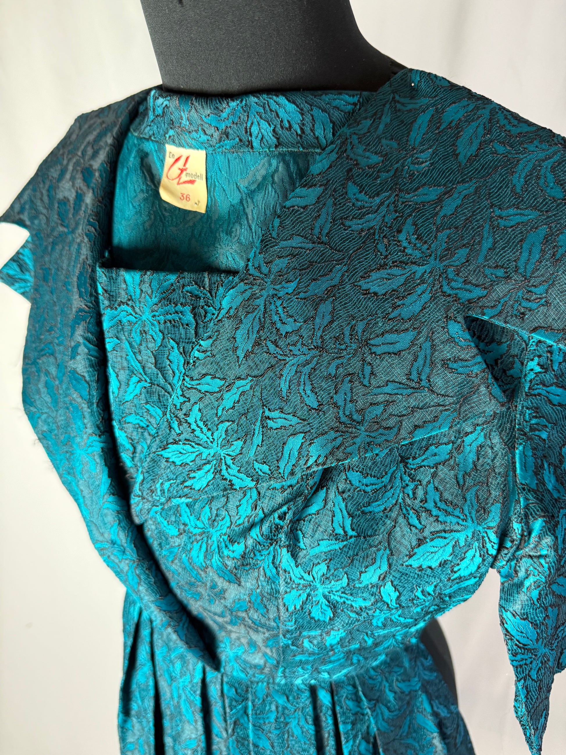 Abito anni ‘50 con corpino incrociato e ampio colletto a punta, confezionato in broccato di seta color verde smeraldo con motivo jacquard a foglie stilizzate tono su tono. Le maniche corte e la vita ben segnata valorizzano la figura, mentre la gonna ampia a pieghe profonde dona movimento e volume. L’interno presenta cuciture rifinite a mano e chiusura laterale con zip. L’uso del tessuto operato e la struttura del colletto evidenziano una manifattura sartoriale di alta qualità, tipica degli anni Cinquanta.