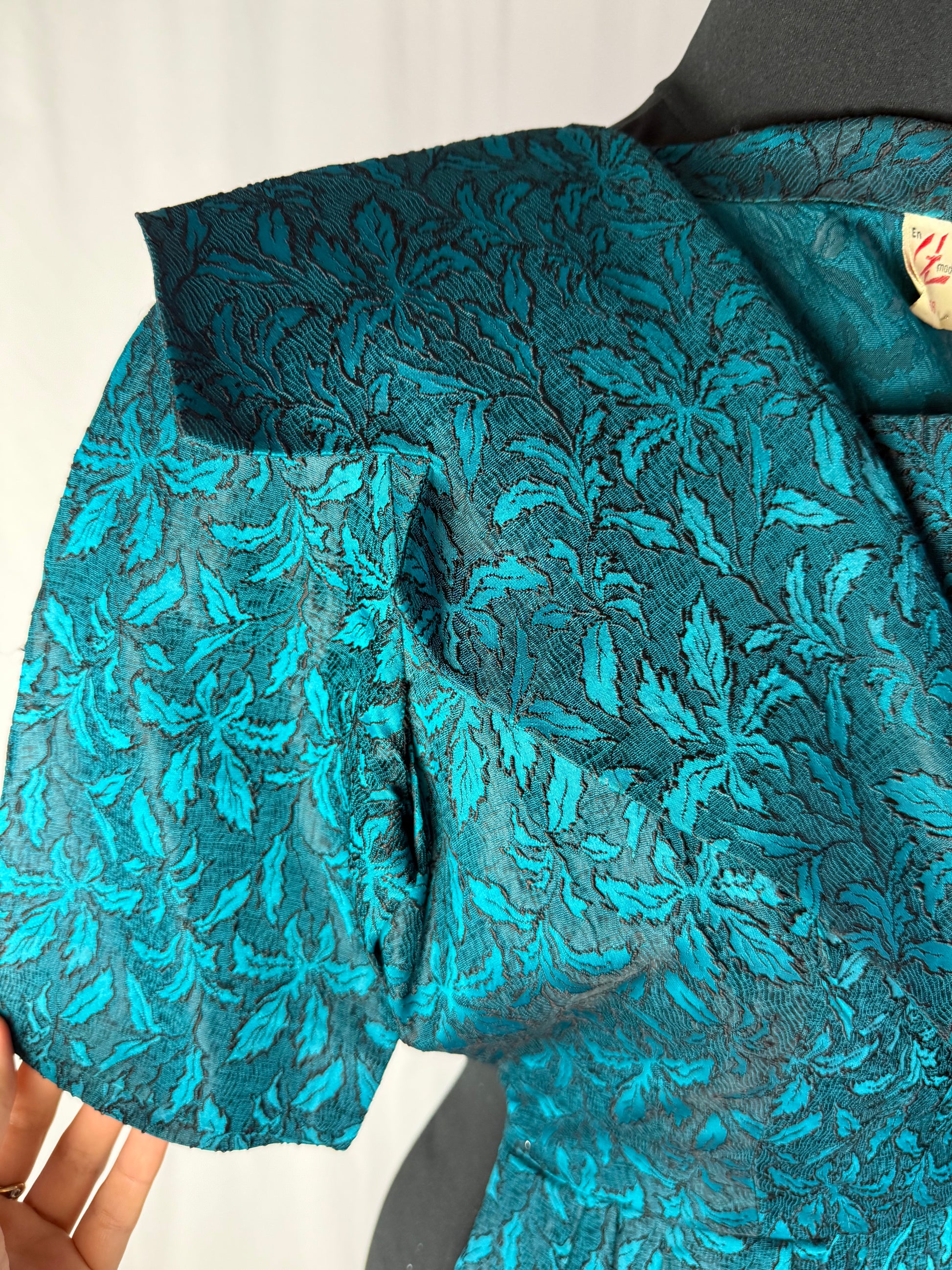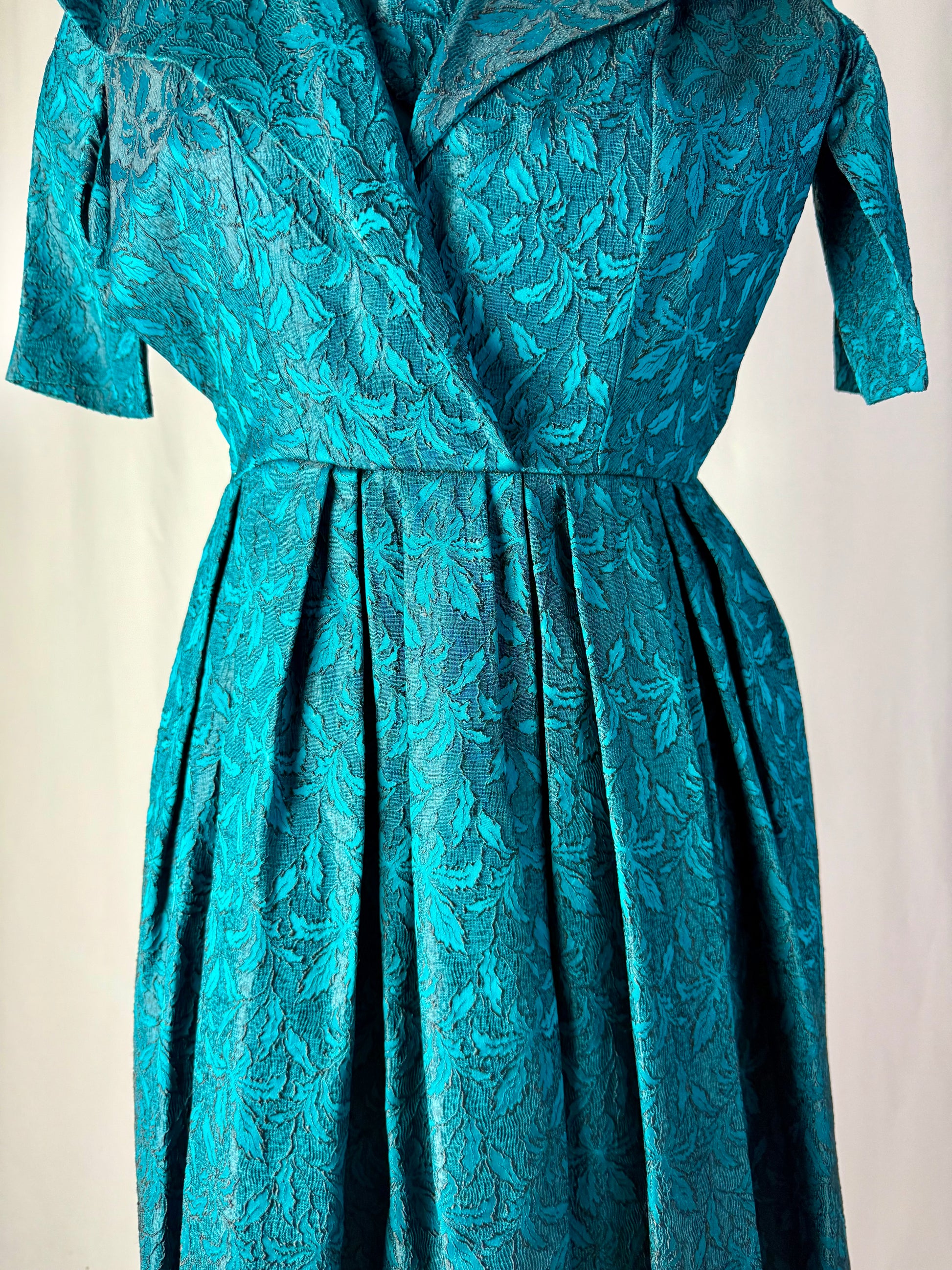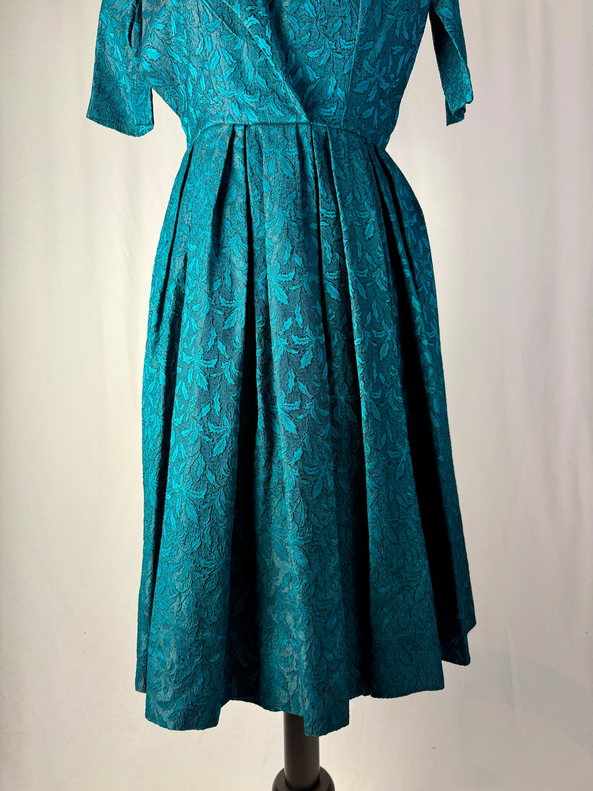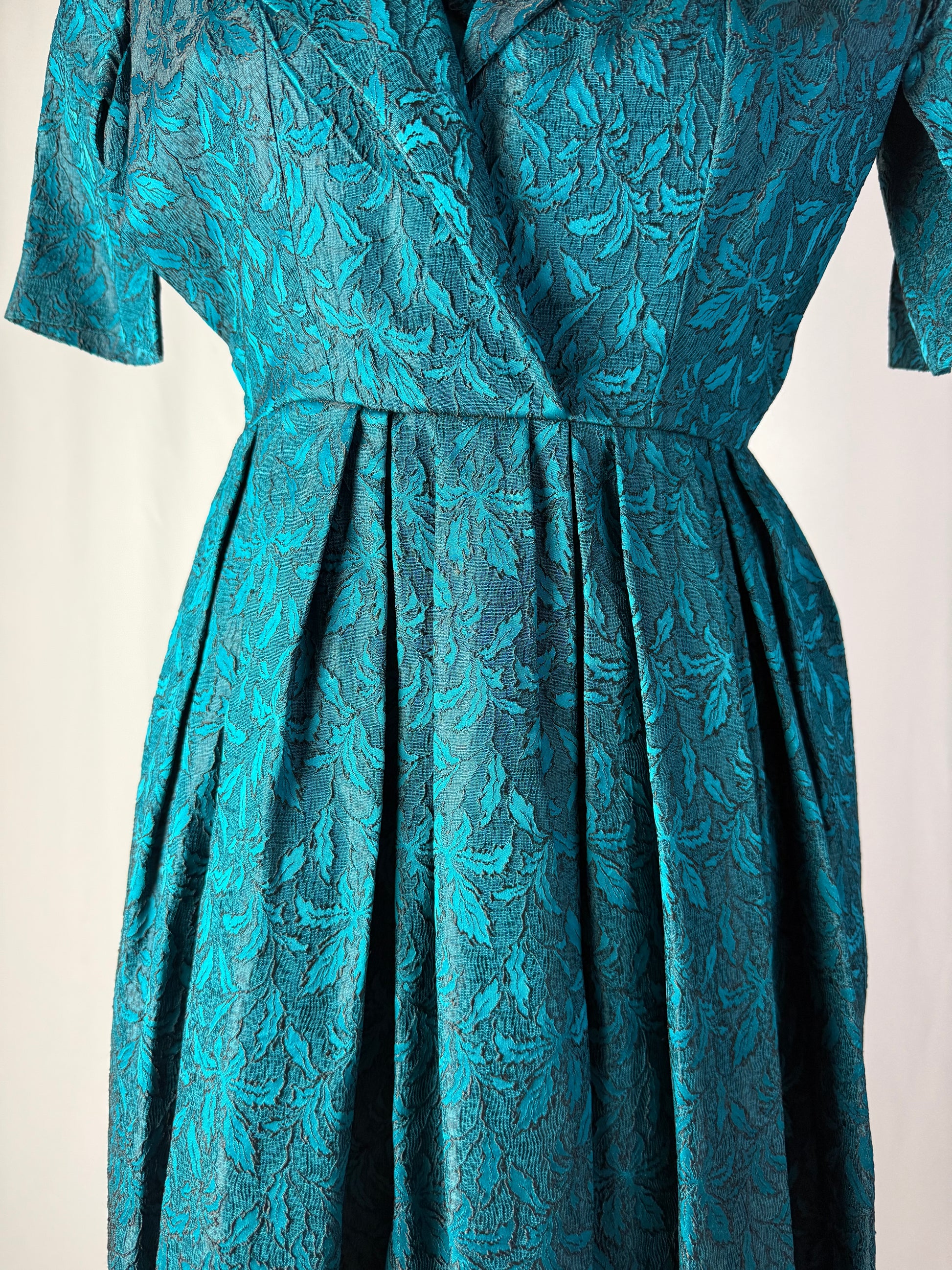 Abito anni ‘50 con corpino incrociato e ampio colletto a punta, confezionato in broccato di seta color verde smeraldo con motivo jacquard a foglie stilizzate tono su tono. Le maniche corte e la vita ben segnata valorizzano la figura, mentre la gonna ampia a pieghe profonde dona movimento e volume. L’interno presenta cuciture rifinite a mano e chiusura laterale con zip. L’uso del tessuto operato e la struttura del colletto evidenziano una manifattura sartoriale di alta qualità, tipica degli anni Cinquanta.