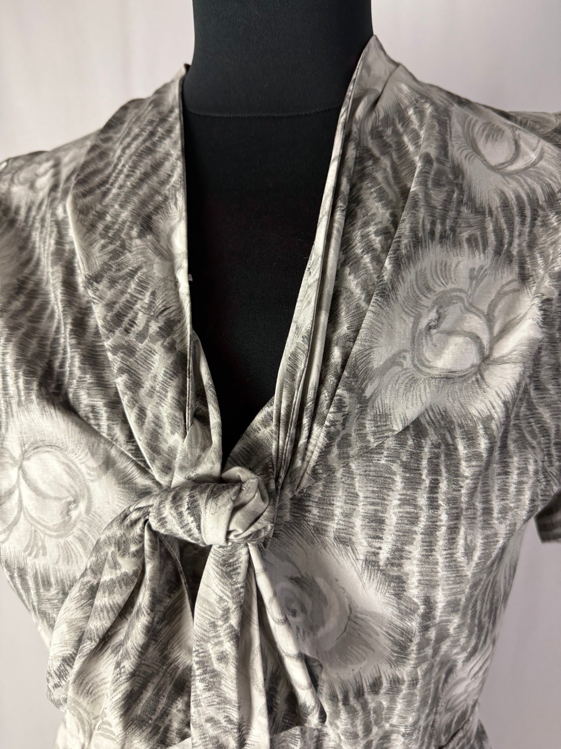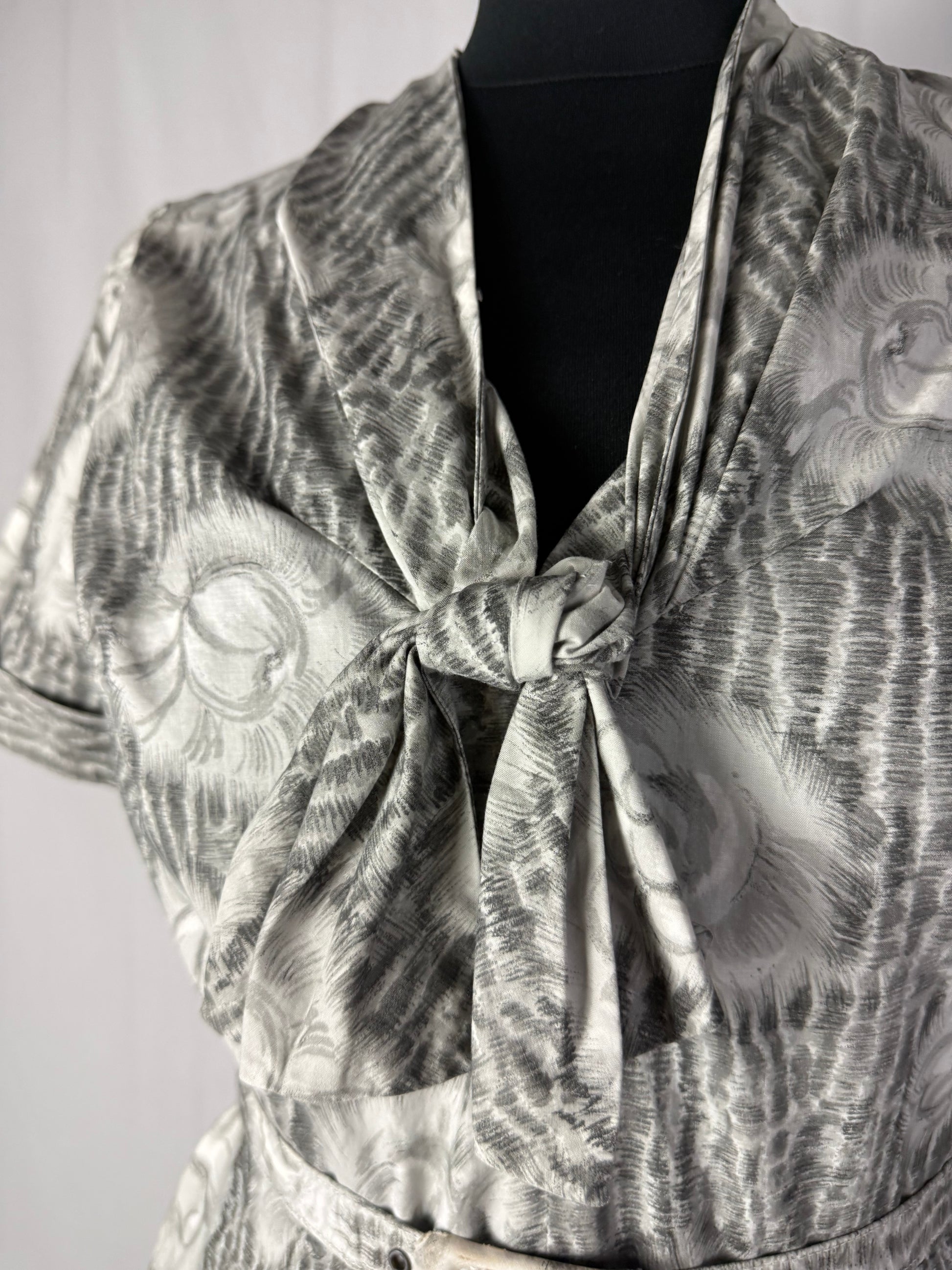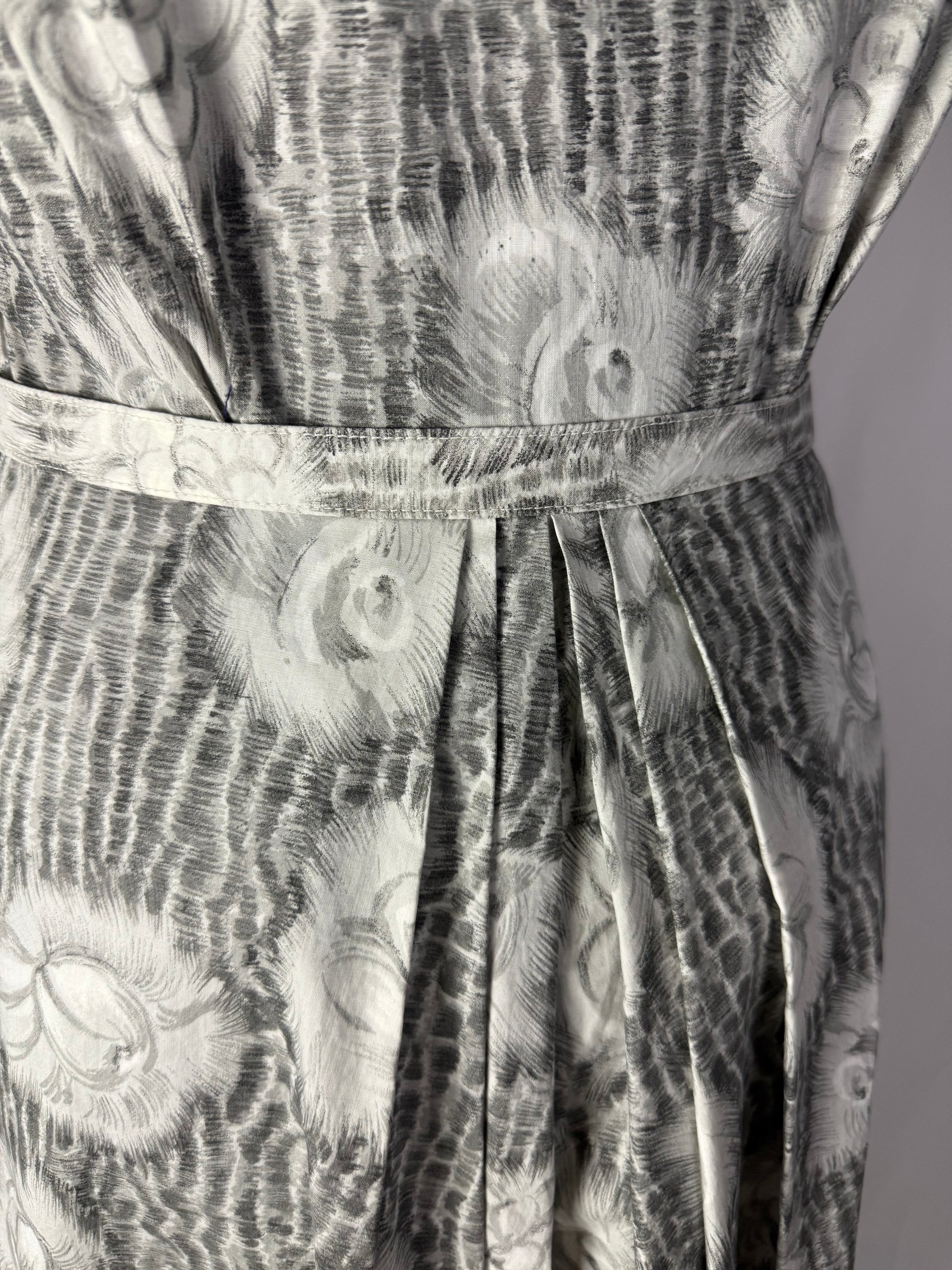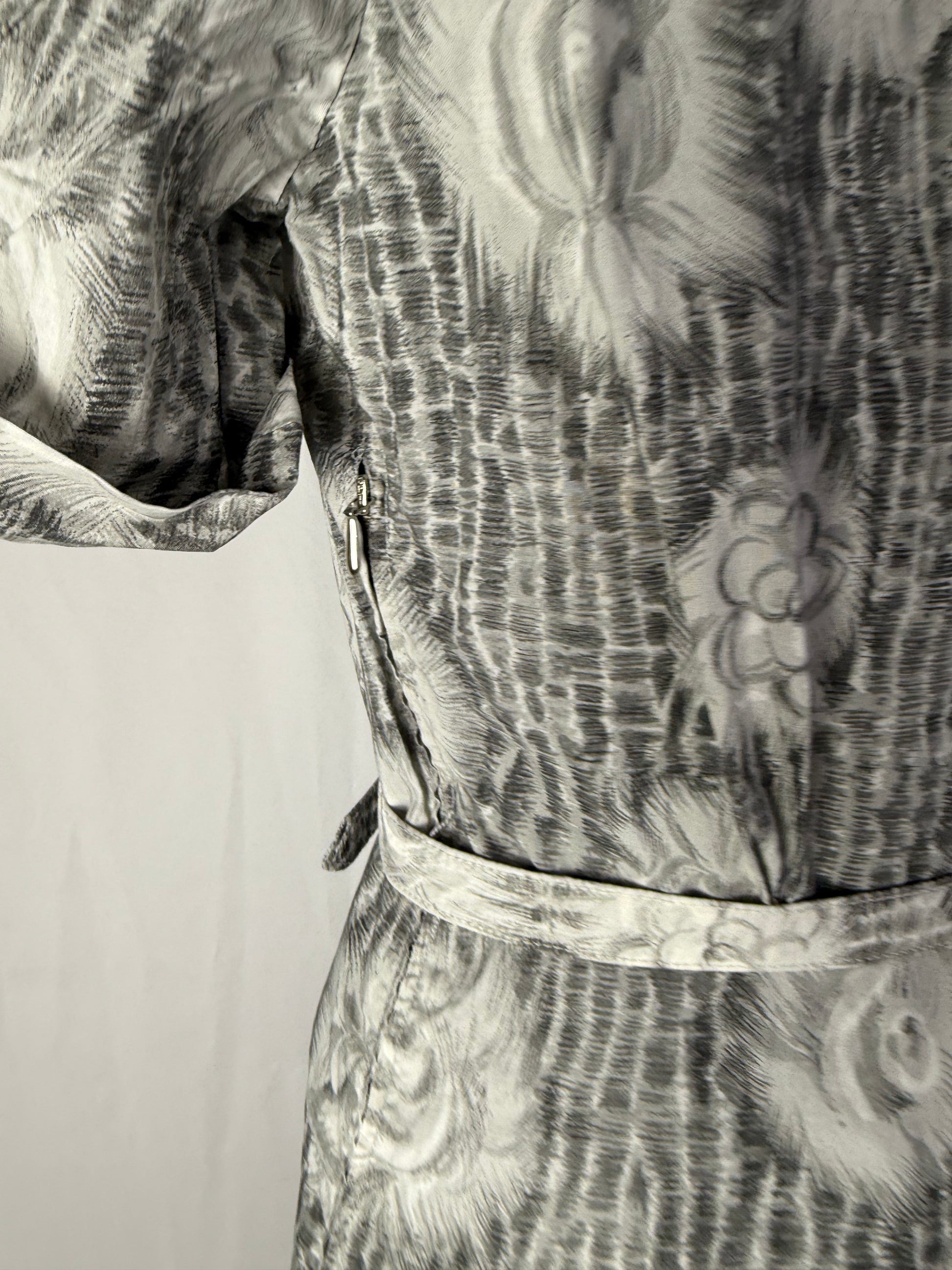 Modello con corpino aderente e gonna arricciata sul retro, realizzato in tessuto jacquard di cotone grigio perla con motivo floreale bianco a constatato. Presenta un colletto ad anello con fiocco centrale e maniche corte con risvolto. La vita è sottolineata da una cintura coordinata e la gonna presenta ampie pieghe laterali che donano volume e movimento. Chiusura laterale a zip.