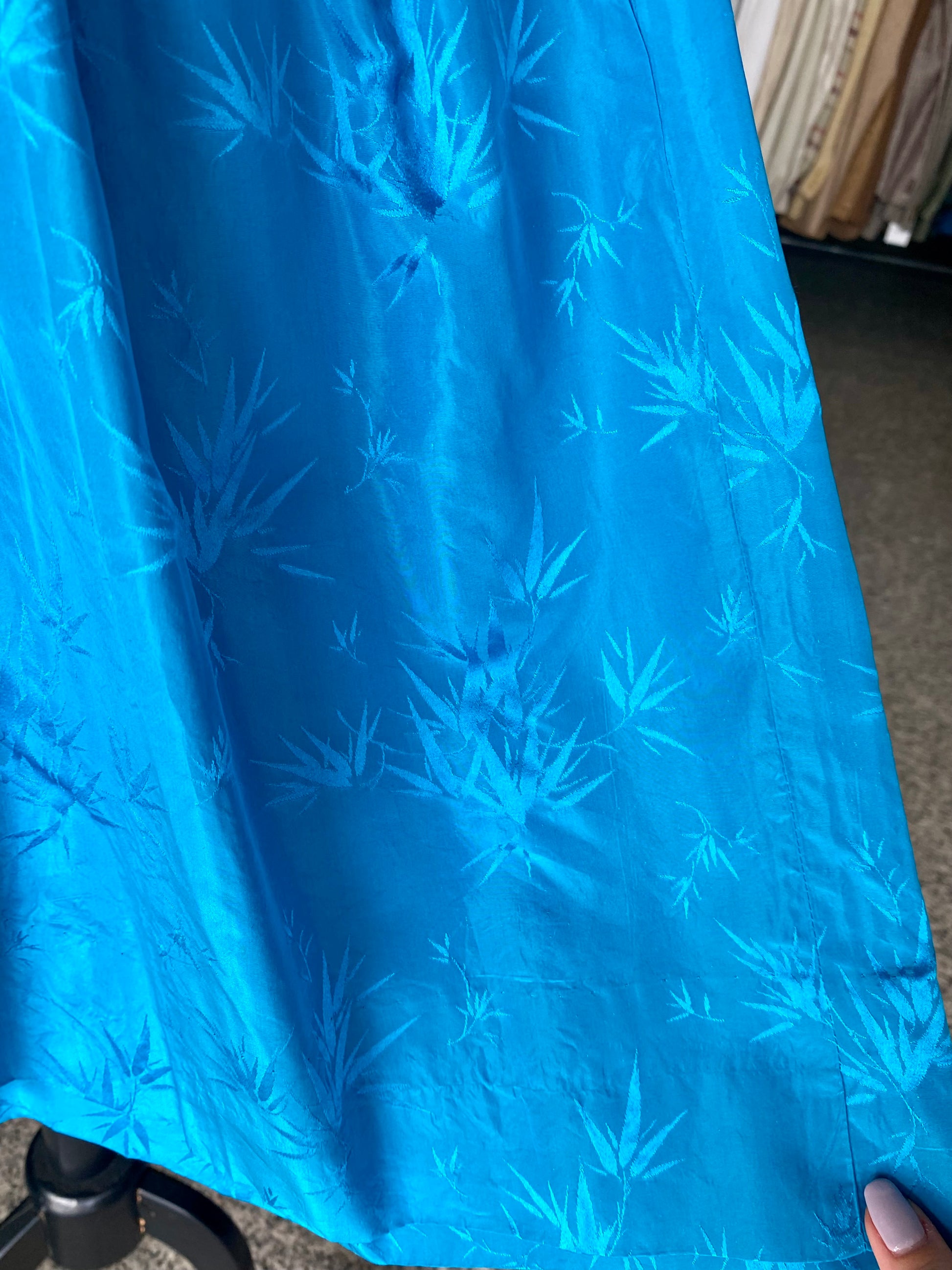 Colore turchese intenso, con una raffinata fantasia botanica tono su tono, che illumina il tessuto ad ogni movimento.