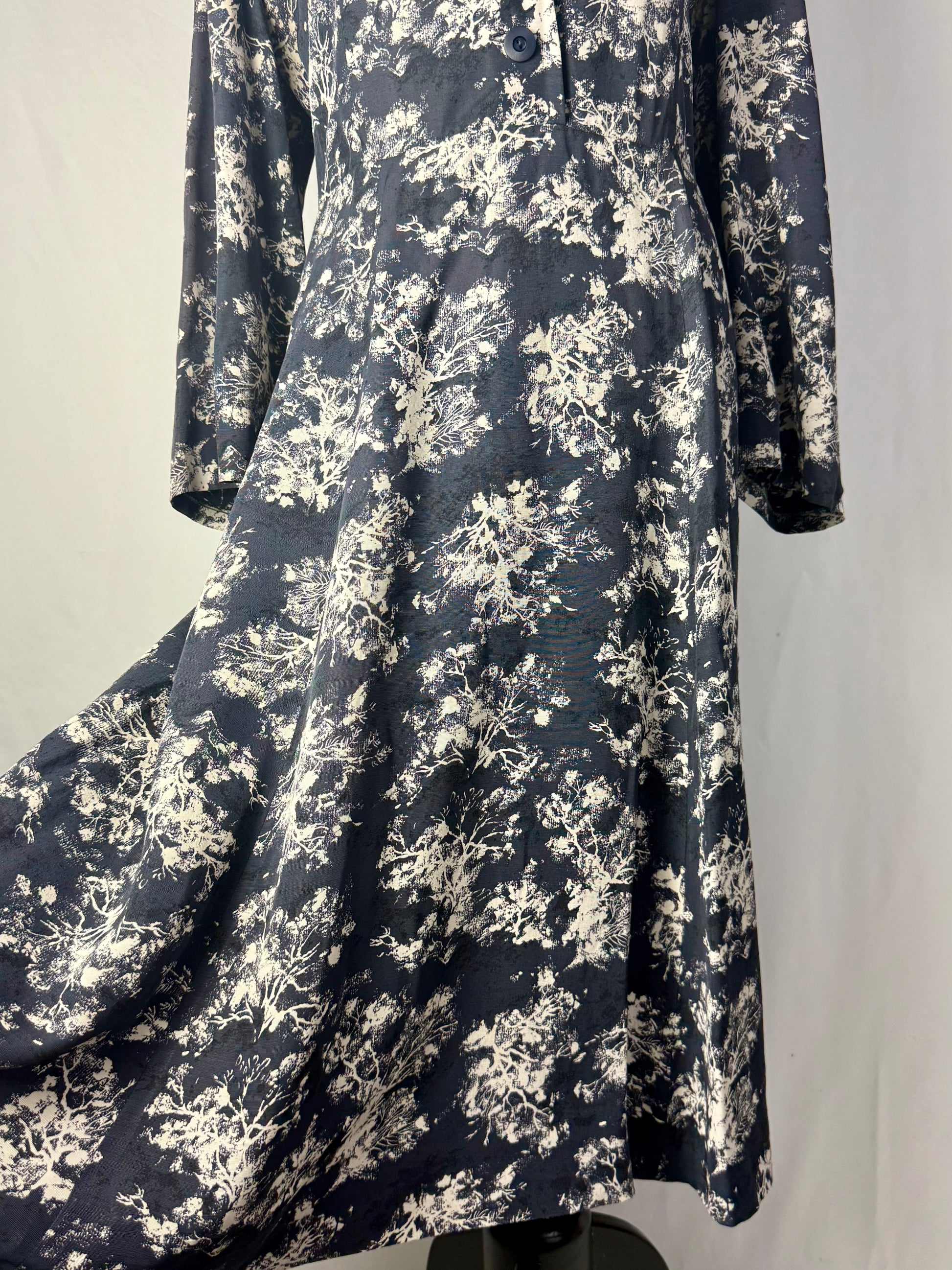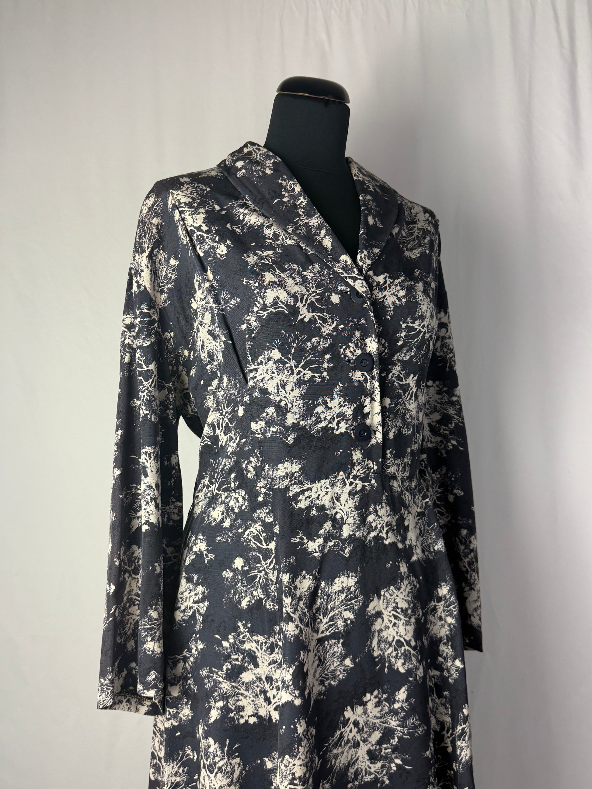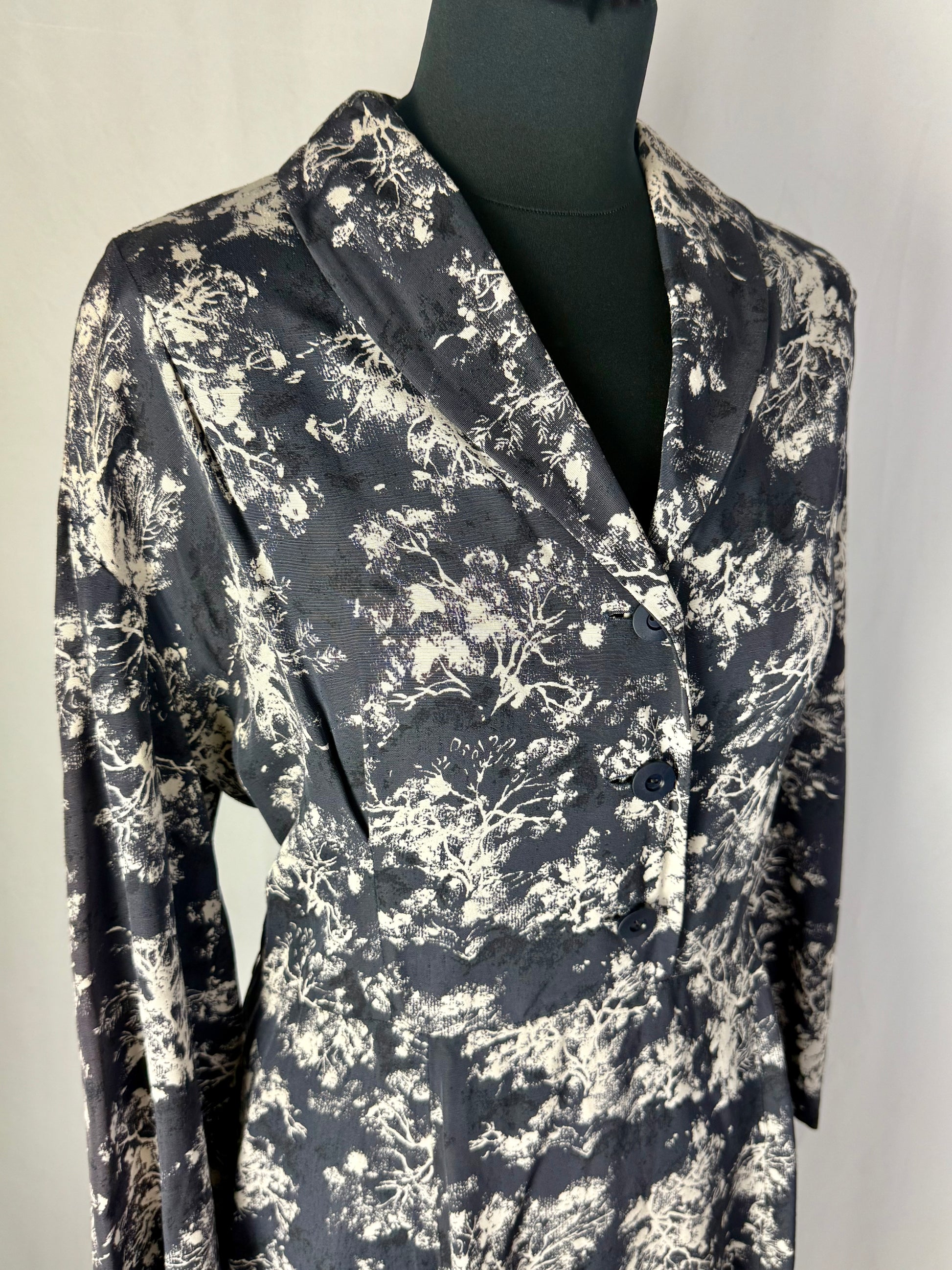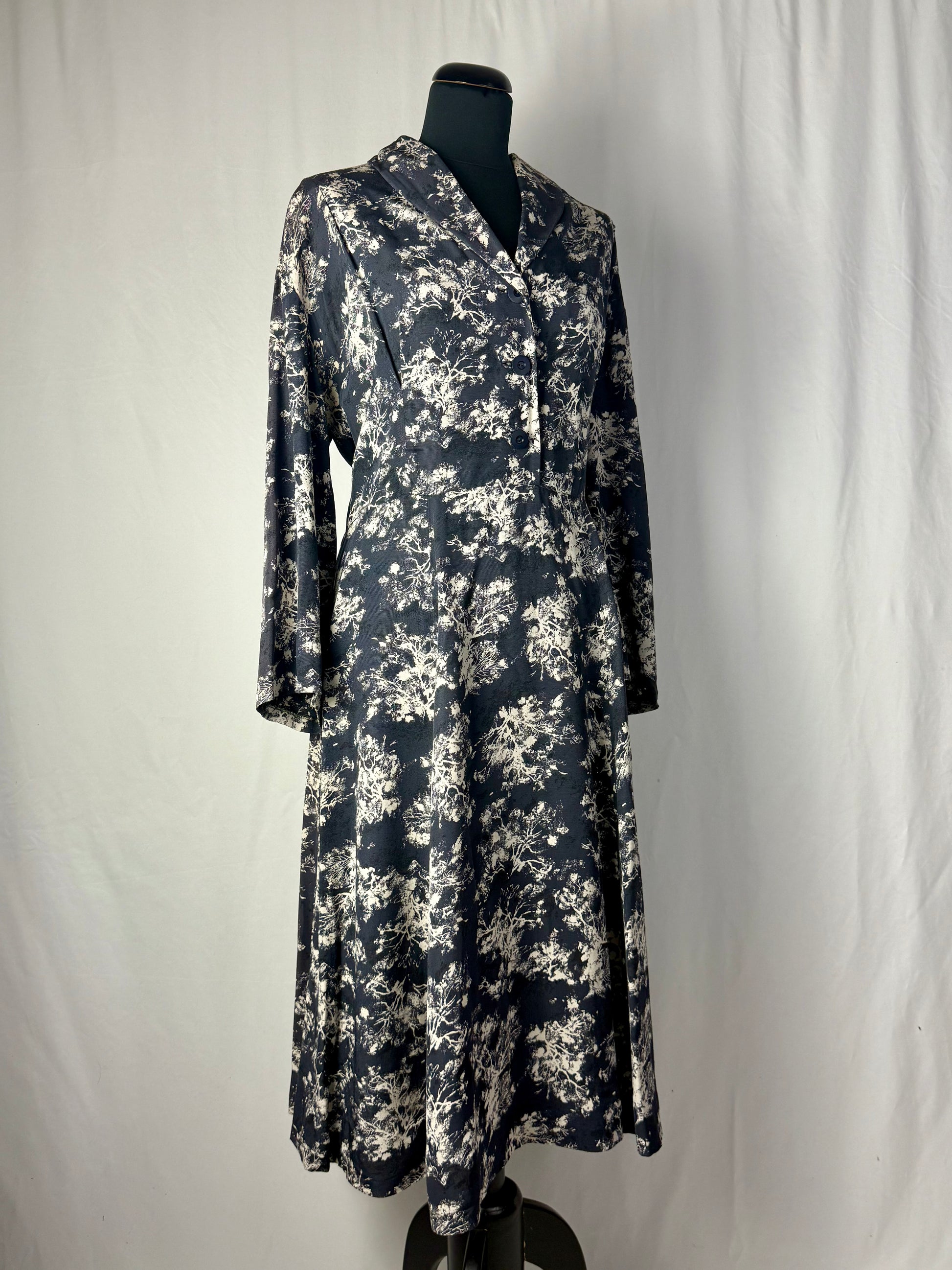 Abito sartoriale anni ’50 in prezioso misto cotone e seta, caratterizzato da una linea femminile con corpino aderente e gonna con pinces. Il tessuto presenta un’elegante fantasia floreale nei toni del nero e dell’avorio che richiama le stampe toile de Jouy. Il collo sciallato e l’abbottonatura frontale conferiscono al capo un’eleganza raffinata e senza tempo, tipica della moda anni Cinquanta.