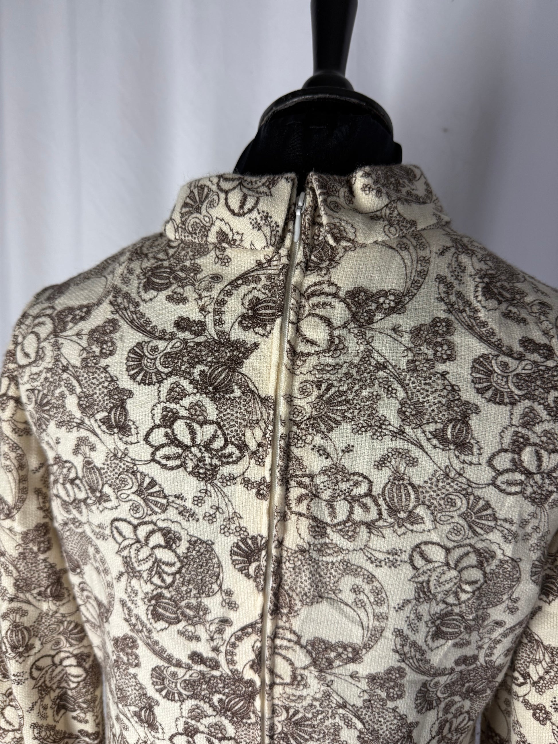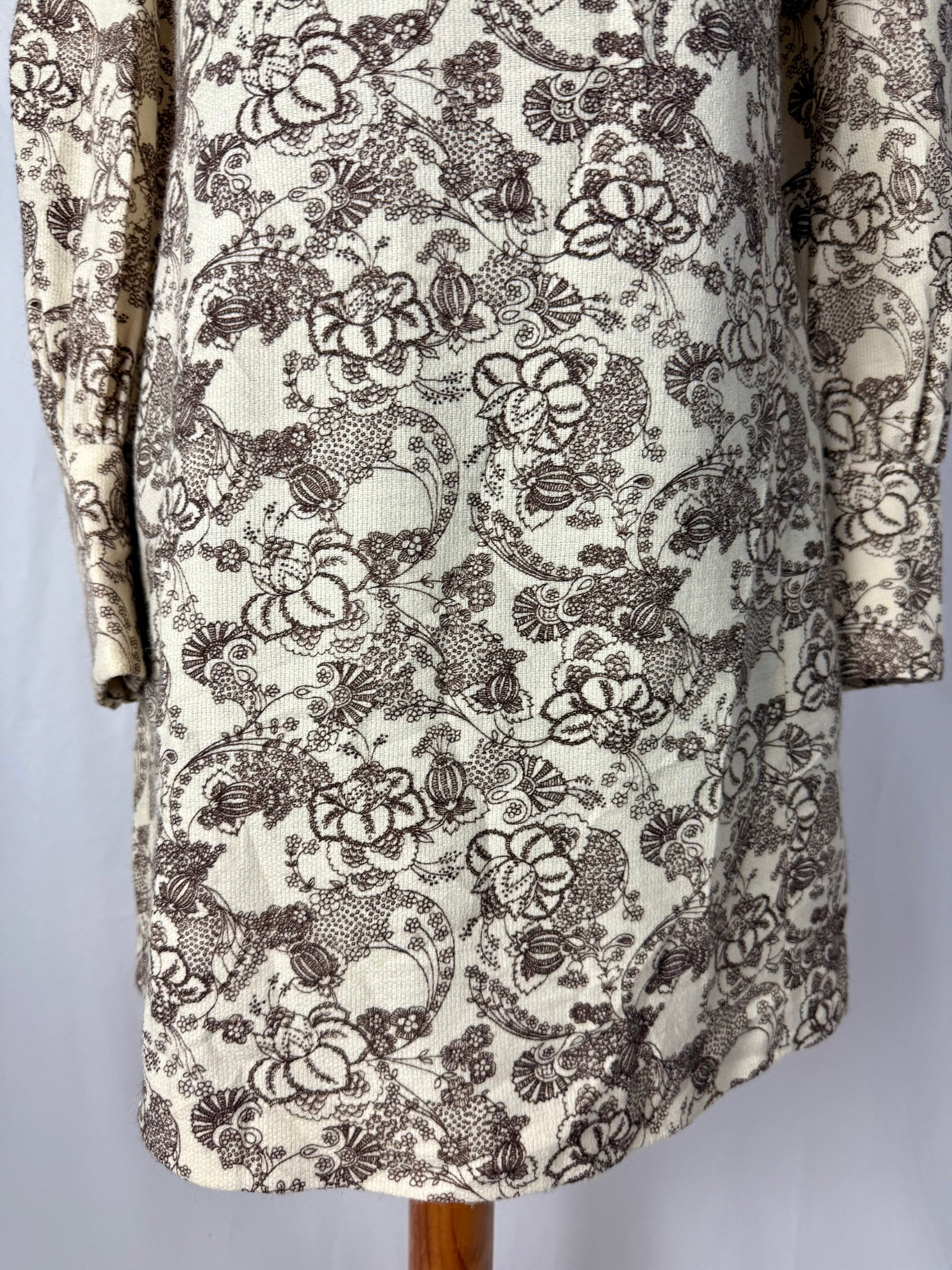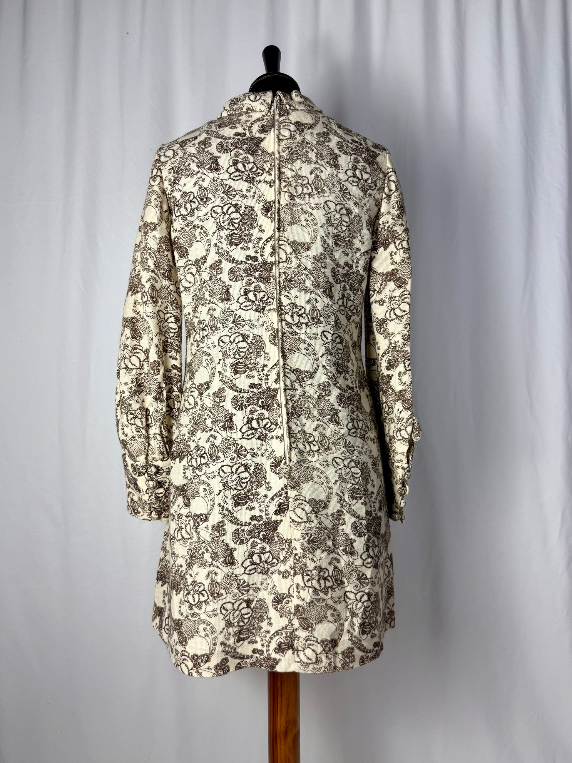 Un classico modello a trapezio con collo alto, in tessuto broccato con motivo floreale marrone su fondo crema. Linea semplice ma elegante, maniche lunghe e taglio corto. Trasmette vibes sofisticate, perfetto per le serate della Swinging London