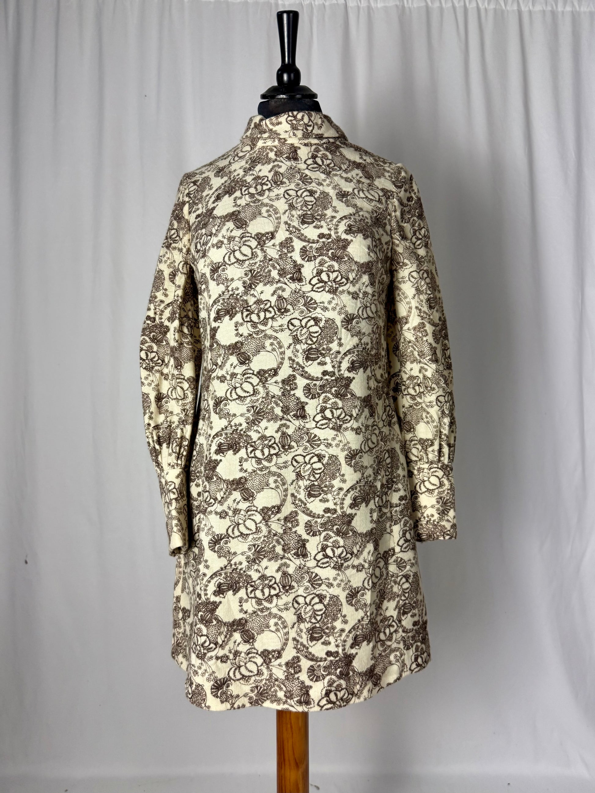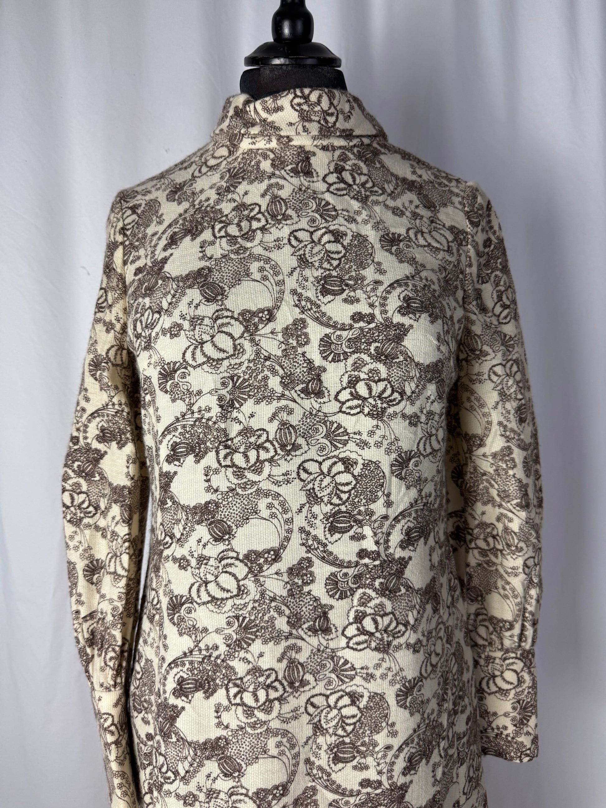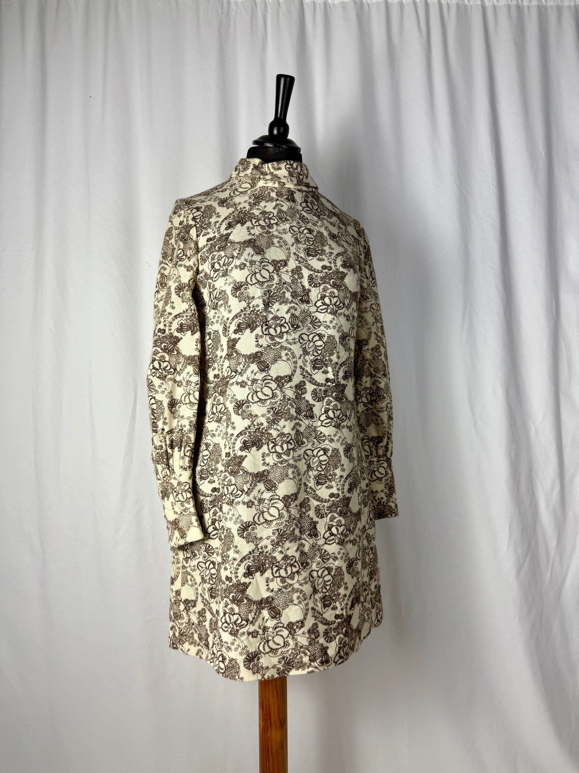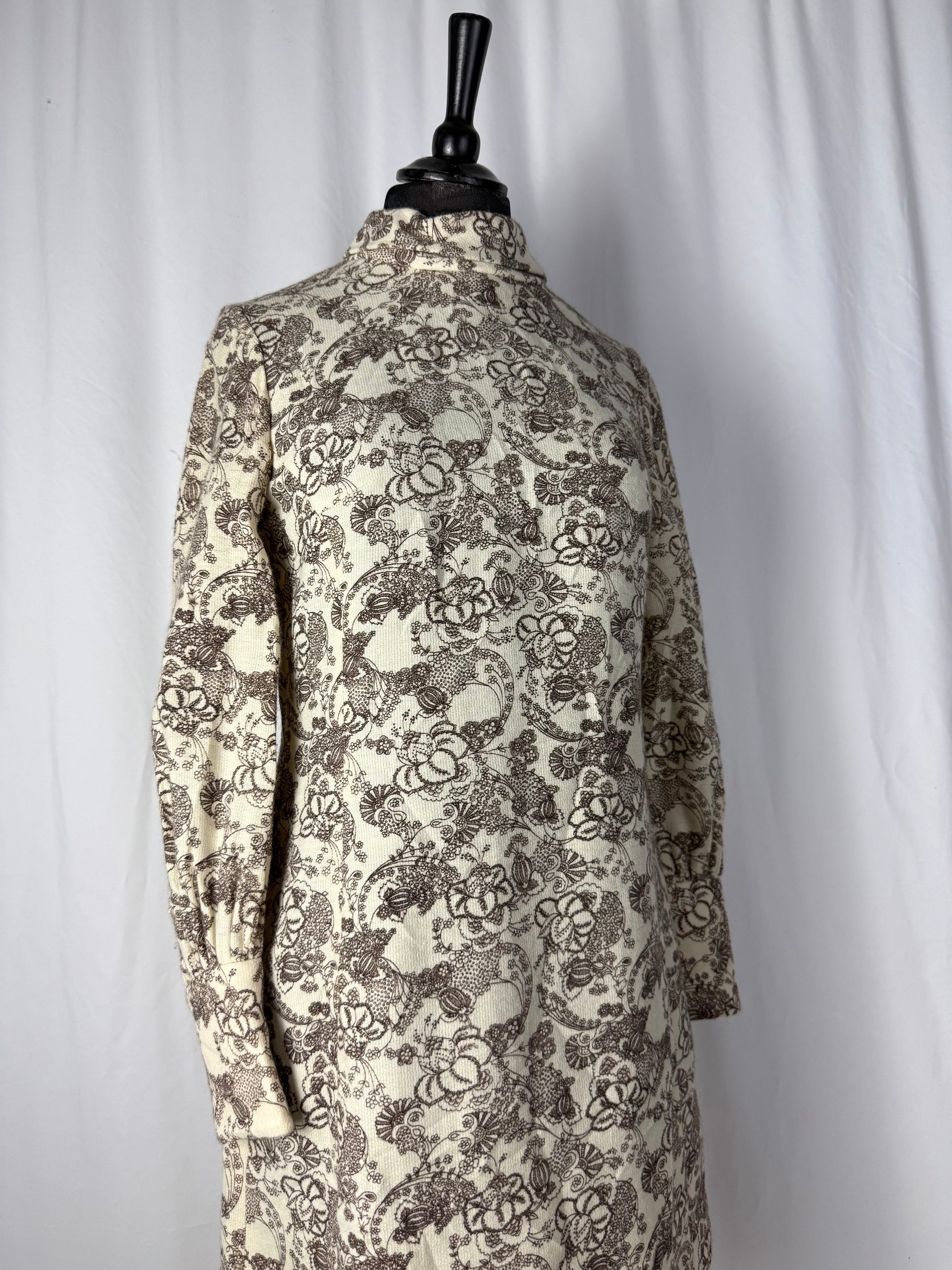 Un classico modello a trapezio con collo alto, in tessuto broccato con motivo floreale marrone su fondo crema. Linea semplice ma elegante, maniche lunghe e taglio corto. Trasmette vibes sofisticate, perfetto per le serate della Swinging London