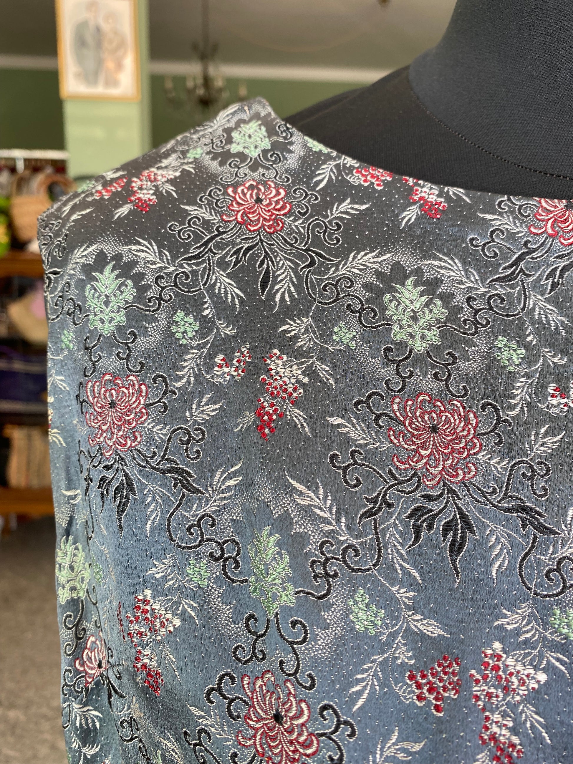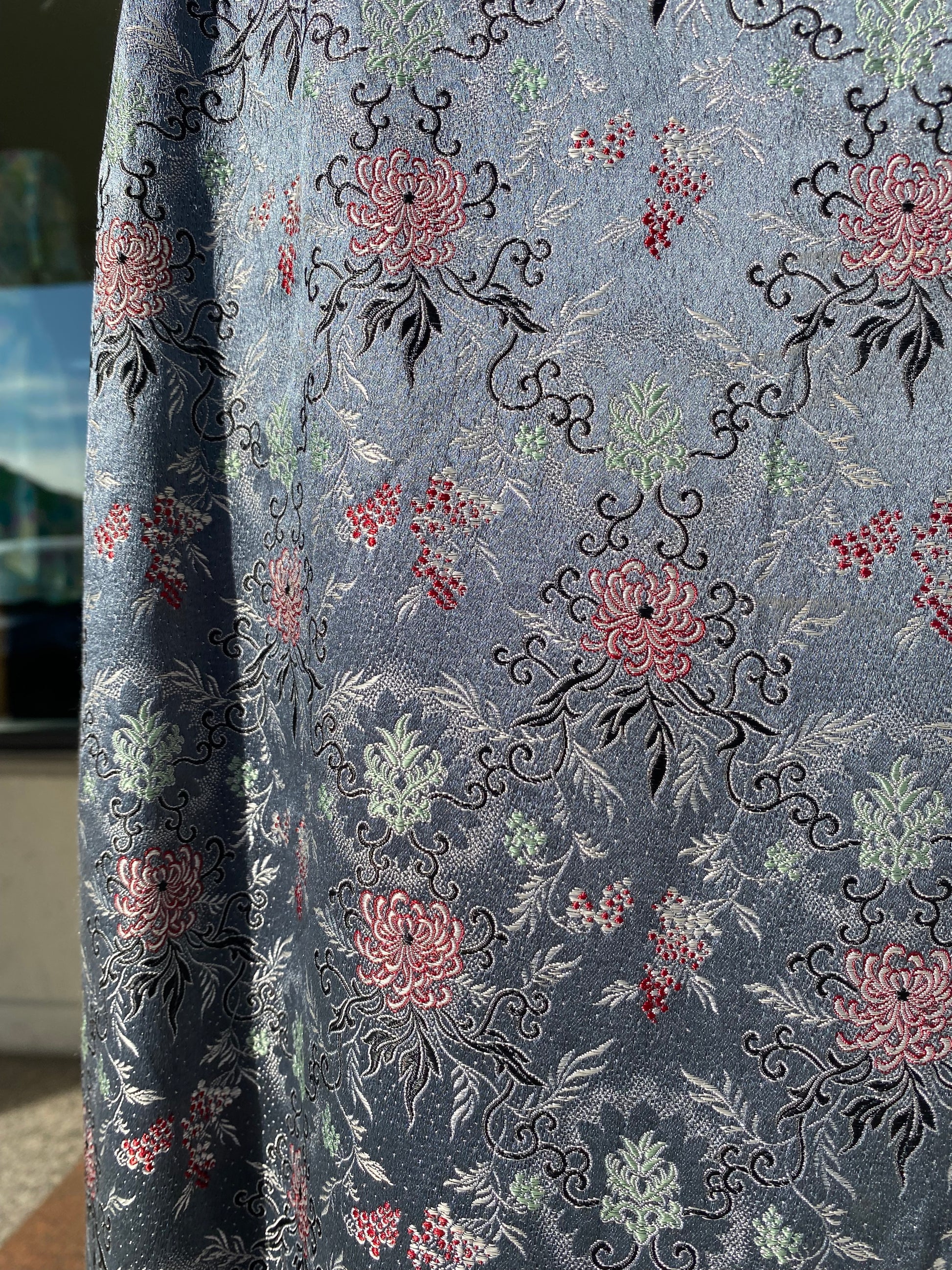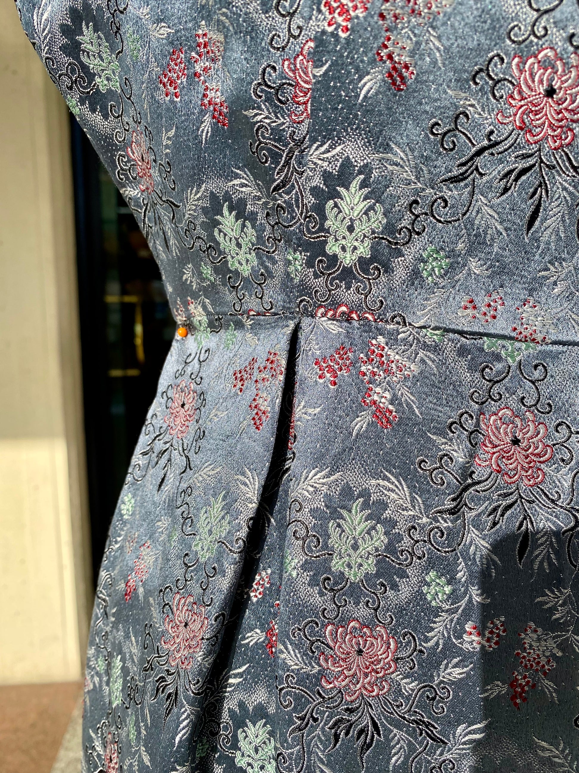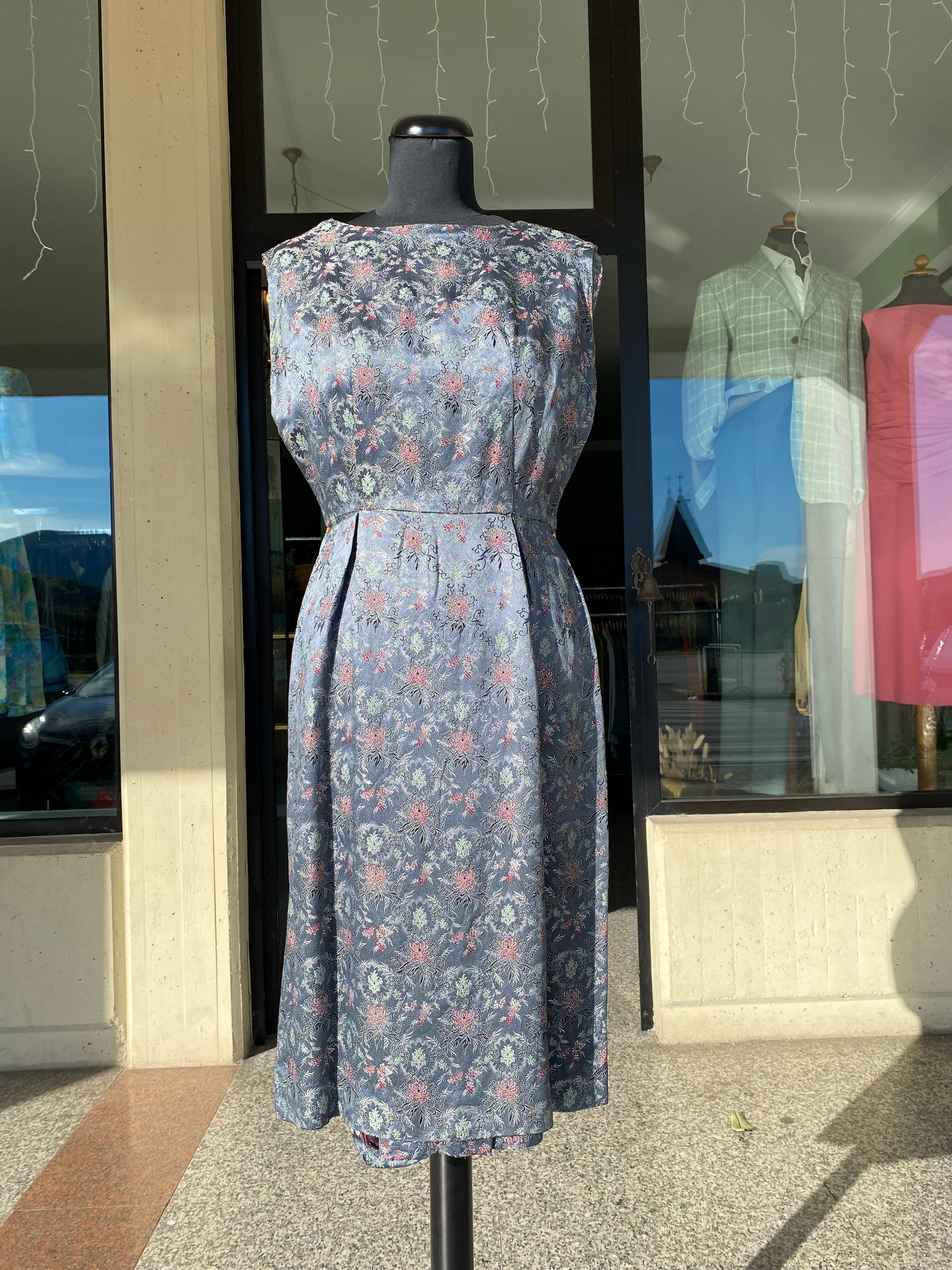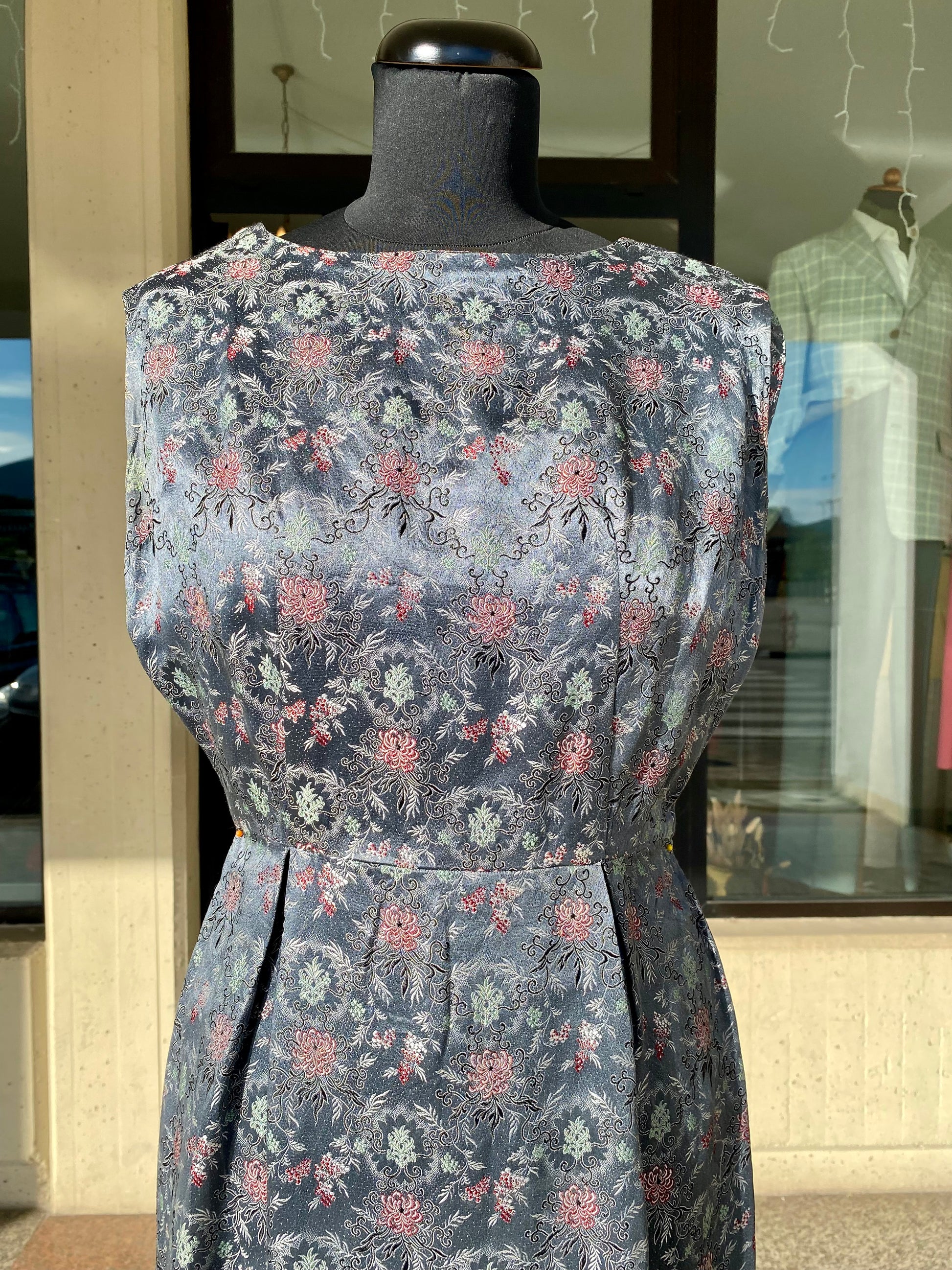 Abito autentico e sartoriale anni ’60 in pura seta broccata, con raffinato motivo floreale orientale nei toni del salvia, malva e rosso su base azzurro pervinca.