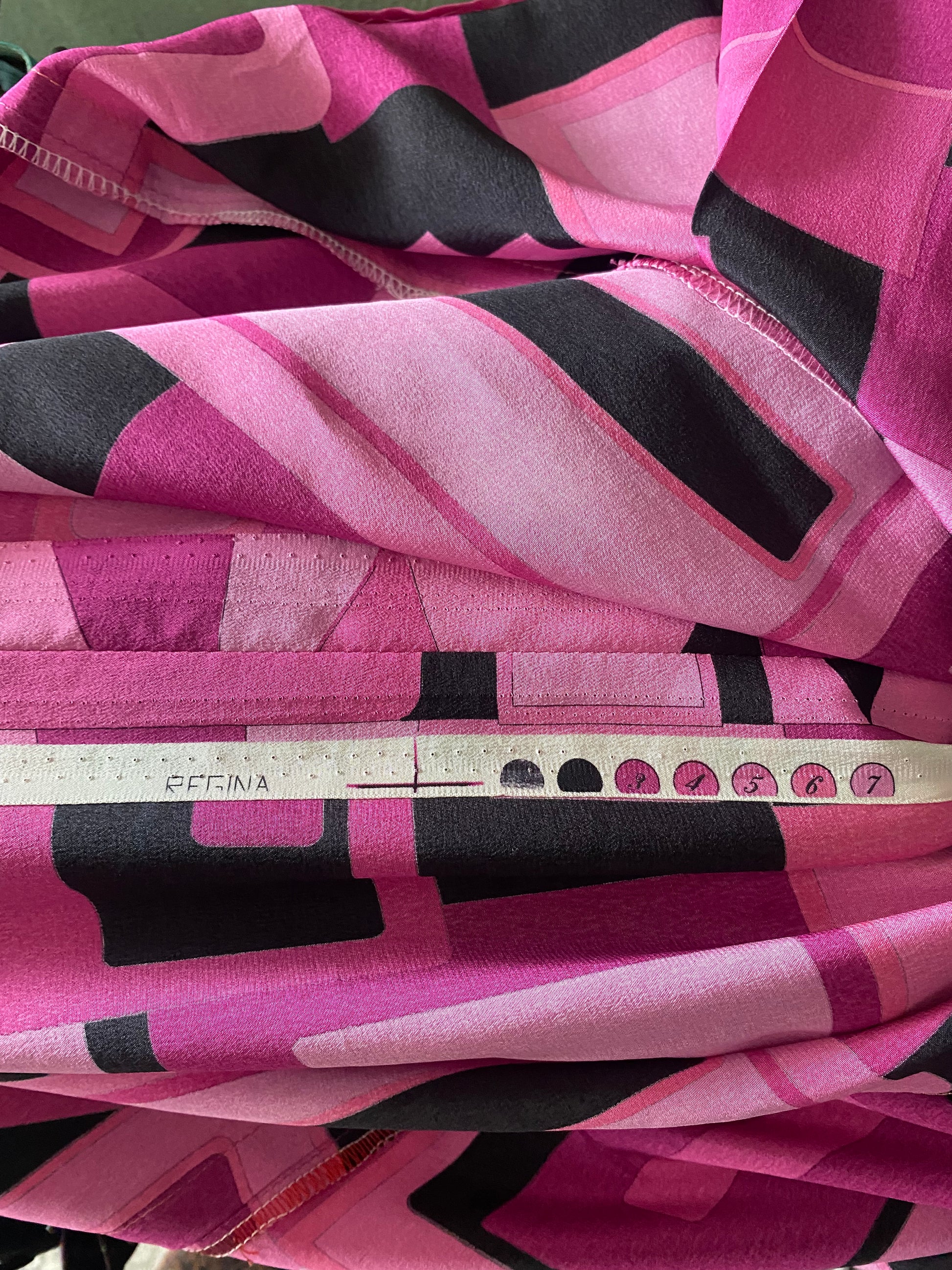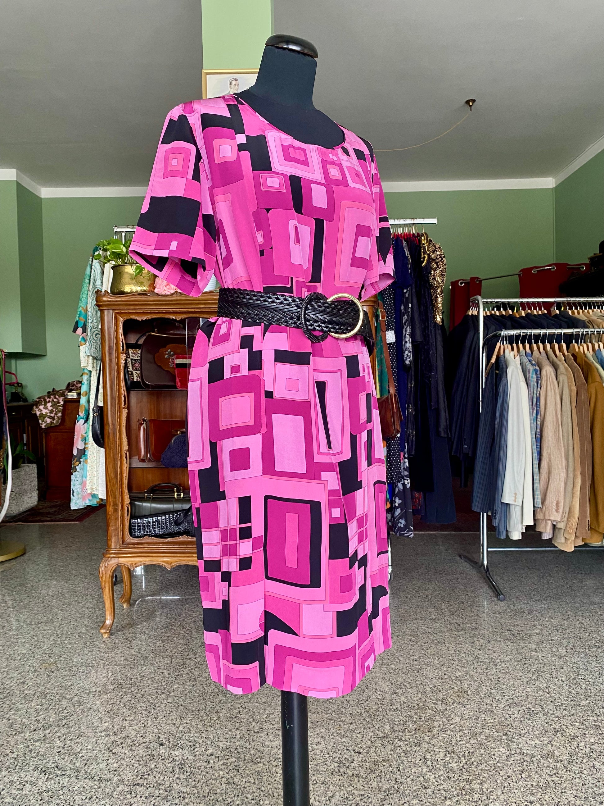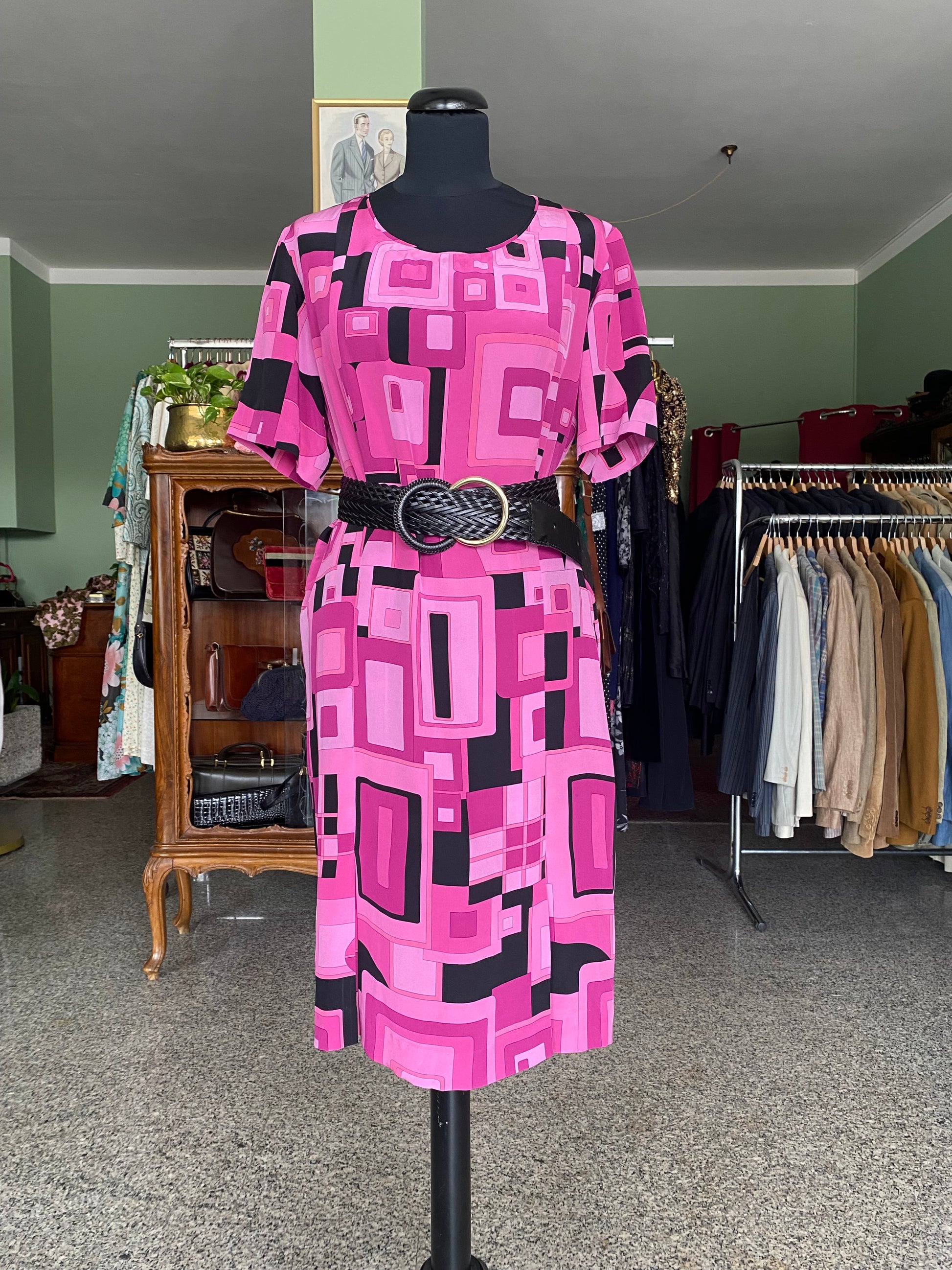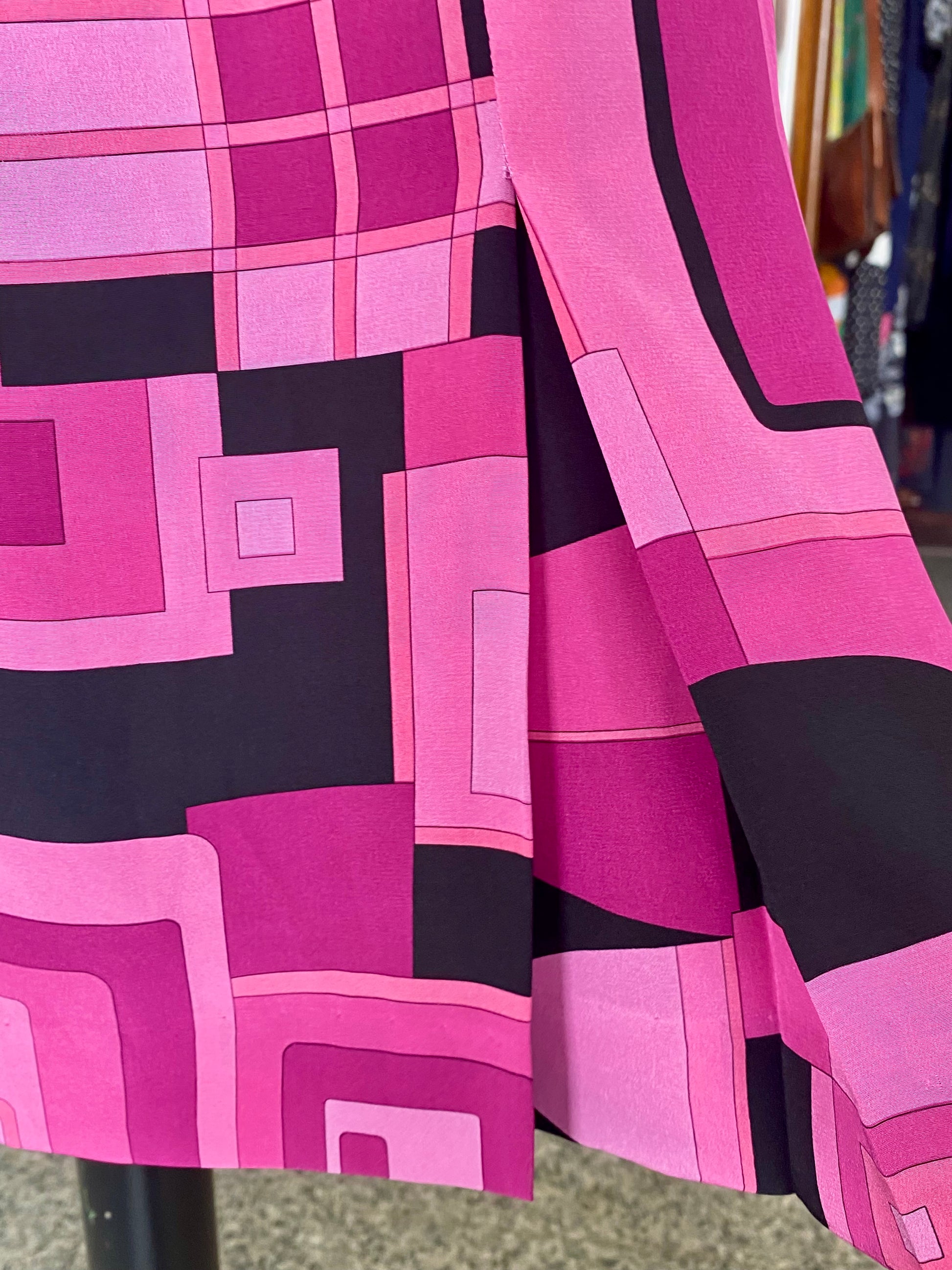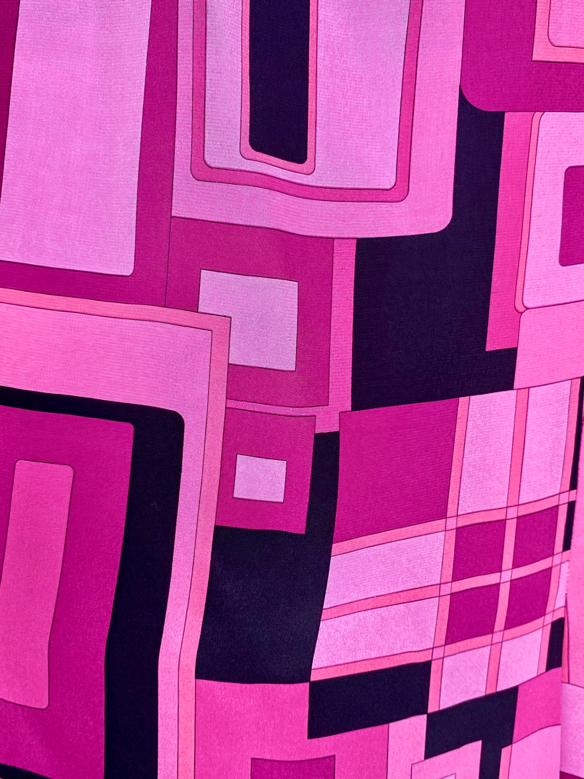 Abito anni '60 in pura seta, realizzato sartorialmente, dal taglio lineare ed elegante. Il vero protagonista è il motivo geometrico optical nei toni del fucsia, rosa e nero, tipico della grafica della Swinging London. Un pezzo dallo spirito audace ma dal fit raffinato, perfetto per chi ama i contrasti tra forma e colore.