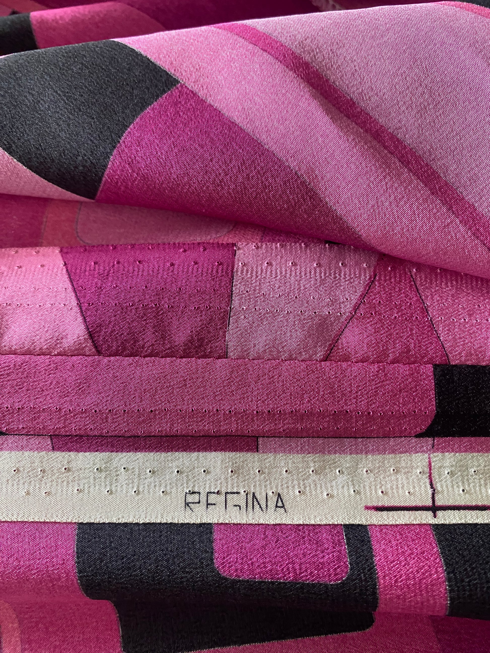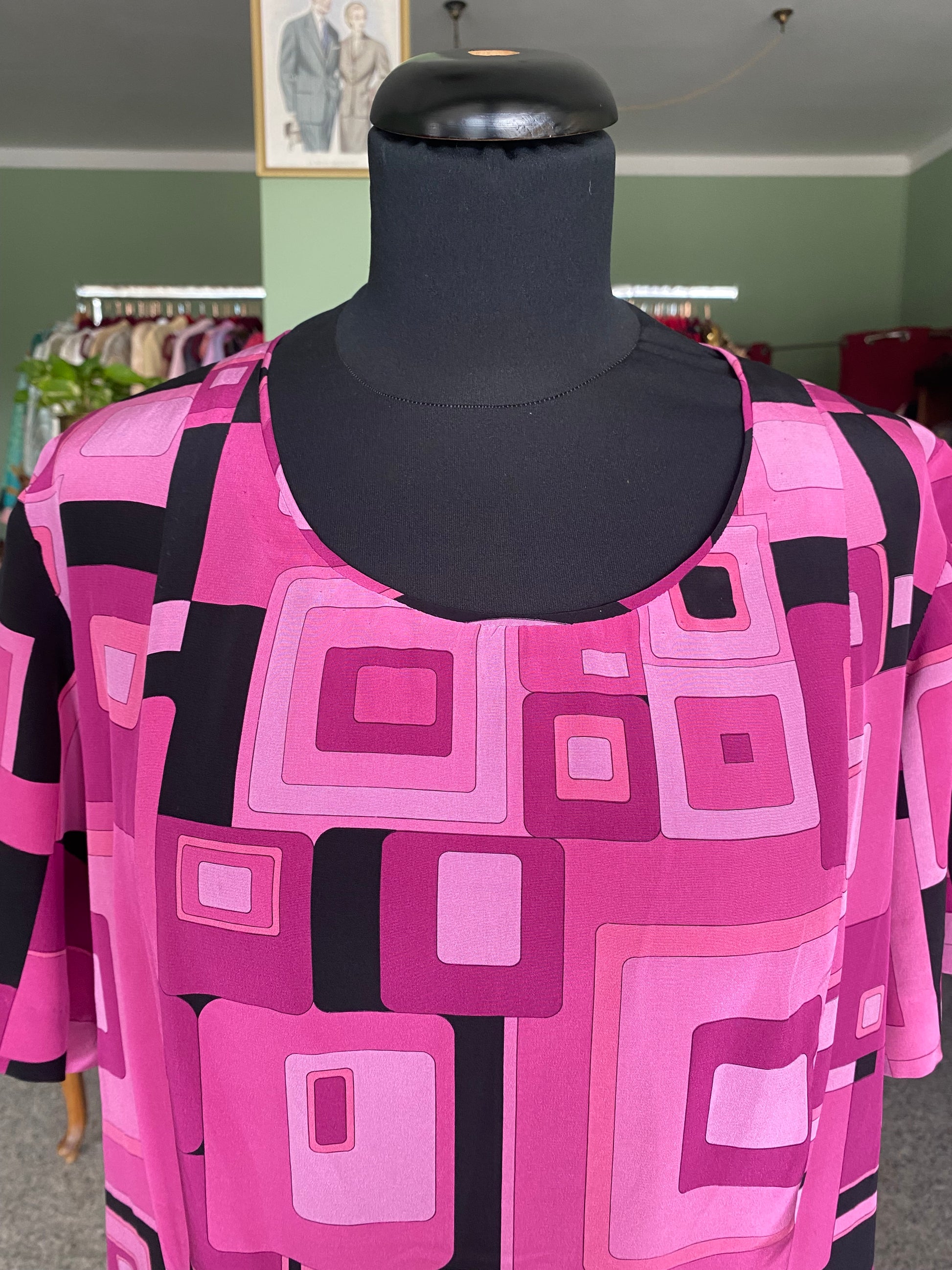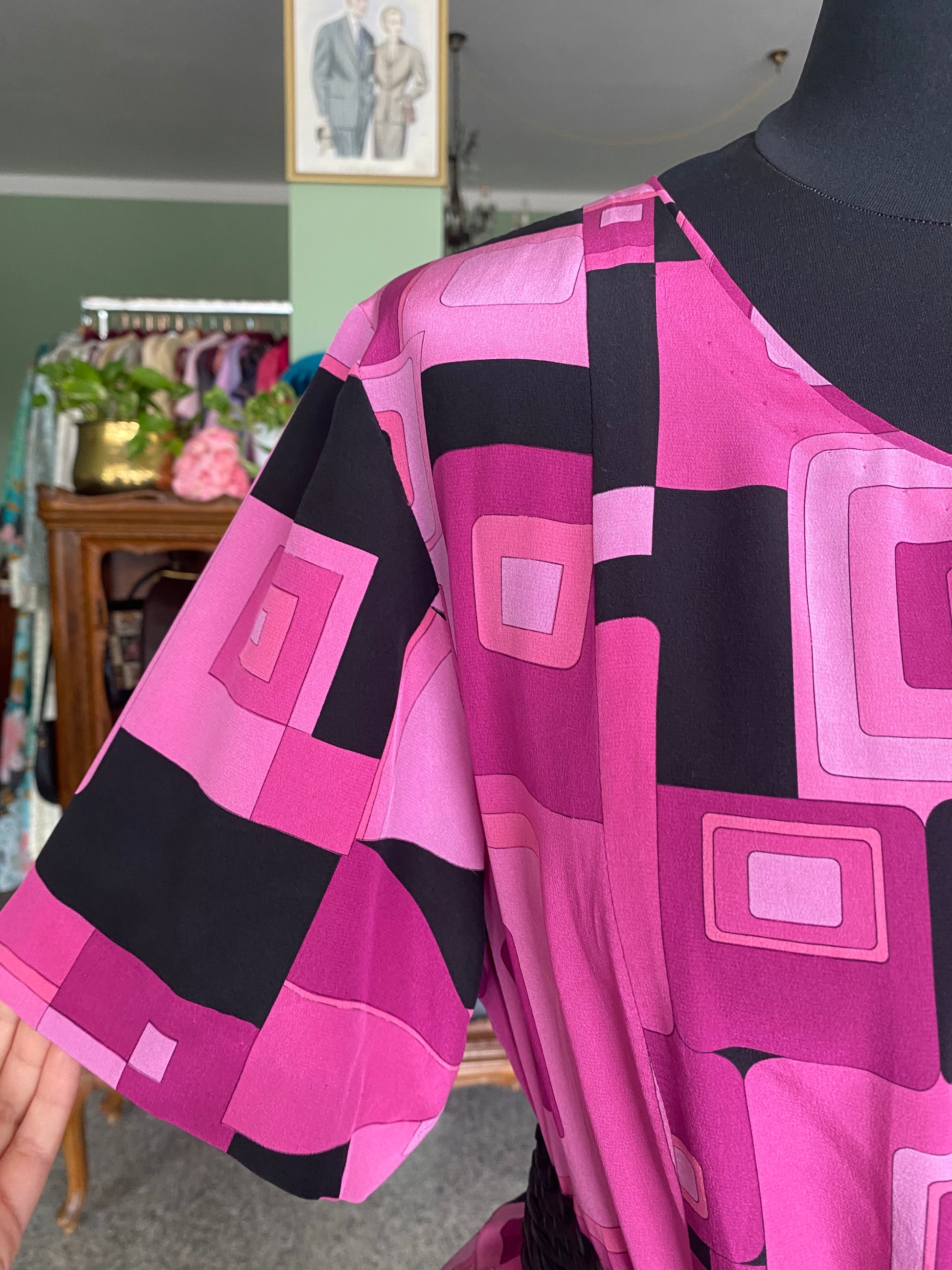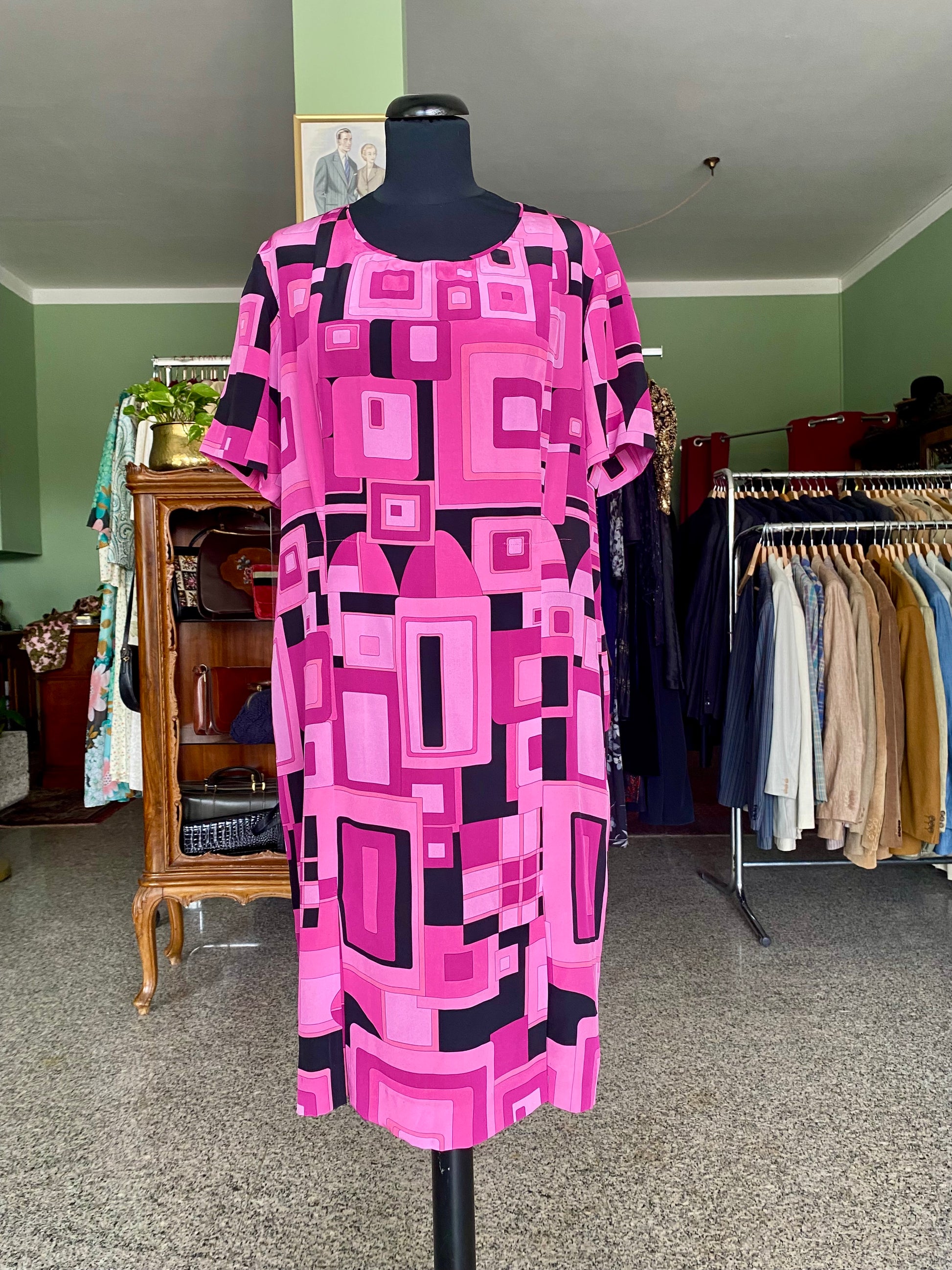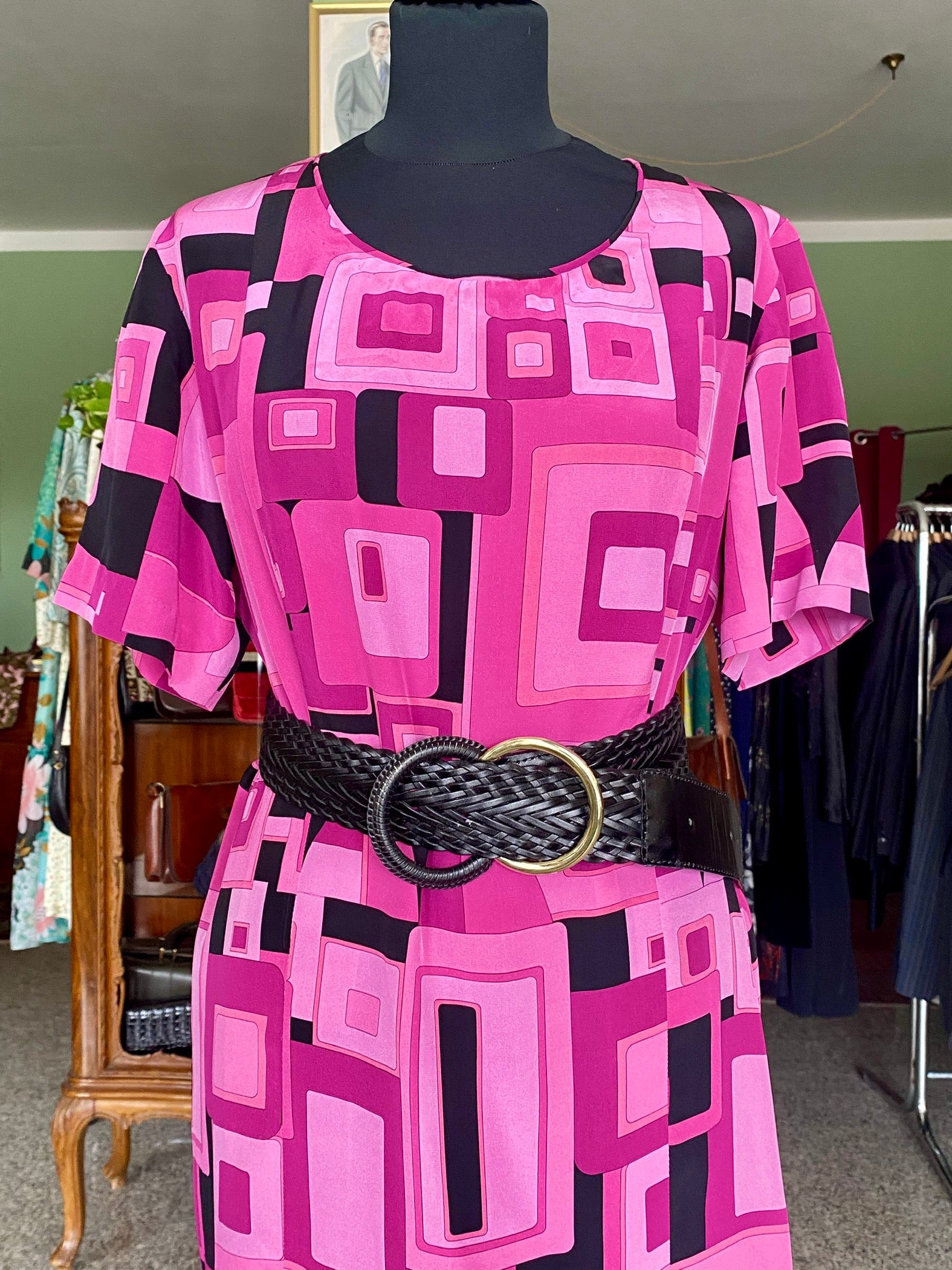 Abito anni '60 in pura seta, realizzato sartorialmente, dal taglio lineare ed elegante. Il vero protagonista è il motivo geometrico optical nei toni del fucsia, rosa e nero, tipico della grafica della Swinging London. Un pezzo dallo spirito audace ma dal fit raffinato, perfetto per chi ama i contrasti tra forma e colore.