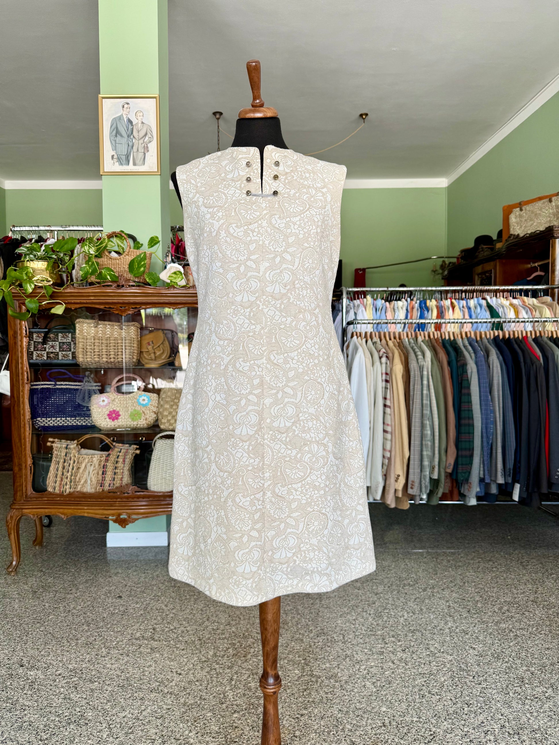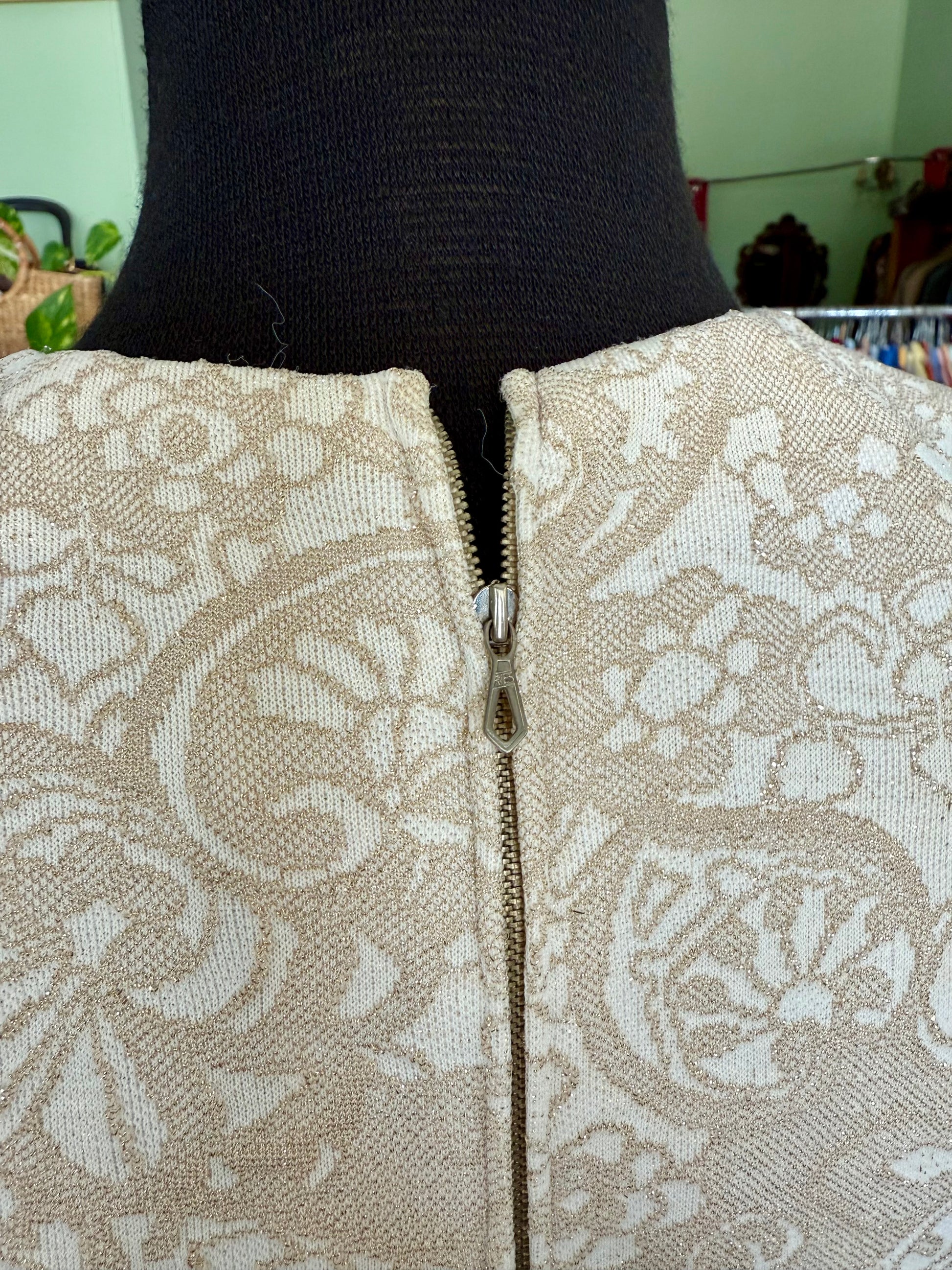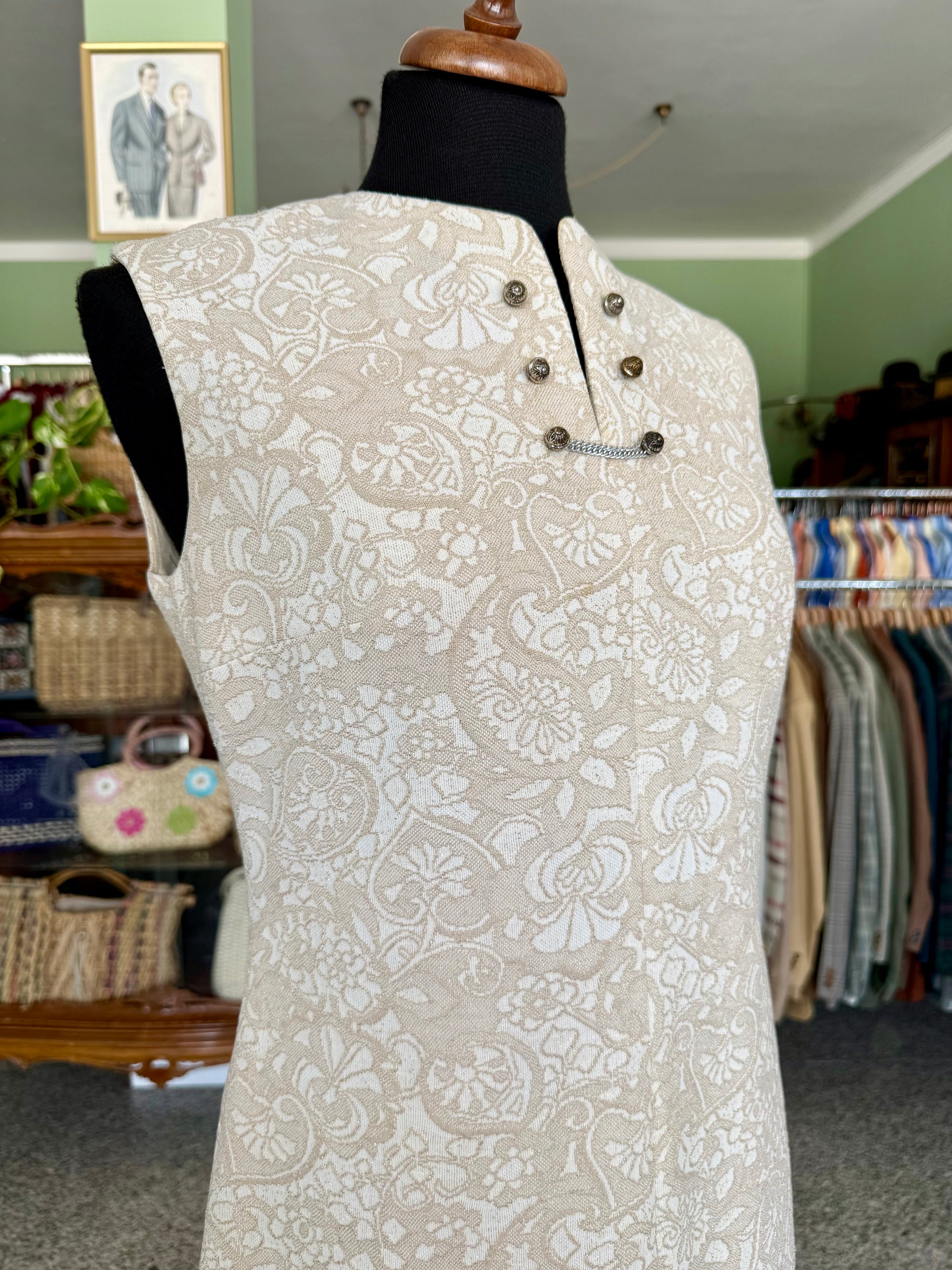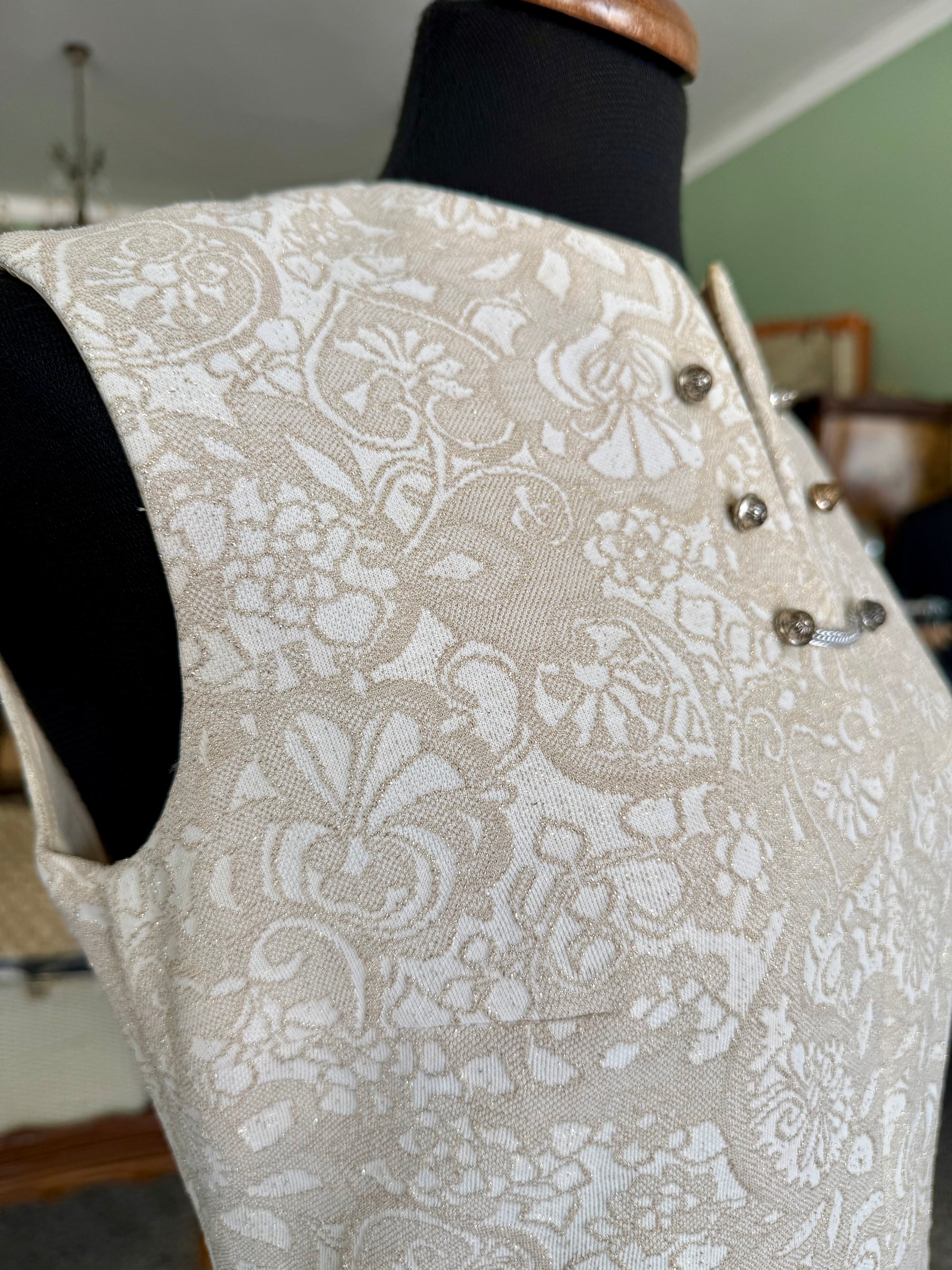 Elegante e raffinato, questo smanicato anni ’60 in tessuto broccato color oro chiaro incarna il lato più sofisticato della moda del tempo. Il motivo floreale leggermente in rilievo impreziosisce il tessuto, mentre il taglio minimal con chiusura a bottoncini sul décolleté sottolinea la cura dei dettagli e il fascino senza tempo. Ideale per occasioni speciali o serate dal sapore vintage, è un capo che unisce classe e unicità in perfetto stile mid-century.