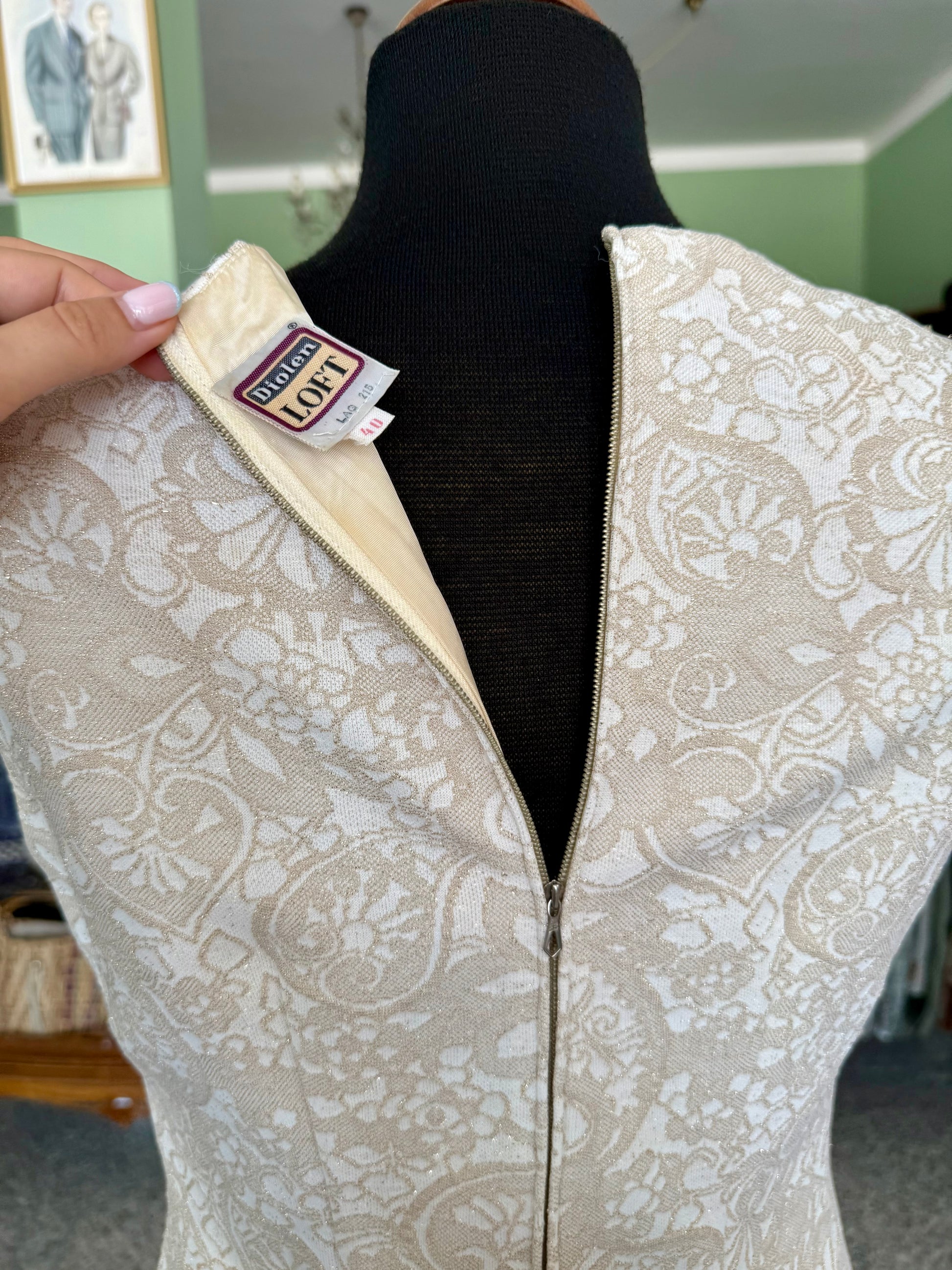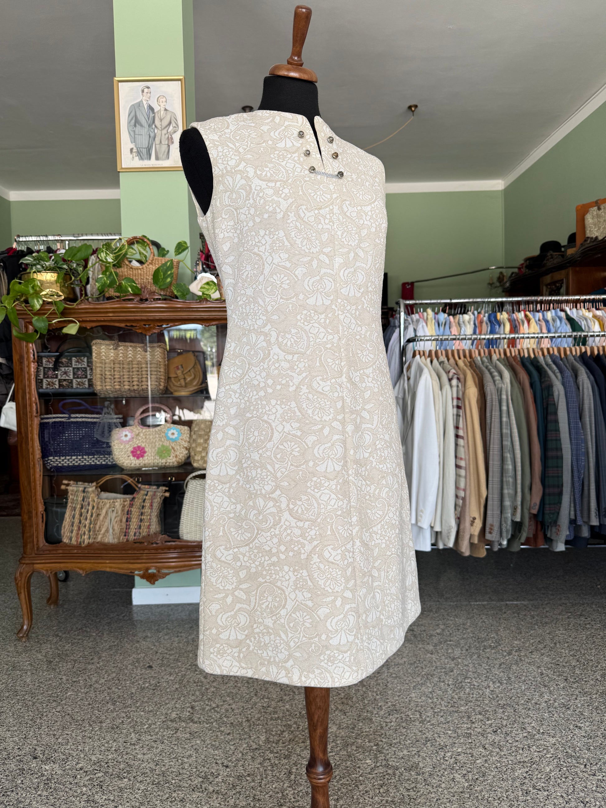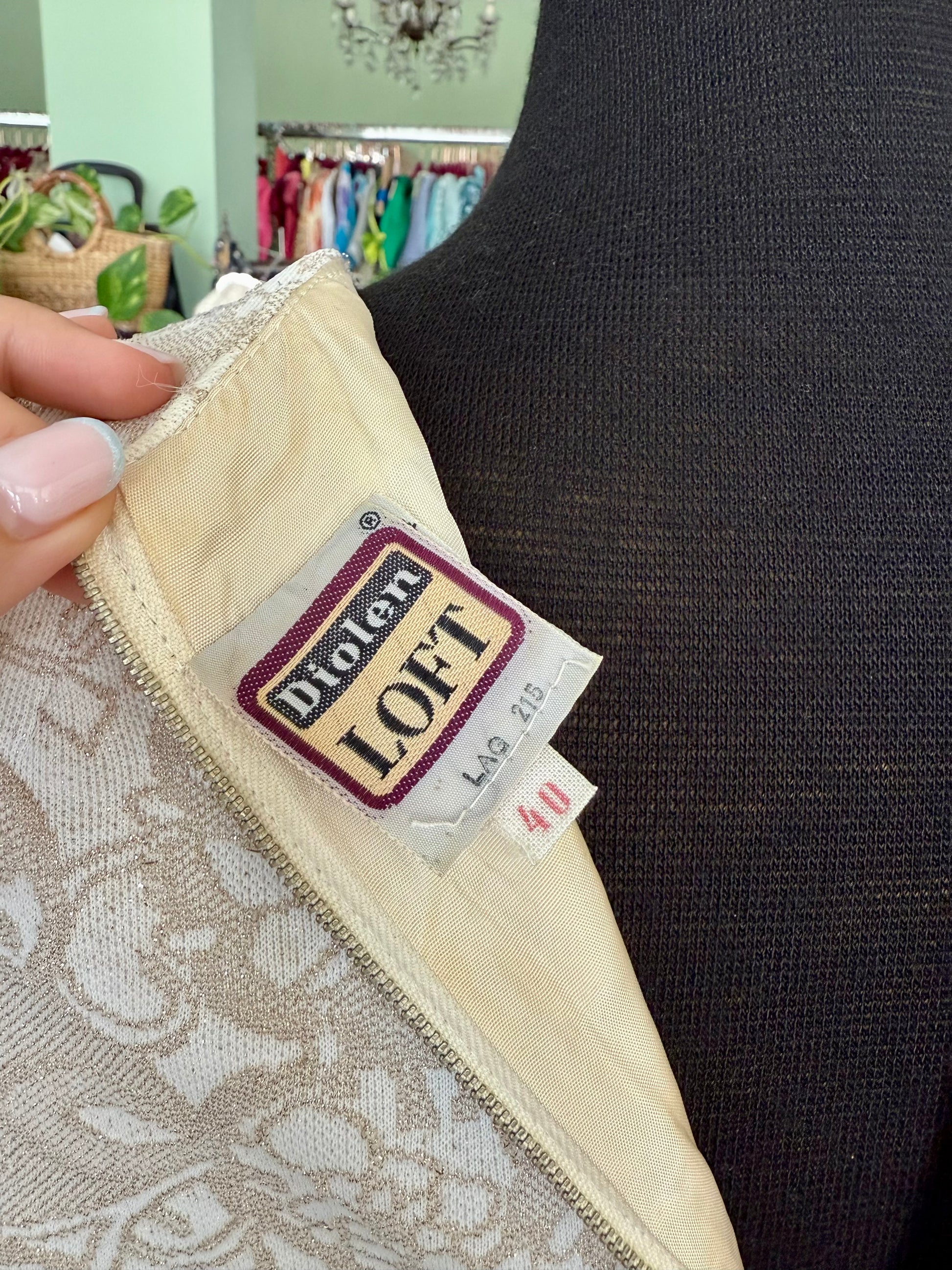 Elegante e raffinato, questo smanicato anni ’60 in tessuto broccato color oro chiaro incarna il lato più sofisticato della moda del tempo. Il motivo floreale leggermente in rilievo impreziosisce il tessuto, mentre il taglio minimal con chiusura a bottoncini sul décolleté sottolinea la cura dei dettagli e il fascino senza tempo. Ideale per occasioni speciali o serate dal sapore vintage, è un capo che unisce classe e unicità in perfetto stile mid-century.