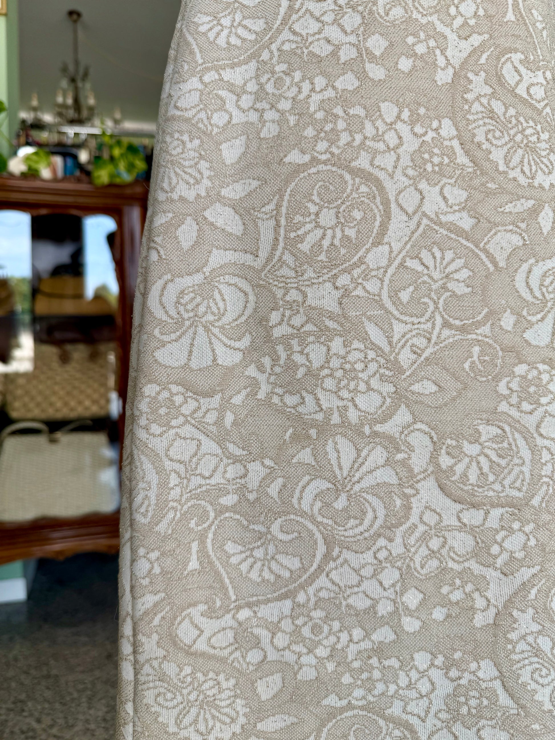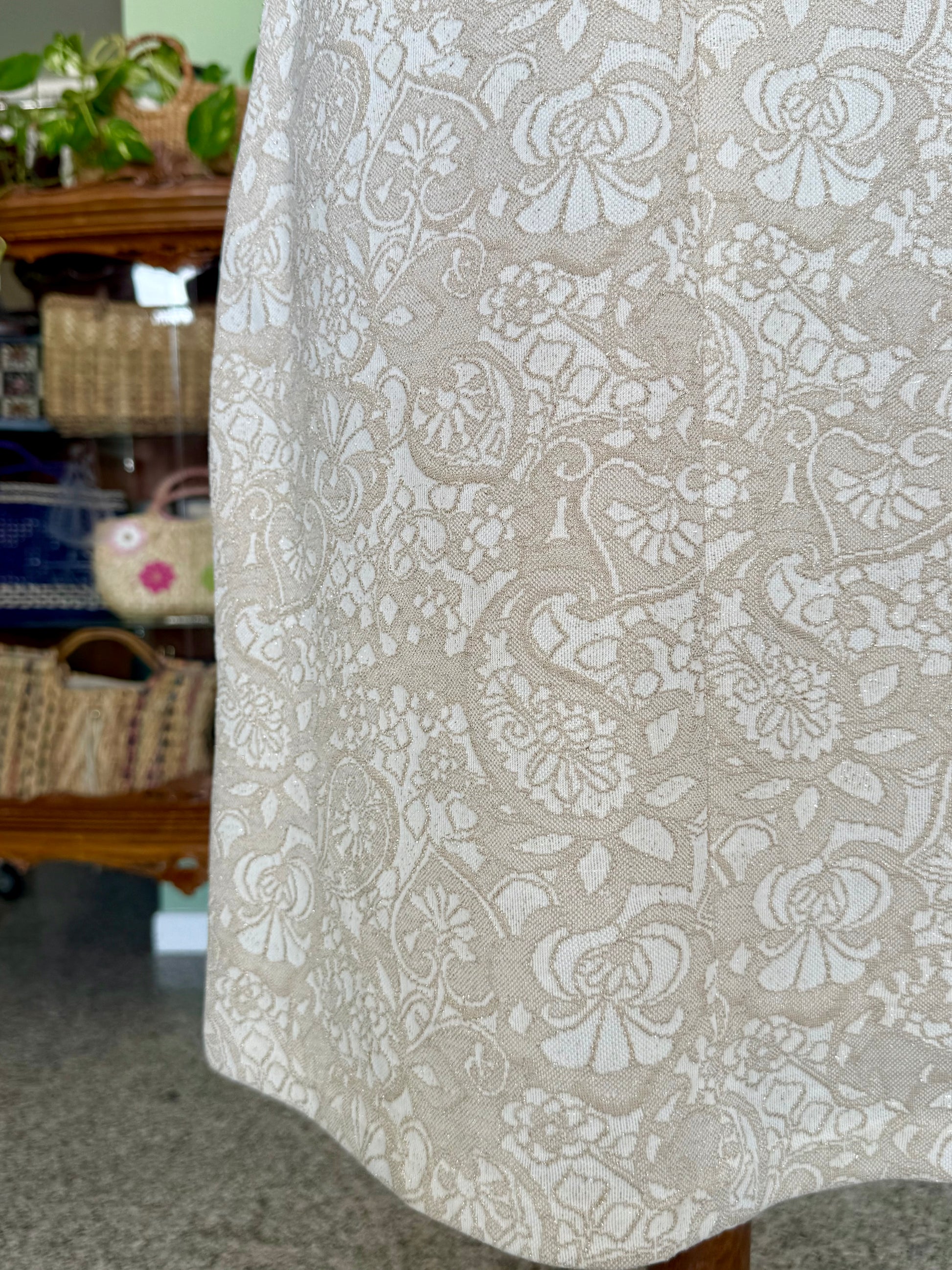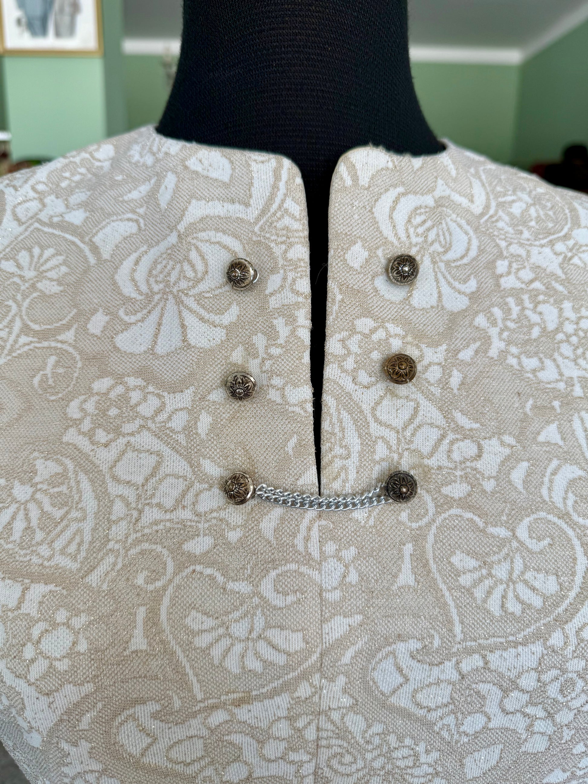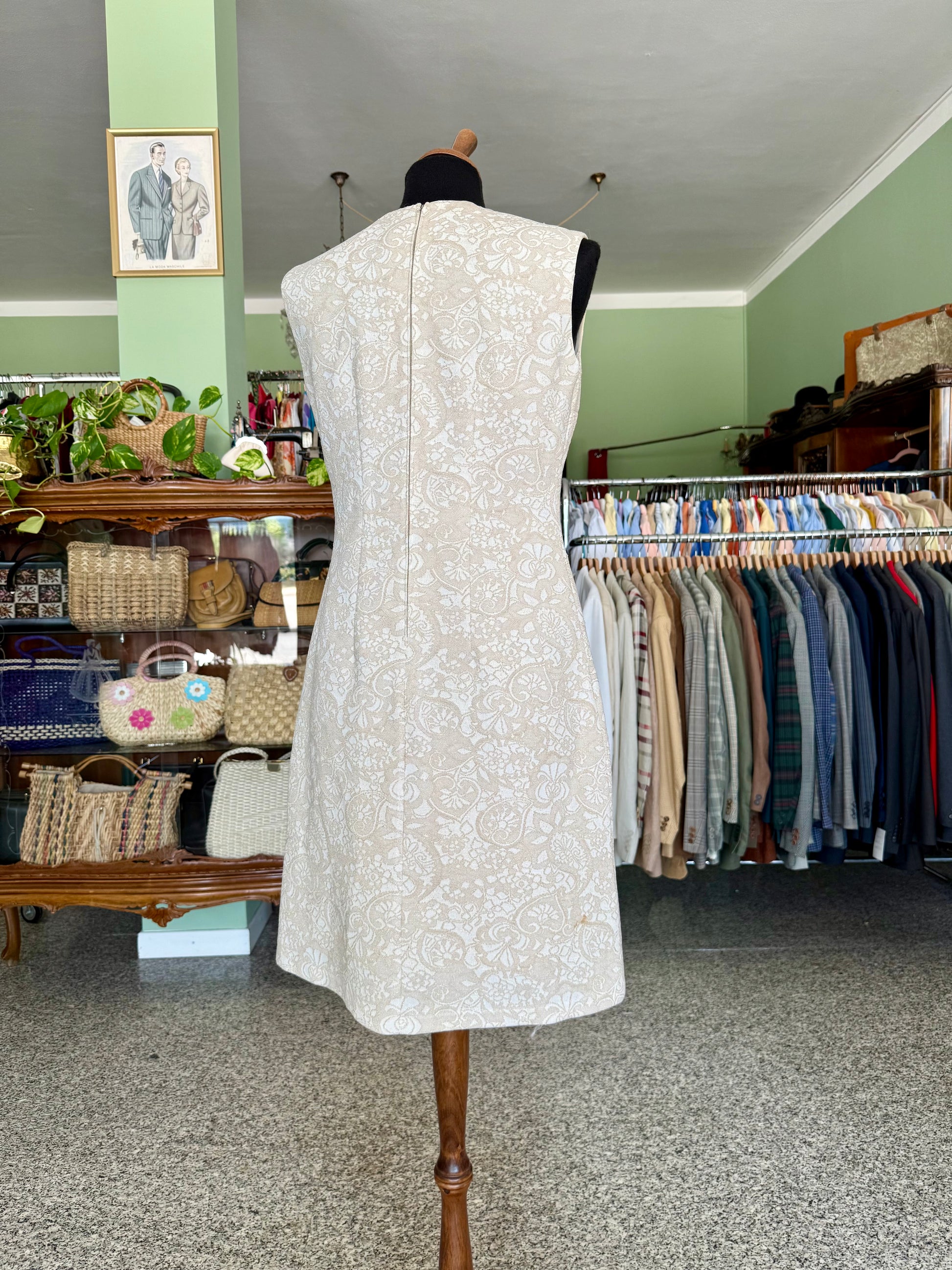 Elegante e raffinato, questo smanicato anni ’60 in tessuto broccato color oro chiaro incarna il lato più sofisticato della moda del tempo. Il motivo floreale leggermente in rilievo impreziosisce il tessuto, mentre il taglio minimal con chiusura a bottoncini sul décolleté sottolinea la cura dei dettagli e il fascino senza tempo. Ideale per occasioni speciali o serate dal sapore vintage, è un capo che unisce classe e unicità in perfetto stile mid-century.