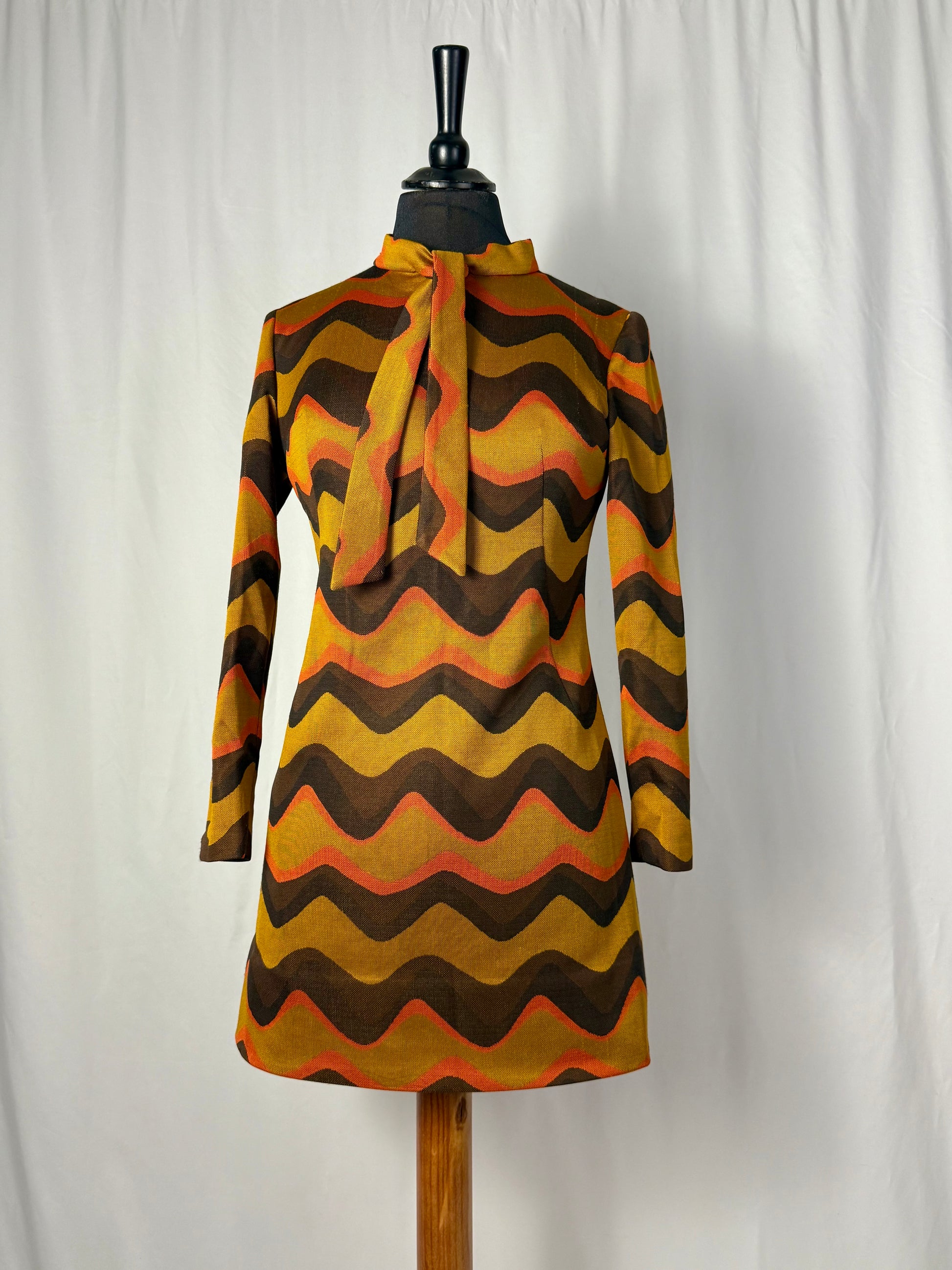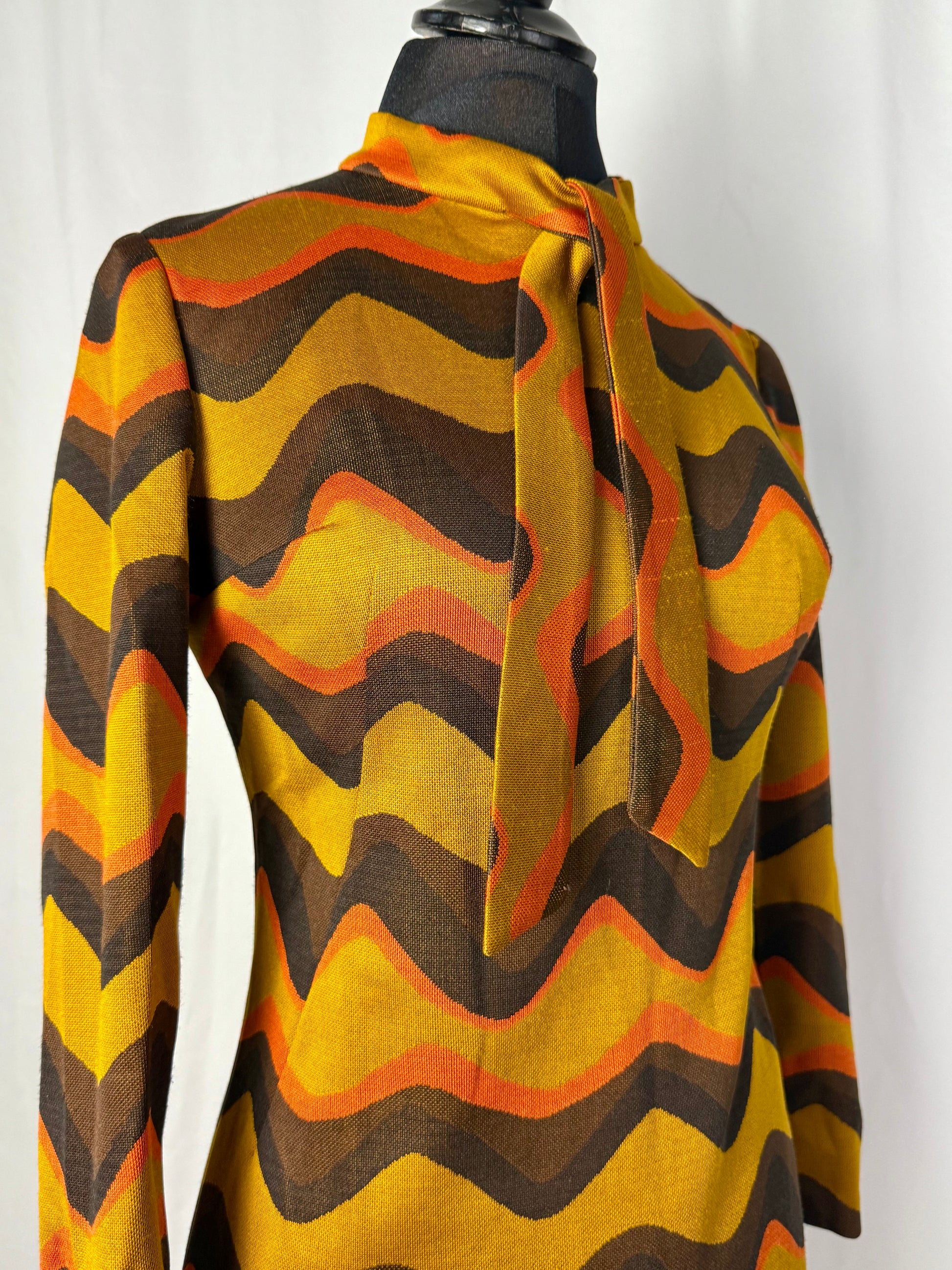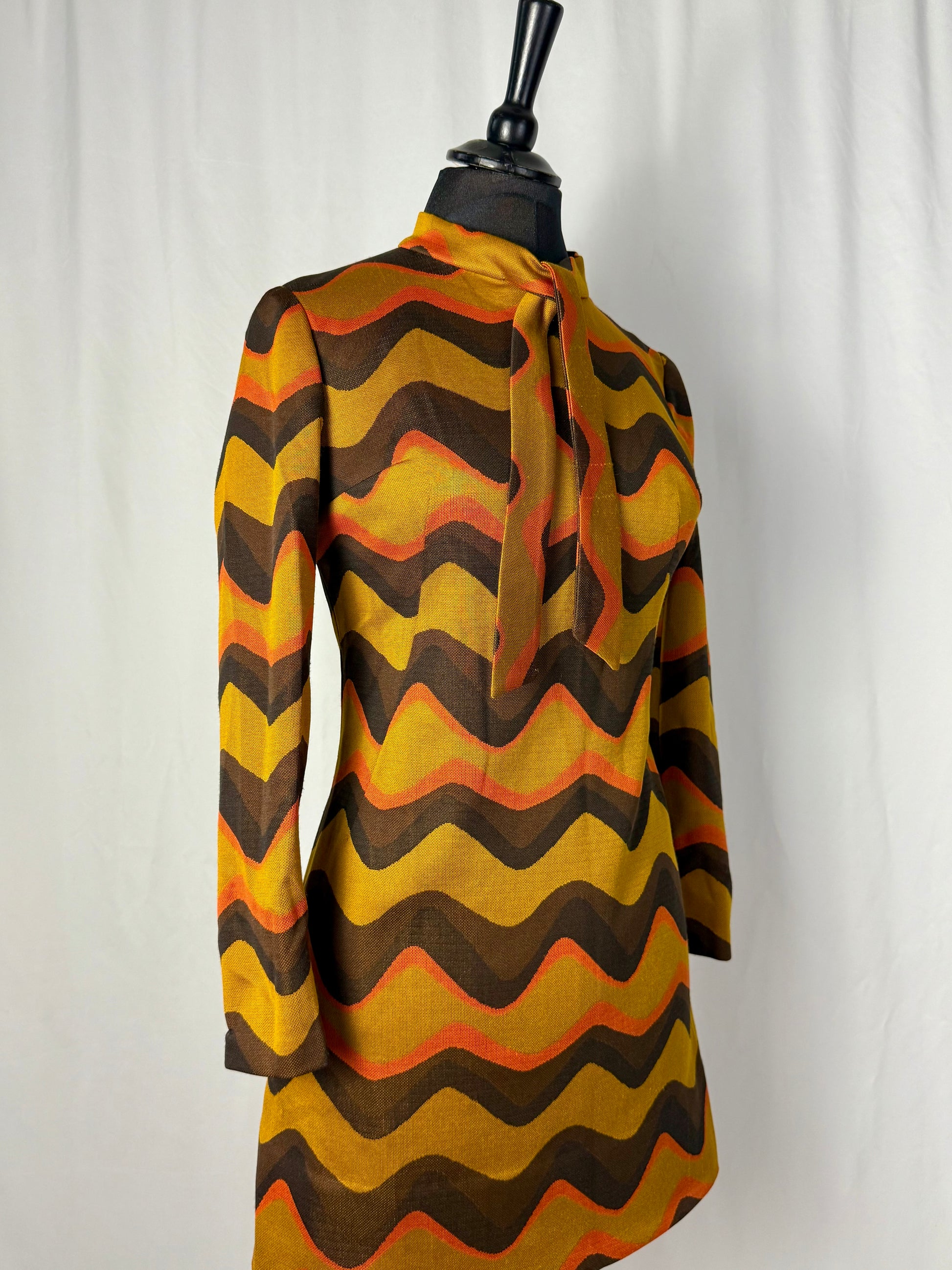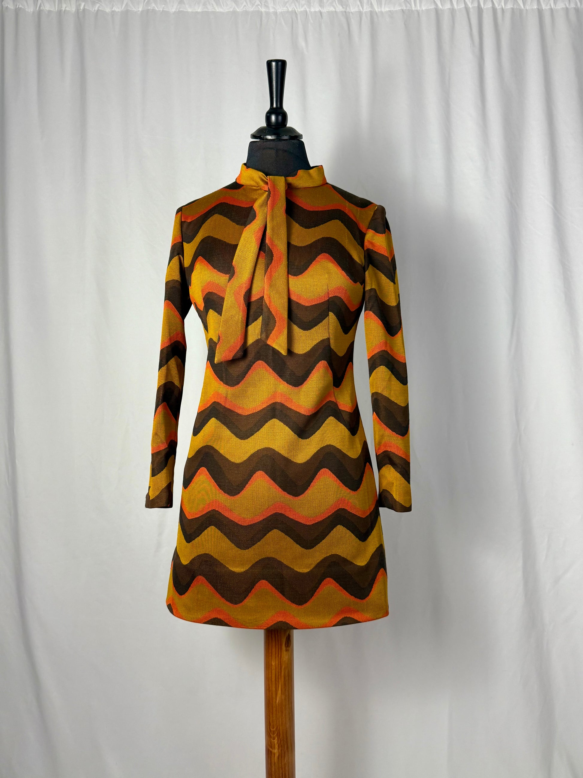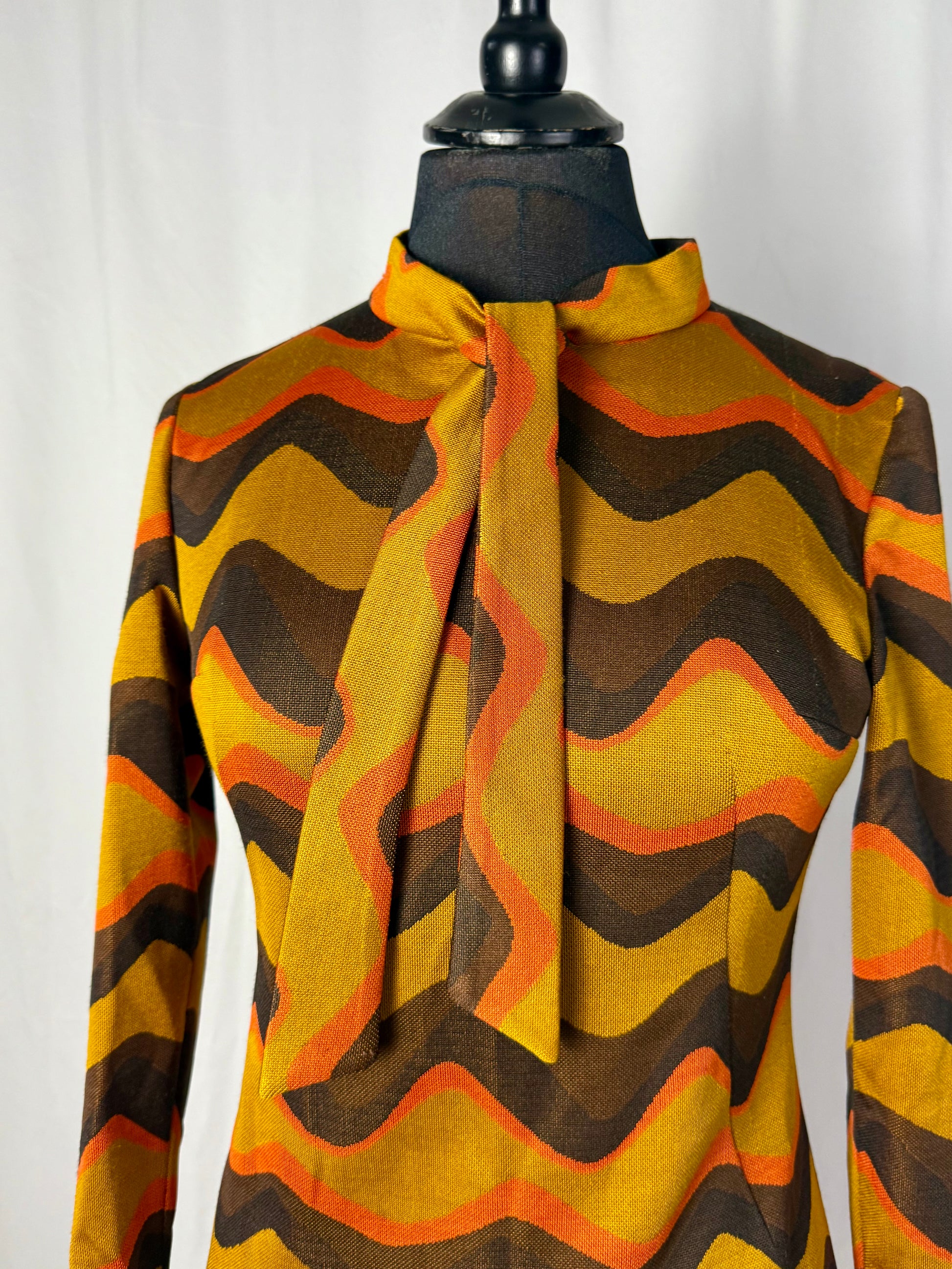 Un mini-dress a manica lunga con collo alto morbido e fiocco laterale. Il tessuto presenta una fantasia a onde in tonalità marrone, senape, arancio e rosso, tipica delle stampe psichedeliche della seconda metà degli anni ’60. Energico e giocoso, emana un forte spirito pop e audace.