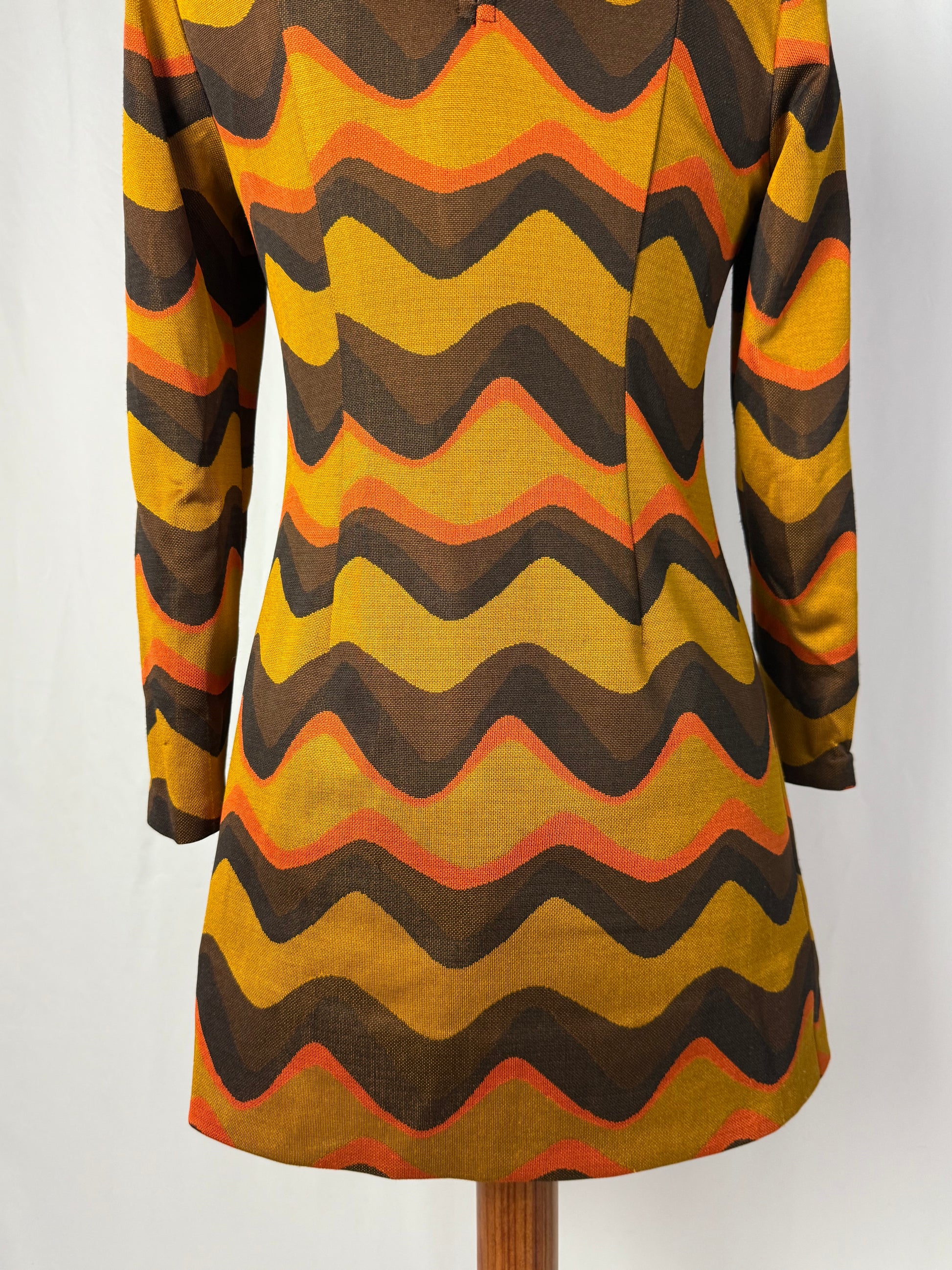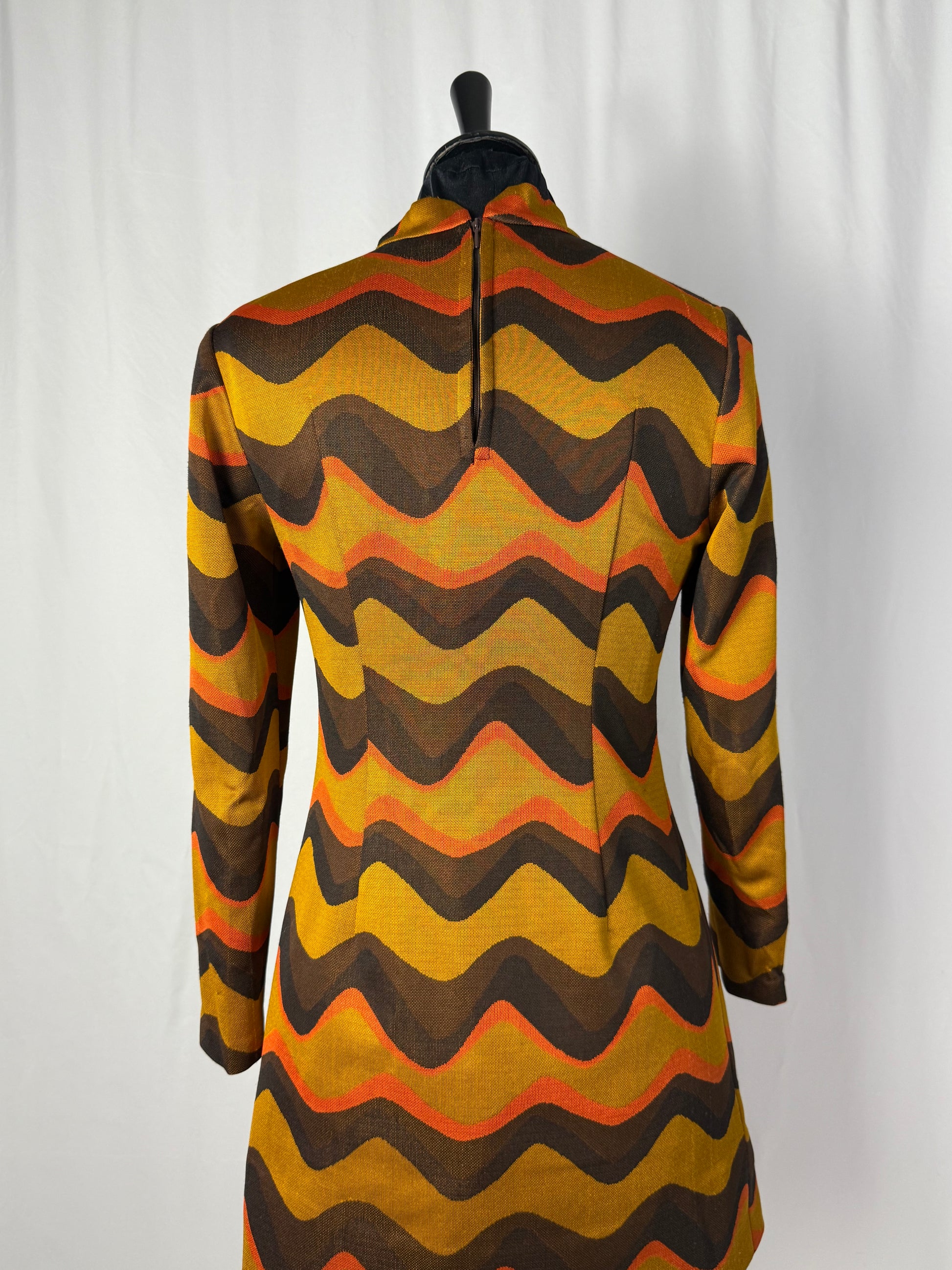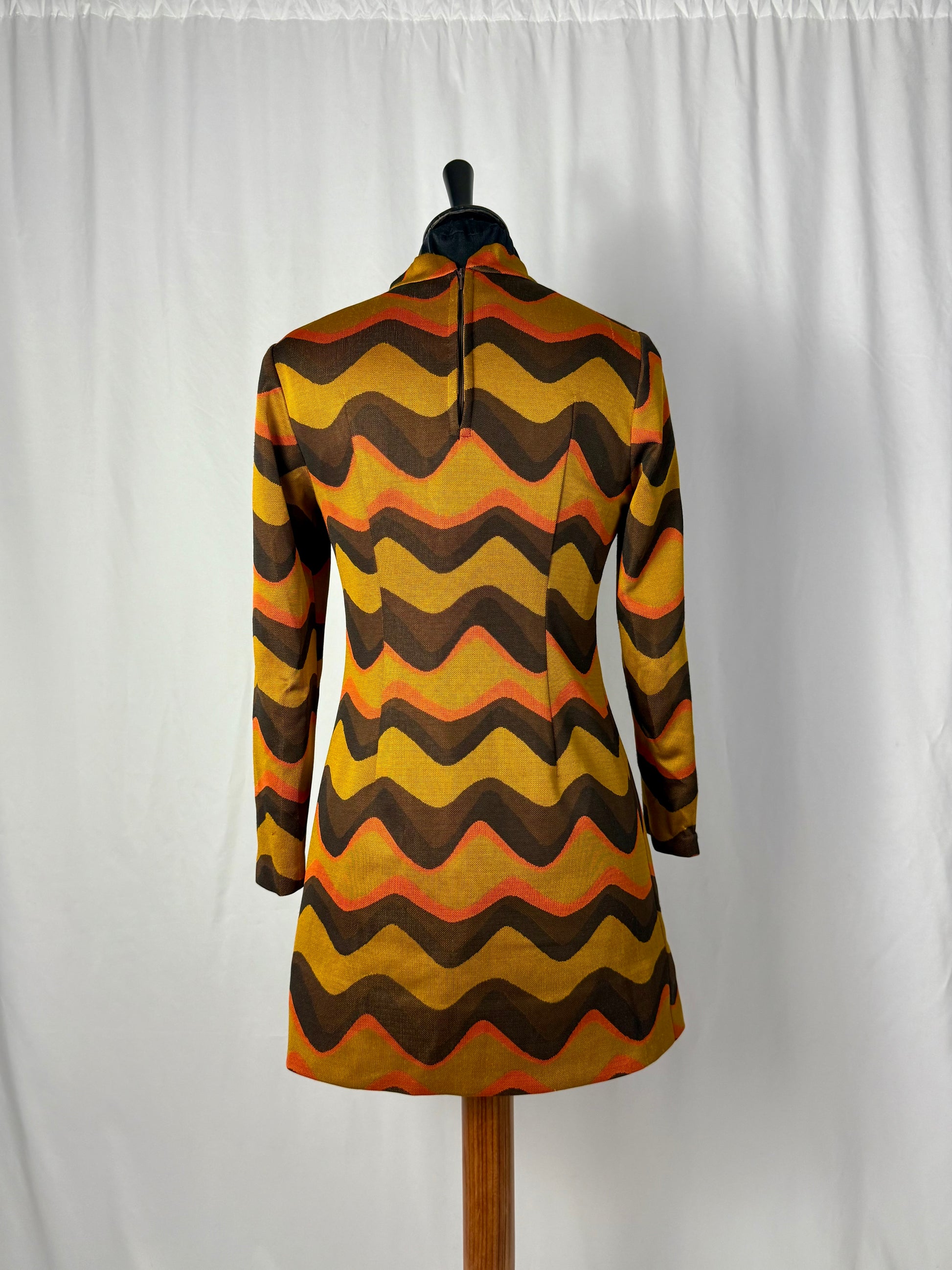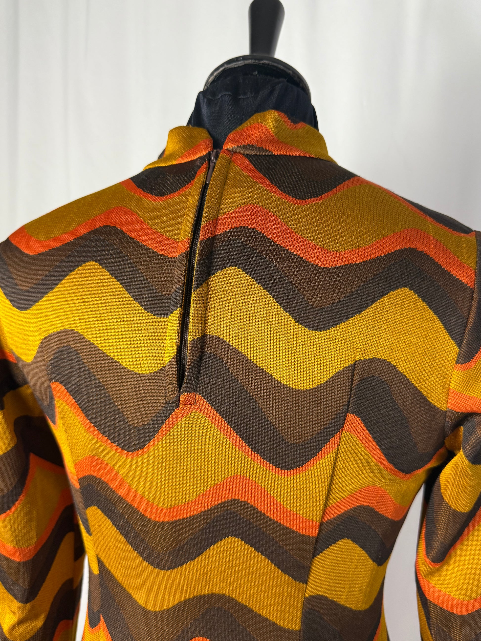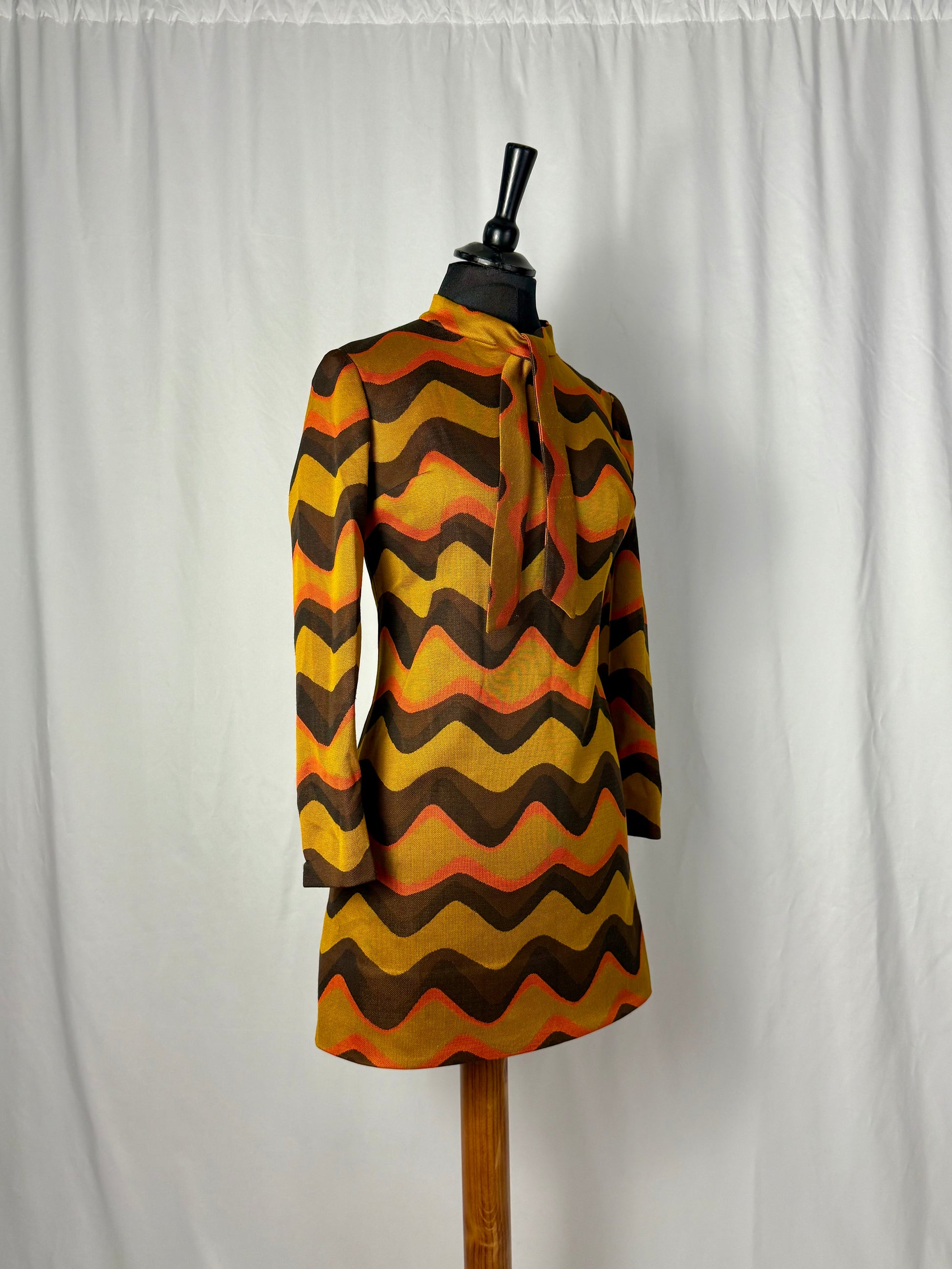 Un mini-dress a manica lunga con collo alto morbido e fiocco laterale. Il tessuto presenta una fantasia a onde in tonalità marrone, senape, arancio e rosso, tipica delle stampe psichedeliche della seconda metà degli anni ’60. Energico e giocoso, emana un forte spirito pop e audace.