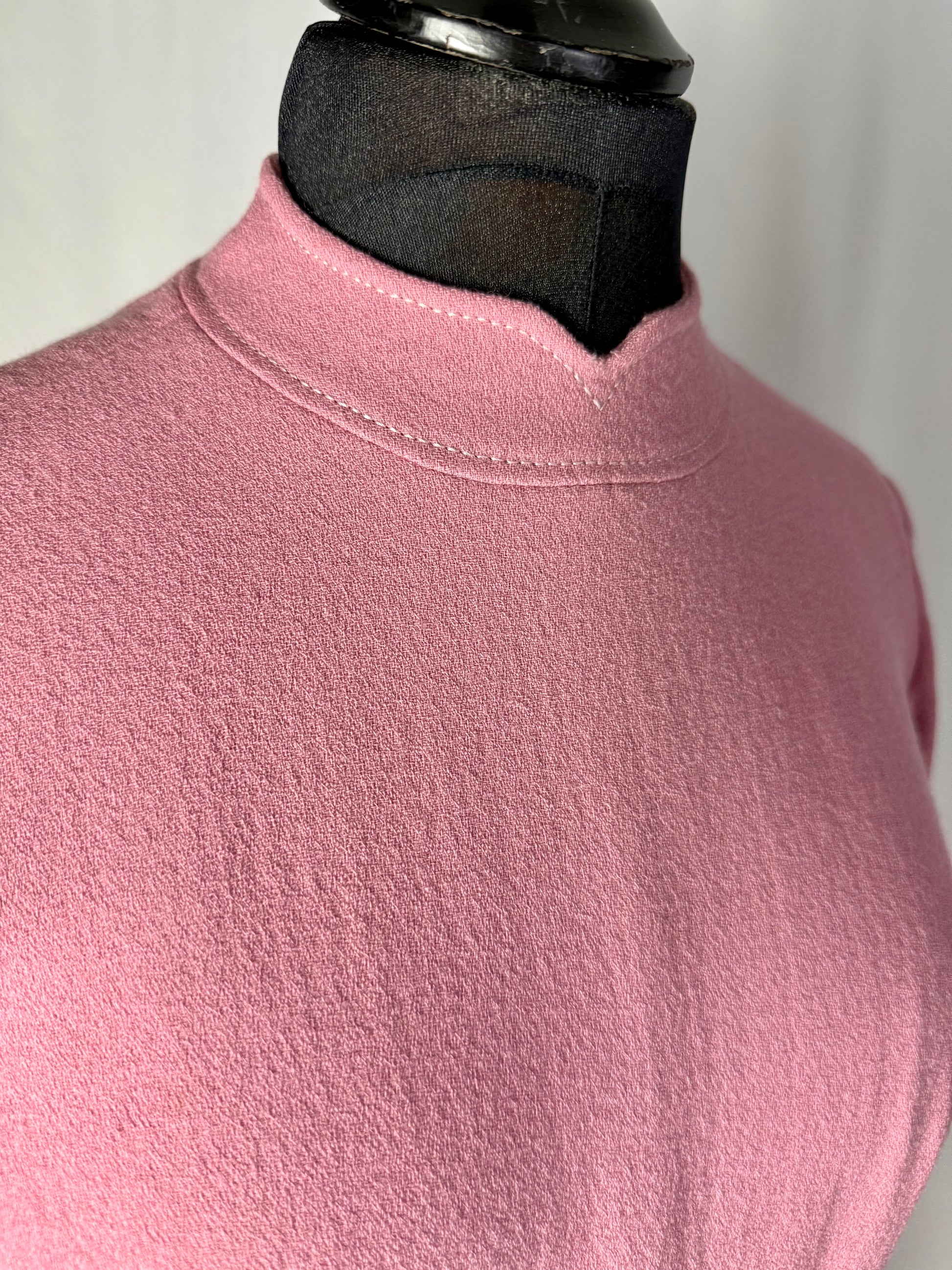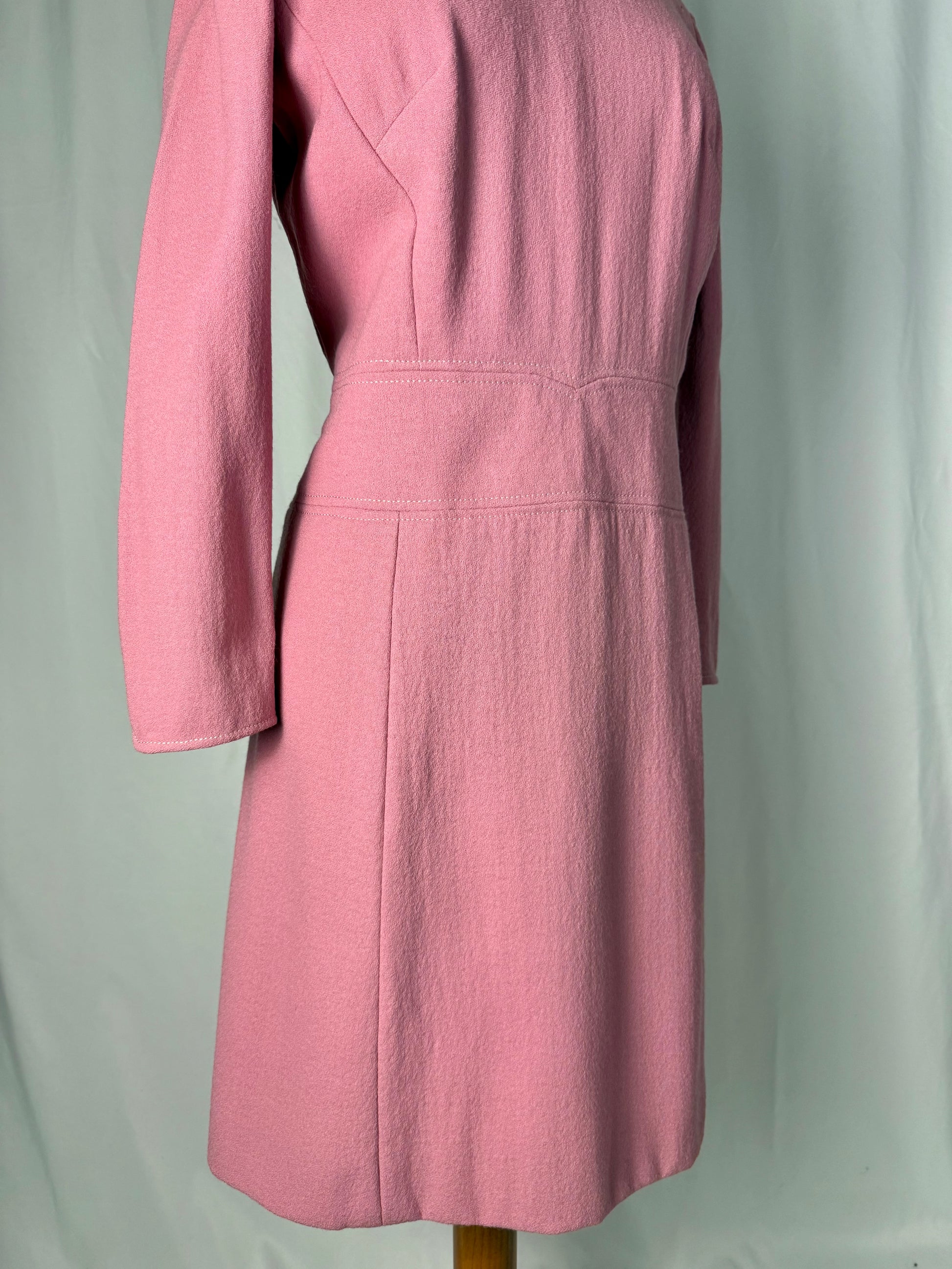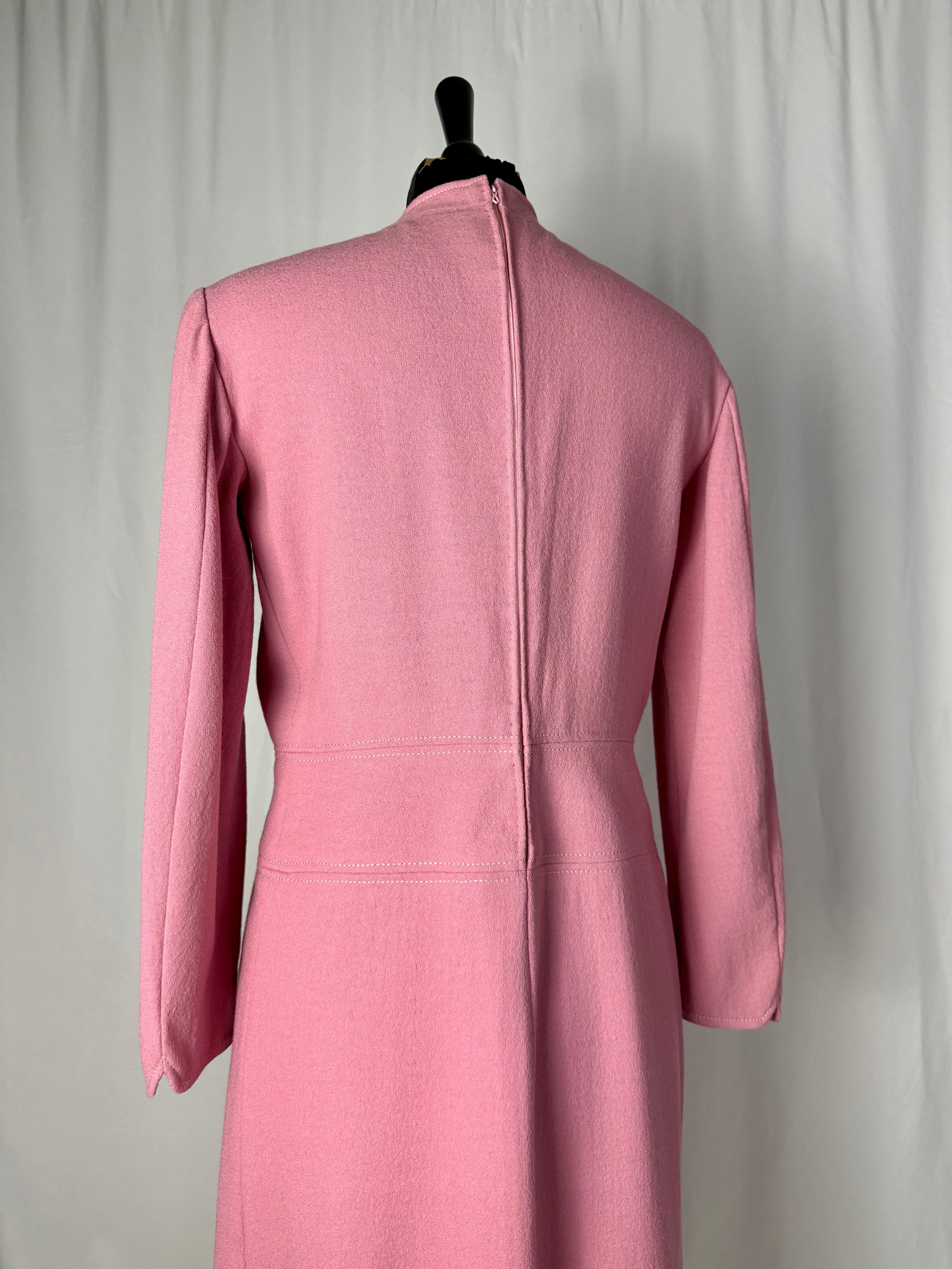 Un vestito in lana dalla linea svasata a trapezio, tipica degli anni ’60 e simbolo dell’ estetica più moderna della decade. Girocollo accennato, maniche lunghe e colore rosa pastello. Minimalista ma raffinato, rappresenta l’eleganza sobria e innovativa di quel decennio.