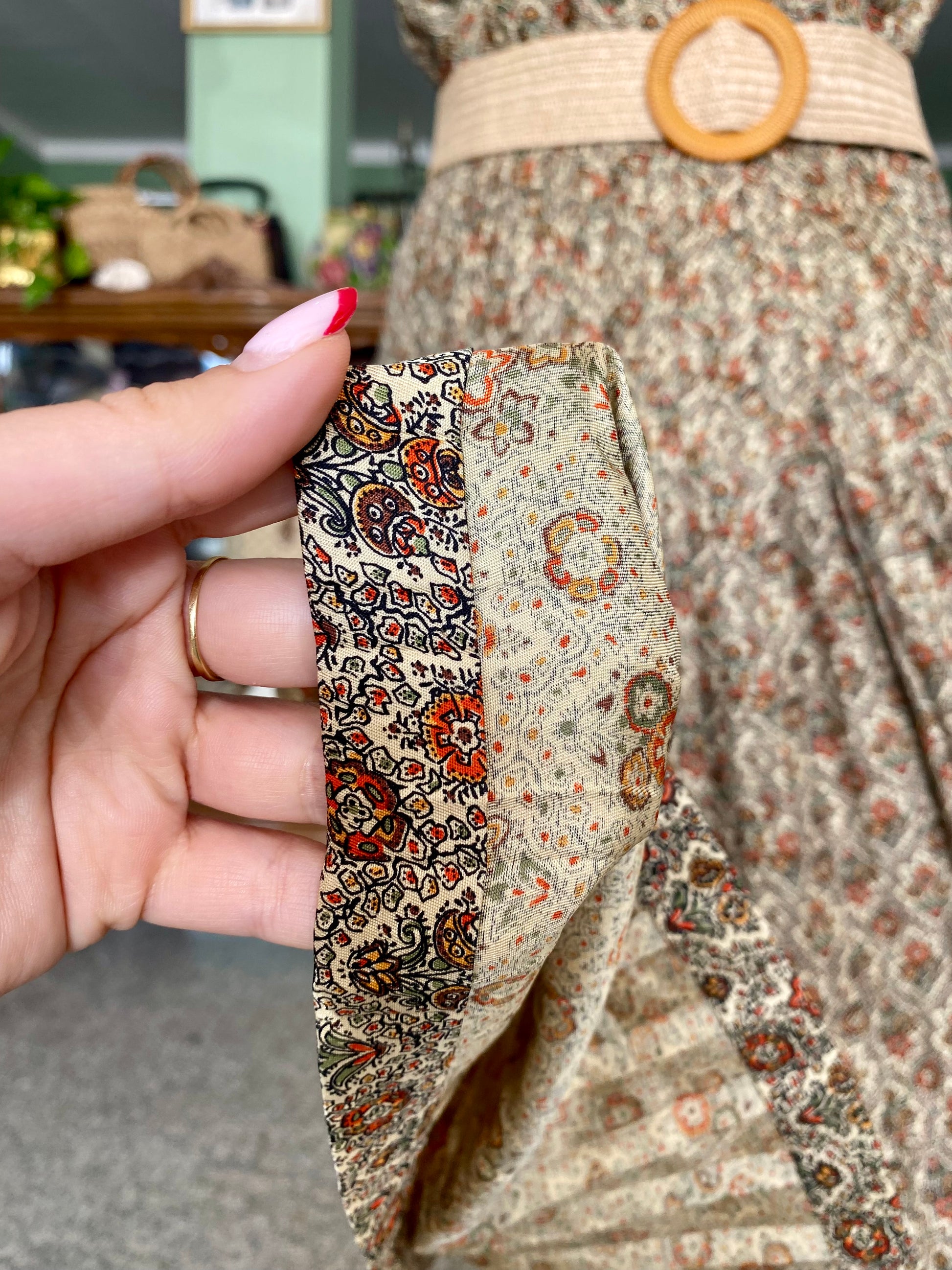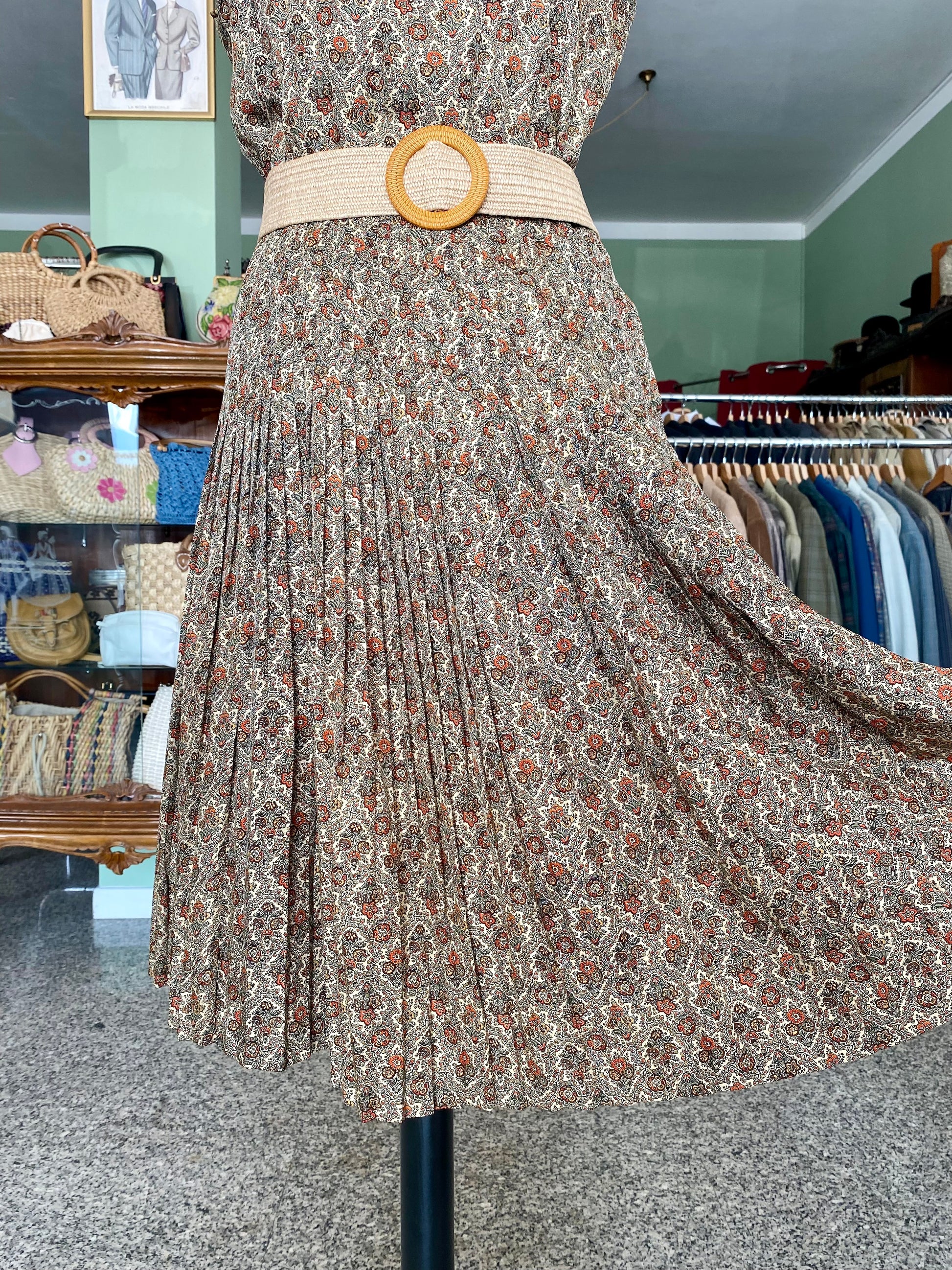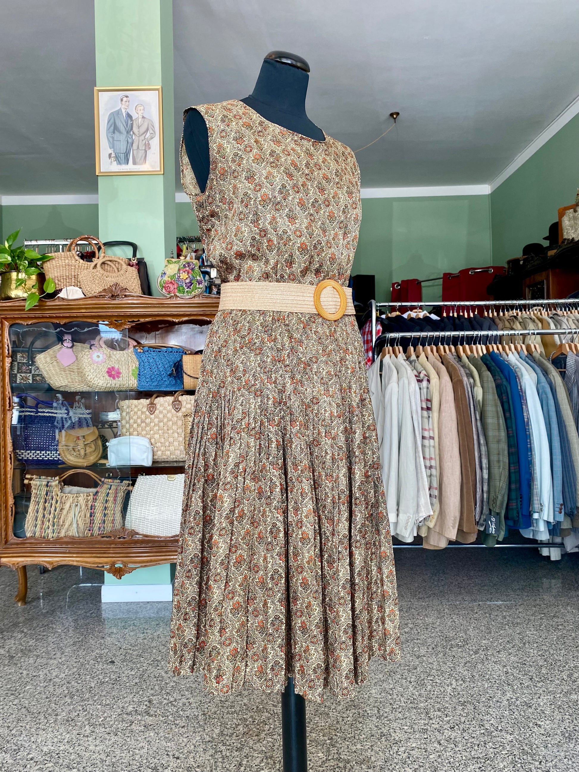 Abito anni '60 autentico pezzo vintage dal taglio classico smanicato con corpetto lineare e ampia gonna a pieghe, in un raffinato tessuto fantasia floreale tono terra su fondo beige. Il motivo ricorda i tappeti persiani, con una stampa dettagliata che impreziosisce ulteriormente la sua silhouette.