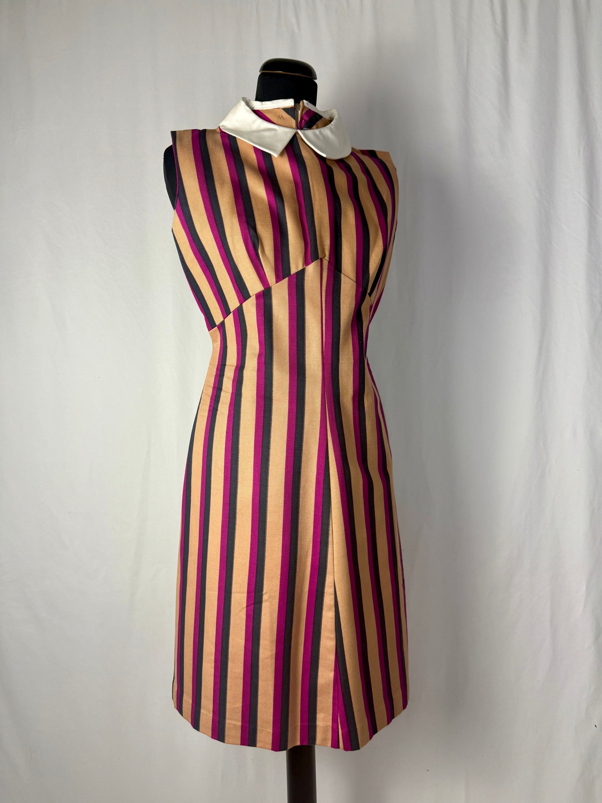 Abito anni ’60 sartoriale in pura lana, caratterizzato da un’elegante linea dritta e mininale. Il motivo a righe verticali nei toni del fucsia, cammello e nero slancia la figura, mentre il colletto bianco a contrasto aggiunge un tocco grafico tipico dello stile mod.