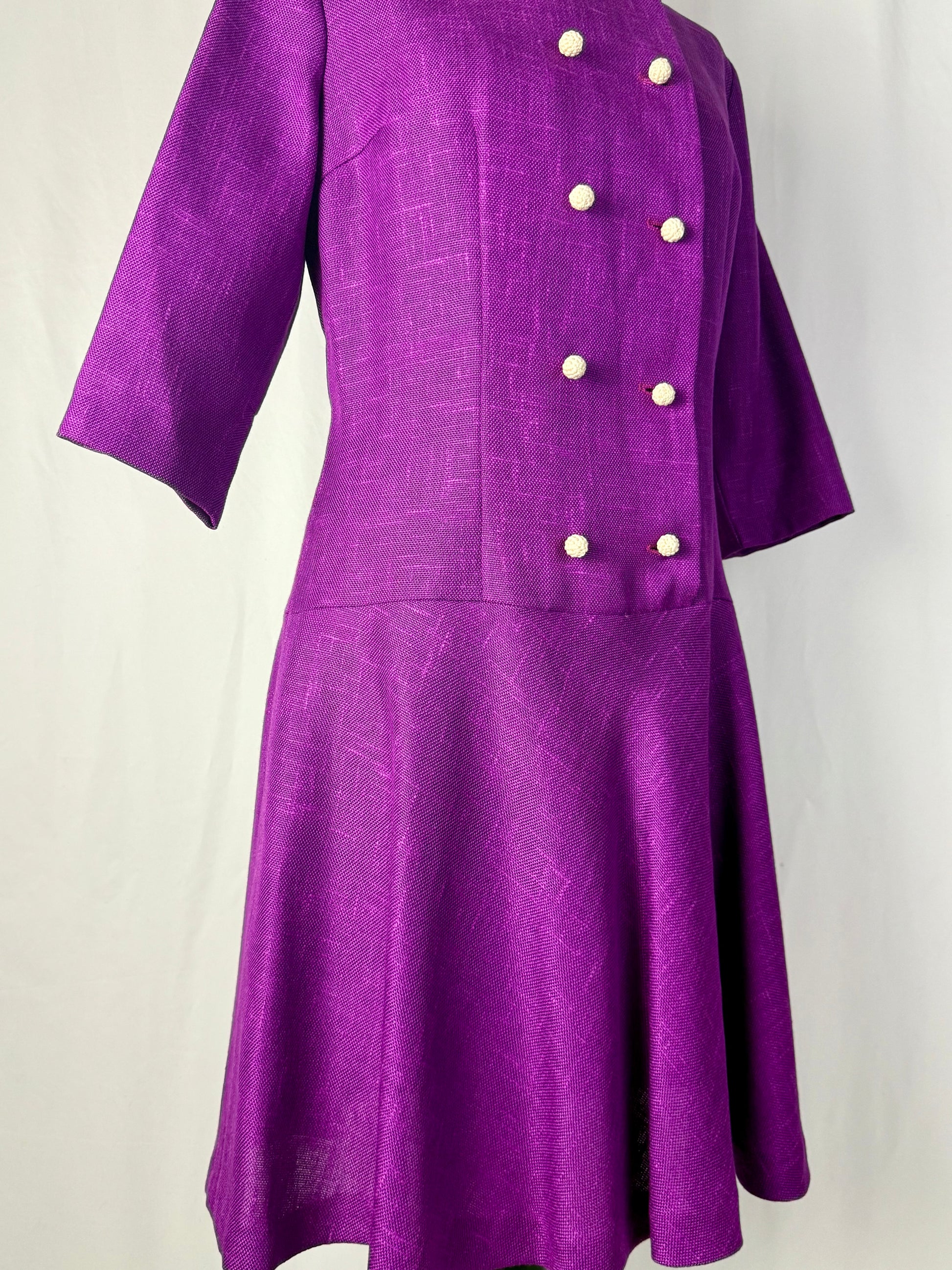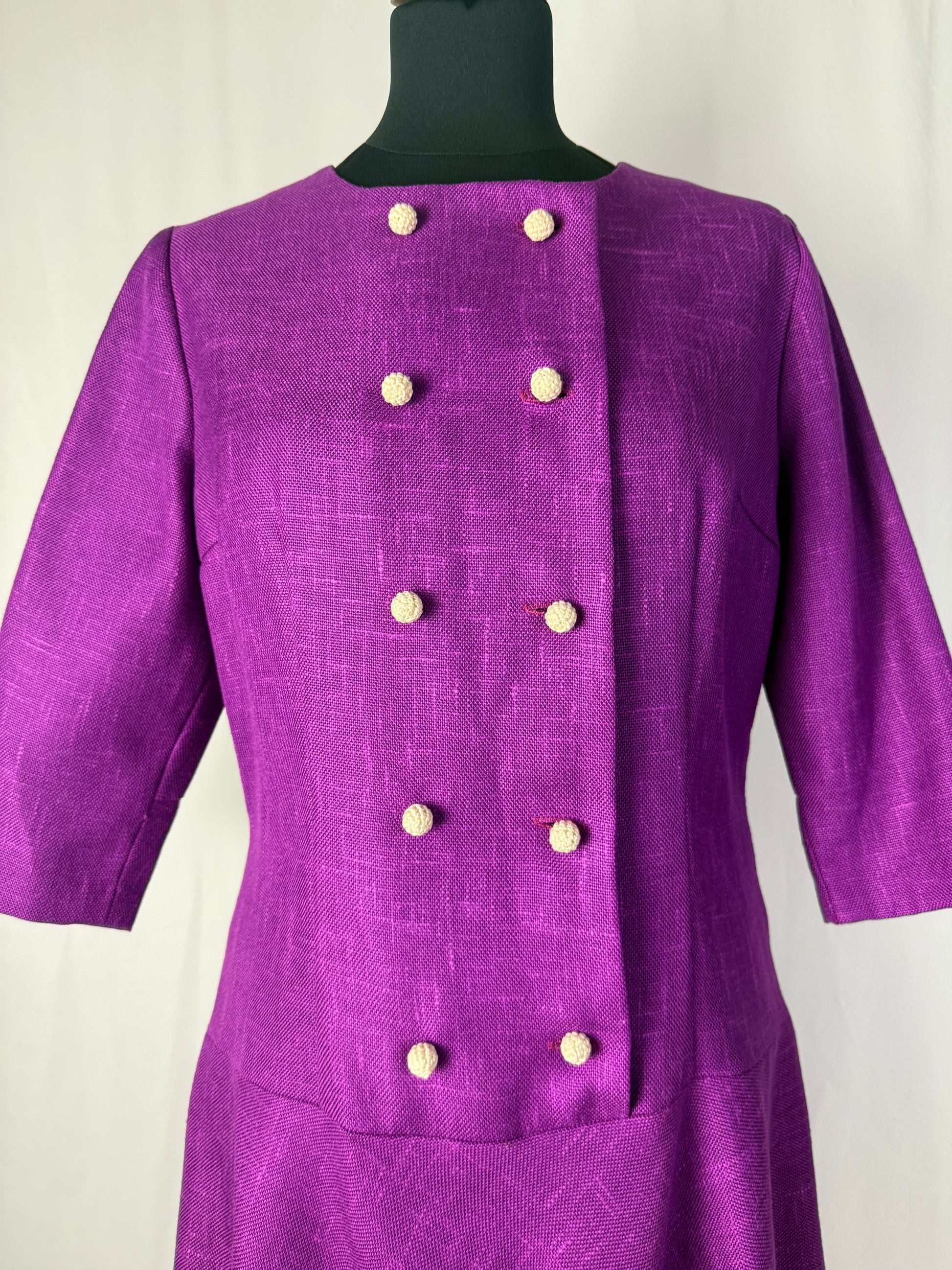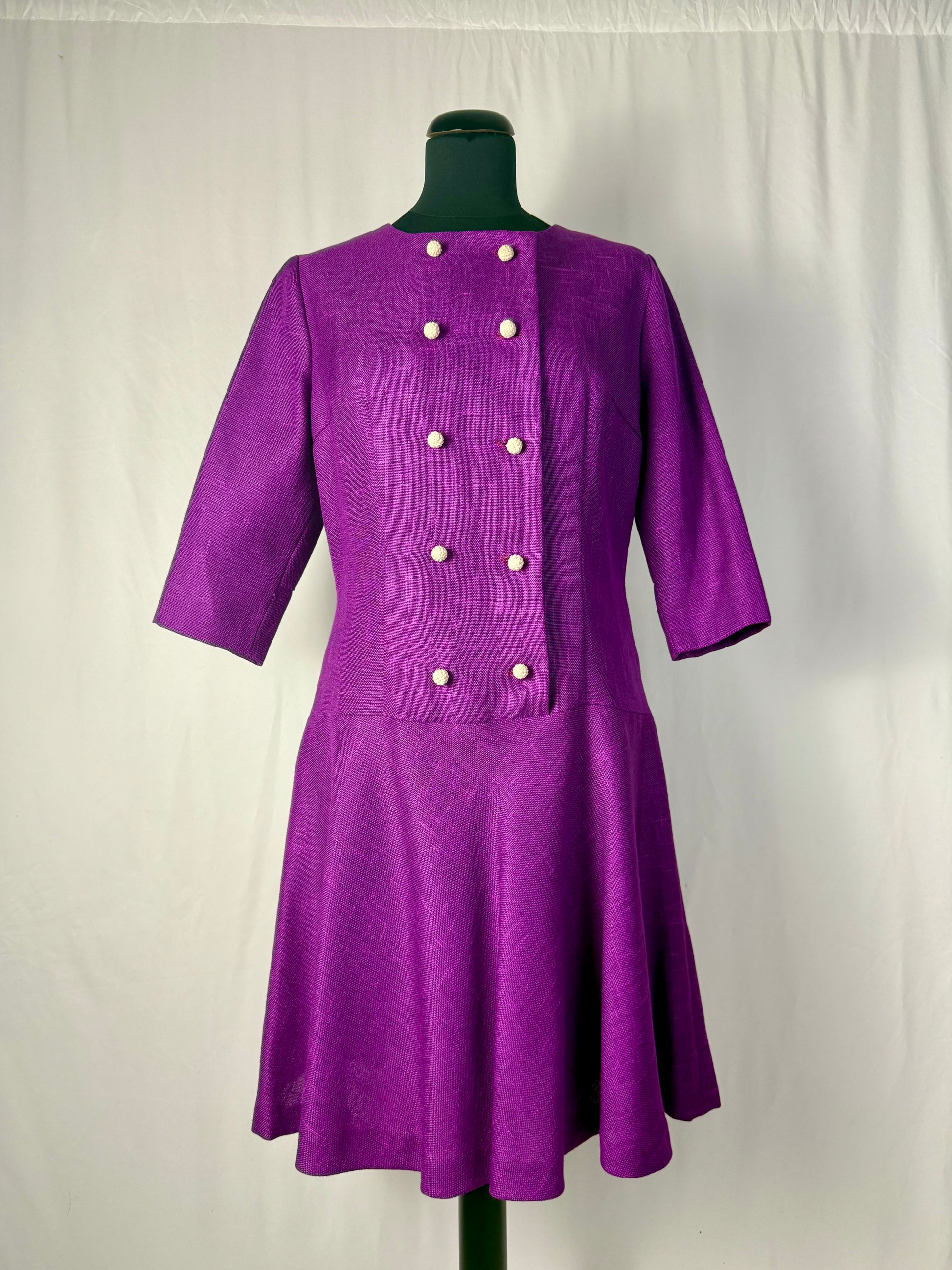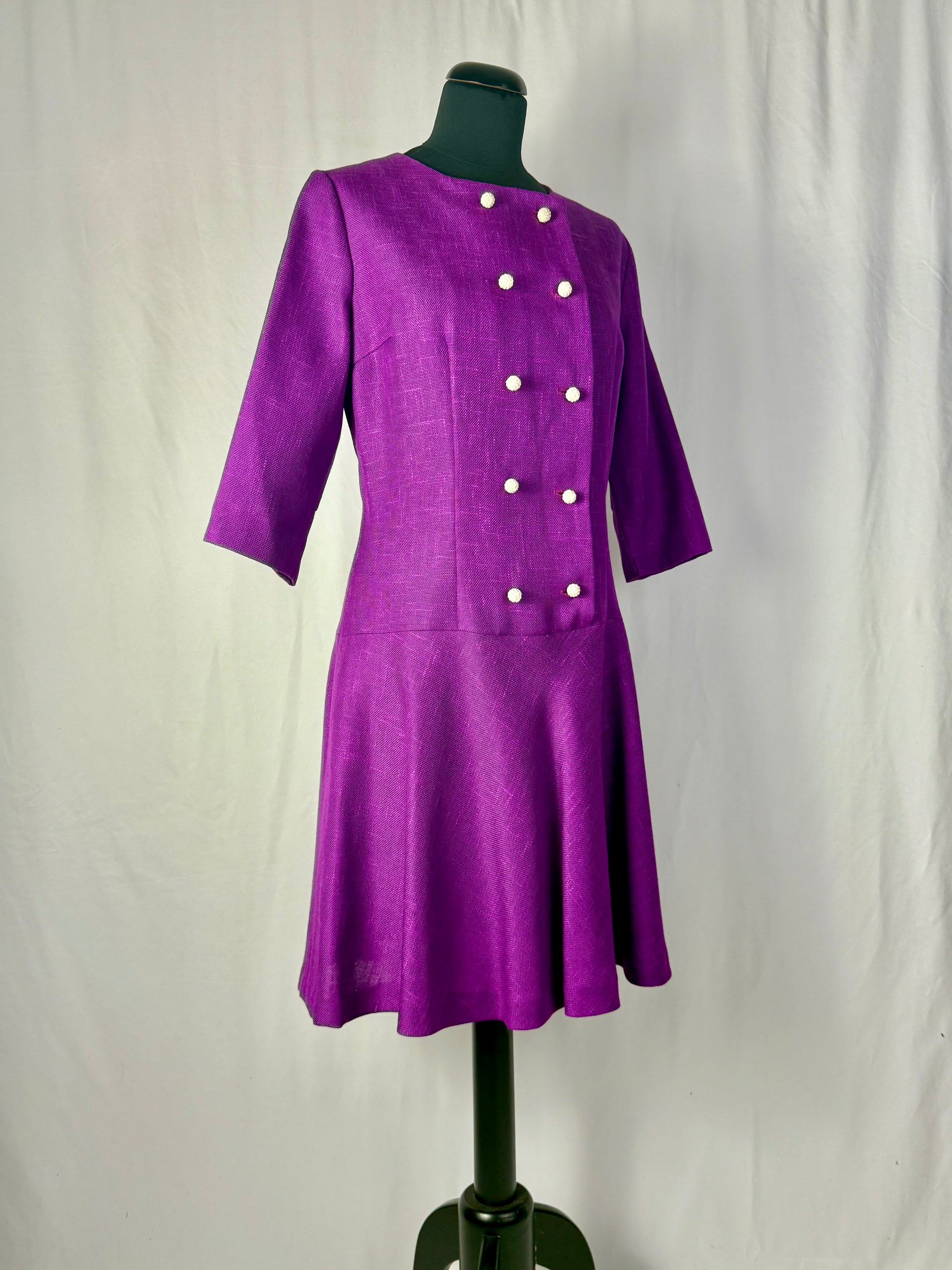 Abito anni ’60 in tessuto misto lana color viola ciclamino, caratterizzato da una linea leggermente svasata con taglio in vita bassa e maniche a tre quarti. Lo scollo rotondo e la doppia fila di bottoni rivestiti sul davanti donano equilibrio e raffinatezza, richiamando lo stile elegante e bon ton tipico del decennio.