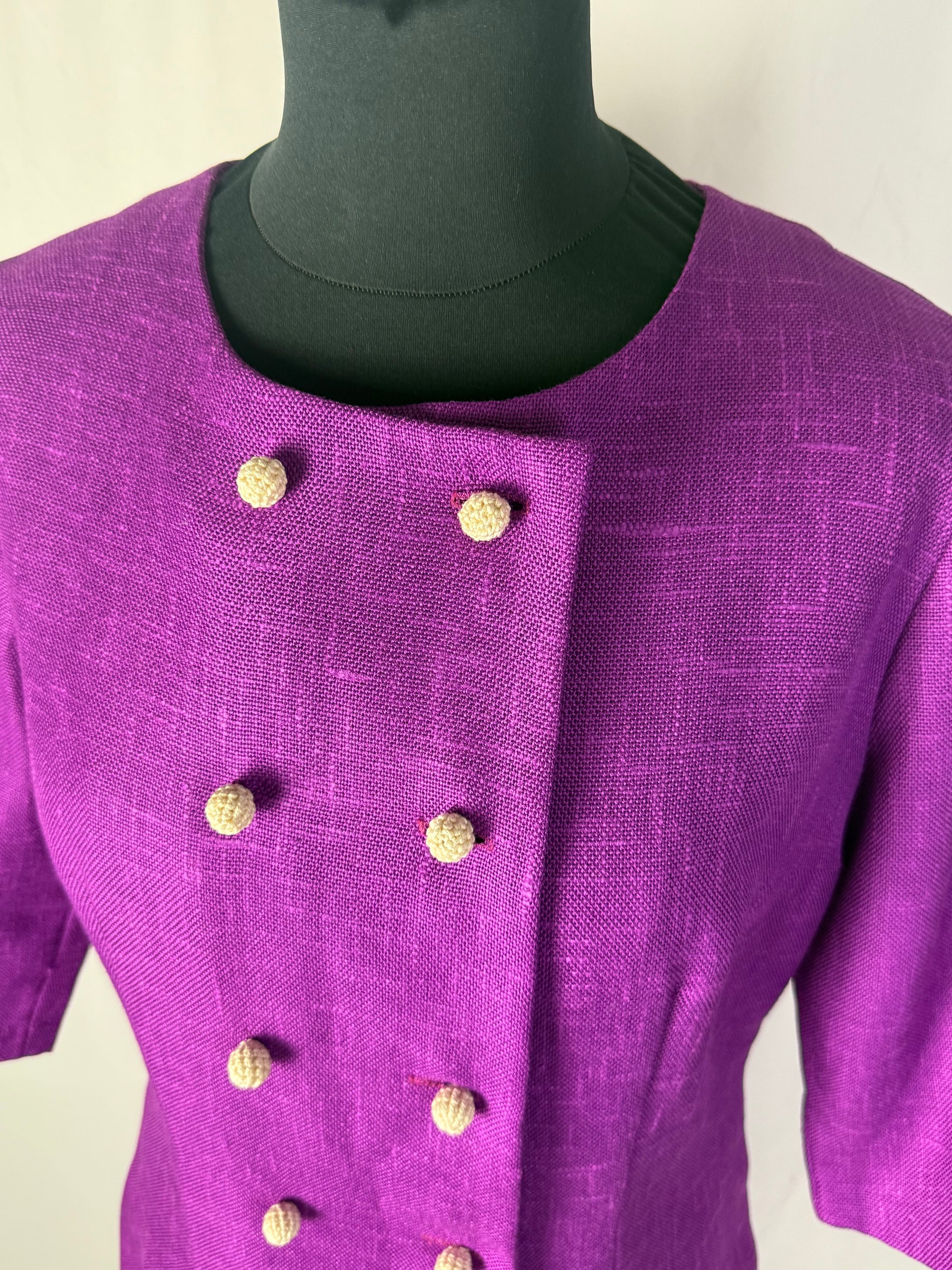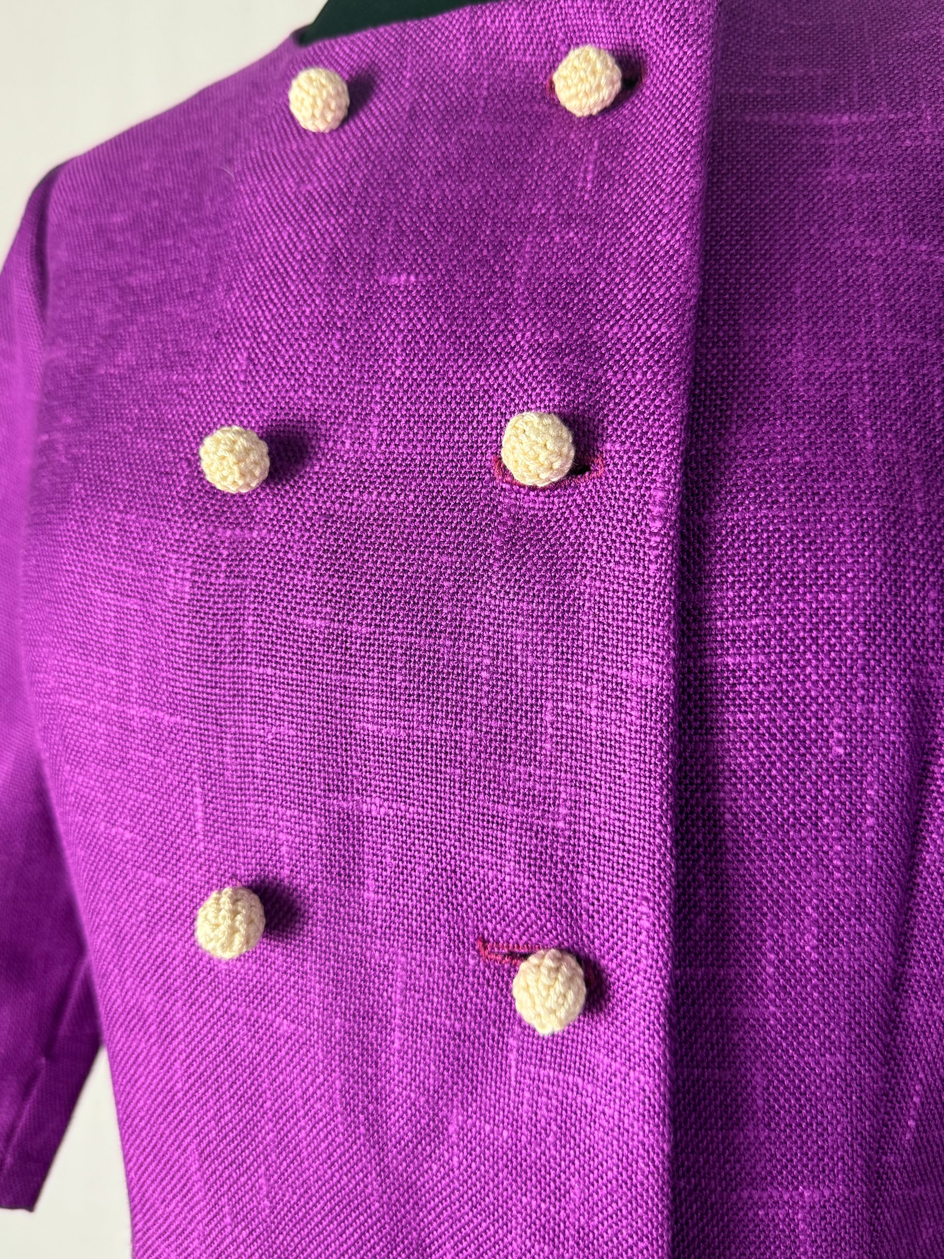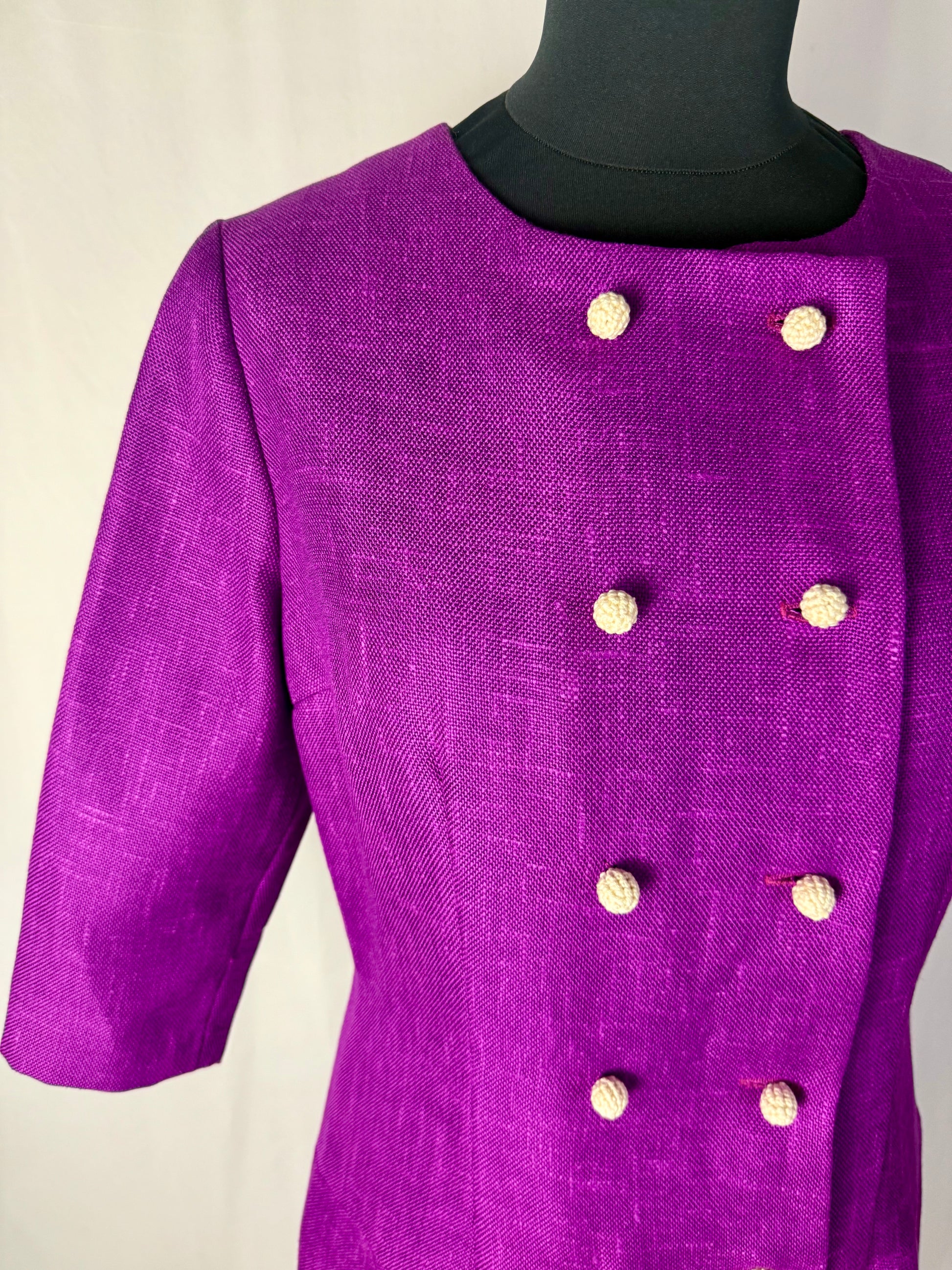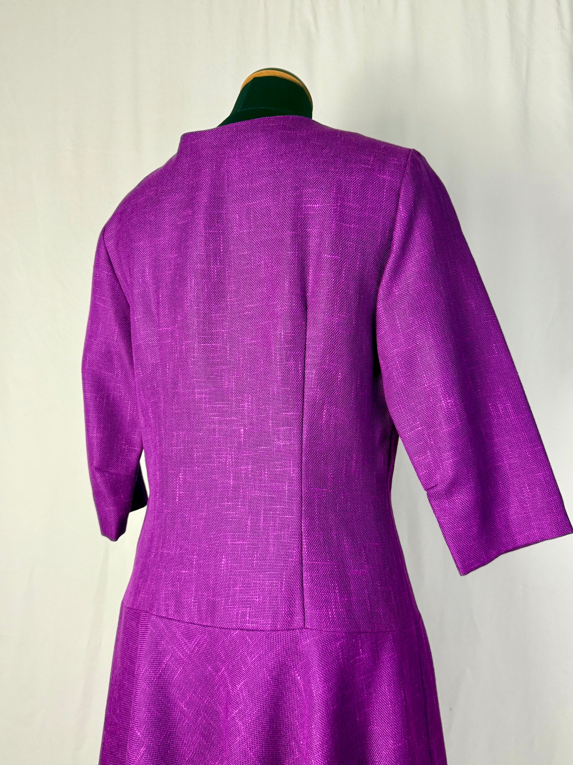 Abito anni ’60 in tessuto misto lana color viola ciclamino, caratterizzato da una linea leggermente svasata con taglio in vita bassa e maniche a tre quarti. Lo scollo rotondo e la doppia fila di bottoni rivestiti sul davanti donano equilibrio e raffinatezza, richiamando lo stile elegante e bon ton tipico del decennio.