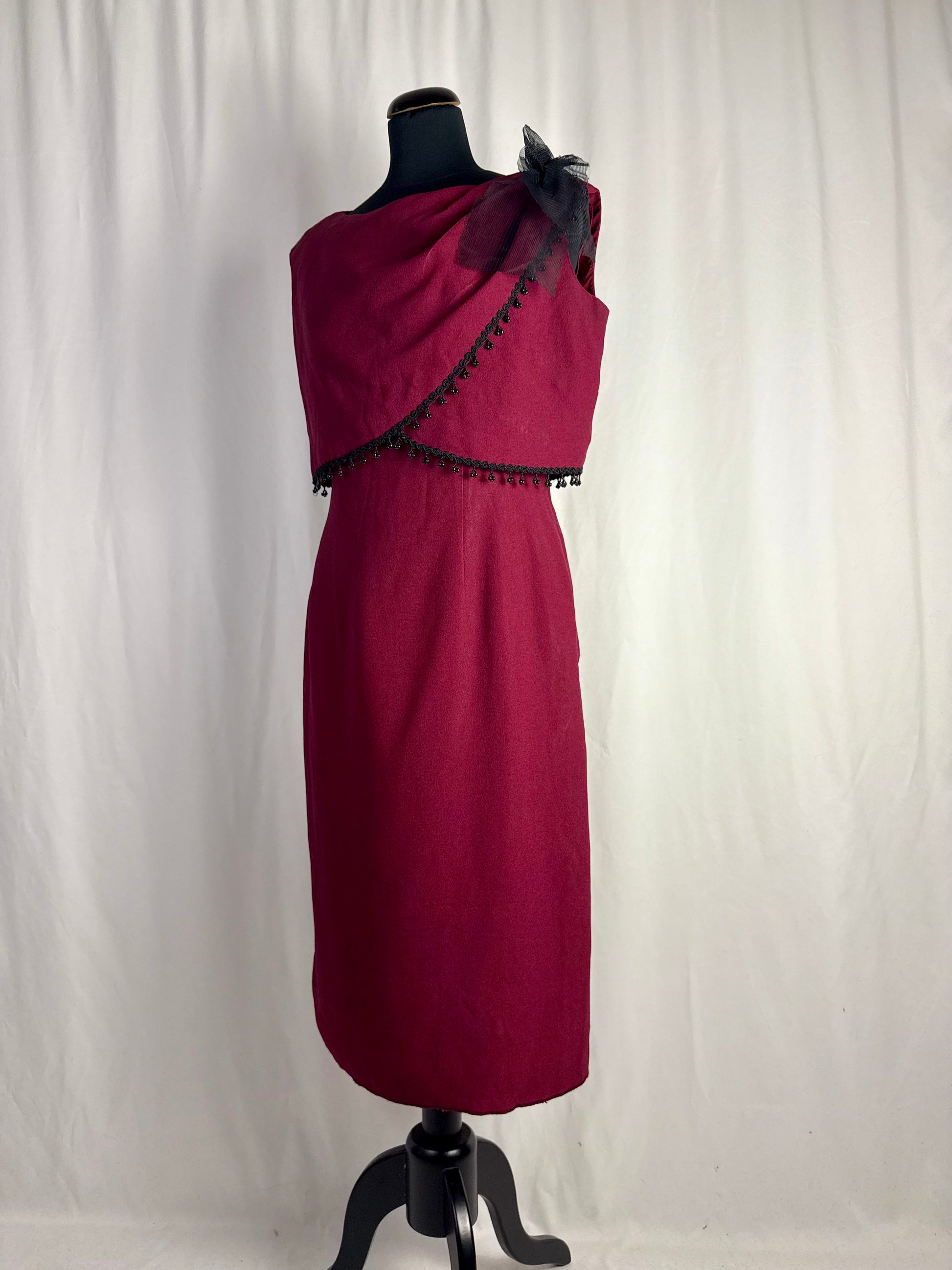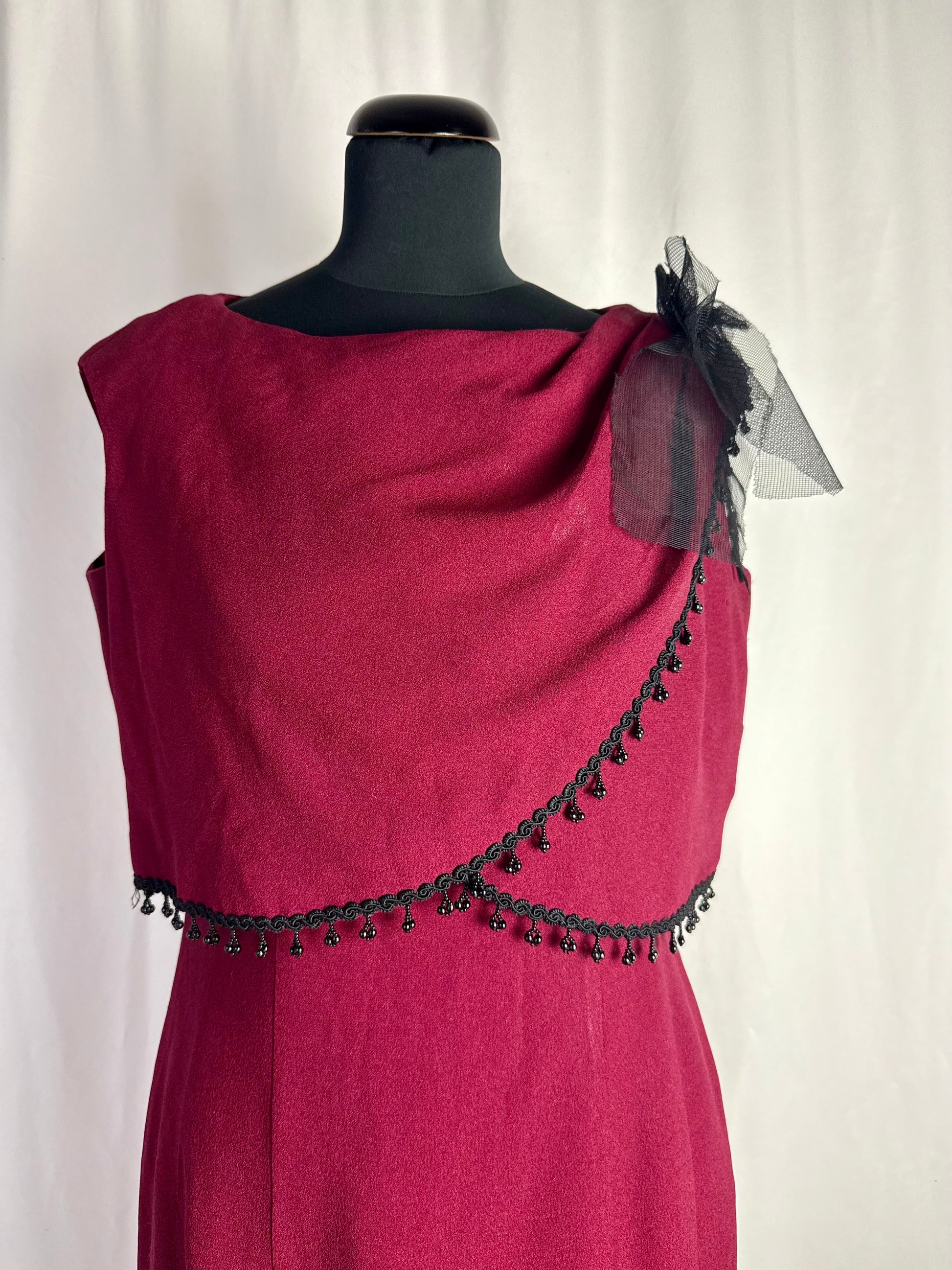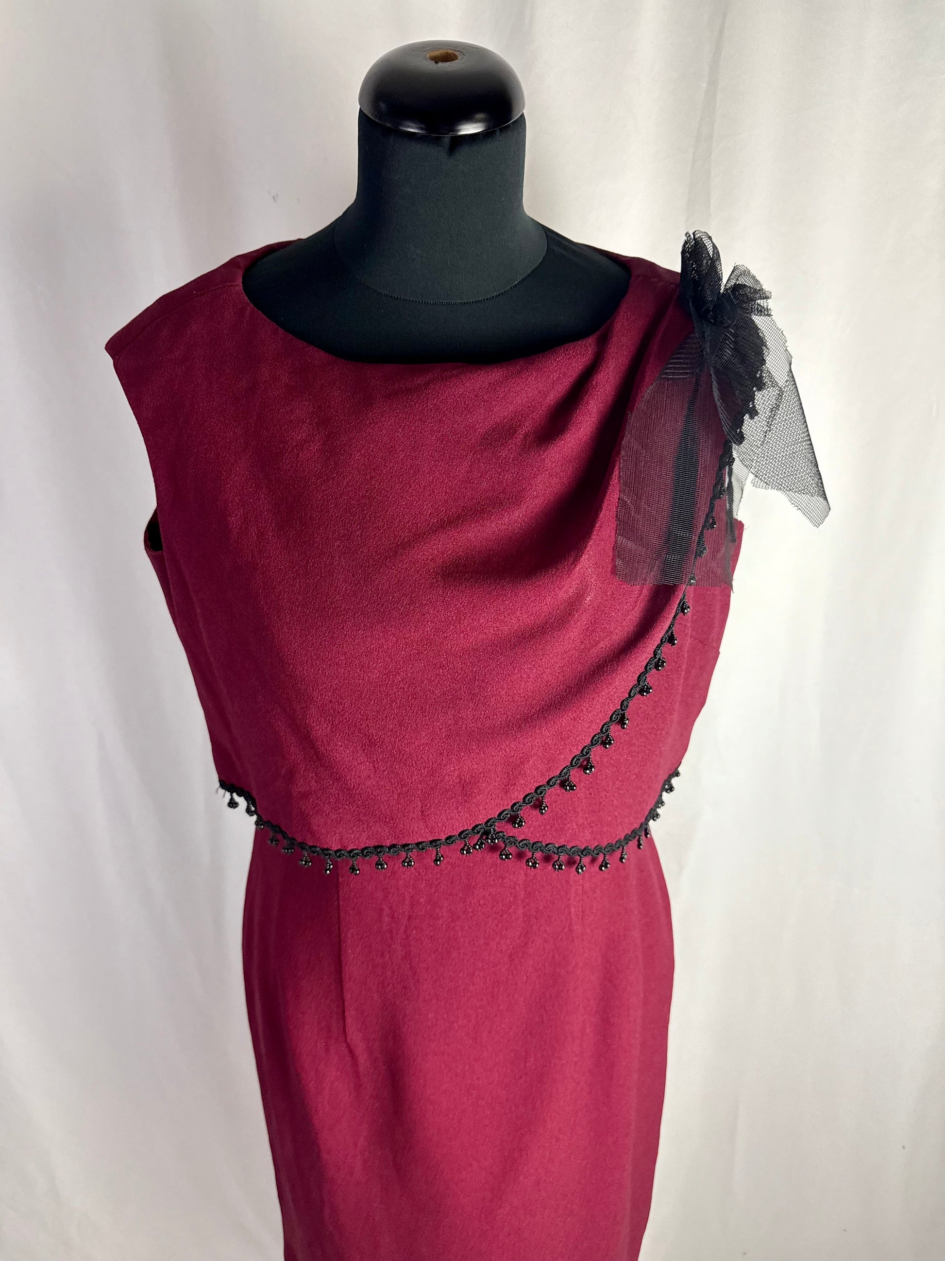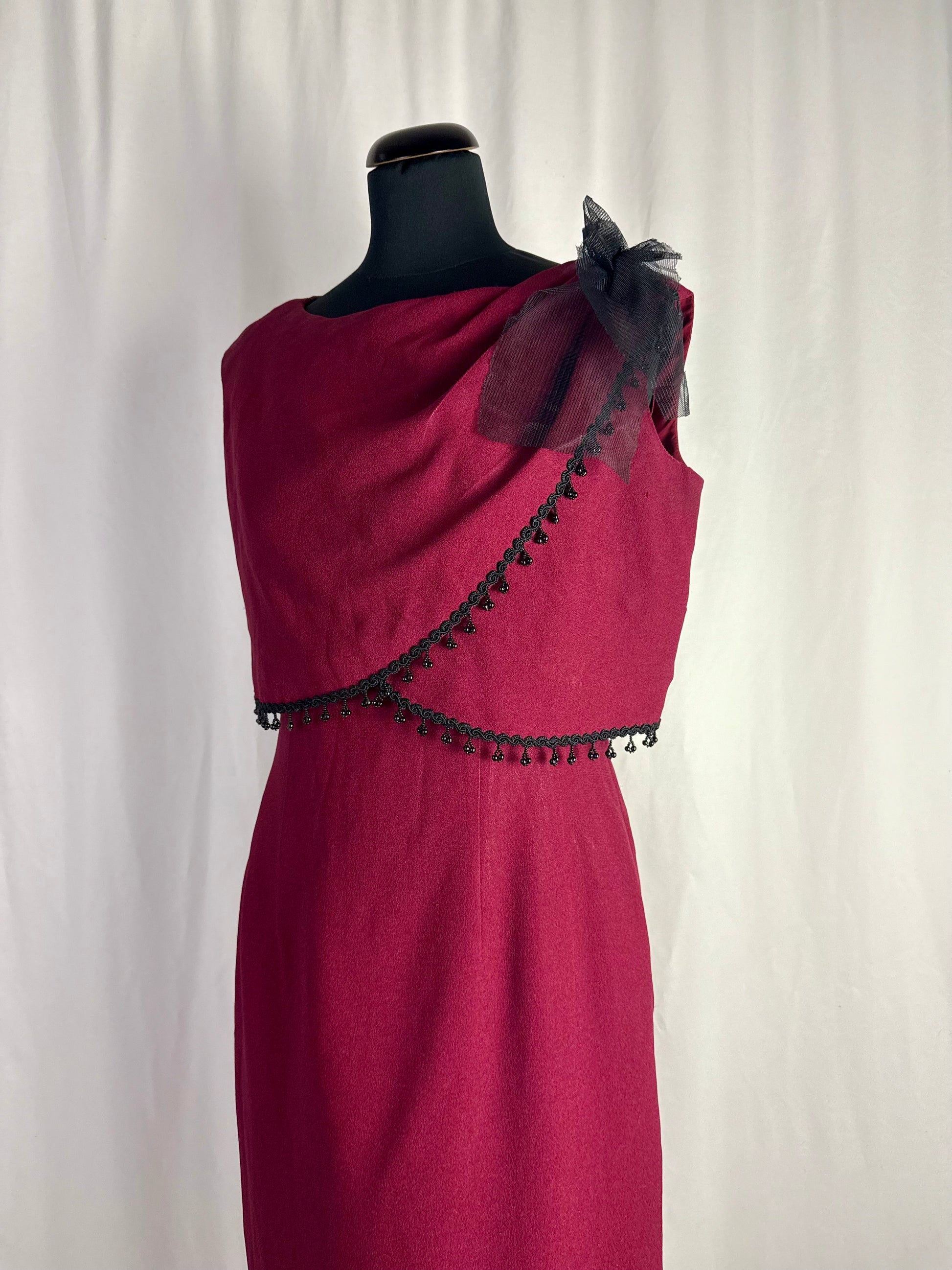 Abito anni ‘60 color vinaccia con sopragonna drappeggiata asimmetrica rifinita da passamaneria nera con gocce applicate. Spalla decorata con nodo in tulle nero, scollo morbido e linea elehgante e sfiancata. Tessuto compatto con ottima caduta. Ideale per cerimonie, feste e occasioni speciali.