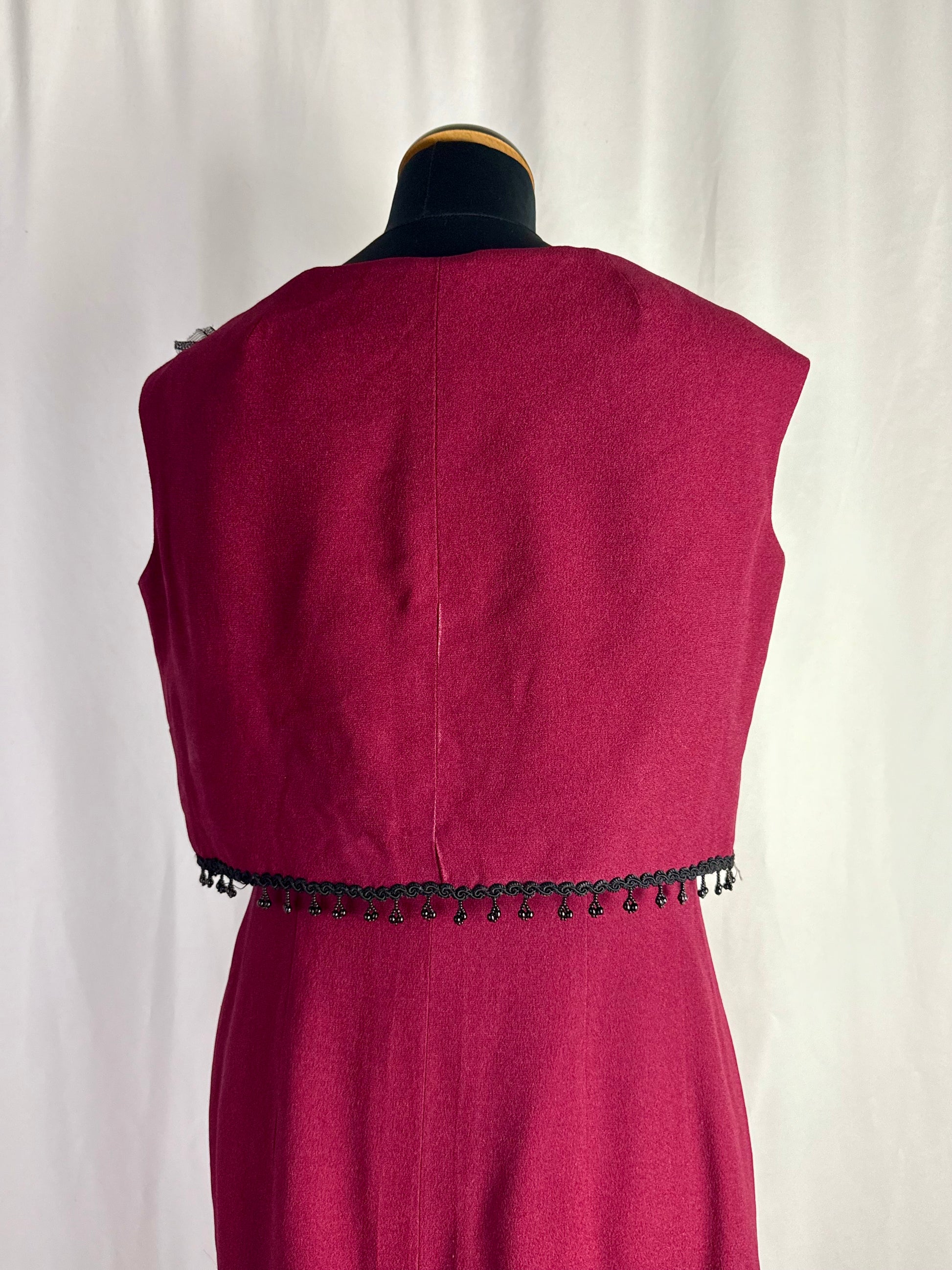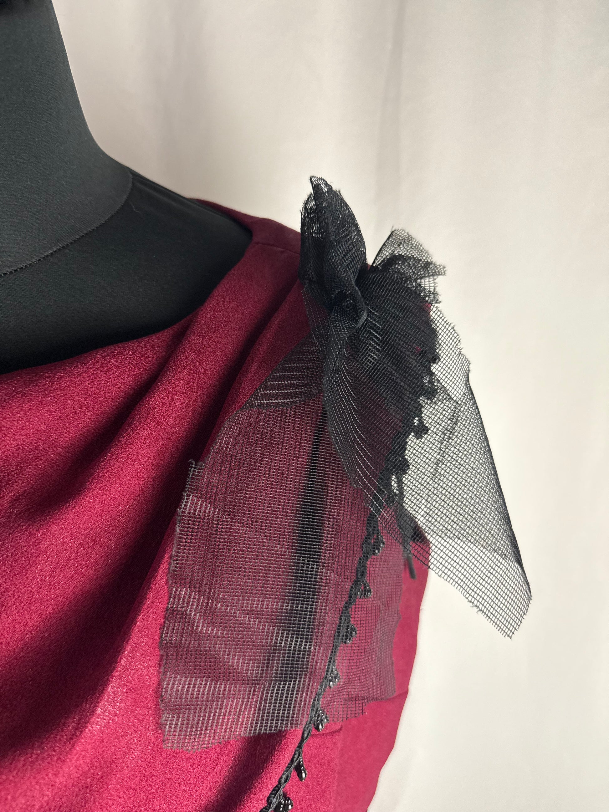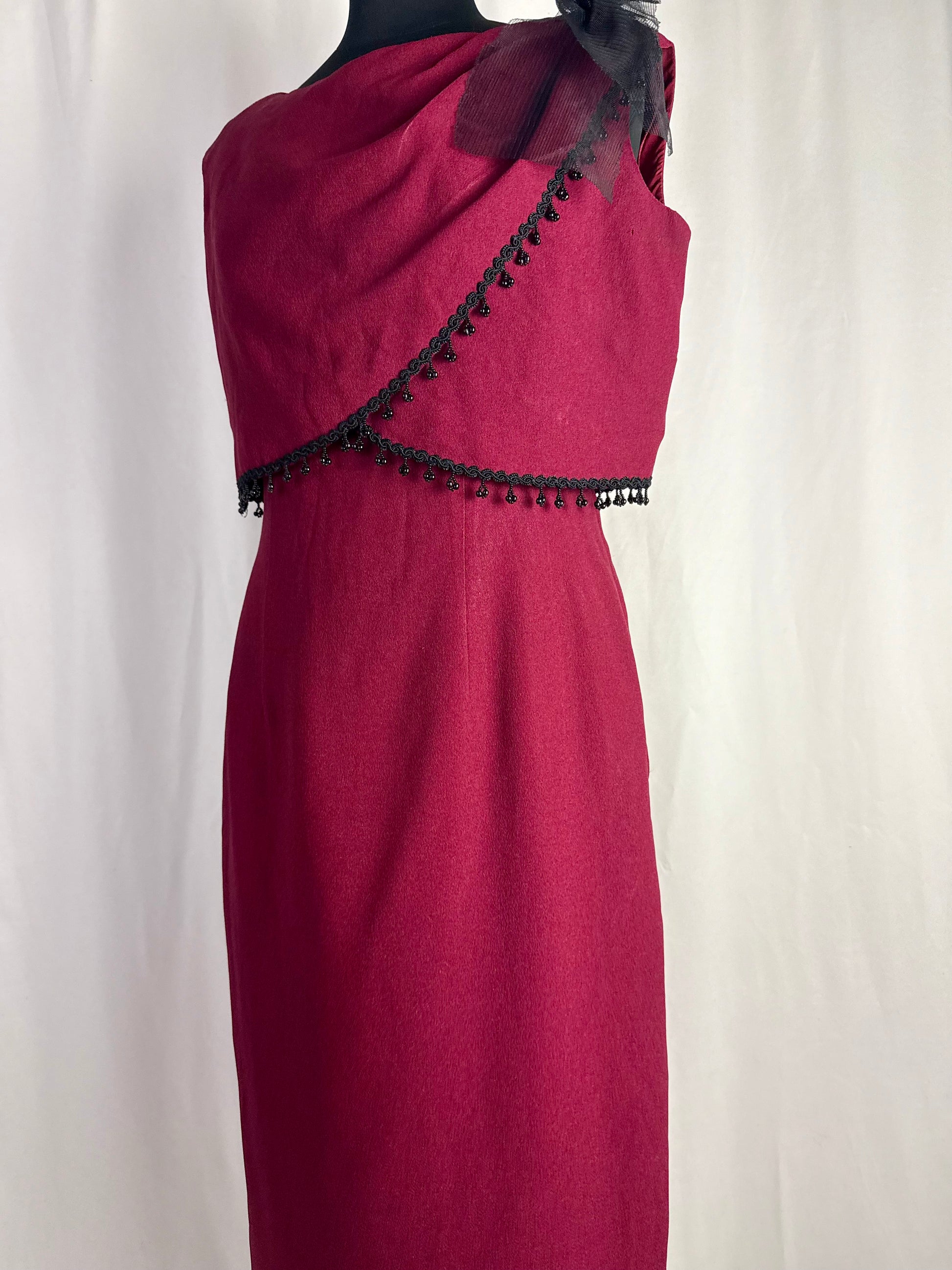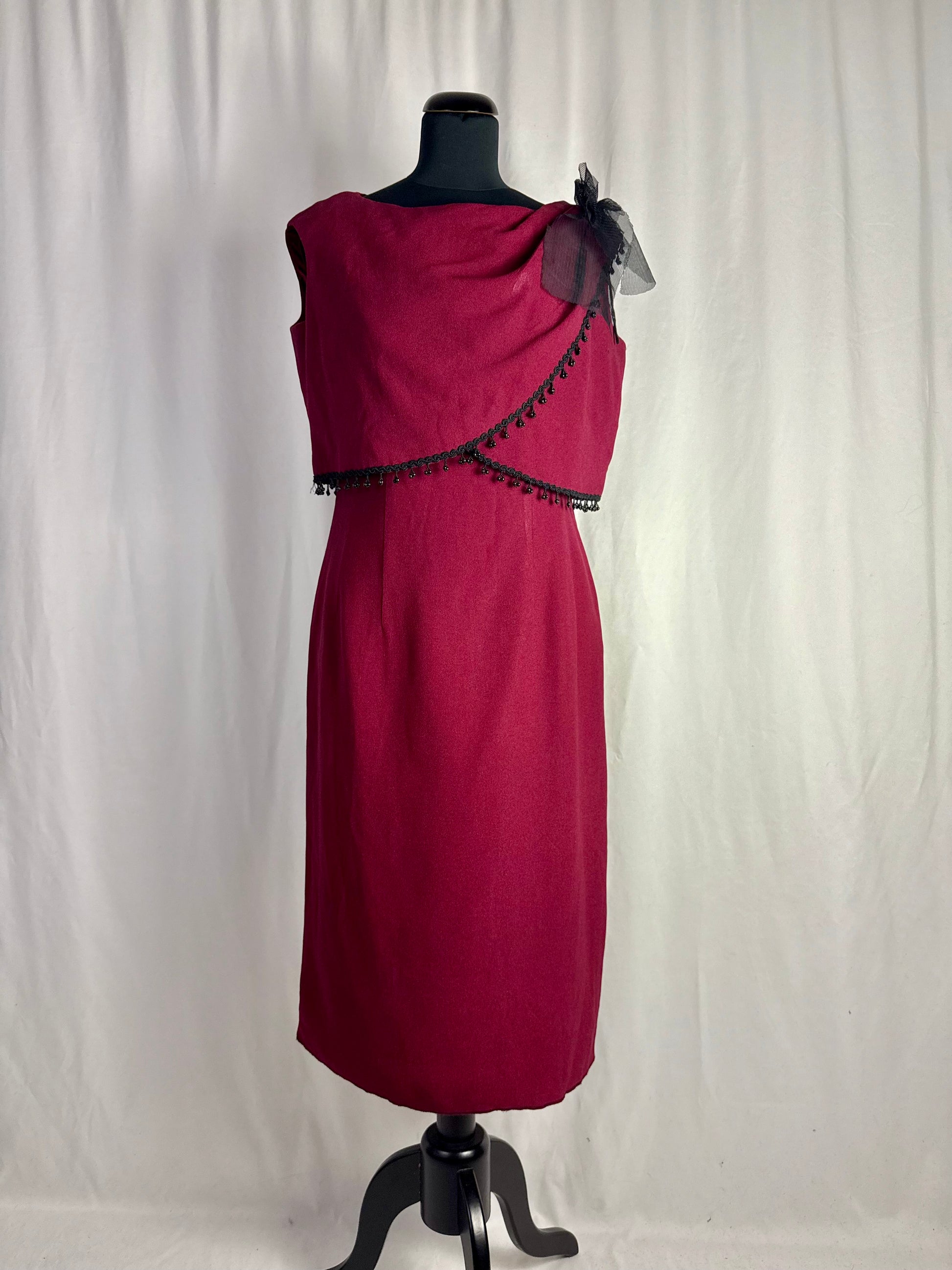 Abito anni ‘60 color vinaccia con sopragonna drappeggiata asimmetrica rifinita da passamaneria nera con gocce applicate. Spalla decorata con nodo in tulle nero, scollo morbido e linea elehgante e sfiancata. Tessuto compatto con ottima caduta. Ideale per cerimonie, feste e occasioni speciali.