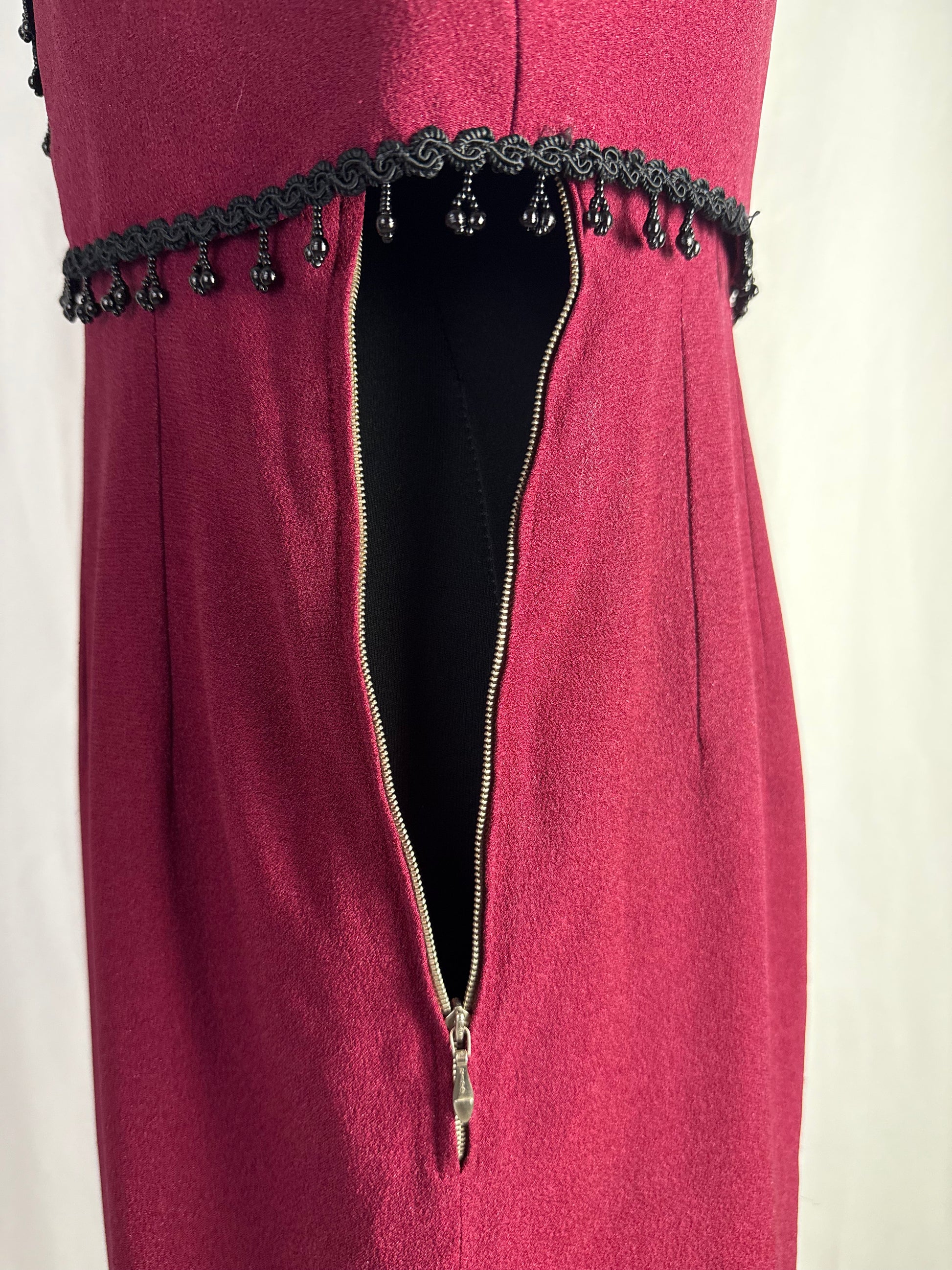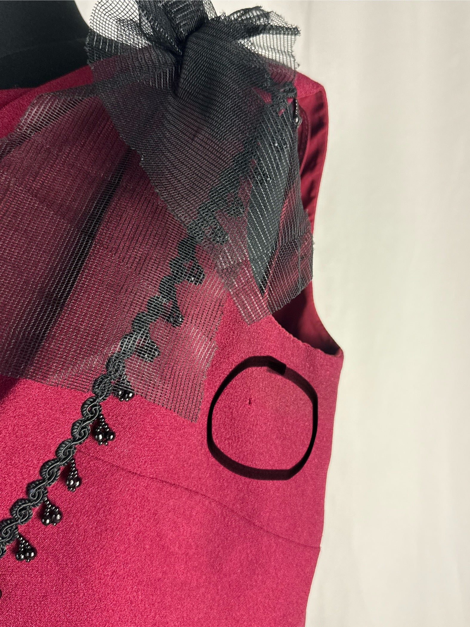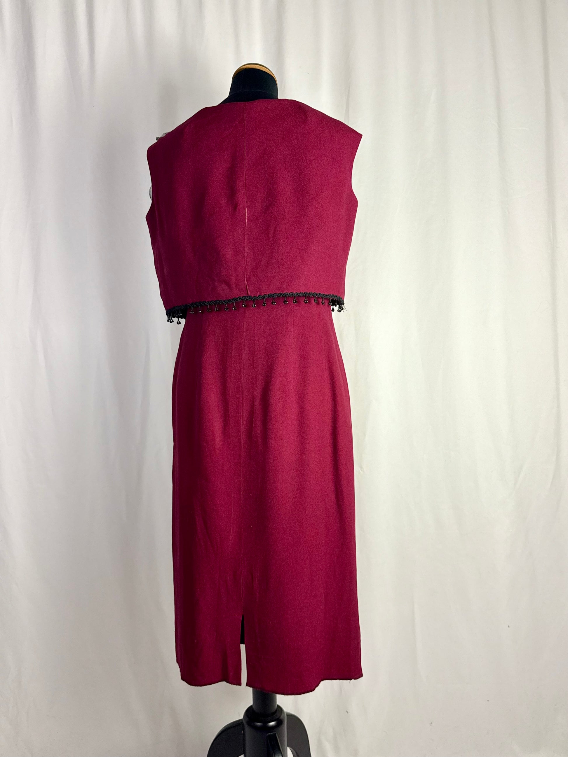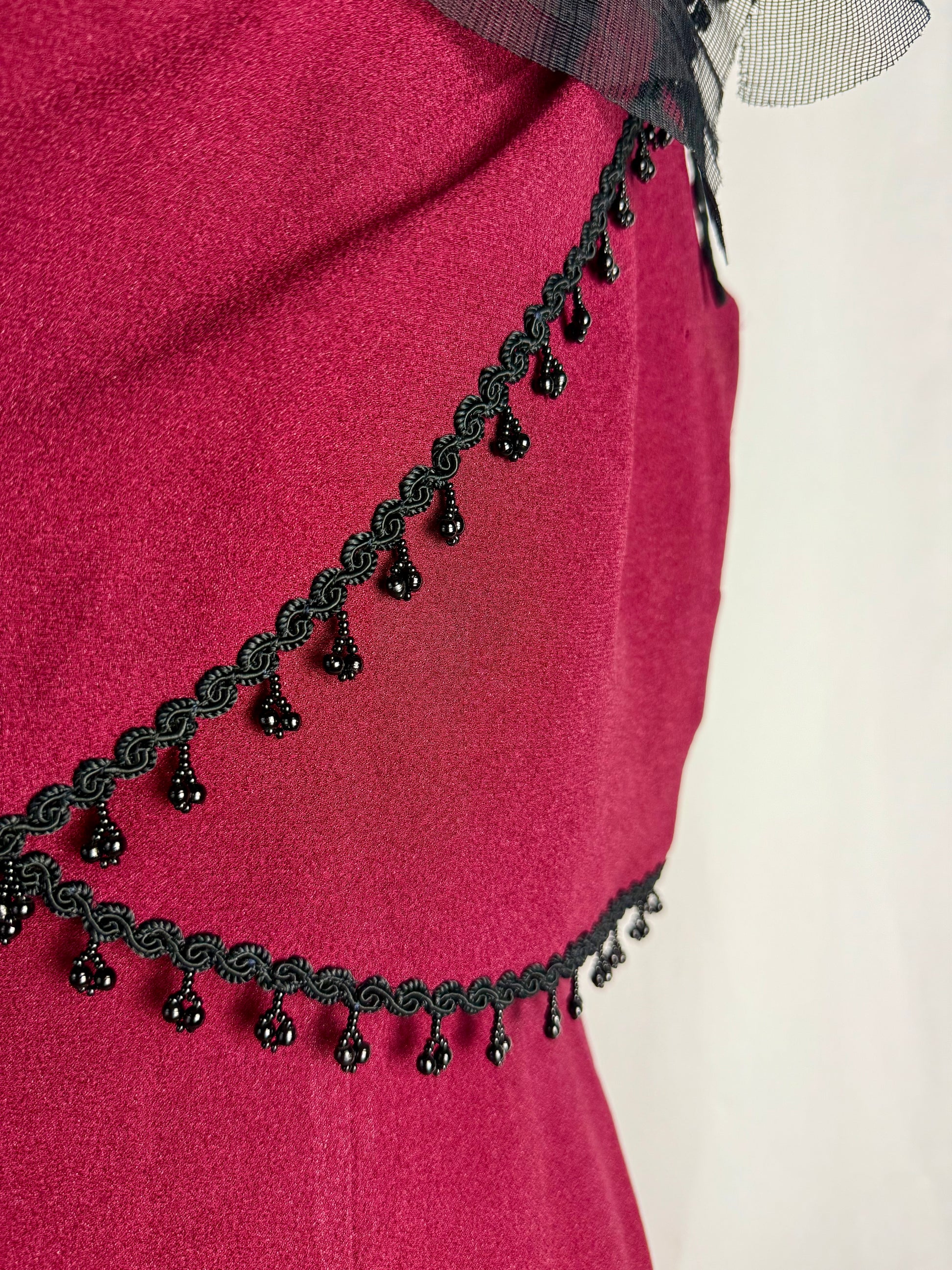 Abito anni ‘60 color vinaccia con sopragonna drappeggiata asimmetrica rifinita da passamaneria nera con gocce applicate. Spalla decorata con nodo in tulle nero, scollo morbido e linea elehgante e sfiancata. Tessuto compatto con ottima caduta. Ideale per cerimonie, feste e occasioni speciali.