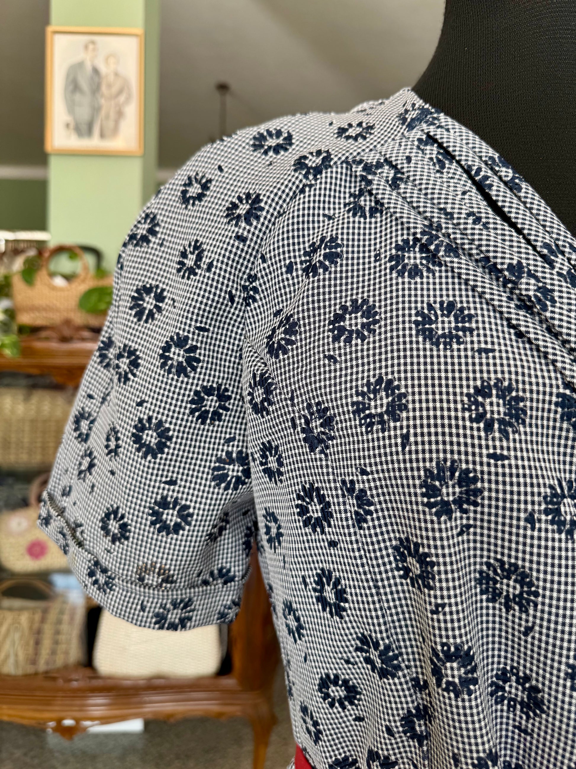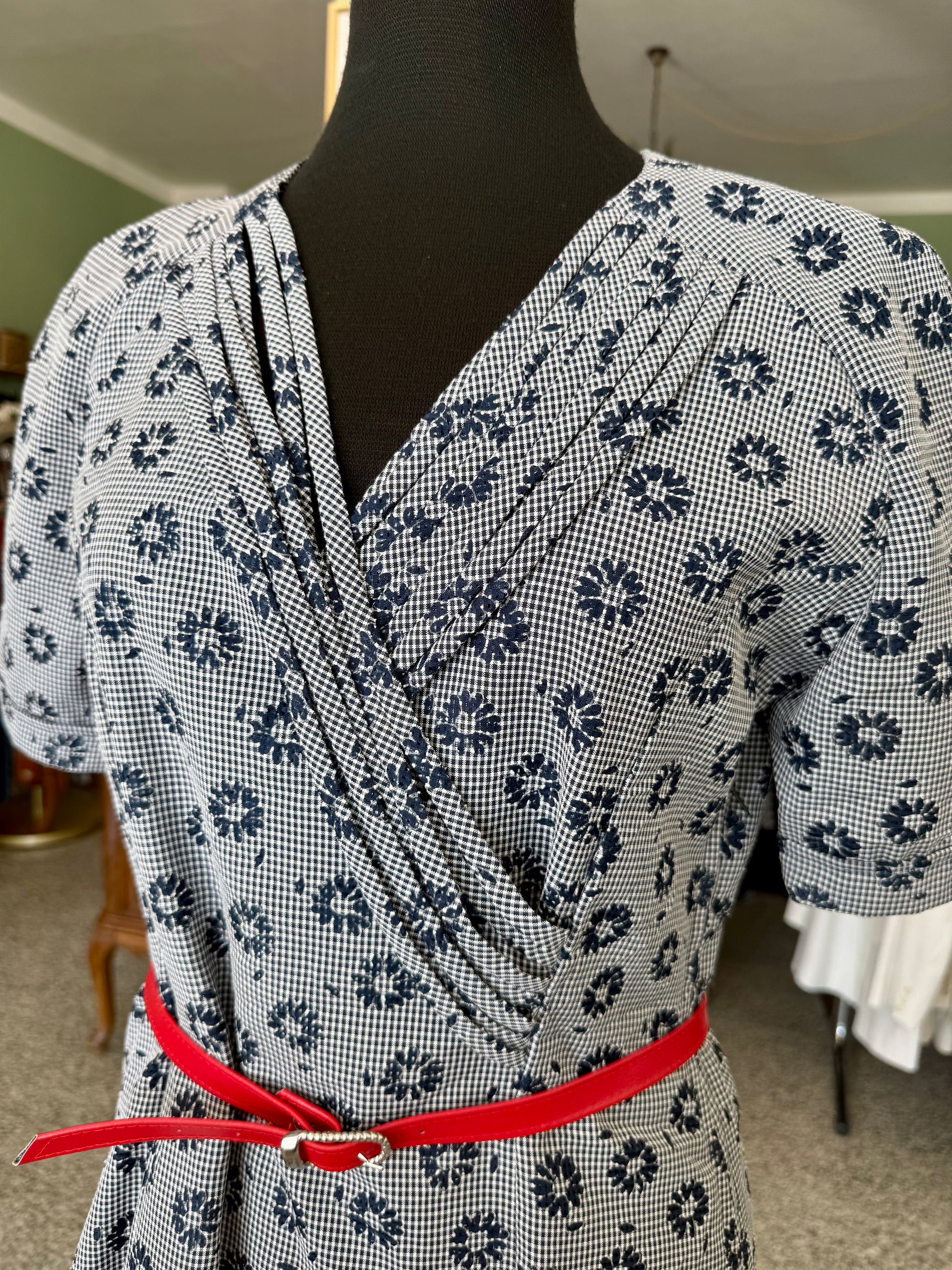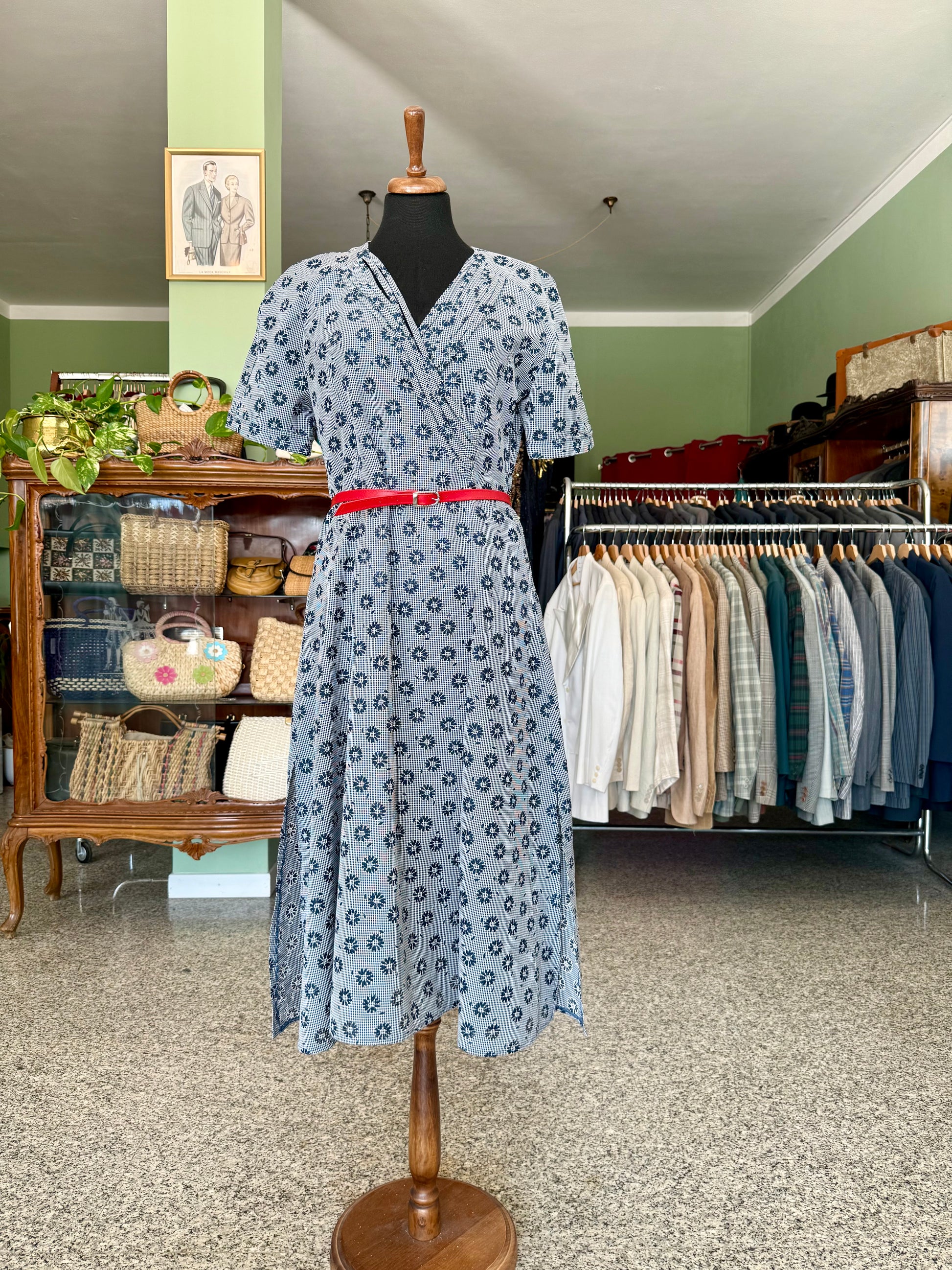 Delizioso abito vintage anni ’70 in misto cotone leggero a micro vichy blu e bianco, impreziosito da una stampa floreale ton sur ton. Il corpino presenta un raffinato scollo a incrocio con pieghe cucite che donano struttura e armonia al décolleté. Un capo intramontabile, fresco e perfetto per l’estate, dal fascino retro