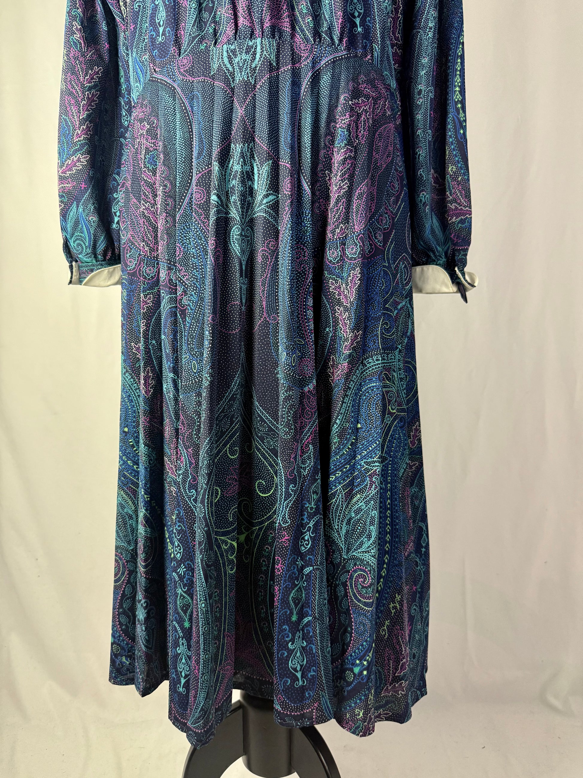 Un classico fine anni ‘70 dal sapore boho chic: abito con stampa paisley nei toni del blu, turchese e viola.