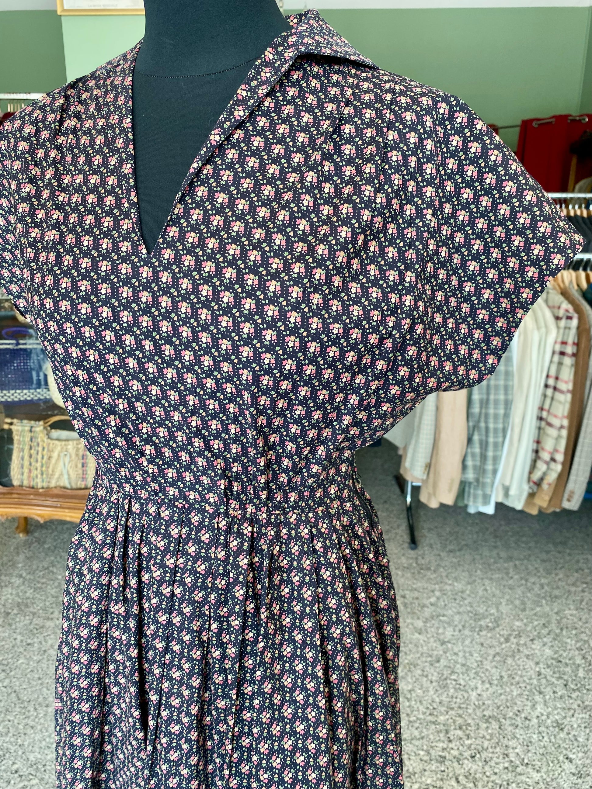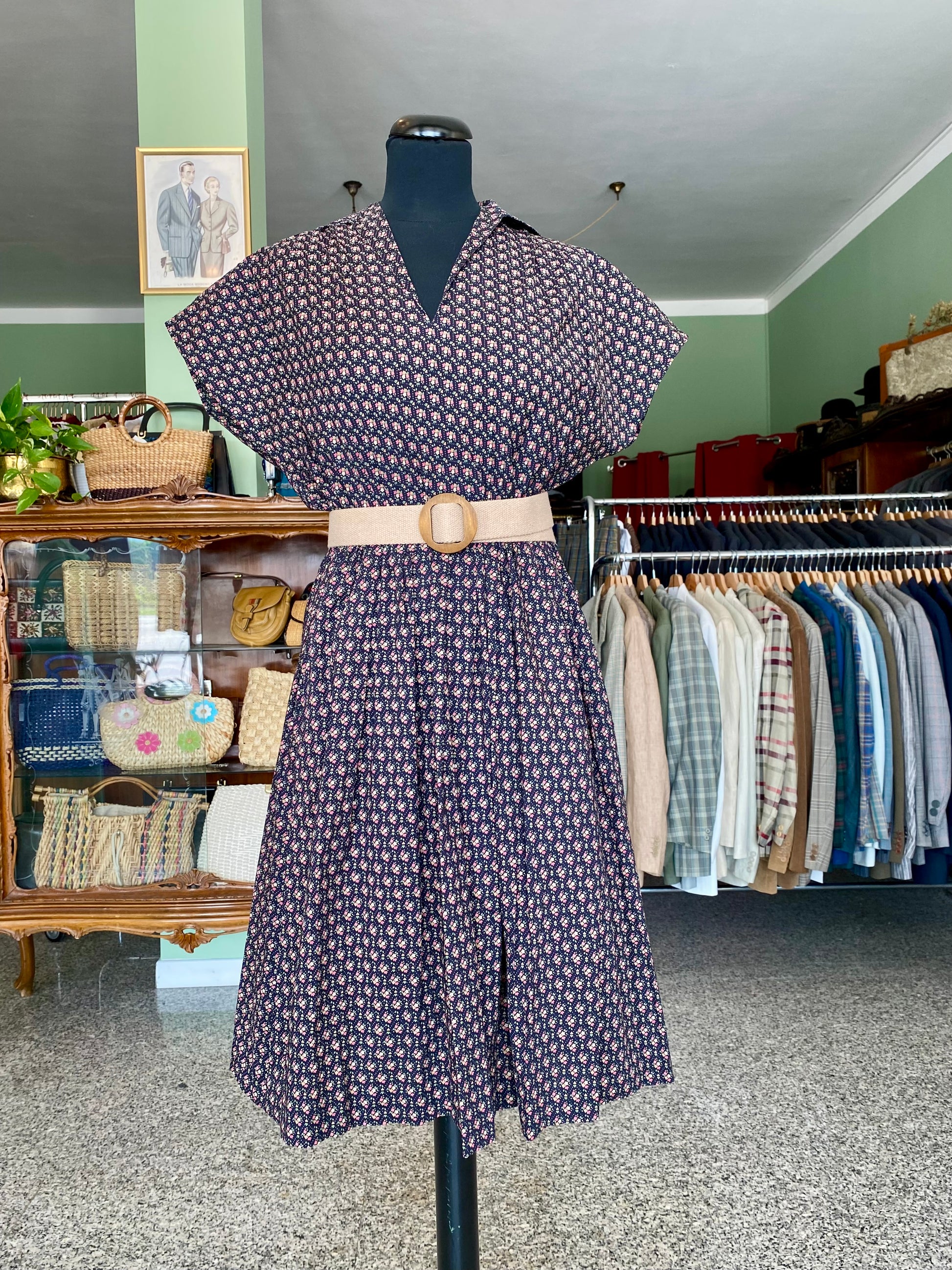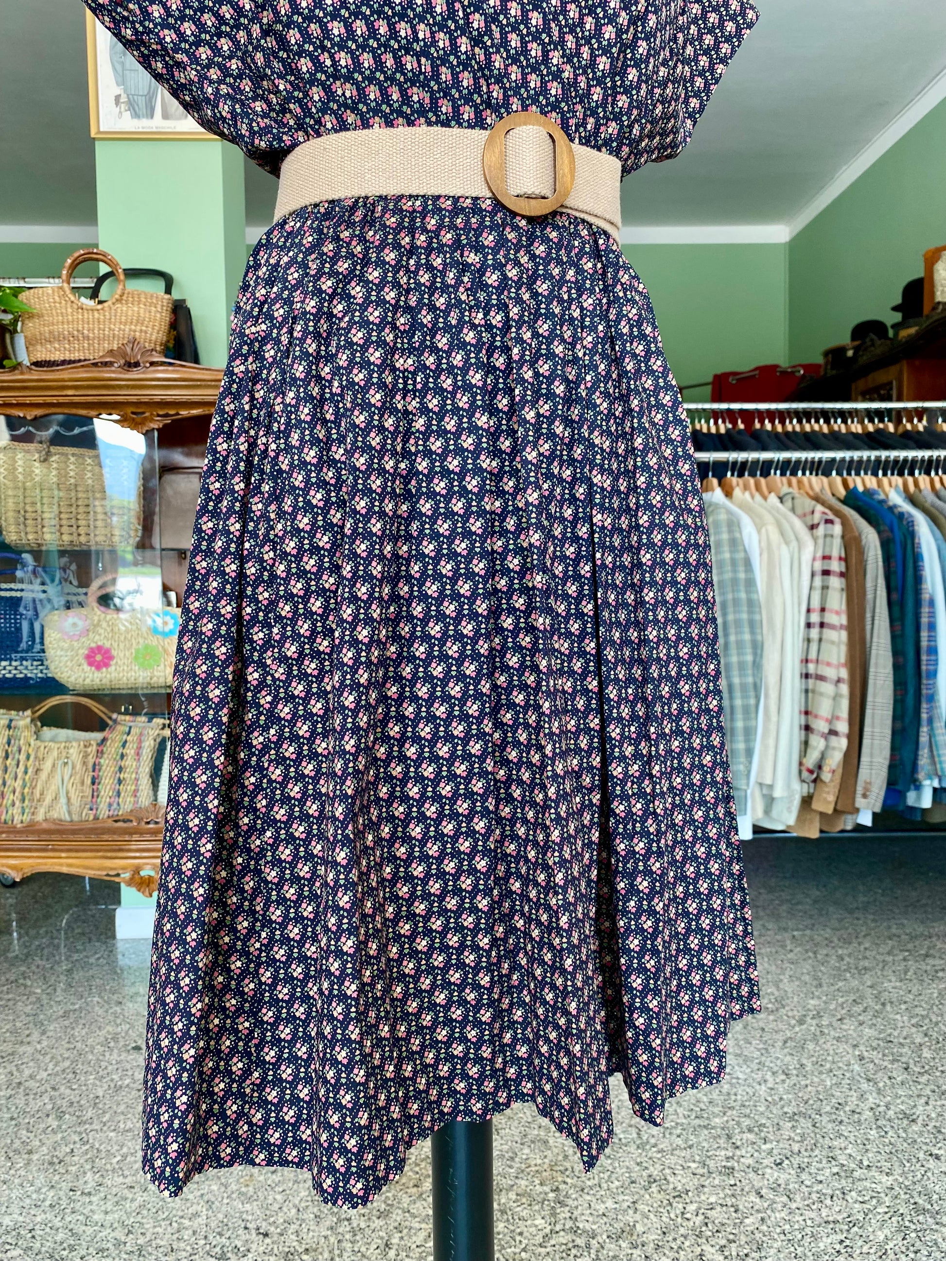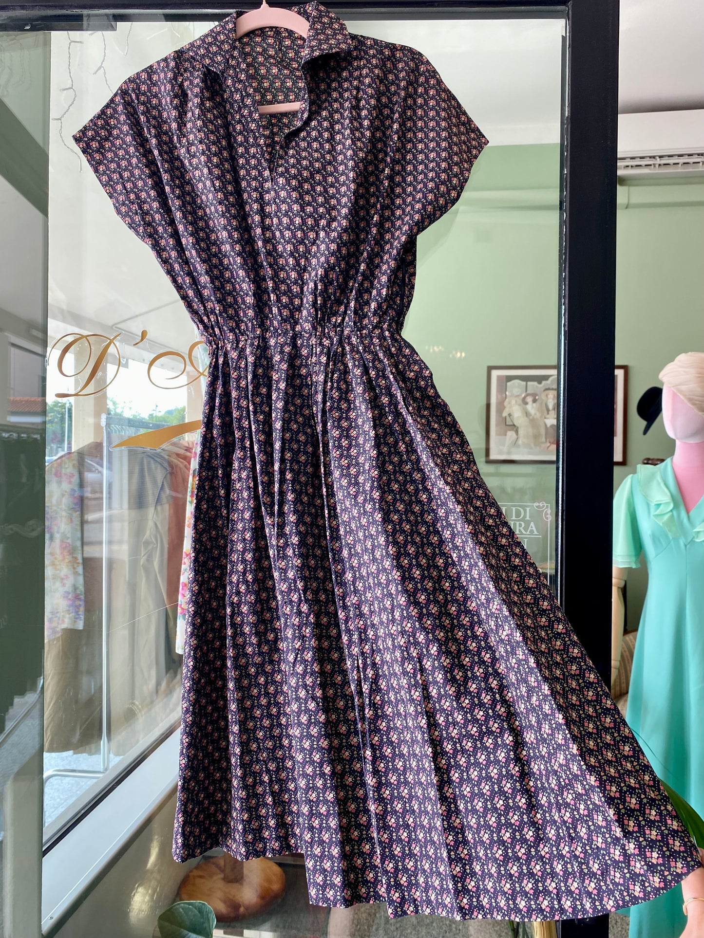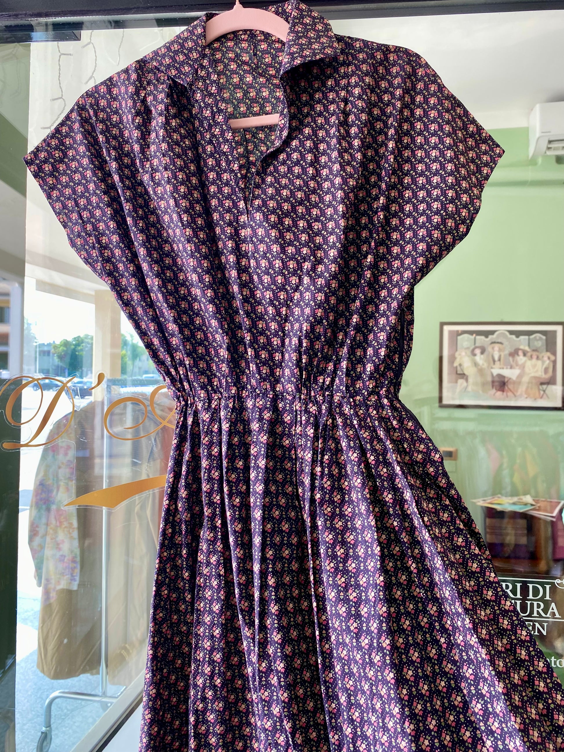 Abito vintage in puro cotone leggero e croccante, piacevolissimo al tatto, fresco e pratico da indossare. Un modello intramontabile, con fantasia a piccoli fiorellini su fondo blu scuro e una linea morbida ma definita grazie all'arricciatura in vita. Questo abito è un autentico fondo di magazzino, parte di un lotto di rimanenze di una storica merceria: un vero tesoro rimasto intatto nel tempo, pronto a vivere una nuova storia. Perfetto da portare sia con cintura in tessuto naturale o in cuoio per sottolineare il punto vita, sia senza per un effetto più comodo e disinvolto.