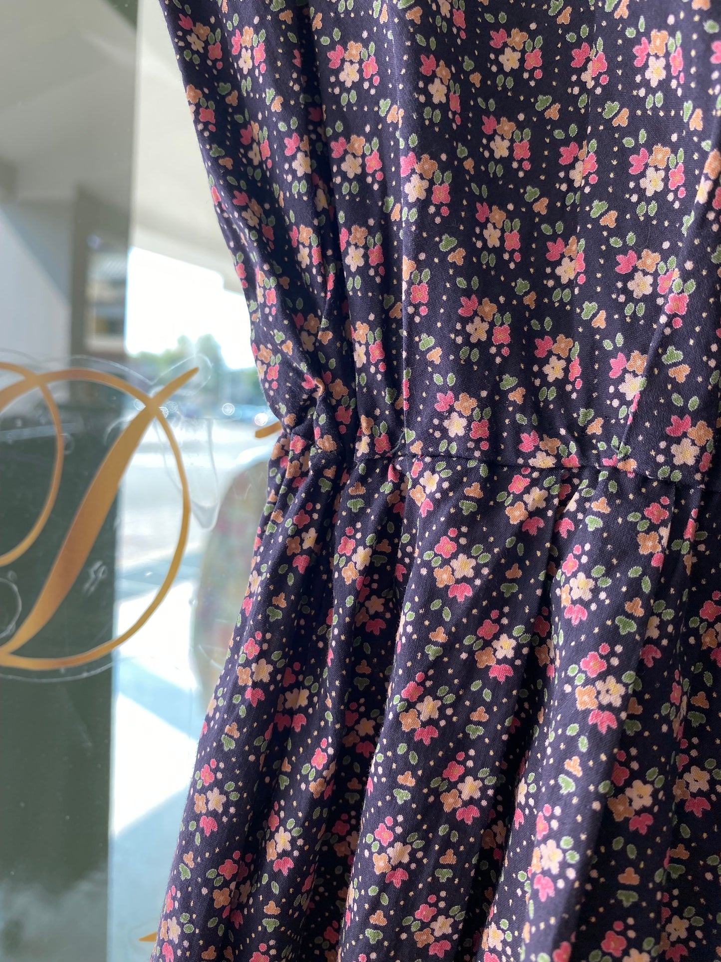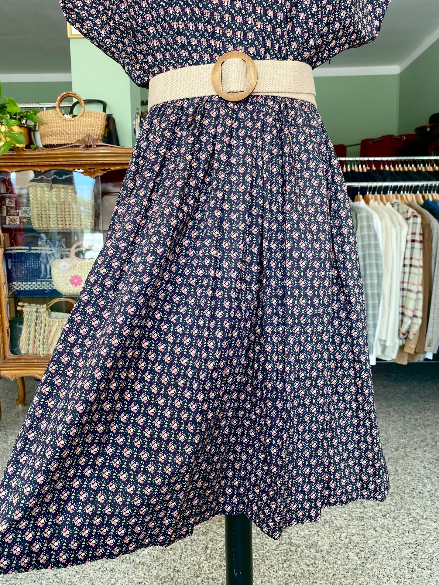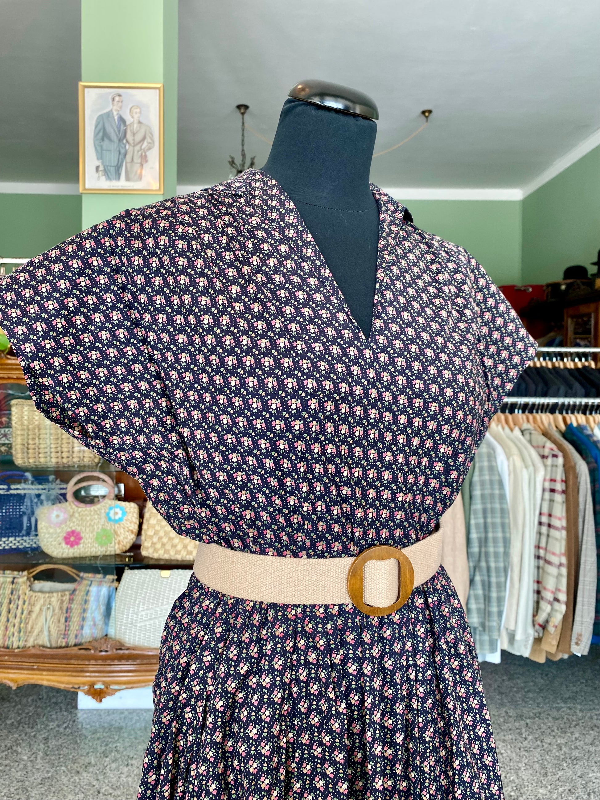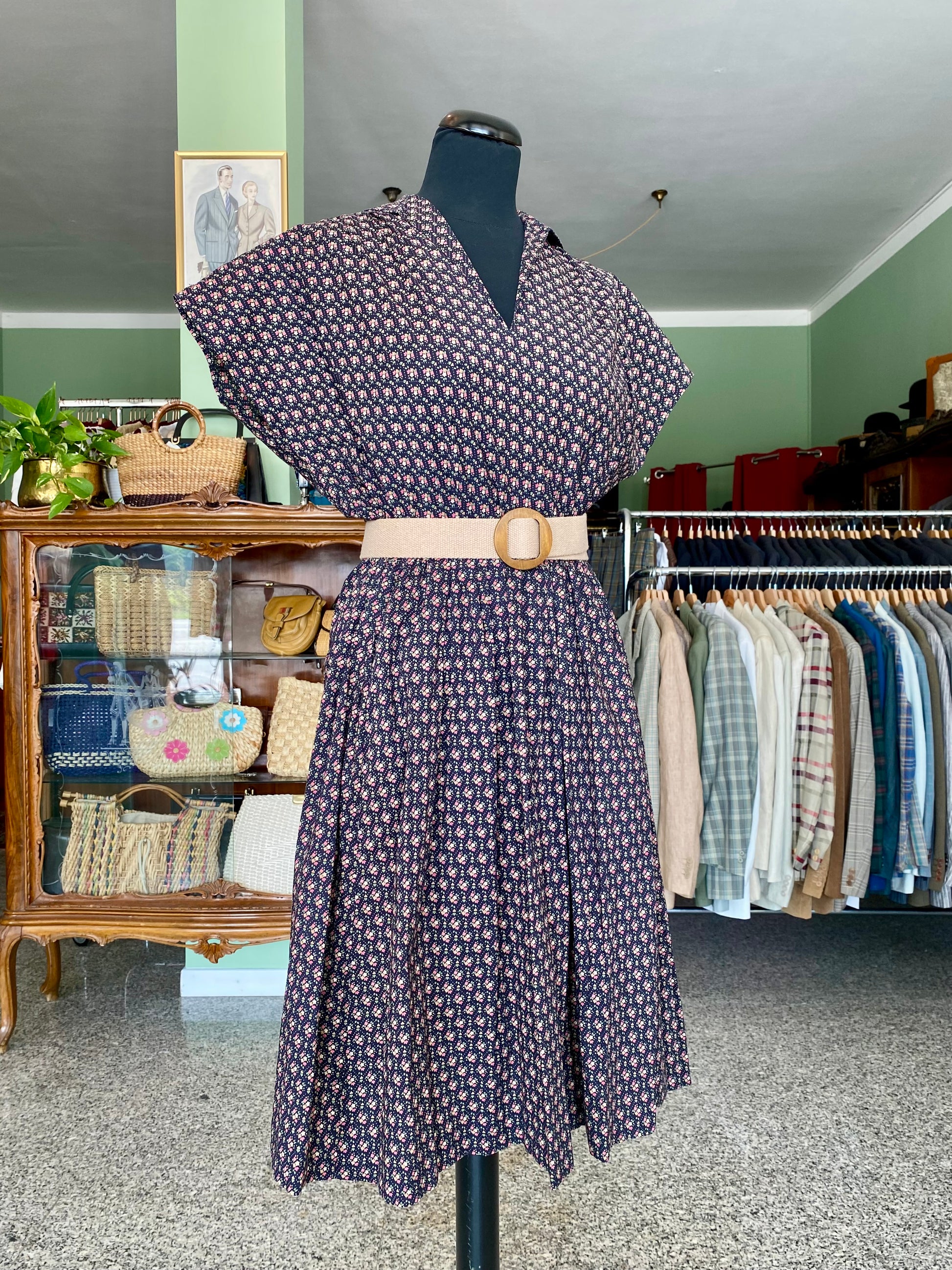 Abito vintage in puro cotone leggero e croccante, piacevolissimo al tatto, fresco e pratico da indossare. Un modello intramontabile, con fantasia a piccoli fiorellini su fondo blu scuro e una linea morbida ma definita grazie all'arricciatura in vita. Questo abito è un autentico fondo di magazzino, parte di un lotto di rimanenze di una storica merceria: un vero tesoro rimasto intatto nel tempo, pronto a vivere una nuova storia. Perfetto da portare sia con cintura in tessuto naturale o in cuoio per sottolineare il punto vita, sia senza per un effetto più comodo e disinvolto.