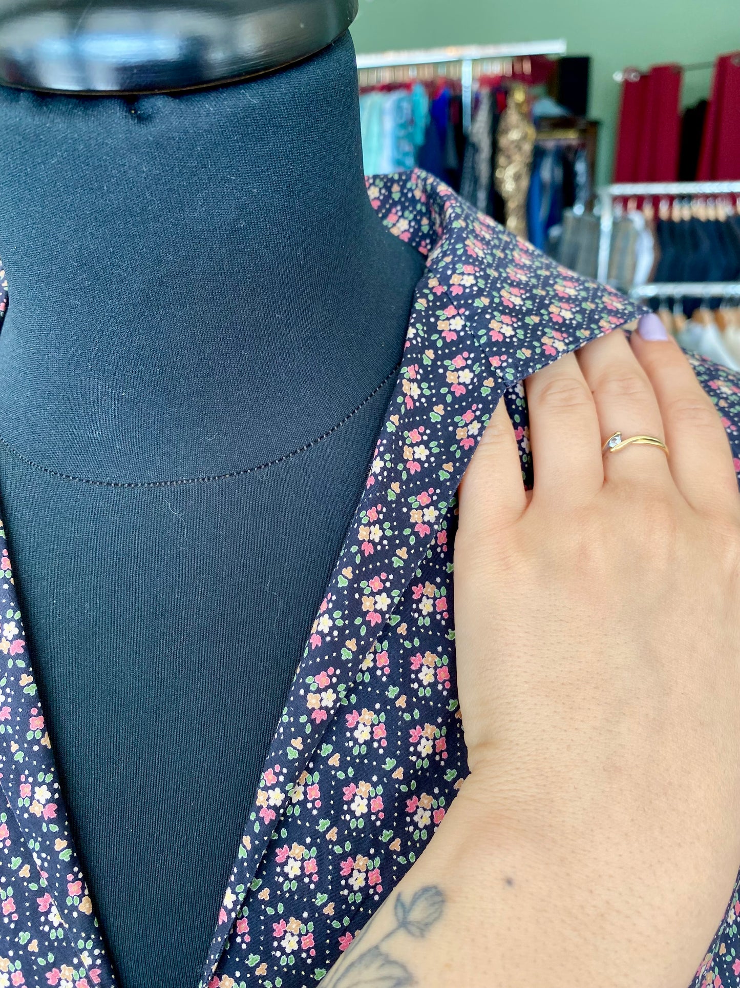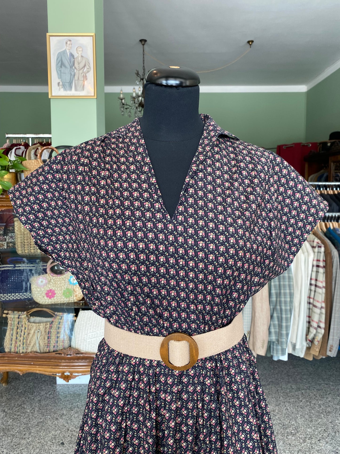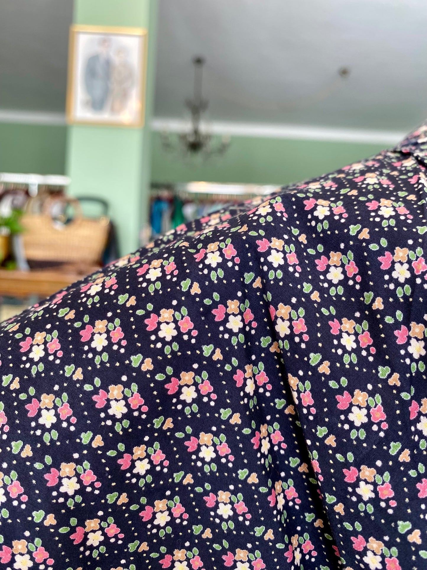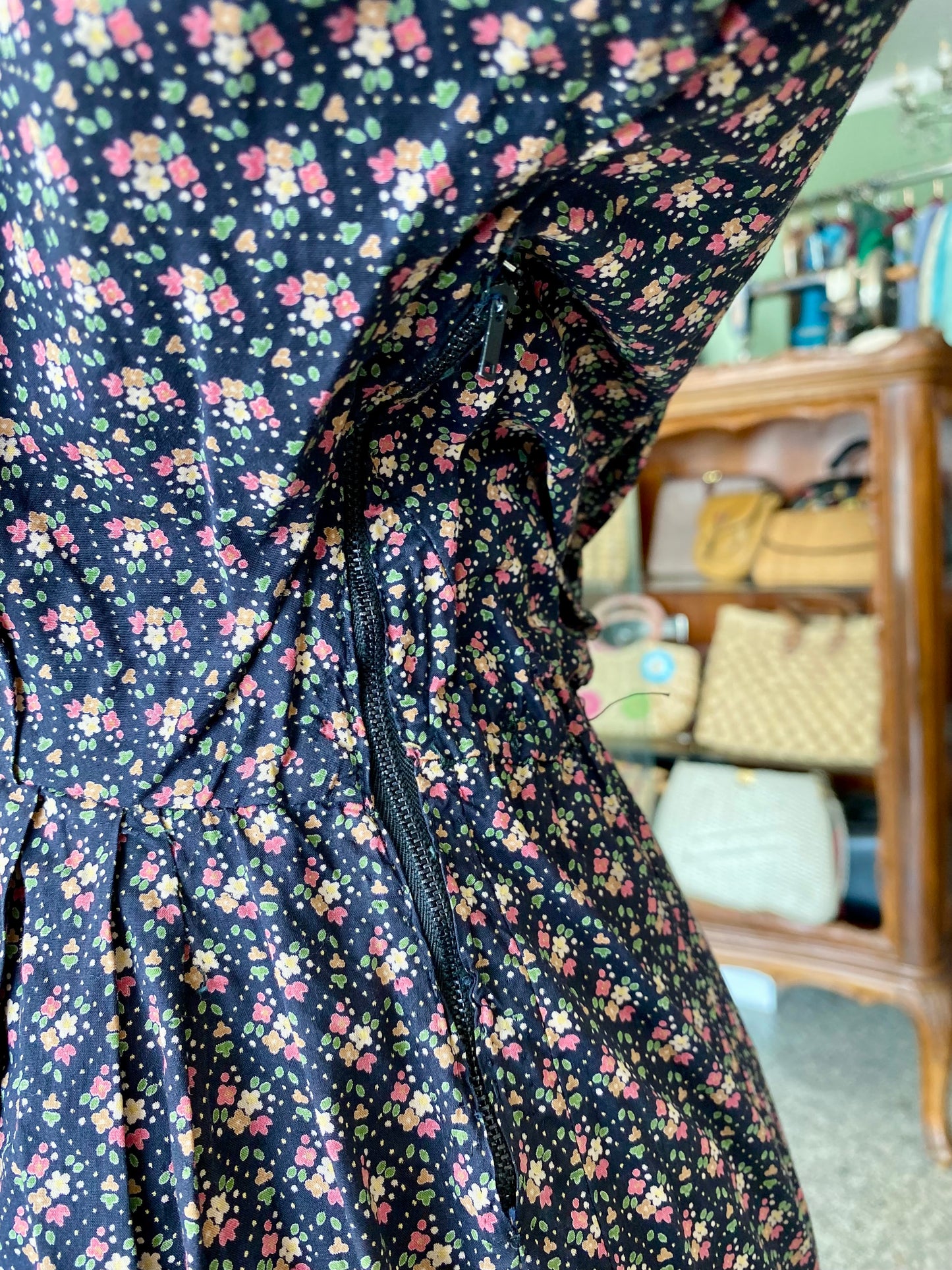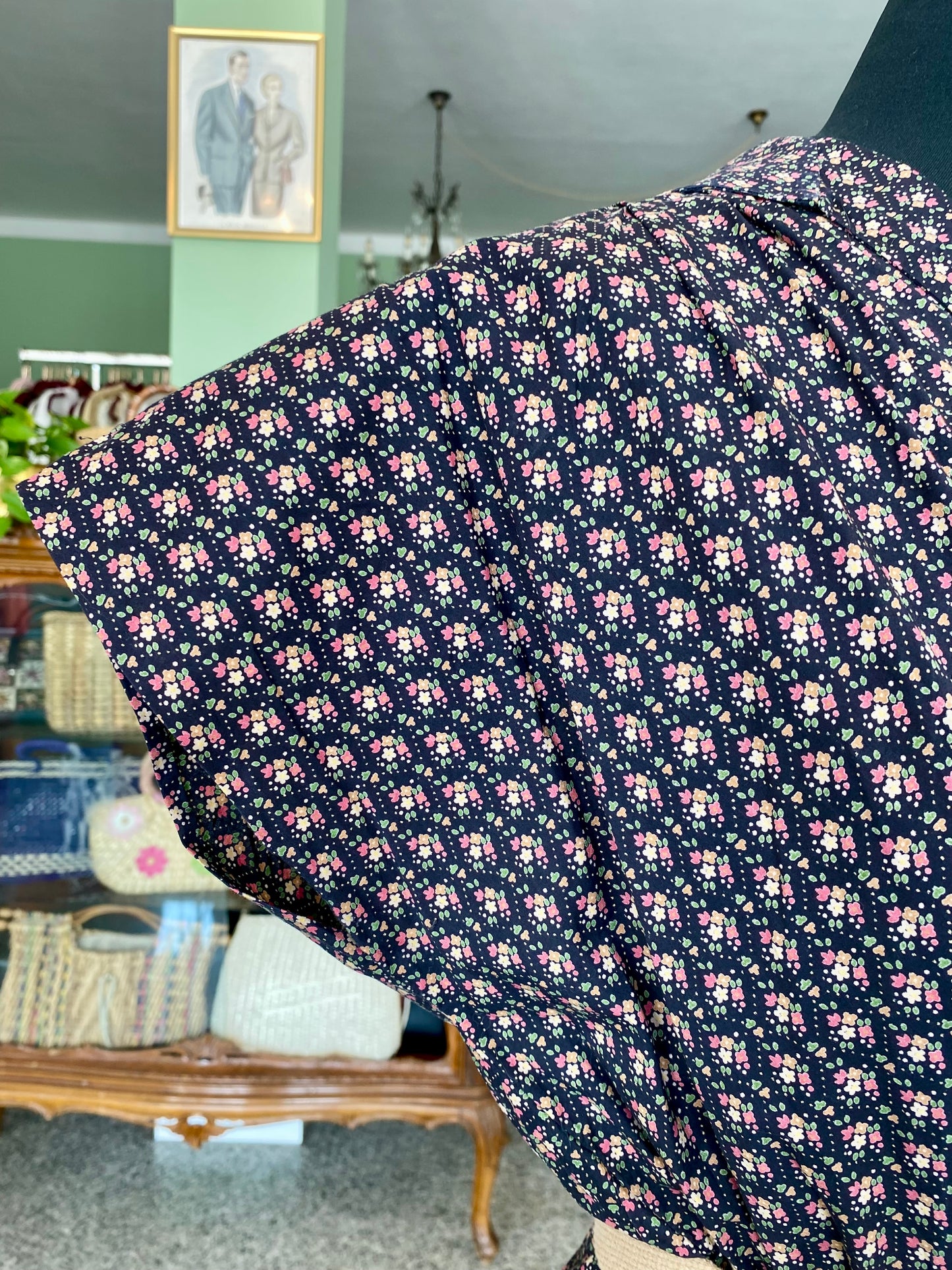 Abito vintage in puro cotone leggero e croccante, piacevolissimo al tatto, fresco e pratico da indossare. Un modello intramontabile, con fantasia a piccoli fiorellini su fondo blu scuro e una linea morbida ma definita grazie all'arricciatura in vita. Questo abito è un autentico fondo di magazzino, parte di un lotto di rimanenze di una storica merceria: un vero tesoro rimasto intatto nel tempo, pronto a vivere una nuova storia. Perfetto da portare sia con cintura in tessuto naturale o in cuoio per sottolineare il punto vita, sia senza per un effetto più comodo e disinvolto.