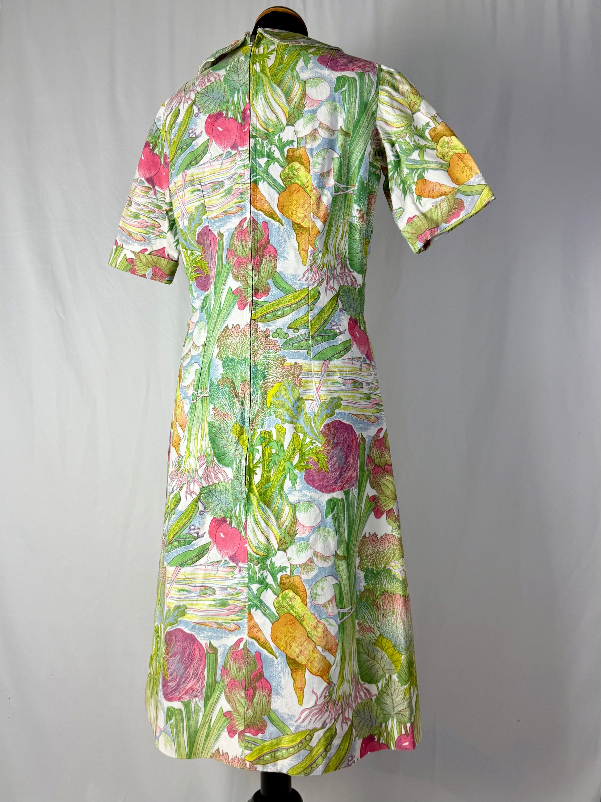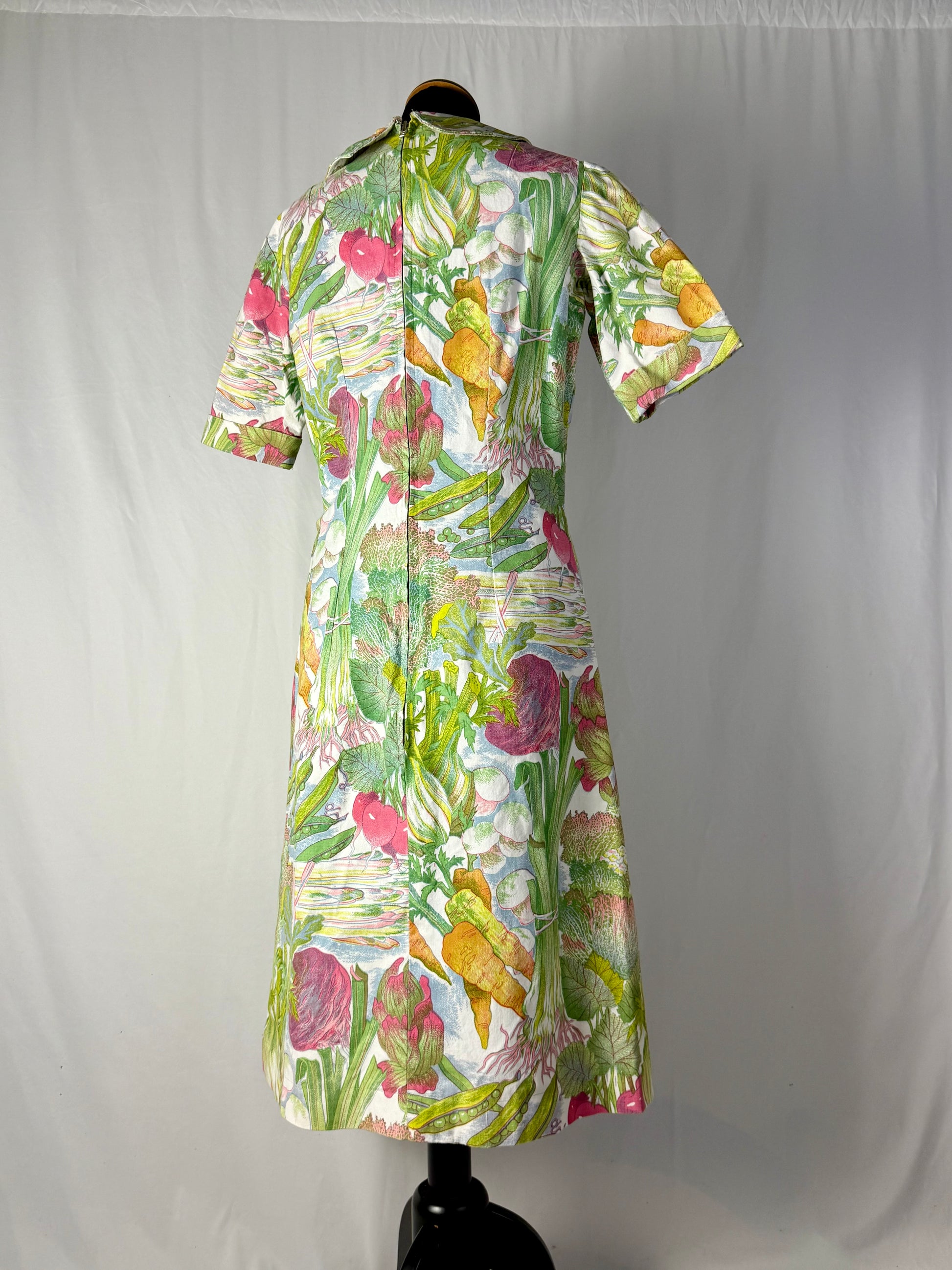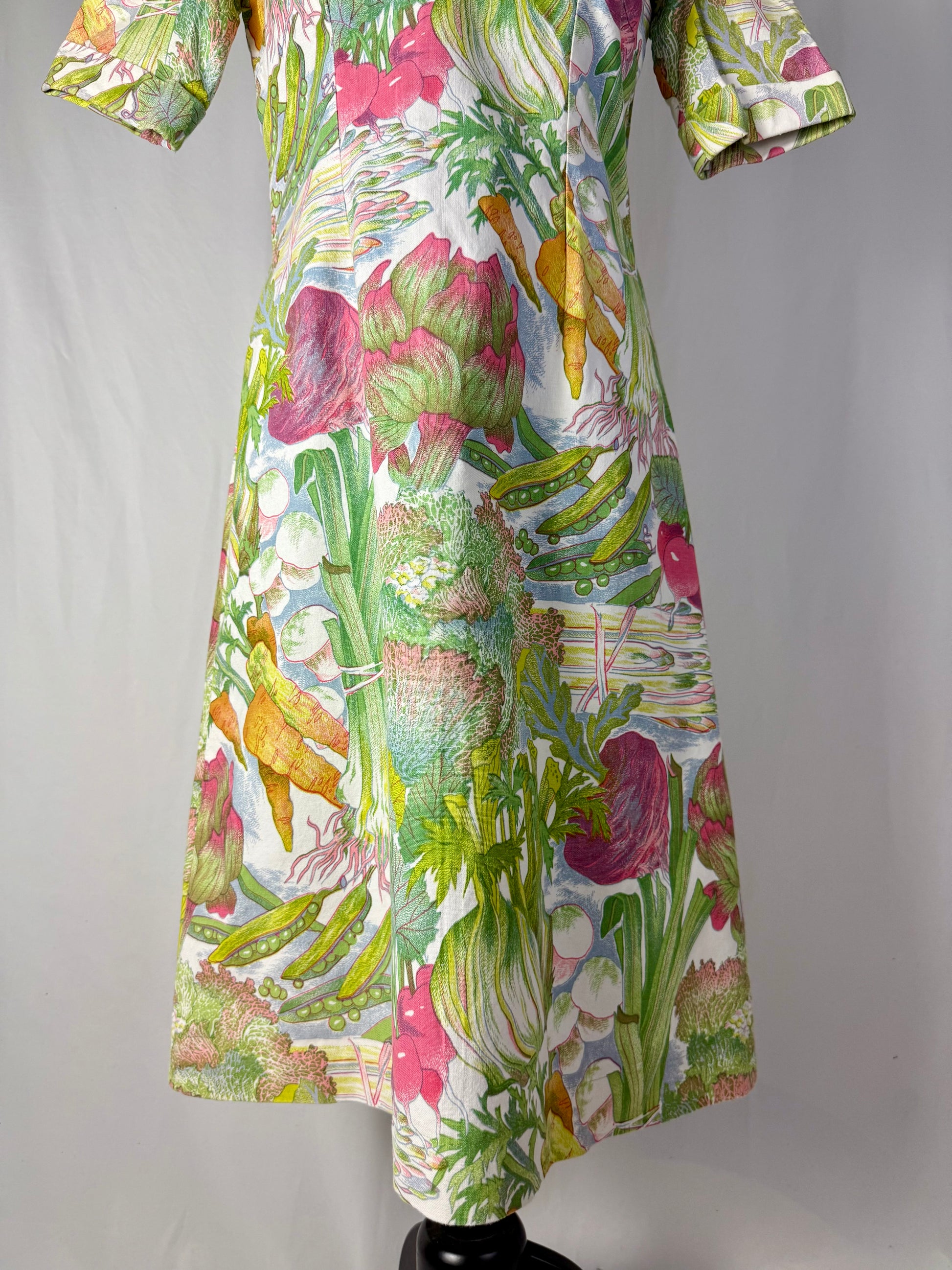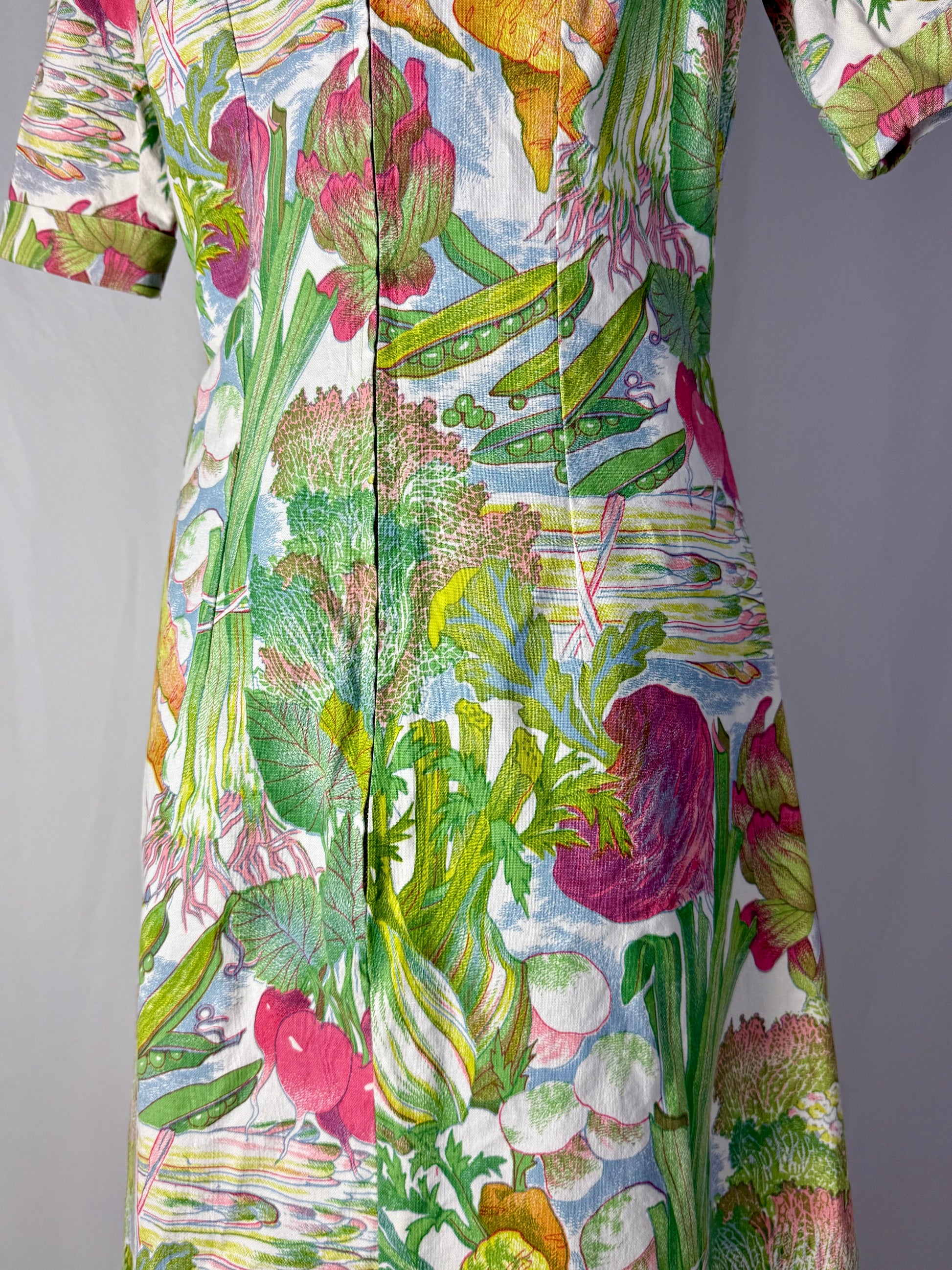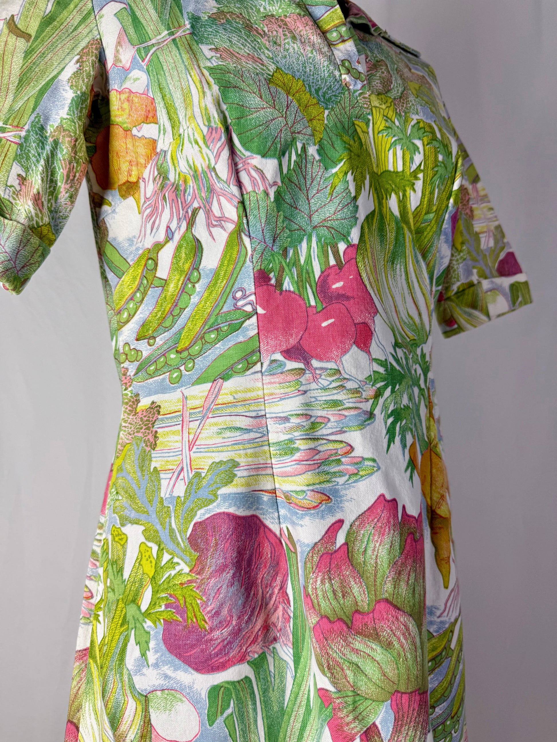 Modello midi e svasato, realizzato in cotone sostenuto con stampa naturalistica raffigurante ortaggi e foglie stilizzate nei toni del verde, rosa, giallo e lilla. Colletto a punta con apertura a V e maniche corte leggermente svasate. Struttura semi aderente con pinces su corpino e cuciture laterali modellanti. Chiusura posteriore con zip. L’iconica fantasia ironica e illustrata è tipica della moda domestica e “eco” dei primi anni Settanta.