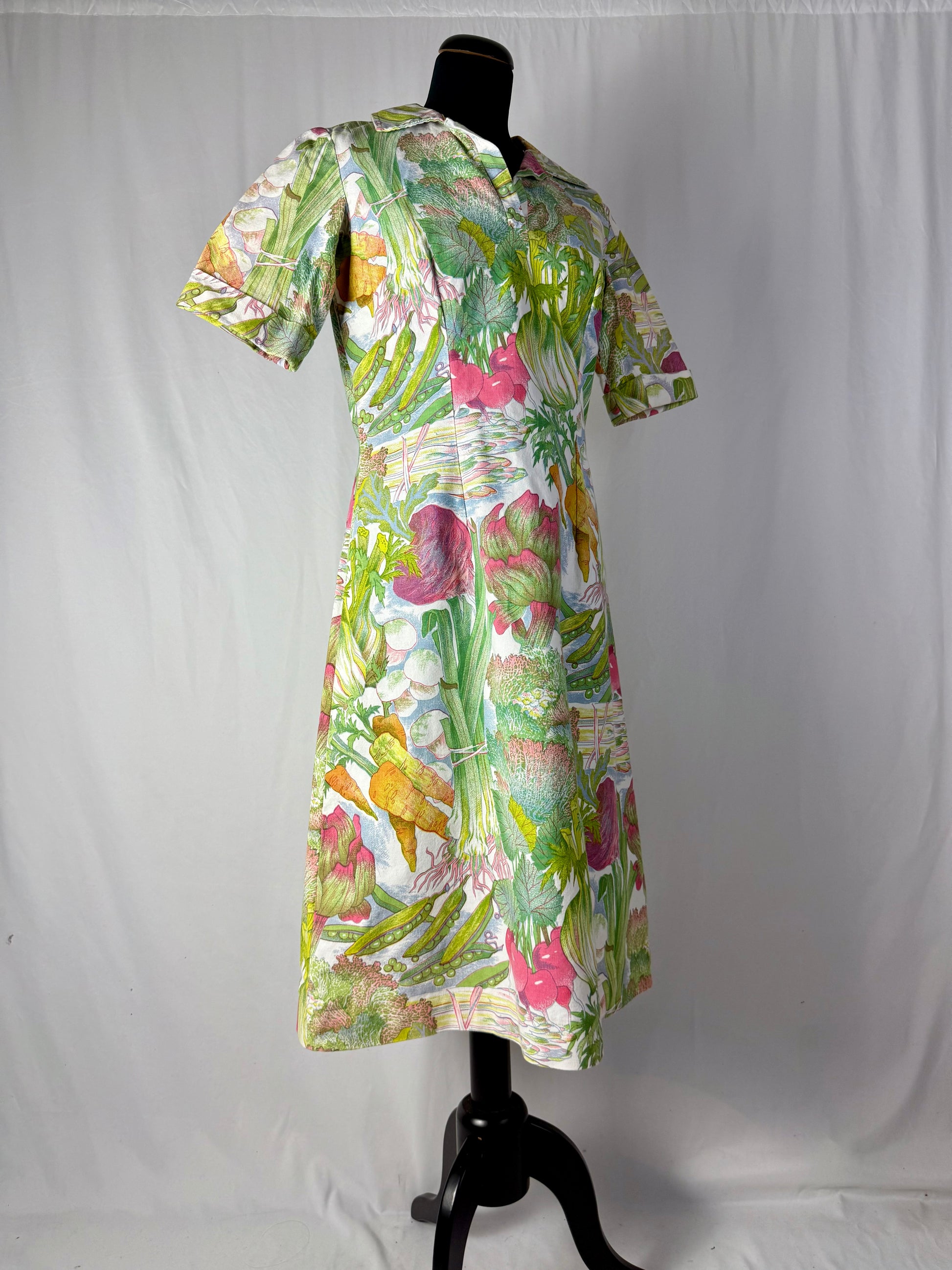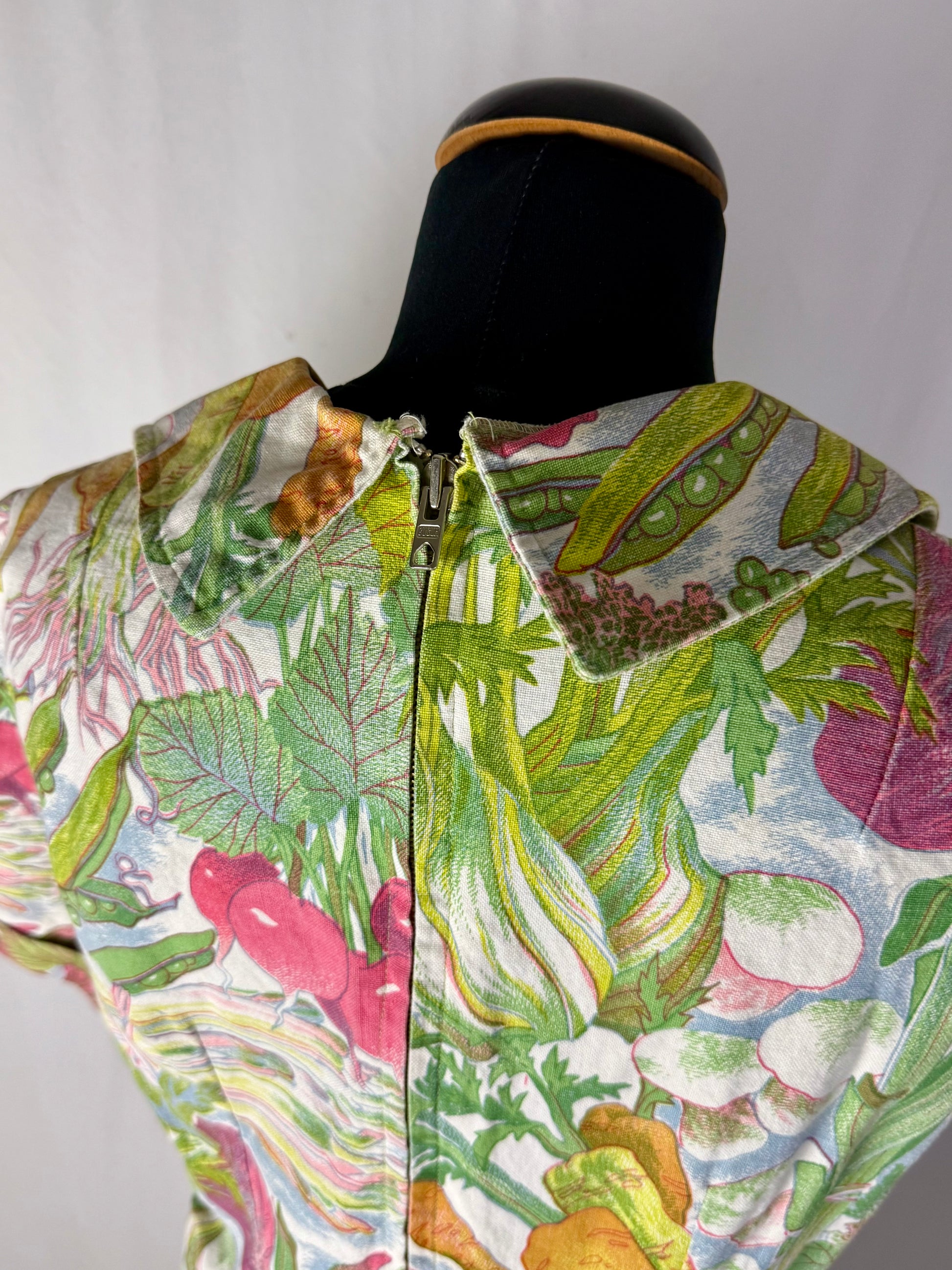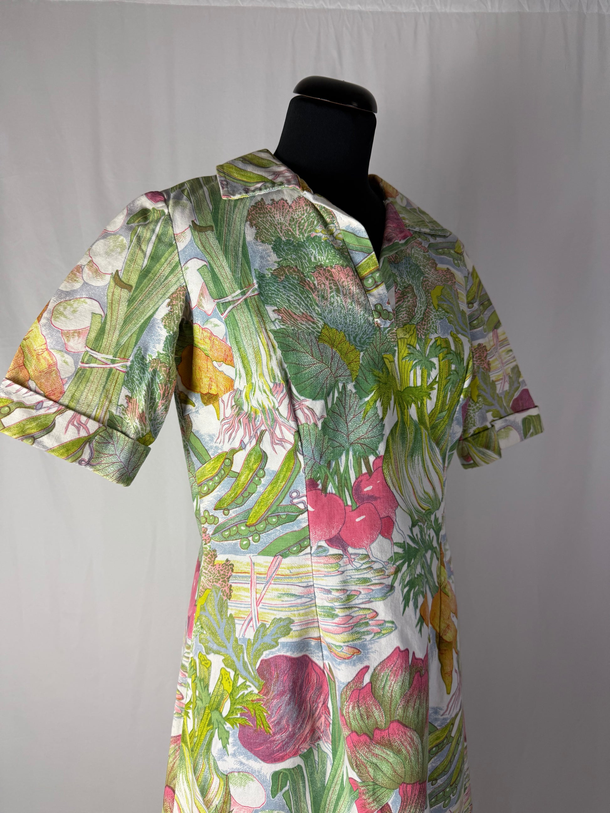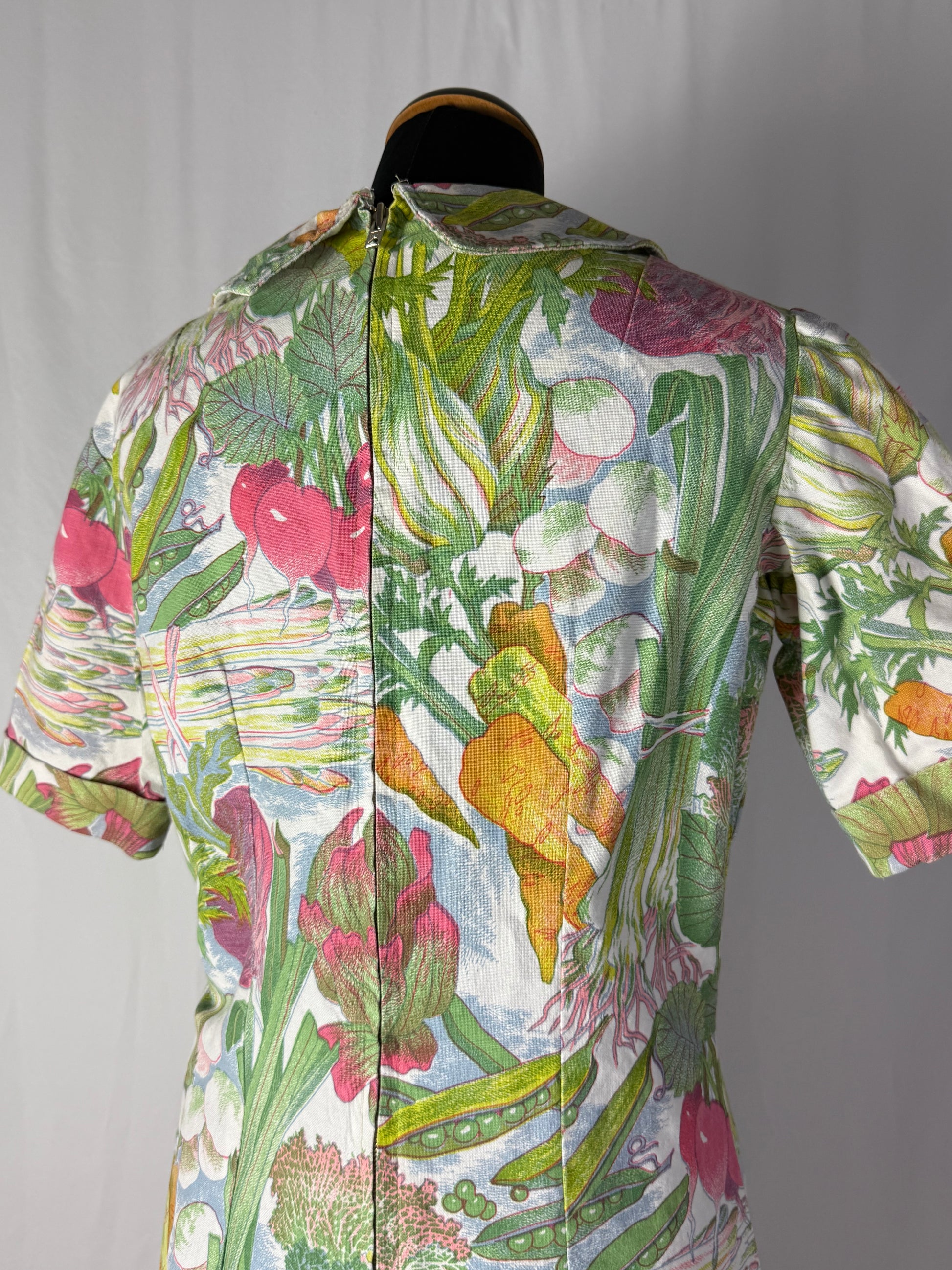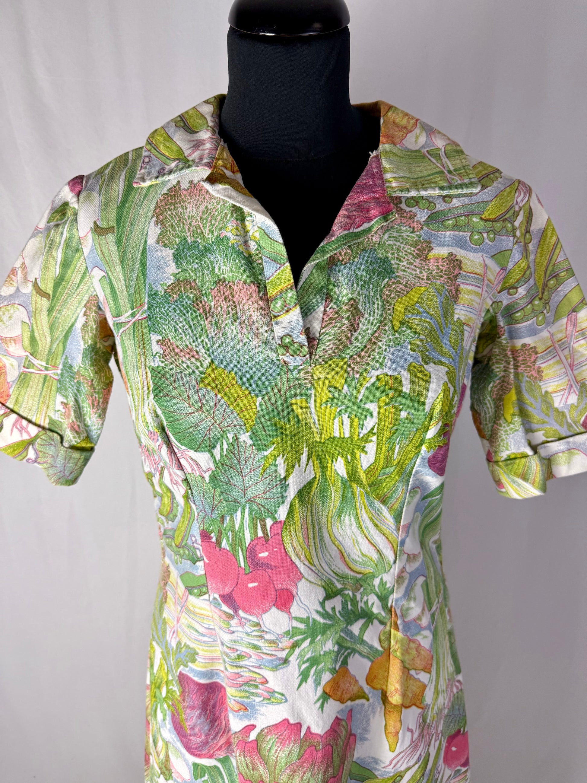 Modello midi e svasato, realizzato in cotone sostenuto con stampa naturalistica raffigurante ortaggi e foglie stilizzate nei toni del verde, rosa, giallo e lilla. Colletto a punta con apertura a V e maniche corte leggermente svasate. Struttura semi aderente con pinces su corpino e cuciture laterali modellanti. Chiusura posteriore con zip. L’iconica fantasia ironica e illustrata è tipica della moda domestica e “eco” dei primi anni Settanta.