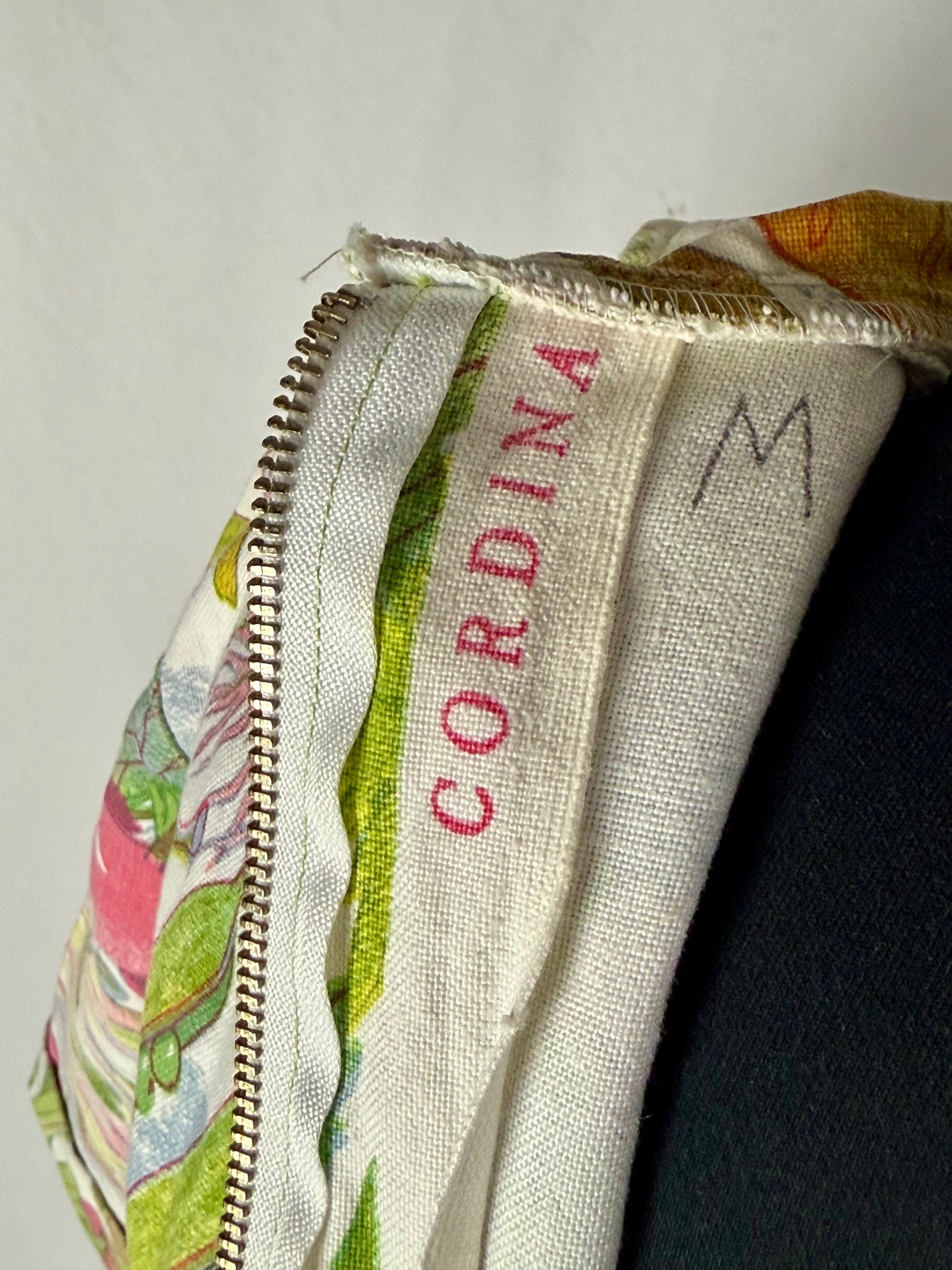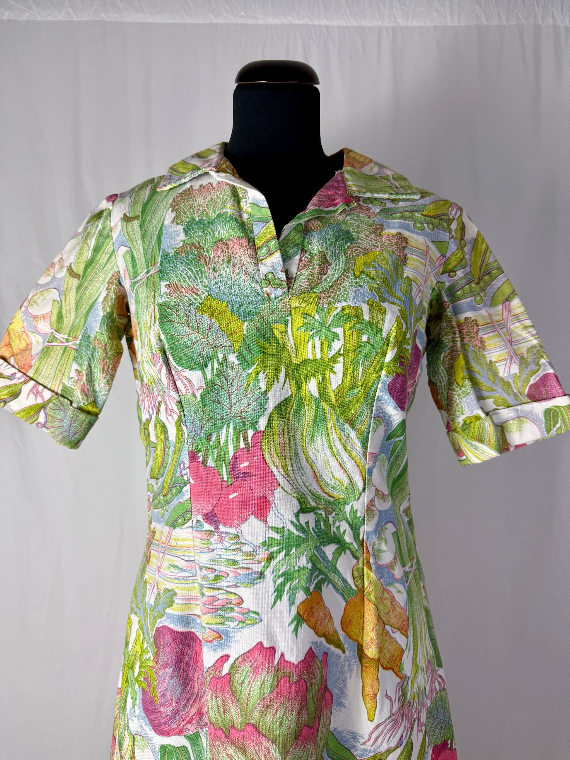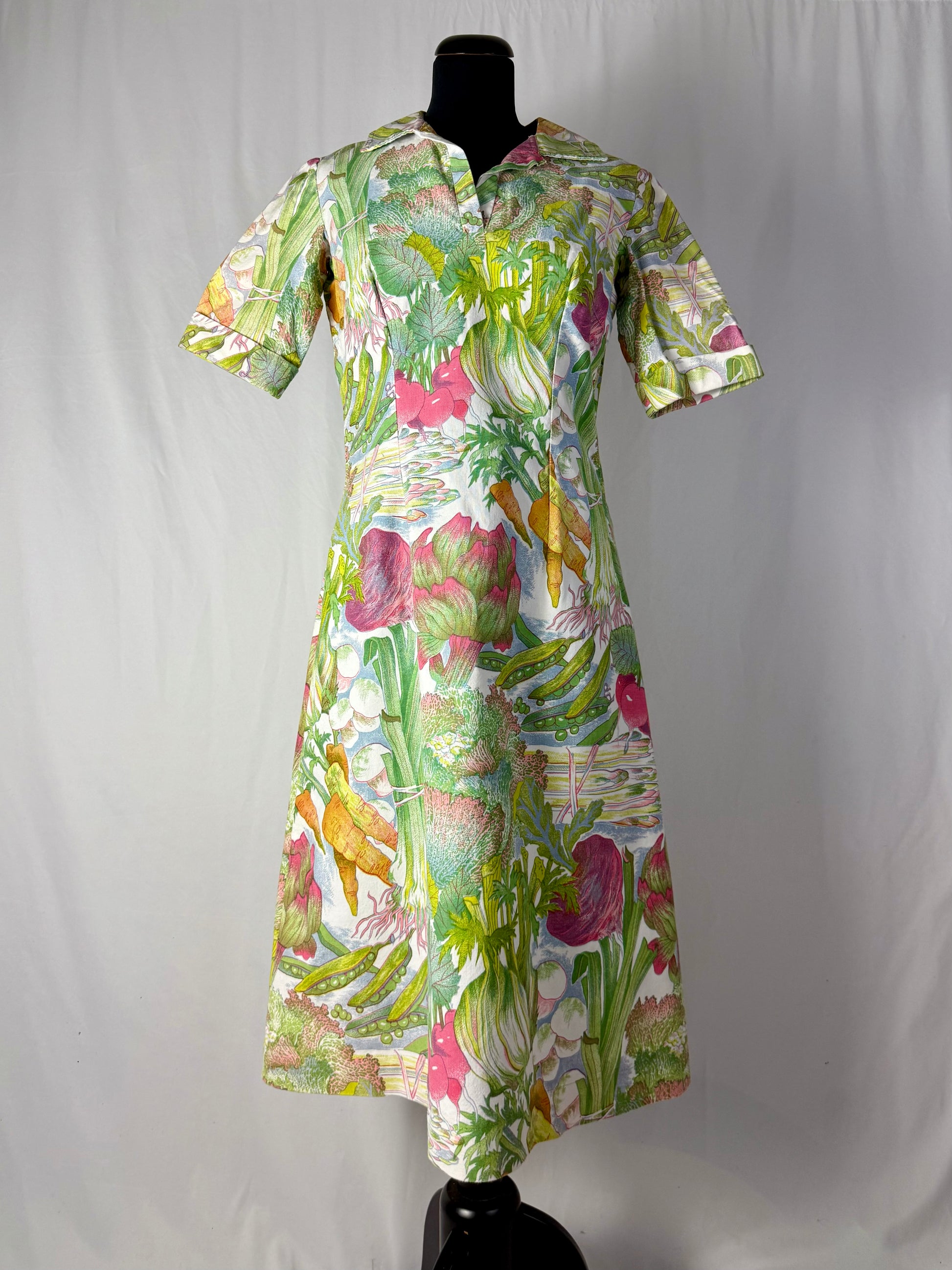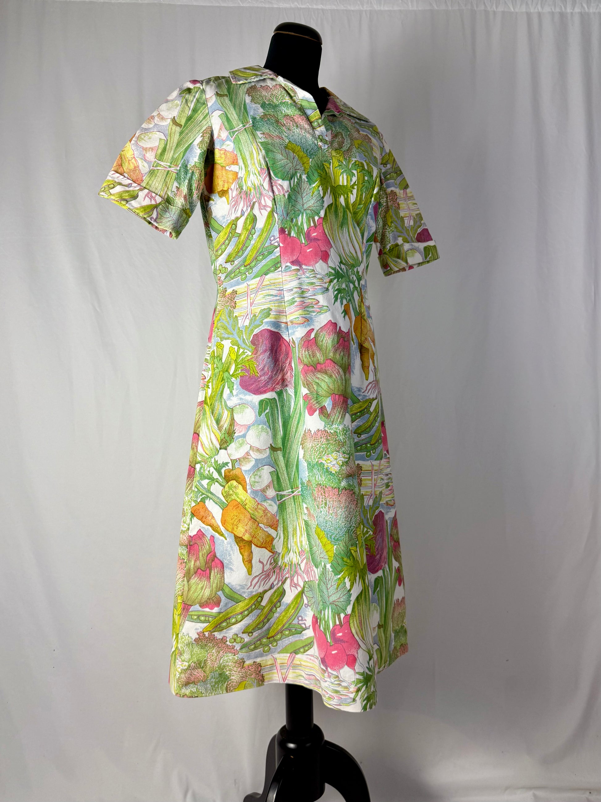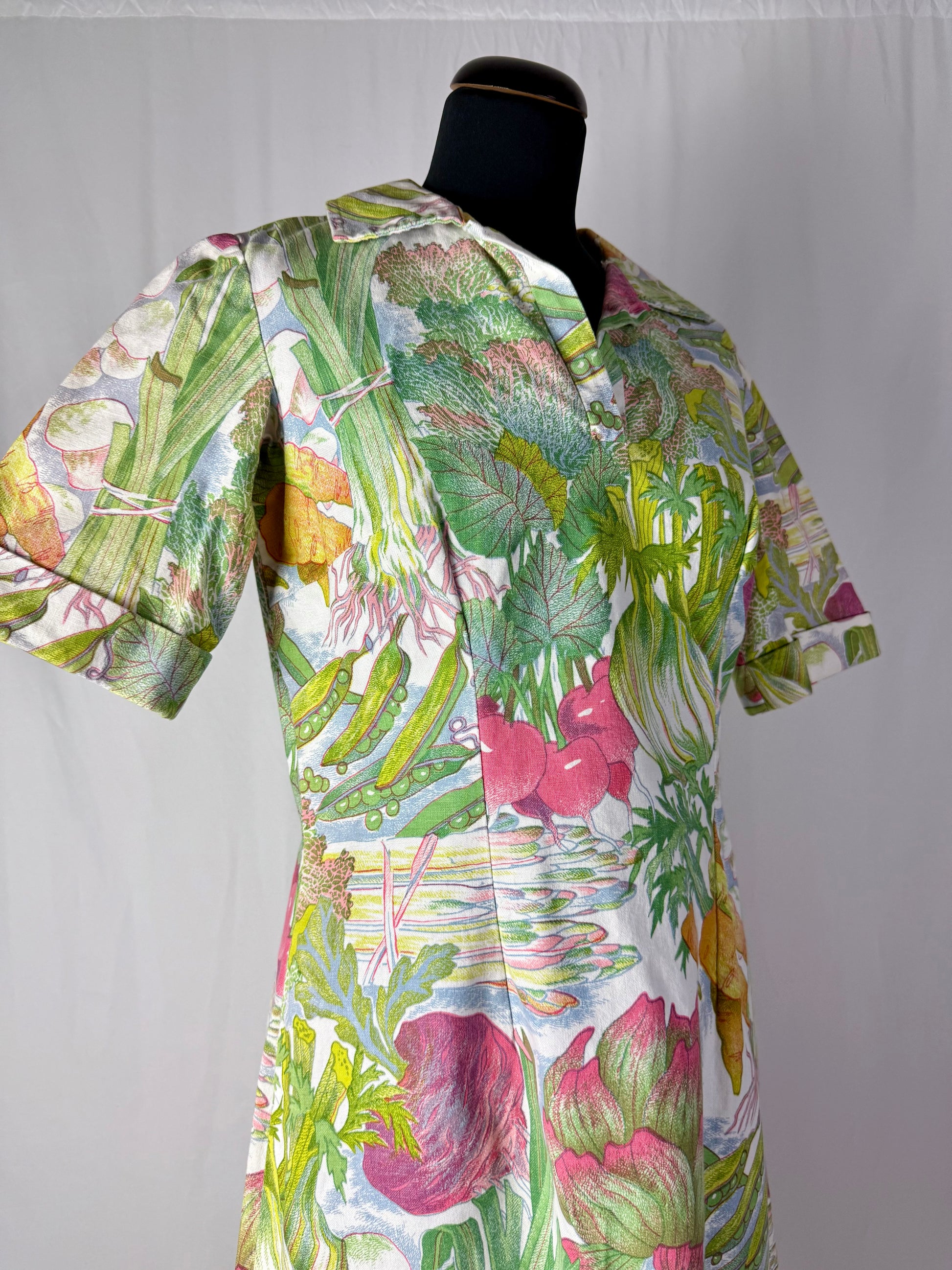 Modello midi e svasato, realizzato in cotone sostenuto con stampa naturalistica raffigurante ortaggi e foglie stilizzate nei toni del verde, rosa, giallo e lilla. Colletto a punta con apertura a V e maniche corte leggermente svasate. Struttura semi aderente con pinces su corpino e cuciture laterali modellanti. Chiusura posteriore con zip. L’iconica fantasia ironica e illustrata è tipica della moda domestica e “eco” dei primi anni Settanta.