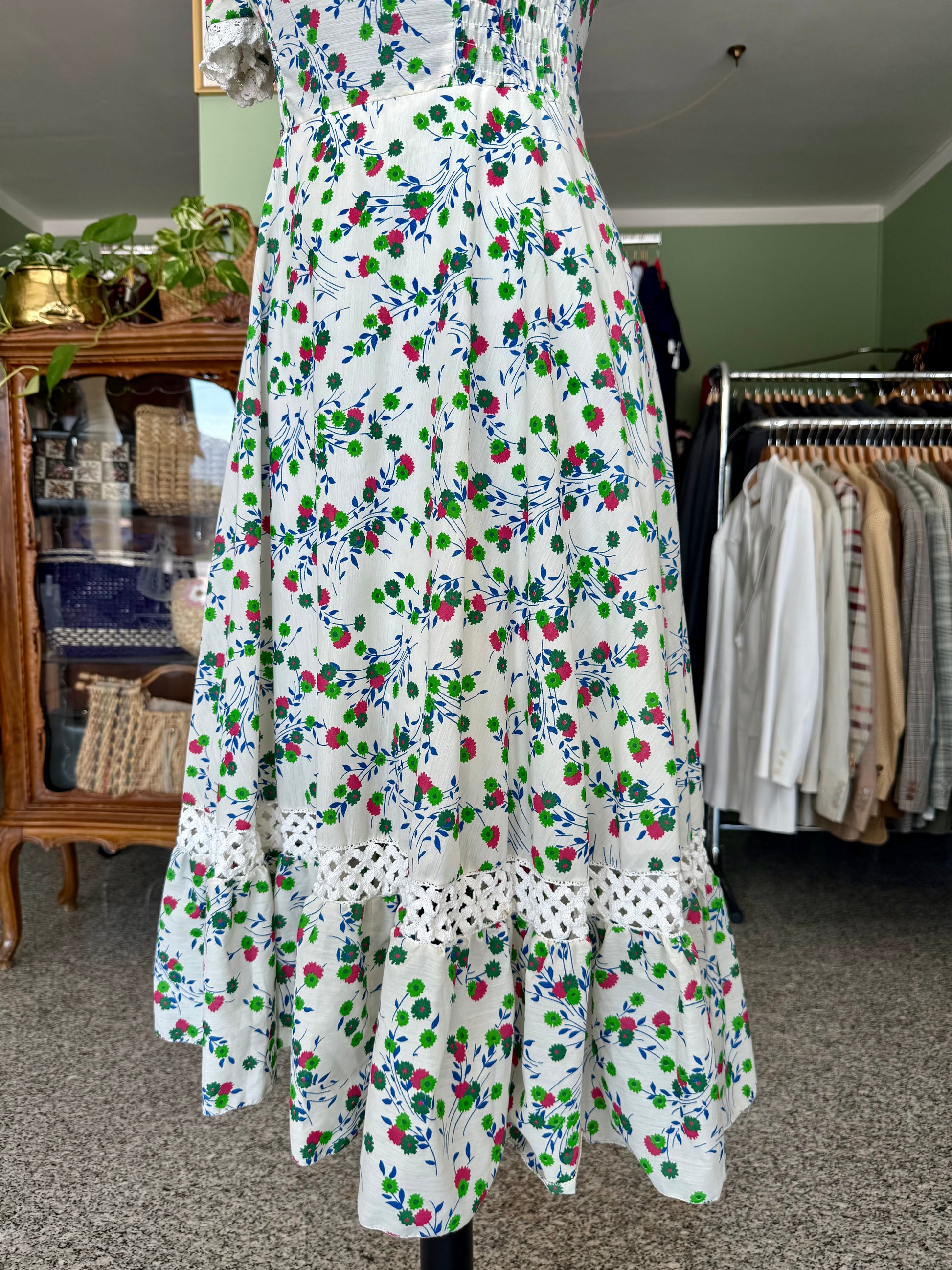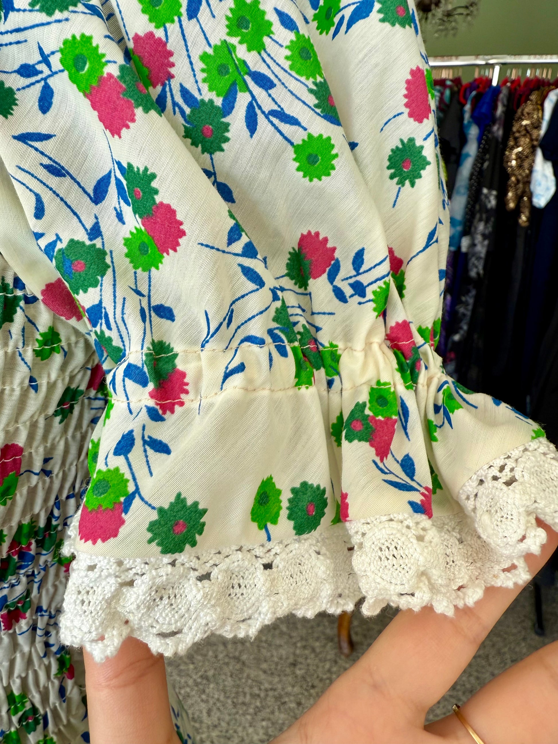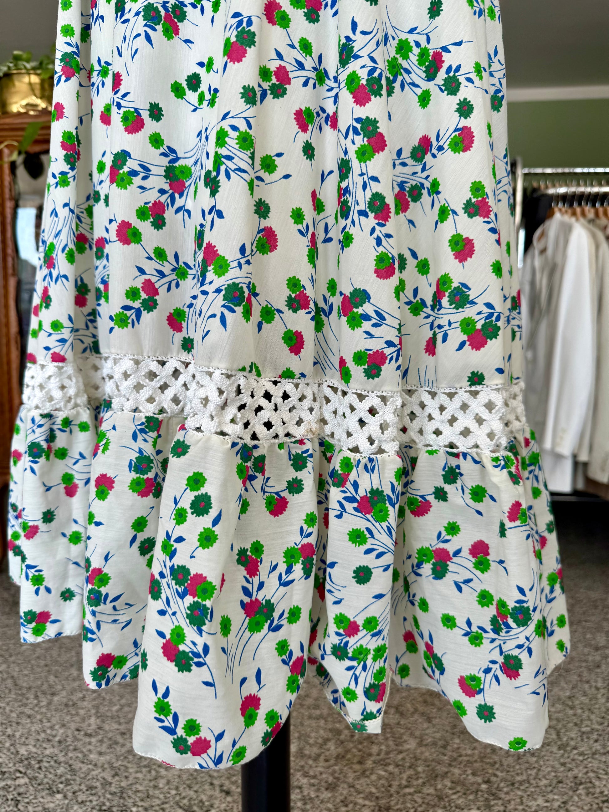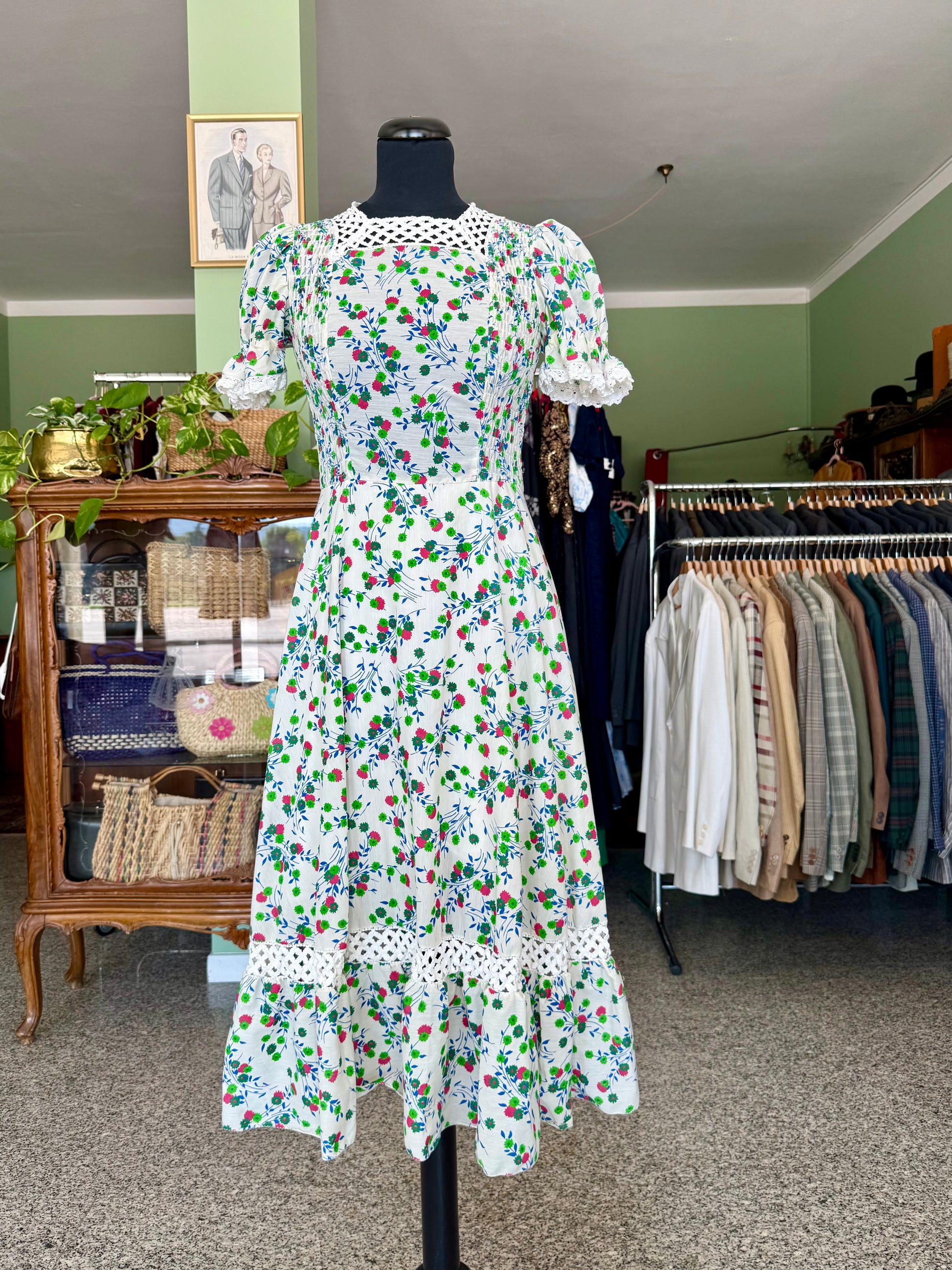 Abito anni ‘70 sartoriale, in perfetto stile prateria. Maniche a sbuffo, inserti in pizzo, fantasia floreale su sfondo bianco in perfetto stile boho-chic del tempo. Il tessuto è un misto cotone.