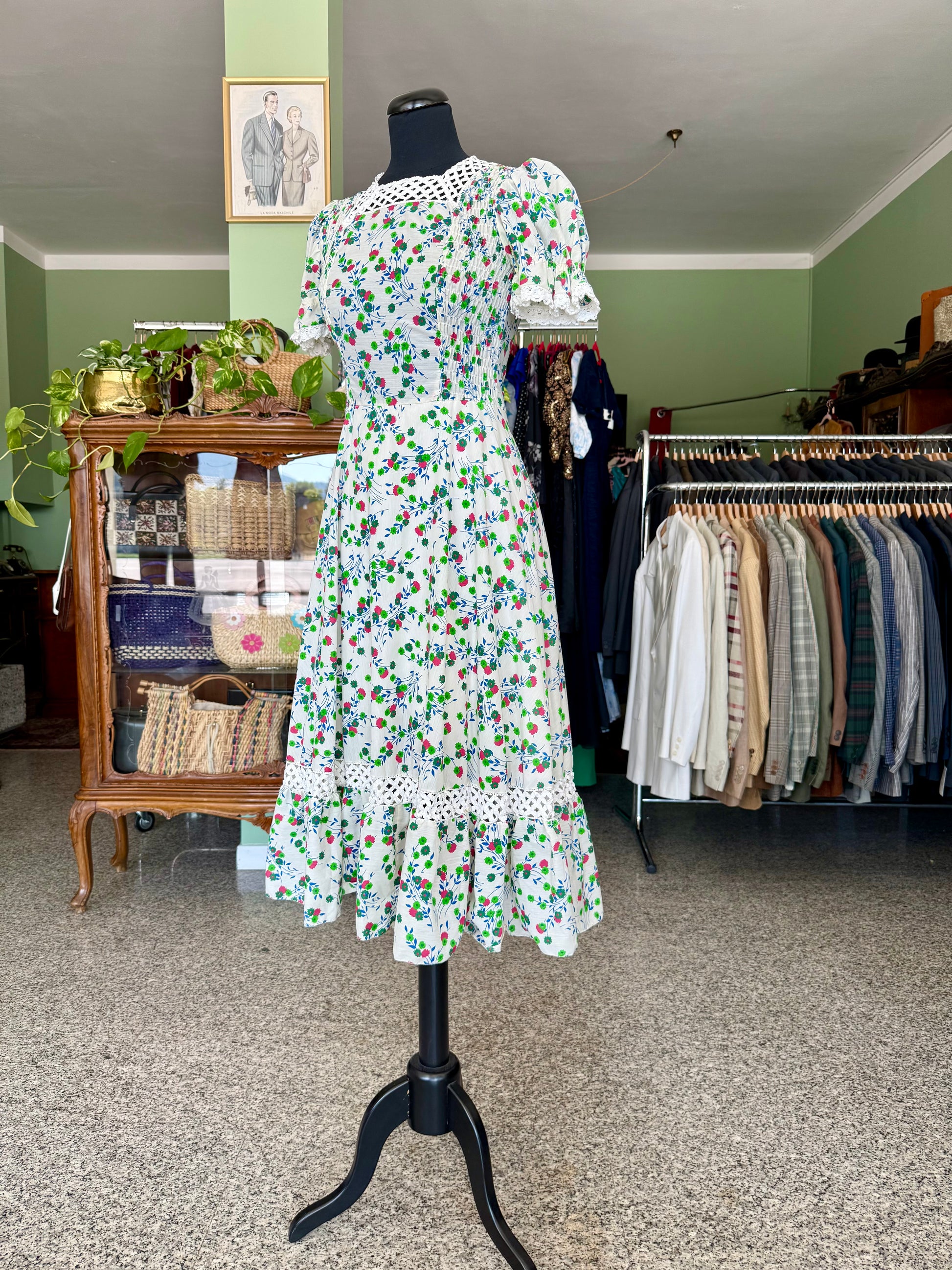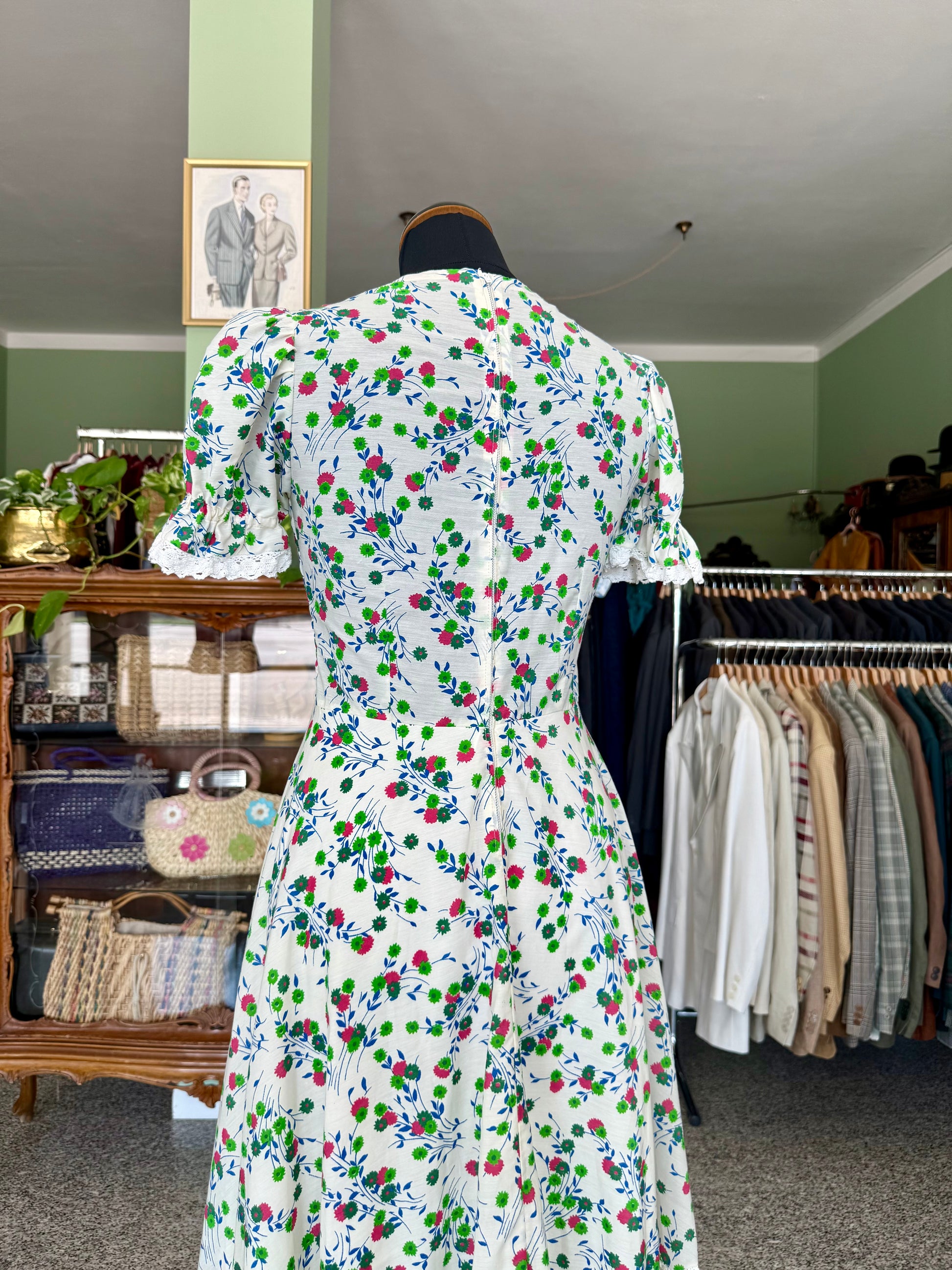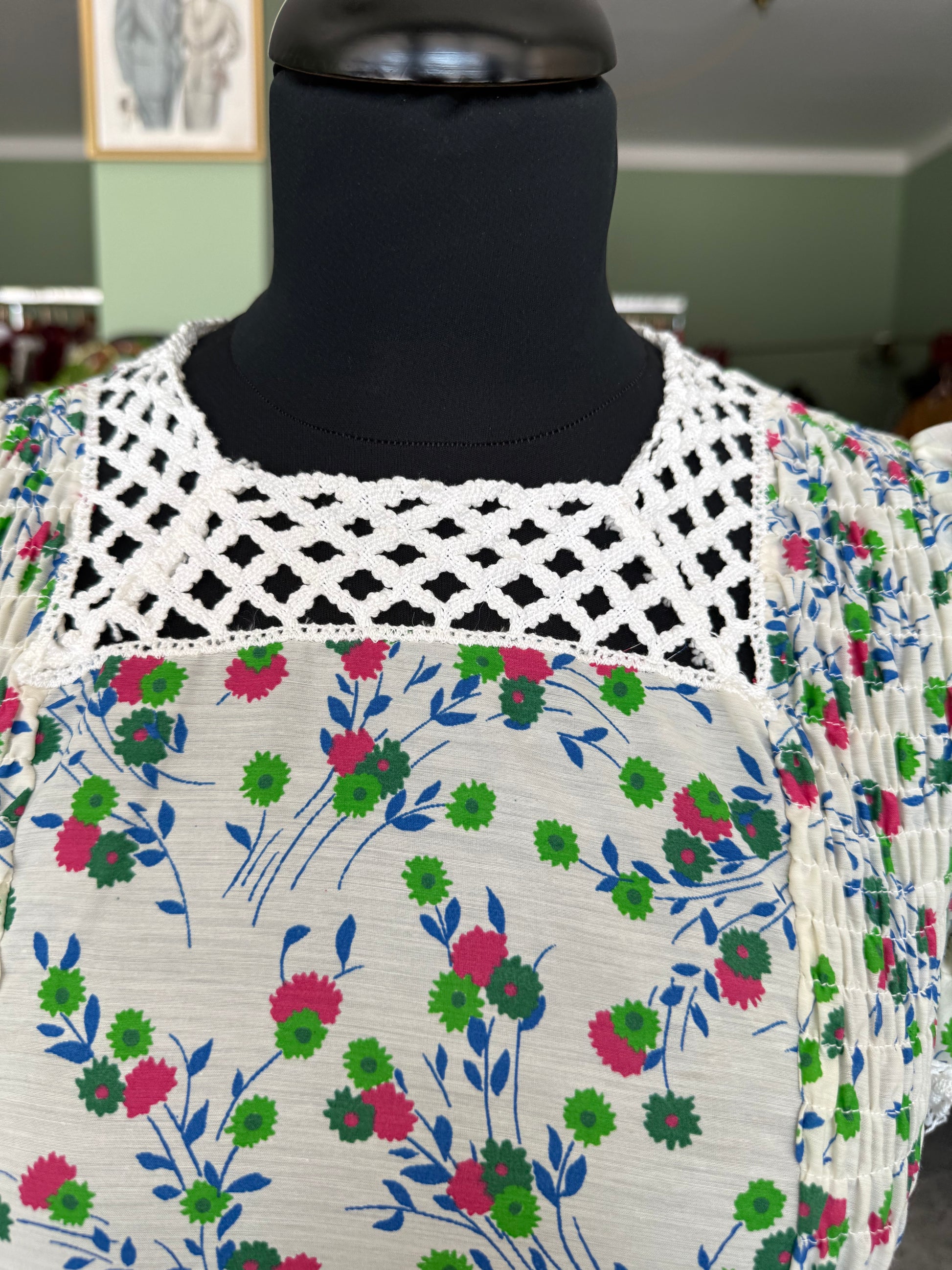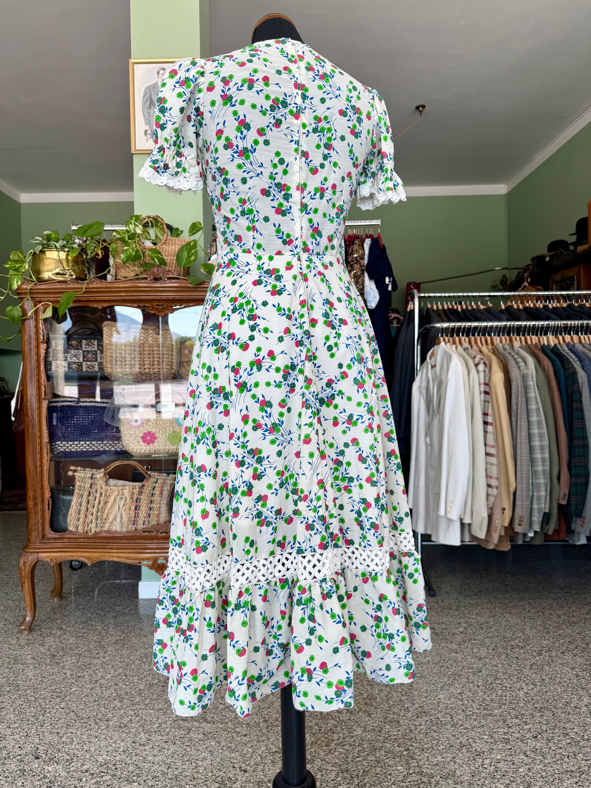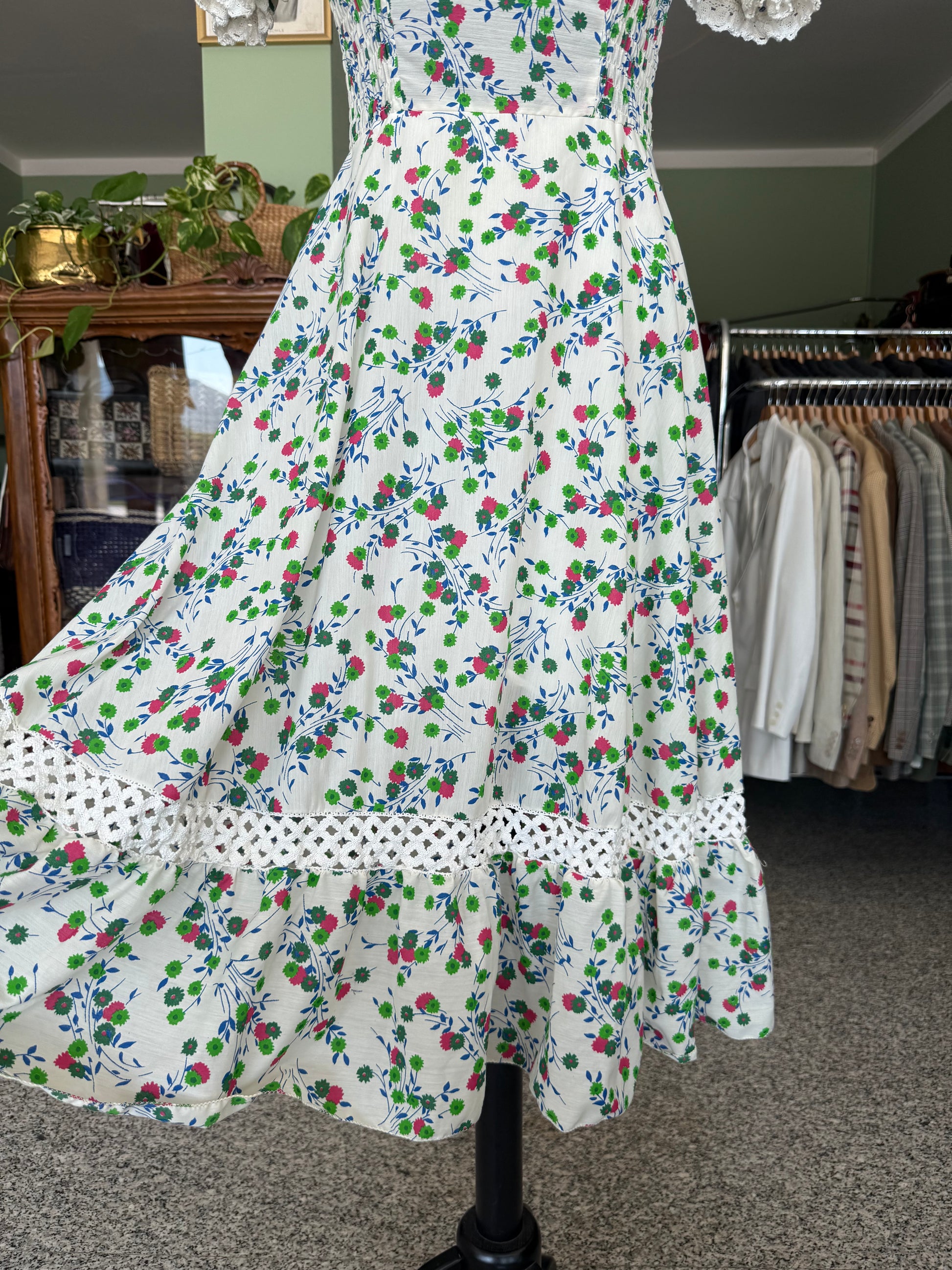 Abito anni ‘70 sartoriale, in perfetto stile prateria. Maniche a sbuffo, inserti in pizzo, fantasia floreale su sfondo bianco in perfetto stile boho-chic del tempo. Il tessuto è un misto cotone.