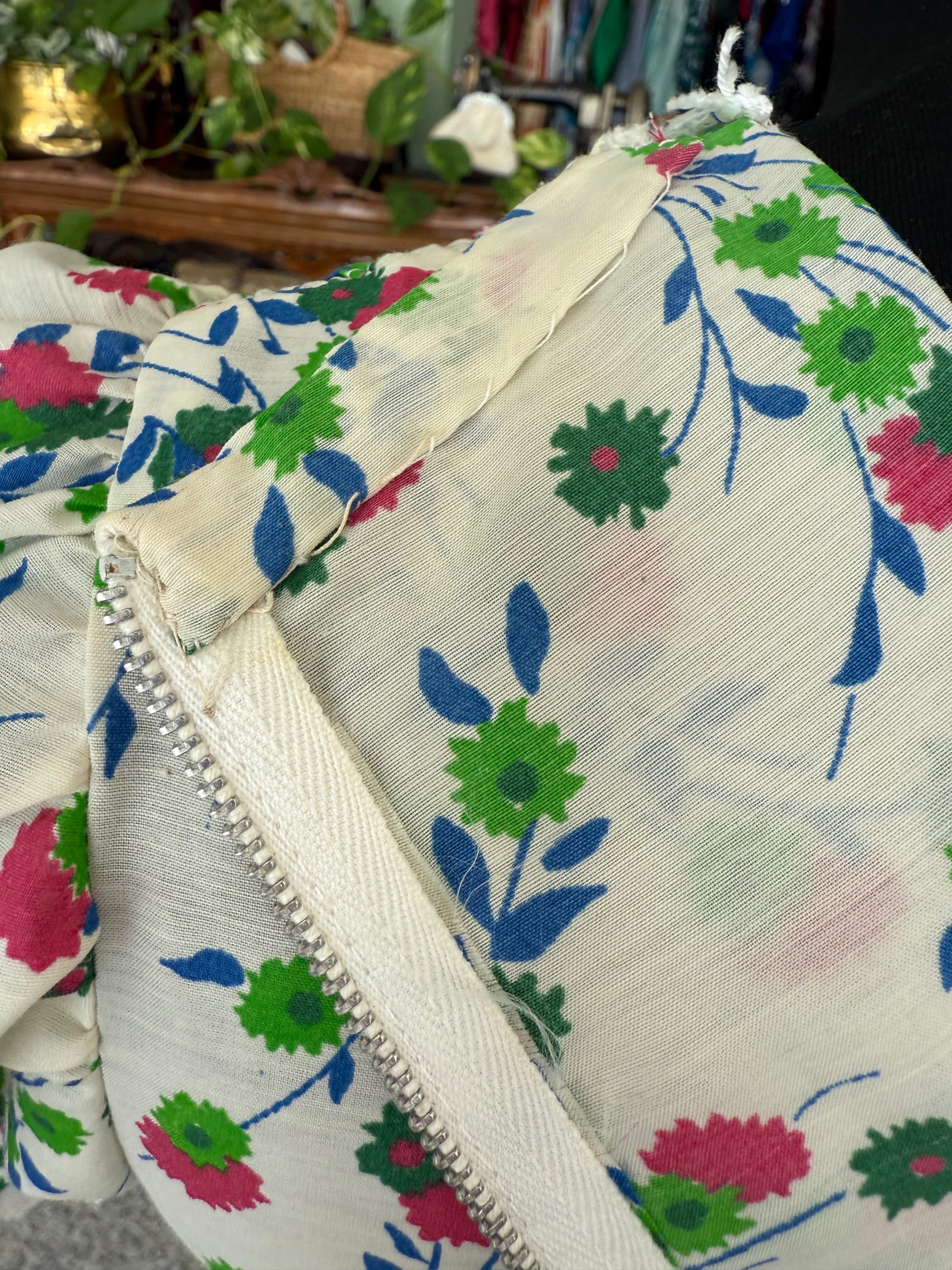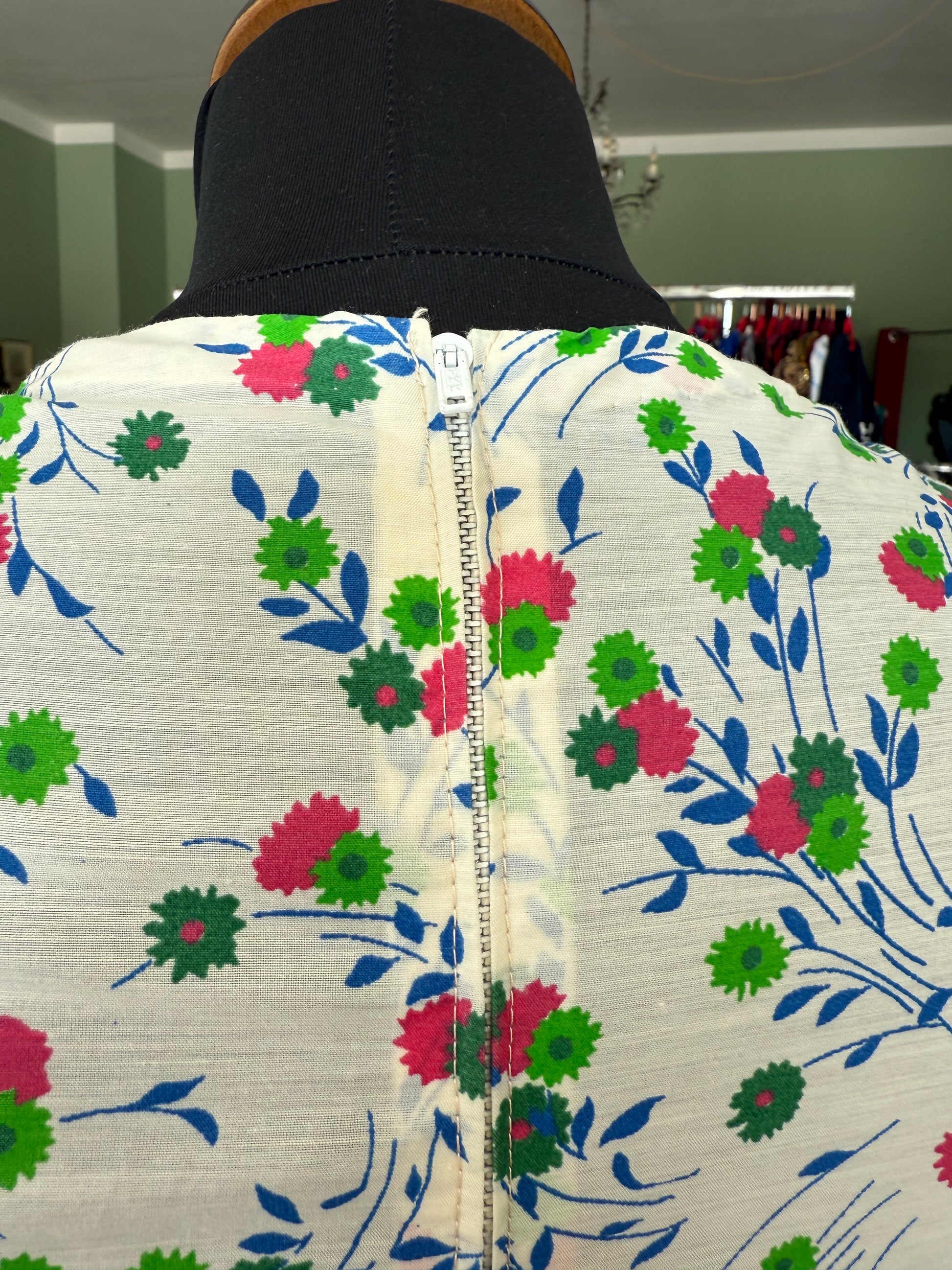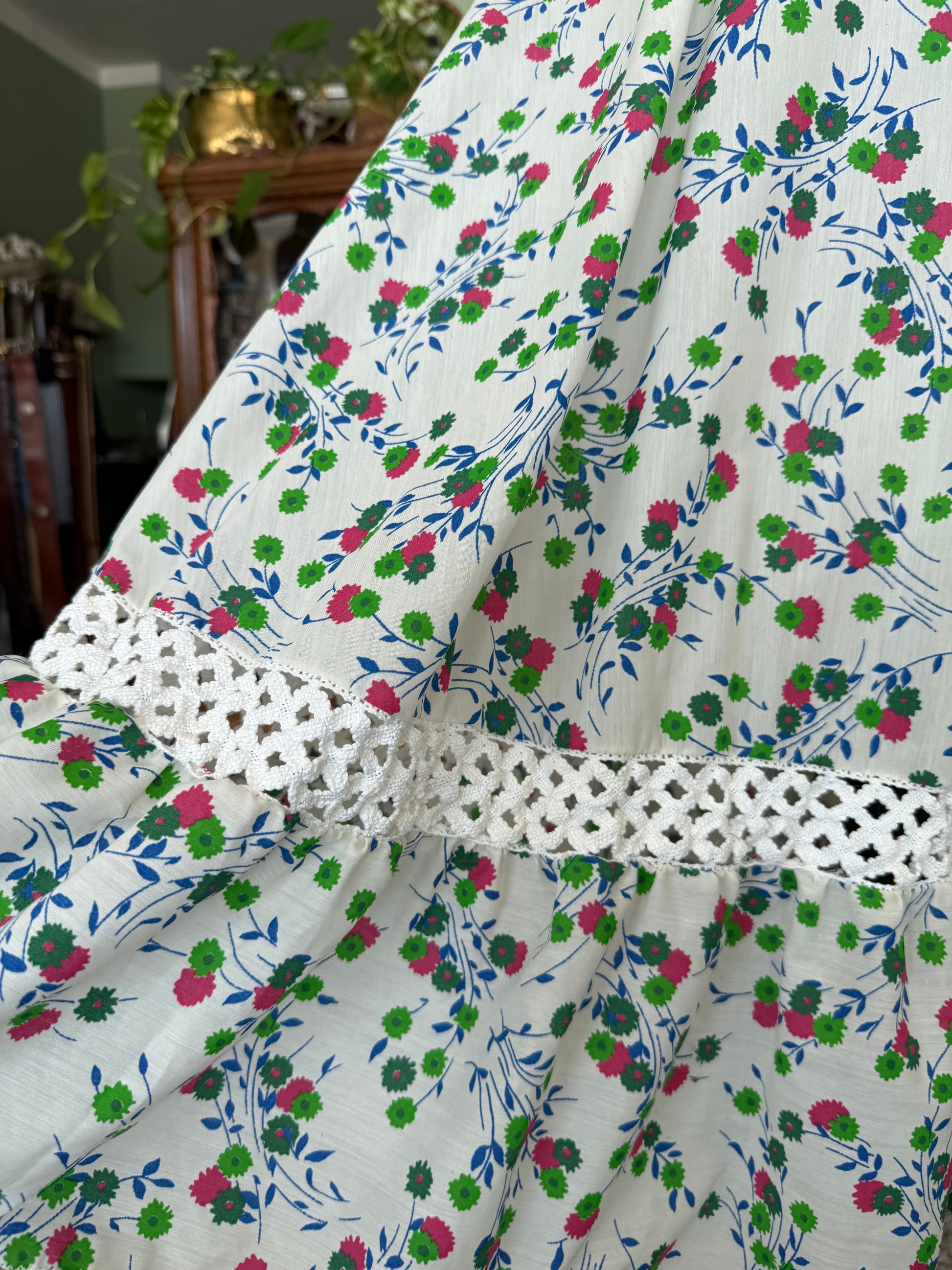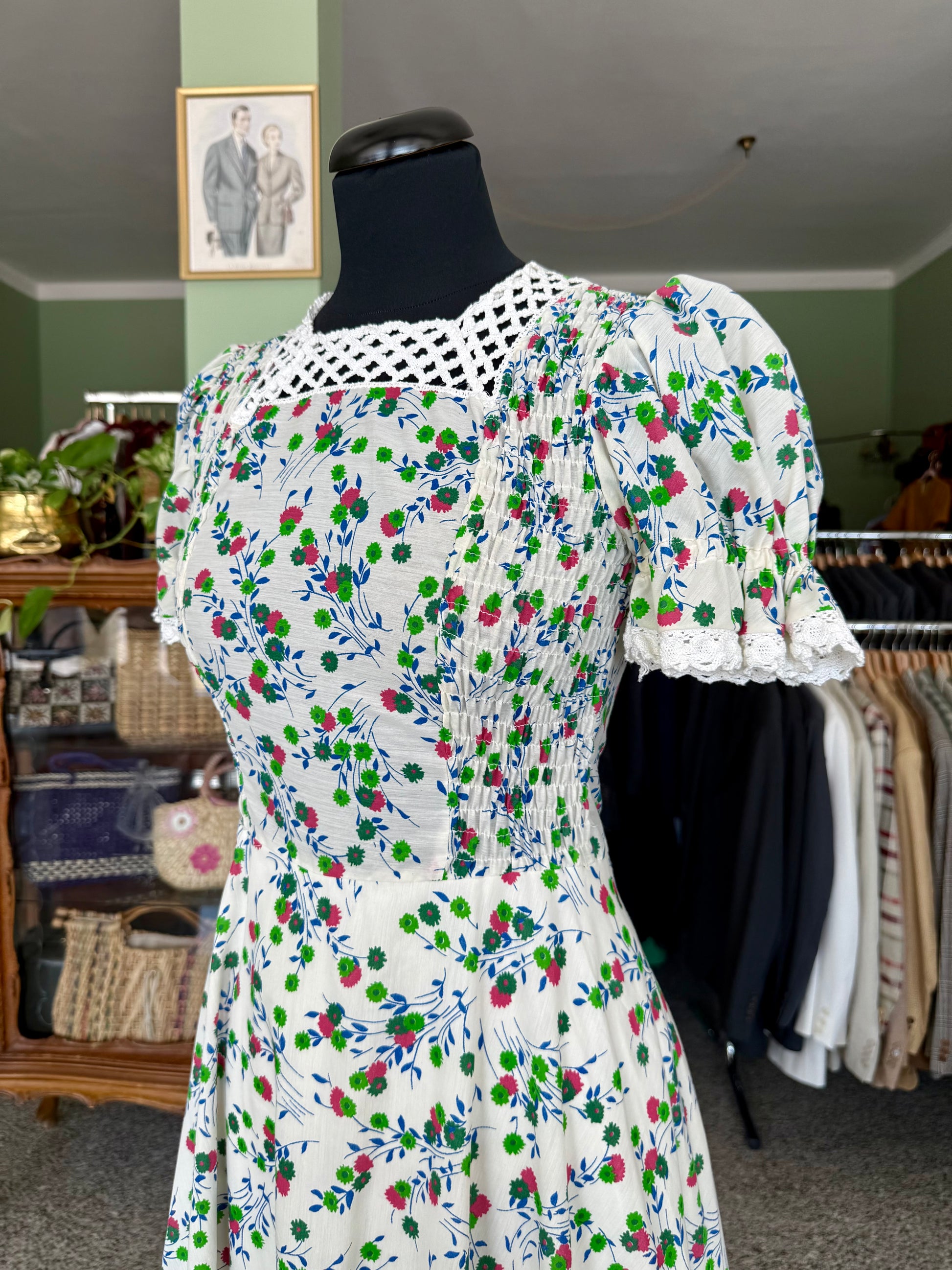 Abito anni ‘70 sartoriale, in perfetto stile prateria. Maniche a sbuffo, inserti in pizzo, fantasia floreale su sfondo bianco in perfetto stile boho-chic del tempo. Il tessuto è un misto cotone.
